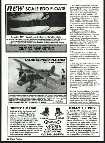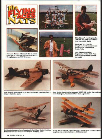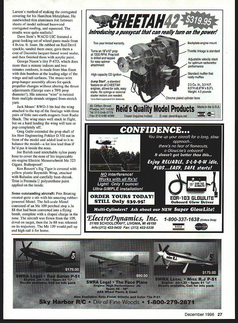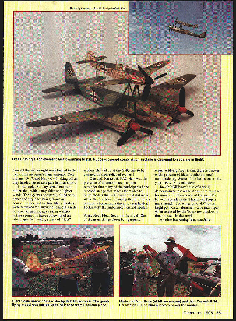 ON JULY 18 1996 hundreds enthusiastic Flying Aces converged somnolent university town Geneseo New York four days magic tenth biennial Flying Aces Club Nationals National Warplane Museum Geneseo has site choice years now FAC has begun holding off-year contests well Presided over benevolent dictator Commandant Lin Reichel adjutants Vic Didelot Ross Mayo FAC now has 1400 members nearly 60 squadrons US Canada England 162 contestants attendees attest movements strength years event began airconditioned comfort Scale events judged gang got chance renew old friendships strike up new ones get up-close look hundreds fantastic models judges did work Friday dawned wet windy grass dried quickly rain subsided hardy fliers undeterred unrepentant wind first airplane air Gordon Roberts rubber-powered silver Seversky P-35 high far downwind after 15 seconds lost sight against gray sky Later found wing panel weather got little better later much Saturday dawned clear sunny though wind constant Early arrivals field 24 Model Aviation fly come rain sleet Flying Aces cant beat from the Flying Aces song John Houck winds rubber-powered 108 enlarged ScienText plans Does anyone want speculate unusual markings Victory 1996 Grand National Champion Tom Hallman returns 3 mm 43 sec flight Loose Racer Photos author Graphic Design Carla Kunz Pres Brunings Achievement Award-winning Mistel Rubber-powered combination airplane designed separate flight camped overnight treated roar museums huge Antonov Colt biplane B-17 Navy C-47 taking off headed out take part airshow Fortunately Sunday turned out rather nice sunny skies lighter winds sky constantly filled dozens airplanes being flown competition just fun models retrieved via automobile about mile downwind guys using walkie talkies seemed have somewhat advantage As always plenty lost models showed up GHQ tent claimed relieved owners addition FAG Nats presence ambulancea grim reminder participants have reached age makes able build models will cover great distances exertion chasing miles foot becoming threat health Fortunately ambulance needed Some Neat Ideas Seen Field great things about being around creative Flying Aces neverending stream ideas adapt ones own modeling Some best seen years FAG Nats included Jack McGillivrays use wing dethermalizer made easier retrieve winning rubber-powered Cessna CR-3 between rounds Thompson Trophy mass launch wings pivot 450 flight path aluminum-tube main spar released Tomy toy clockwork timer housed cowl Another interesting idea Jake December 1996 25 Giant Scale Rearwin Speedster Bob Bojanowski great flying model scaled up 73 inches Peerless plans Marie Dave Rees HiLine motors Convair B-36 Six electric HiLine Mini-4 motors power model Tom Nallens 36-inch-span Ju 33 constructed Dave Stotts Airdevil Model Co plans Nothing looks good floatplane flight Paul Stotts Hamilton Metalplane constructed Airdevil Model Co plans Dave Stotts elegant rubber-powered WACO UIC carries markings Wellington New Zealand Aero Club great flier Bonus Points George Lewis beautiful Curtiss 18-T-1 rubber-powered seaplane constructed Bill Noonan plan 26 Model Aviation ando Ramos Albatros C-3 perfect example classic diesel-powered FF Flying Scale model PAW 80 power Chris Starleafs Herr Engineering Gee Bee R-2 drew applause long high stable flights Larsons method making corrugated covering Hamilton Metalplane sandwiched thin aluminum foil between sheets model railroad basswood corrugated roofing squeezed results quite realistic Dave Stott s WACO UIC featured great-looking set wheel pants made 4 lb/cu ft foam rubbed Red Devil spackle sanded once gave coat Daconite lacquer-based wood sealer finished acrylic paint George Nasons tiny P-47D does minute indoors two minutes outdoors made blue foam thin bamboo leading edge wings tail surfaces music-wire prop-hanger assembly allows quick propeller changes altering thrust adjustments George uses 70% prop diameter antenna wire twisted multiple strands stripped stretch yarn Jack Moses RWD-5 bis wing attached top fuselage three pairs little rare-earth magnets Radio Shack wing stays well stuck flight hard landing wing will turn pop completely off Greg Gallo extended prop shaft Herr Engineering Fokker DVII out front model added lead to balance modela lot less lead hed put inside nose Joe Barish used stretchable nylon panty hose cover nose impeccable six-engine Electric Messerschmitt 323 Gigant Bulletproof Ken Bassetts Sig Tiger covered yellow plastic Reynolds Wrap attached Balsaloc carefully heat-shrunk Trim Formula U polyurethane paint applied inside Some outstanding aircraft Pres Bruning created quite stir amazing rubberpowered Mistel full-scale Mistel consisted 109 perched atop Ju 88 converted flying bomb complete shaped charge nose aircraft flown 109 dived target Ju 88 released its trajectory 109 would pull up high-tail home____________________________________________________________[v32][b21652333181000]] December1996 27 IrnoaiicingpssjciIIhaIcai EfectroJjaamics Inc 1-800-337-1638 Odera Only Info313 422-5420 Fax 313 422-5338 new SCALE EDO FLOATS Length 48 Weight Beaver Struts 5Ibs Kit features Two piece Internaity reinforced epoxyglass floats Cathedral bottom ply farmers hardwood bearers Sandal oval aluminum shuts preformed brackets staInless e liii mdiMau4 niMIi%n Mflftfiflt Pres designed models would both continue flying after separation ensemble flew well separation latch stuck landed together Some fix-at-home damage prevented further testing awarded clubs 1996 Achievement Award superb model Dave Rees B-36 powered six Hi-Line Mini-4 electric motors drew crowd time flown feature model its free-floating rudderan old FF Scale trick effectively reducing too-large vertical stabilizers area achieve better spiral stability Bob Bojanowskis 73-inch-span Rearwin Speedster based 24-inchspan Peerless plan weighs 11/2 pounds including rubber model real crowd pleaser flawless workmanship impeccable flight performance earned permanent place Leg