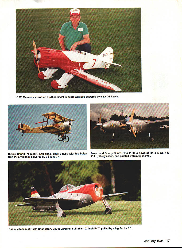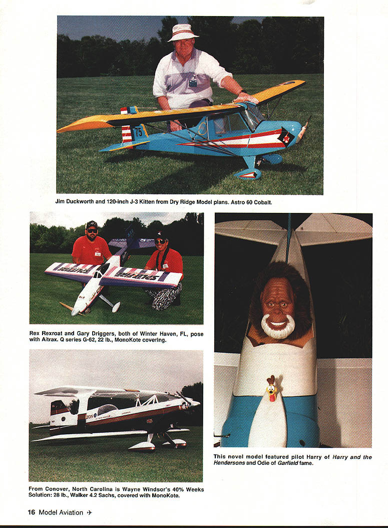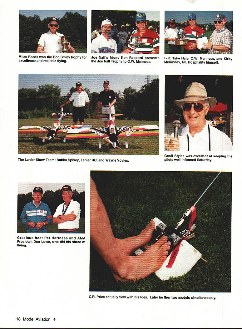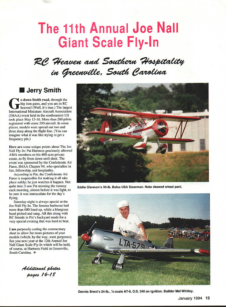 1% eewdte Seaat a&a 11th Annual Joe Nail Giant Scale Fly-In U Jerry Smith Go down Smith road through big iron gates RC heaven Well its true largest International Miniature Aircraft Association IMAA event held southeastern US took place May 13-16 260 pilots registered some 350 aircraft some places models spread out two three deep along flight line can imagine what like trying get frequency pin some unique points about Joe Nail Fly-In Pat Hartness graciously allowed AMA members 400-acre private estate fly dawn until dusk event sponsored Confederate Air Farce IMAA Chapter 94 specialize fun fellowship hospitality According Pat Confederate Air Farce responsible making take place safely just watches happen quite true saw Pat mowing runway morning almost before light sure immaculate days flying Saturday night always special Joe Nall Fly-In famous barbecue 600 lined up bluegrass band picked sang along RC friends Pats backyard made very special evening hard beat am purposely cutting comrnentary short allow pictures models way gorgeous See next year 12th Annual Joe Nall Giant Scale Fly-In will held course Hartness Field Greenville South Carolina ary1994 15 Eddie Glennons 30-lb Balsa USA Stearman Note skewed wheel pant Dennis Brents 24-lb 1A-scale AT-6 OS 240 ignition Builder Mel Whitley Rex Rexroat Gary Driggers both Winter Haven FL pose Aitrax Q series G-62 22 lb MonoKote covering Conover North Carolina Wayne Windsors 40% Weeks Solution 28 lb Walker 42 Sachs covered MonoKote 16 Model Aviation Duckworth 120-inch J-3 Kitten Dry Ridge Model plans Astro 60 Cobalt L i novel model featured pilot Harry Harry Hendersons Odie Garfield fame January1994 17 OW Manness shows off Ikon Nwst -scale Gee Bee powered 37 D&B twin Bobby Benoit Sulfur Louisiana does flyby BalsaSusan Sonny Burrs CBA P-38 powered G-62 USA Pup powered Sachs 3445 lb fibergiassed painted auto enamel Rubin Mitchem North Charleston South Carolina built 102-inch P-47 pulled big Sachs 58 Gracious host Pat Hartness AMA President Don Lowe did share flying CR Price actually flew toes Later flew two models simultaneously 18 Model Aviation s Reeds won Bob Smith trophy Joe Nails friend Ken Pappard presents L-R Tyke Hale OW Manness Kirby excellence realistic flying Joe Nail Trophy OW Man ness McKinney Mr Hospitality himself Lanier Show Team Bubba Spivey Lanier RC Wayne Voyles ii Geoff Styles excellent keeping pilots well-informed Saturday