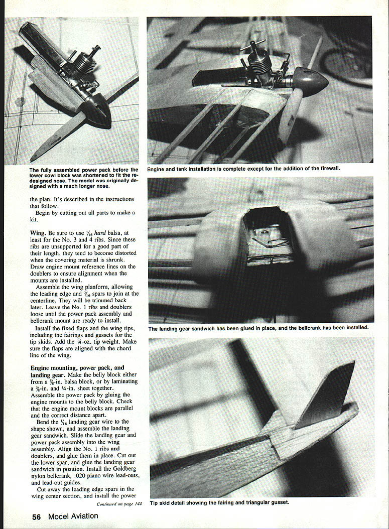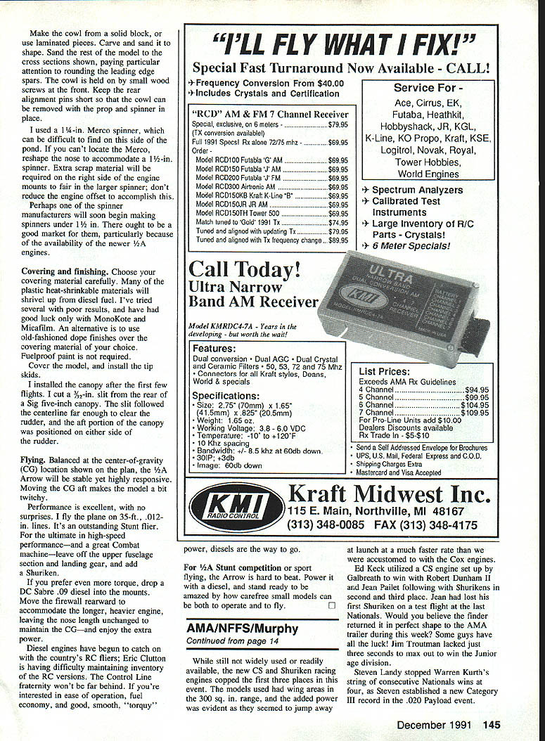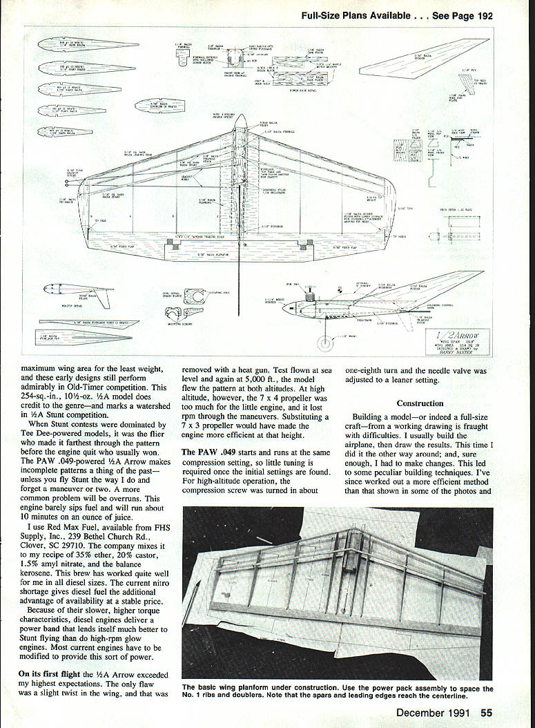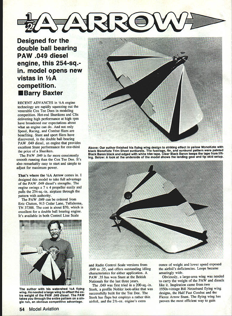 Designed double ball bearing PAW 049 diesel engine 254-sqin model opens new vistas competition Barry Baxter RECENT ADVANCES engine technology rapidly squeezing out venerable Cox Tee Dees modeling competition Hot-rod Shurikens CSs delivering high performance high rpm have broadened expectations about what engine can Speed Racing Combat fliers benefiting Stunt sport fliers have discovered double ball bearing PAW 049 diesel engine provides excellent Stunt performance one-third price Shuriken PAW 049 far consistently smooth running Cox Tee Dee Its also remarkably easy start simple adjust maximum power Thats 1/ZA Arrow comes designed model take full advantage PAW 049 diesels strengths engine swings 7 x 4 propeller easily pulls 254-sq-in airplane through pattern authority PAW 049 can ordered Eric Clutton 913 Cedar Lane Tullahoma TN 37388 cost about $70 excellent double ball bearing engine Its available both Control Line Scale Radio Control Scale versions 049 35 offers outstanding idling characteristics either application PAW 35 has won Stunt British Nationals last three years 049 first tried 200-sq-in Stork profile Nobler look-alike successfully built Tee Dee Stork has flaps employs rather thin airfoil 2/2-oz engines extra ounce weight lower speed exposed airfoils deficiencies Loops became amazingly wide Obviously large-area wing needed carry weight PAW diesels like Inspiration came two 1950s-vintage Bill Netzeband flying wing designs Half Fast Combat Fierce Arrow Stunt flying wing has proven efficient way gain 54 Model Aviation Above Our author finished flying wing design striking effect yellow MonoKote black MonoKote Trim Sheet sunburats fuselage fin sunburst pattern painted Black Baron black edged white trim tape Clear Black Baron keeps tape lift ing Below look underside model shows landing gear tip skid setup author watershed V2A flying wing needed large wing offset ex tra weight PAW 049 diesel PAW takes through entire pattern sin gle run obvious competitive advantage Full-Size Plans Available . See Page 192 r74 4 ANNICASS N SNAWN BARRY IGAXTER maximum wing area least weight early designs still perform admirably Old-Timer competition 254-sq-in 10A-oz hA model does credit genreand marks watershed Stunt competition Stunt contests dominated Tee Dee-powered models flier made farthest through pattern before engine quit usually won PAW 049-powered hA Arrow makes incomplete patterns thing past unless fly Stunt way forget maneuver two common problem will overruns engine barely sips fuel will run about 10 minutes ounce juice use Red Max Fuel available FHS Supply Inc 239 Bethel Church Rd Clover SC 29710 company mixes recipe 35% ether 20% castor 15% amyl nitrate balance kerosene brew has worked quite well diesel sizes current nitro shortage gives diesel fuel additional advantage availability stable price Because slower higher torque characteristics diesel engines deliver power band lends itself much better Stunt flying high-rpm glow engines Most current engines have modified provide sort power its first flight hA Arrow exceeded highest expectations flaw slight twist wing removed heat gun Test flown sea level again 5000 ft model flew pattern both altitudes high altitude however 7 x 4 propeller too much little engine lost rpm through maneuvers Substituting 7 x 3 propeller would have made engine efficient height PAW 049 starts runs same compression setting little tuning required once initial settings found high-altitude operation compression screw turned about one-eighth turn needle valve adjusted leaner setting Construction Building modelor indeed full-size craftfrom working drawing fraught difficulties usually build airplane draw results time did other way around sure enough make changes led some peculiar building techniques Ive since worked out efficient method shown some photos December 1991 55 basic wing planform under construction Use power pack assembly space No 1 ribs doublers Note spars leading edges reach centeriine fully assembled power pack before Engine tank installation complete except addition firewall lower cowl block shortened fit re designed nose model originally de signed much longer nose plan Its described instructions follow Begin cutting out parts make kit Wing sure use /16 hard balsa least No 3 4 ribs Since ribs unsupported good part length tend become distorted covering material shrunk Draw engine mount reference lines doublers ensure alignment mounts installed Assemble wing planform allowing leading edge 3A6 spars join centerline will trimmed back later Leave No 1 ribs doublers loose until power pack assembly bellcrank mount ready install Install fixed flaps wing tips including fairings gussets tip skids Add 14 -oz tip weight Make sure flaps aligned chord line wing Engine mounting power pack landing gear Make belly block either A-in balsa block laminating A-in 14-in sheet together Assemble power pack gluing engine mounts belly block Check engine mount blocks parallel correct distance apart Bend A6 landing gear wire shape shown assemble landing gear sandwich Slide landing gear power pack assembly wing assembly Align No 1 ribs doublers glue place Cut out lower spar glue landing gear sandwich position Install Goldberg nylon bellcrank 020 piano wire lead-outs lead-out guides Cut away leading edge spars wing center section install power Continued page 144 56 Model Aviation landing gear sanawicn nas neen glued place bellcrank has installed Tip skid detail showing tairing triangular gusset FOX 2-4 Cycle Special Glow Plug 40702 Miracle Plug totally new concept glow plug design Instead using idle bar MIRACLE PLUG built pre-combustion chamber important thing glow plug retains heat better other glow plug know Try notice much smoother motor responds throttle commands Also will probably able fly less intro fuel Try low intro fuel wouldnt rev-out before Tests also show reduced fuel consumption cases WARNING! motor will probably idle faster re-set throttle erwise might able land Hard believe r