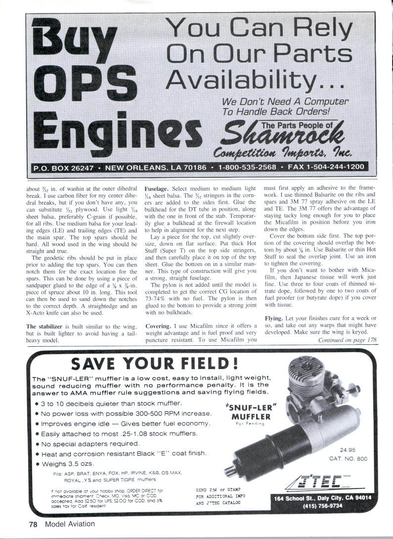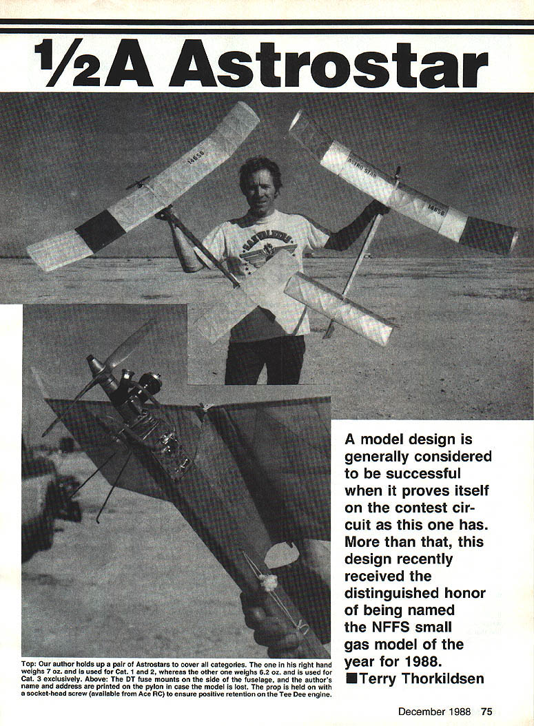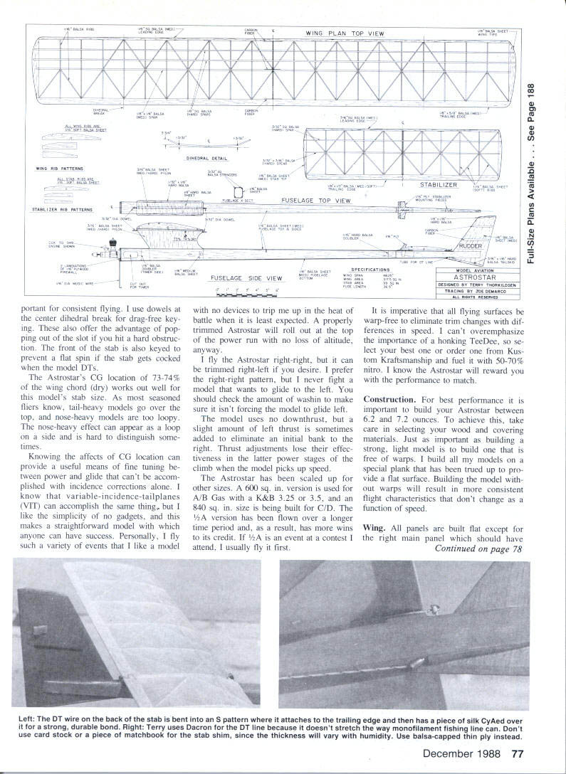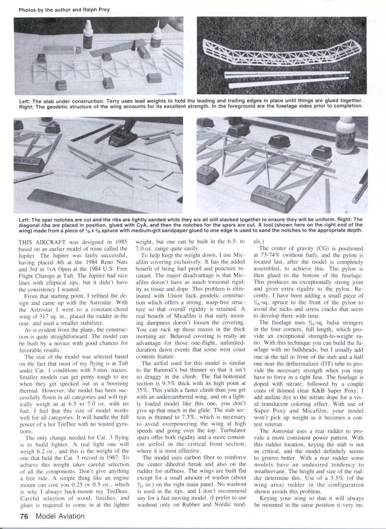 /2A Astrostar Top Our author holas up pair OT Astrostars cover aii categones right hand weighs 7 oz used Cat 1 2 whereas other weighs 62 oz used Cat 3 exclusively Above DT fuse mounts side fuselage authors name address printed pylon case model lost prop held socket-head screw available Ace RC ensure positive retention Tee Dee engine model design generally considered successful proves itself contest cir cuit has design recently received distinguished honor being named NFFS small gas model year 1988 ETerry Thorkildsen December 1988 75 Photos author Ralph Prey Left The stab under construction Terry uses lead weights hold leading trailing edges place until things glued together Right geodetic structure wing accounts its excellent strength foreground fuselage sides prior completion Left The spar notches cut ribs lightly sanded still stacked together ensure will uniform Right diagonal ribs placed position glued CyA notches spars cut tool shown right end wing made piece 1A x % spruce medium-grit sandpaper glued edge used sand notches appropriate depth THIS AIRCRAFT designed 1985 based earlier model called Jupiter Jupiter fairly successful having placed 4th 1984 Reno Nats 3rd Open 1984 US Free Flight Champs Taft Jupiter nice lines elliptical tips didnt have consistency wanted starting point refined de sign came up Astrostar Astrostar went constant-chord wing 317 sq placed rudder rear used smaller stabilizer As evident plans construc tion quite straightforward model can built novice good chances favorable results size model selected based fact flying Taft under Cat 1 conditions 5-mm maxes Smaller models can get pretty tough see get specked Out booming thermal However model has suc cessfully flown categories will typ ically weigh 65 70 oz no fuel feel size model works well categories will handle full power hot TeeDee no wasted gyra tions change needed Cat 3 flying build lighter real light will weigh 62 oz weight held Cat 3 record 1987 achieve weight takes careful selection components Dont give anything free ride simple thing like engine mount can cost 025 05 oz always back-mount TeeDees Careful selection wood finishes glues required come lighter weight can built 65- 70-oz range quite easily help keep weight down use Mic afilm covering exclusively has added benefit being fuel proof puncture re sistant major disadvantage Mic afilm doesnt have much torsional rigid ity tissue dope problem elim inated Union Jack geodetic construc tion offers strong warp-free struc ture overall rigidity retained real benefit Micafilm early morn ing dampness doesnt loosen covering can rack up maxes thick morning air Behaved covering really advantage one-flight unlimitedduration dawn events some west coast contests feature airfoil used model similar Ramrods thinner isnt draggy climb flat-bottomed section 93% thick its high point 35% yields faster climb get undercambered wing light ly loaded model like dont give up much glide stab sec tion thinned 73% necessary avoid overpowering wing high speeds going over top Turbulator spars offer both rigidity consist ent airfoil critical front section effective model uses carbon fiber reinforce center dihedral break also rudder stiffness wings built flat except small amount washin about Y32 right main panel No washout used tips dont recommend fast moving model prefer use washout Rubber Nordic models center gravity CG positioned 73-74% fuel pylon located last after model completely assembled achieve pylon glued bottom fuselage produces exceptionally strong joint gives extra rigidity pylon Re cently have adding small piece 1A6-sq spruce front pylon avoid nicks stress cracks seem develop time fuselage uses %2-sq balsa stringers four corners full length pro vide exceptional strength-to-weight ra tio technique can build fu selage no bulkheads usually add tail front stab half near dethermalizer DT tube pro vide necessary strength may have force tight fuse fuselage doped nitrate followed couple coats thinned clear K&B Super Poxy add aniline dye nitrate dope viv id translucent coloring effect use Super Poxy Micafilm model wont pick up weight becomes con test veteran Astrostar uses rear rudder pro vide consistent power pattern rudder location keying stab critical model definitely seems groove better rear rudder some models have undesired tendency weathervane height size rud der determine Use 35% wing area rudder configuration shown avoids problem Keying wing will always mounted same position very im 76 Model Aviation AASA BALSA BED - FIAA \ WING PLAN TOP VIEW LIABALSA SHEET _iZLrn~mmrzr1Th_i K lAIR7jr SlREAFAL~/lAB SO BALSA BBEABlAB IAA BALSACHARS SPARSPIABRISA BALSA MEAl MEAl SRAB HARSA RALSA MEAlTRAILIPA EASt 5* WINS BIBS ABE RAFT BALSA SABET SAAl-HASVI HAHA DIHEDRAL DETAIL WIND RIB PATTERNSIA BASS SHEER CABS ARARRI P505 SO BALSA HRBAABRASITS BALSA SABER STAB BIBS ARE STAB LIZERTIe BALSA SARAH IA RAFT BALBA SHEETlAB IBES ASAFTI zIzIIx SR BARS BALBA STABILIZER DID PATTERNS HABAlA SARA BALSA RAILABIR LABIA AR OILS SIB AlA BASIS WIRECUR ASHSTAB ABERAS SANDESIGNED BY TERRY TRORBIWSEN TRACING NT SE DEMARCO ALL RANBTB DEBARRED portant consistent flying use dowels center dihedral break drag-free key ing also offer advantage pop ping out slot hit hard obstruc tion front stab also keyed prevent flat spin stab gets cocked model DTs Astrostars CG location 73-74% wing chord dry works out well models stab size As seasoned fliers know tail-heavy models go over top nose-heavy models too loopy nose-heavy effect can appear loop side hard distinguish some times Knowing affects CG location can provide useful means fine tuning tween power glide cant accom plished incidence corrections alone know variable-incidence-tailplanes VIT can accomplish same thing like simplicity no gadgets makes straightforward model anyone can have success Personally fly such variety events like model no devices trip up heat battle least expected properly trimmed Astrostar will roll out top power run no loss altitude anyway fly Astrost