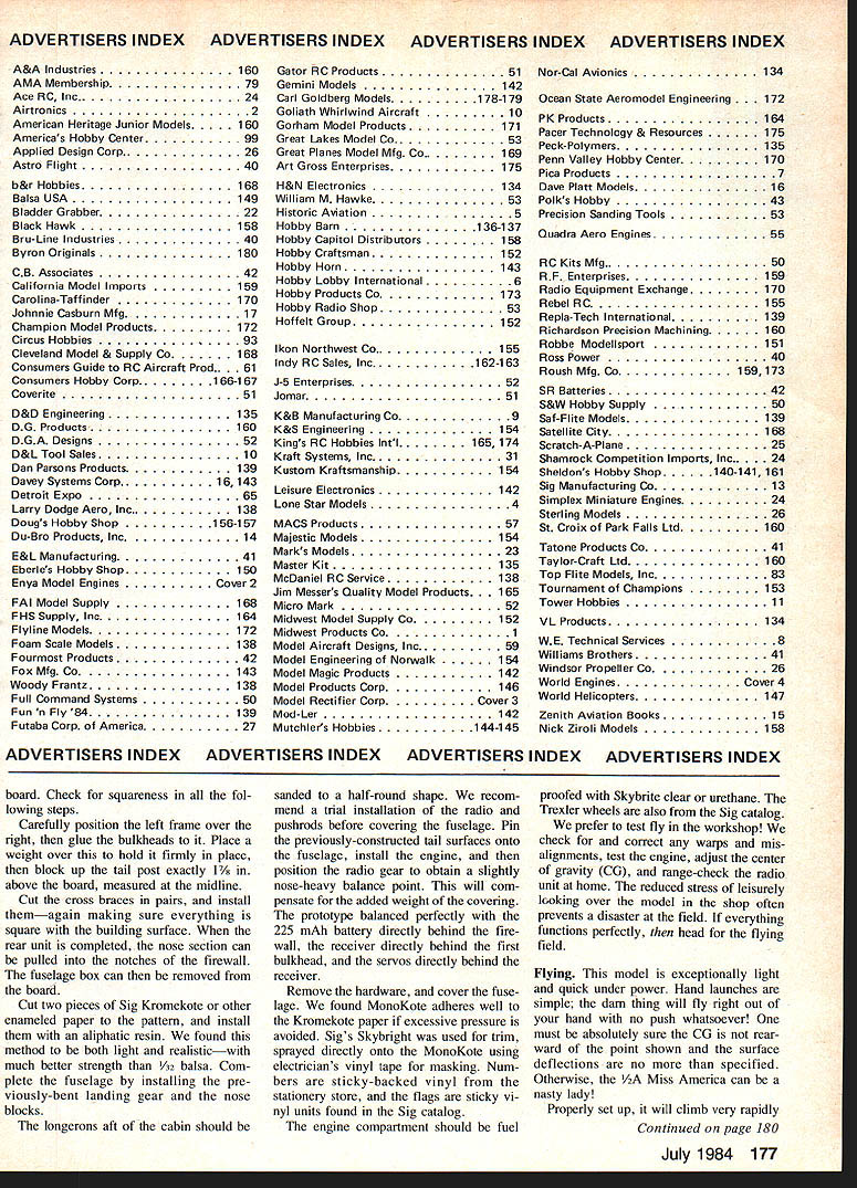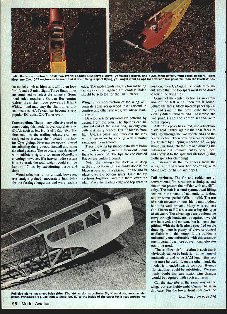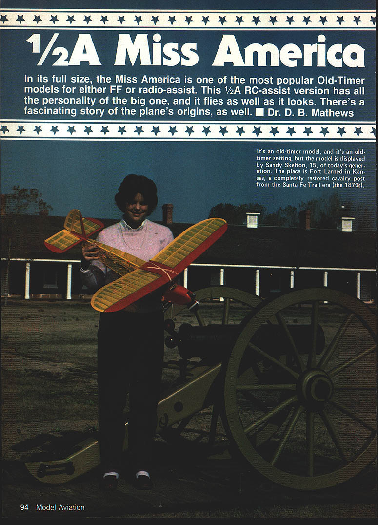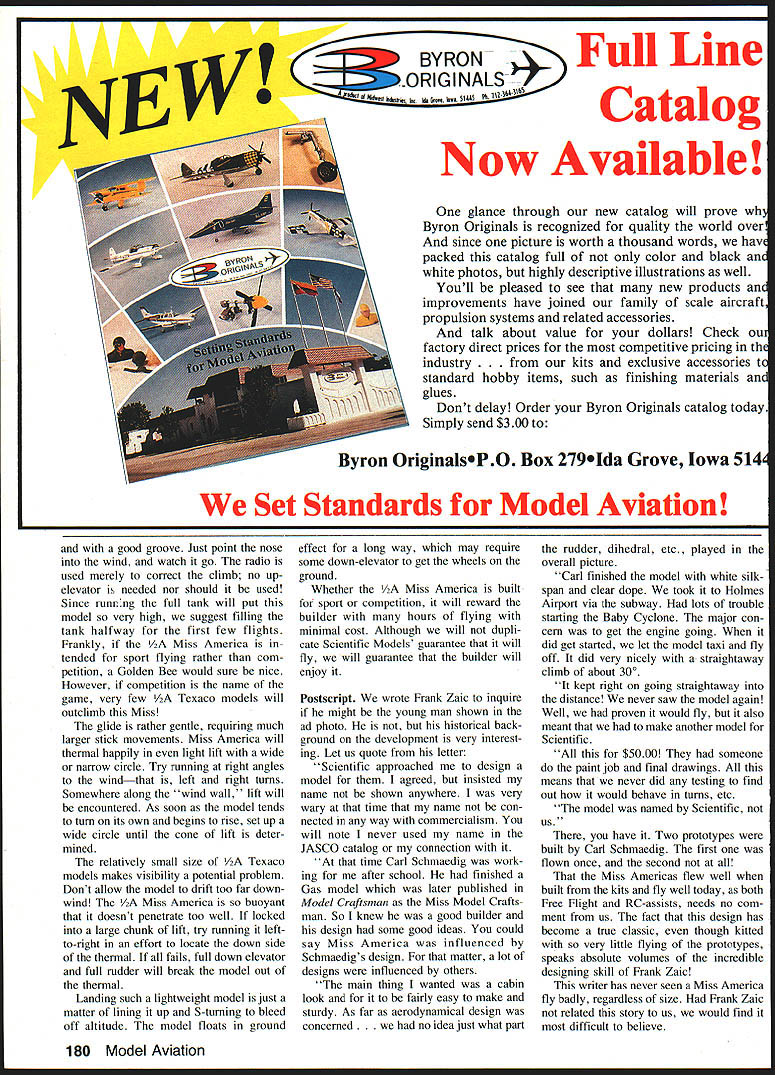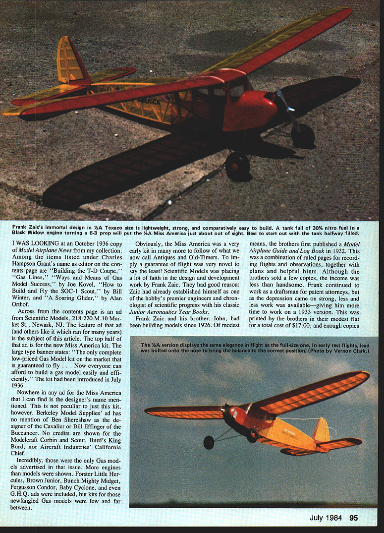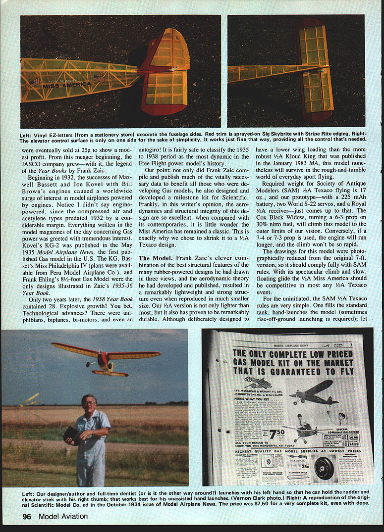 NO OCR TEXT Frank Zaics immortal design 1AA Texaco size lightweight strong comparatively easy build tank full 30% nitro fuel Black Widow engine turning 6-3 prop will put %A Miss America just about out sight Best start out tank halfway filled WAS LOOKING October 1936 copy Model Airplane News collection Among items listed under Charles Hampson Grants name editor con tents page Building T-D Coupe Gas Lines Ways Means Gas Model Success Joe Kovel Build Fly SOC-i Scout Bill Winter Soaring Glider Alan Orthof Across contents page ad Scientific Models 2 18-220 M-l0 Mar ket St Newark NJ feature ad others like ran years subject article top half ad new Miss America kit large type banner states complete low-priced Gas Model kit market guaranteed fly w everyone can afford build gas model easily effi ciently kit introduced July 1936 Nowhere ad Miss America can find designers name men tioned peculiar just kit however Berkeley Model Supplies ad has no mention Ben Shereshaw de signer Cavalier Bill Effinger Buccaneer No credits shown Modelcraft Corbin Scout Burds King Burd nor Aircraft Industries California Chief Incredibly Gas mod els advertised issue engines models shown Forster Little cules Brown Junior Bunch Mighty Midget Fergusson Condor Baby Cyclone GHQ ads included kits newfangled Gas models few far between Obviously Miss America very early kit follow what now call Antiques Old-Timers im ply guarantee flight very novel say least Scientific Models placing lot faith design development work Frank Zaic good reason Zaic already established himself hobbys premier engineers chron ologist scientific progress classic Junior Aeronautics Year Books Frank Zaic brother John building models since 1926 modest means brothers first published Model Airplane Guide Log Book 1932 combination ruled pages record ing flights observations together plans helpful hints Although brothers sold few copies income less handsome Frank continued work draftsman patent attorneys depression came strong less less work availablegiving him time work 1933 version printed brothers modest flat total cost $1700 enough copies July 1984 95 eventually sold 25 show mod est profit meager beginning JASCO company grewwith legend Year Books Frank Zaic Beginning 1932 successes Max well Bassett Joe Kovel Bill Browns engines caused worldwide surge interest model airplanes powered engines Notice didnt say enginepowered since compressed air acetylene types predated 1932 con siderable margin Everything written model magazines day concerning Gas power greeted tremendous interest Kovels KG-2 published May 1935 Model Airplane News first pub lished Gas model US KG Bas sets Miss Philadelphia IV plans avail able Peru Model Airplane Co Frank Ehlings 8-foot Gas Model designs illustrated Zaics 1935-36 Year Book Only two years later 1938 Year Book contained 28 Explosive growth bet Technological advances am phibians biplanes bi-motors autogiro fairly safe classify 1935 1938 period dynamic Free Flight power models history point did Frank Zaic com pile publish much vitally neces sary data benefit de veloping Gas models also designed developed milestone kit Scientific Frankly writers opinion aero dynamics structural integrity de sign excellent compared its contemporaries little wonder Miss America has remained classic exactly chose shrink 1/zA Texaco design Model Frank Zaics clever com bination best structural features rubber-powered designs drawn three views aerodynamic theory developed published resulted remarkably lightweight strong struc ture reproduced much smaller size /2A version lighter also has proven remarkably durable Although deliberately designed have lower wing loading robust /2A Kloud King published January 1983 MA model theless will survive rough-and-tumble world everyday sport flying Required weight Society Antique Modelers SAM /2A Texaco flying 17 oz prototypewith 225 mAh battery two World S-22 servos Royal 1/2A receiverjust comes up Cox Black Widow turning 6-3 prop 30% nitro fuel will climb model outer limits vision Conversely 7-4 7-3 prop used engine will run longer climb wont rapid drawings model photo graphically reduced original 7-ft version soit should comply fully SAM rules its spectacular climb slow floating glide Miss America should competitive Texaco event uninitiated SAM Texaco rules very simple fills standard tank hand-launches model sometimes rise-off-ground launching required let Left designer/author full-time dentist other way around launches left hand can hold rudder elevator stick right thumb works best unassisted hand launches Vernon Clark photo Right reproduction origi nal Scientific Model Co ad October 1934 issue Model Airplane News price $750 very complete kit dope 96 Model Aviation Left Vinyl EZ-latters stationery store decorate fuselage sides Red trim sprayed-on Sig Skybrite Stripe Rite edging Right elevator control surface side sake simplicity works just fine way providing control thats needed 1/16 C-GRAIN BALSA RIBS WING PLAN TOP VIEW /32 PLY WHEDRAL 3/16 SO BALSA LEAfING EDGE7 1/B SO BALSA FRONT SPARS-TOPS BOTTOM I II------ ~1[ -it FILL 77U TOP -4 3R-2R-I-IP1lIHN-IN-IR- -IB-IW4 RI1-IP11-IP1lIP1H-II-IR-S 4 DIHEDRAL EACH WING TIP 3/IS 3/4 BALSA TRAILING EDGE STOCK DIHEDRAL RIB 3/16 So 3/I63/BBAL BALSA I/BSO3/16 3/B BALSABALSA 3/BC3/6S0 BALSA BALSA LTE B PL7\ B FIREWALLMOUNT ENGINE WITH 3-4B BOLTS AND BLIND NUTS 1/16 MUSIC WIRE FRONT LG SUPPORT MEMO 16 WRAP WITH COPPER WIRE SOLDER TO MAIN GEAR LANDING GEAR PATTERN I/Bx 3/16 BALSA BOT SPAR I/B SO BALSA TOP SPAR 1/16 C-GRAIN MAIN RIBS MAKE SI R-I R-2 1/IS C-GRAIN BALSA MAKE 2 1/16 DOWEL ABC S LAMITjATIONSIj OF 3/16 BALSAI NOTE ORAl TILT USING DIHEDRAL JIG 1/16 C-GRAIN BALSA MAKE S R-3 R-4 1/16 C-GRAIN BALSA MAKE S 3/16 50 BALSA CROSS MRA CROSS MEMBERS MB BALSA SHEET I/B BALSA GJSSETS STA5ILI7R 006 CLEAR1/16 BALSA PLASTICj/jI jj WINDSCREEill d / 3/52 SO BAL5A SPARS3/16 50 BALSA L E DI ilii ILL Fr_ AFTERI Ii / TYPICAL 1/161/16 SO BALSA RIBSBALSA SPARS 0 3/16 SO BALSA LORGERONG BALSA 