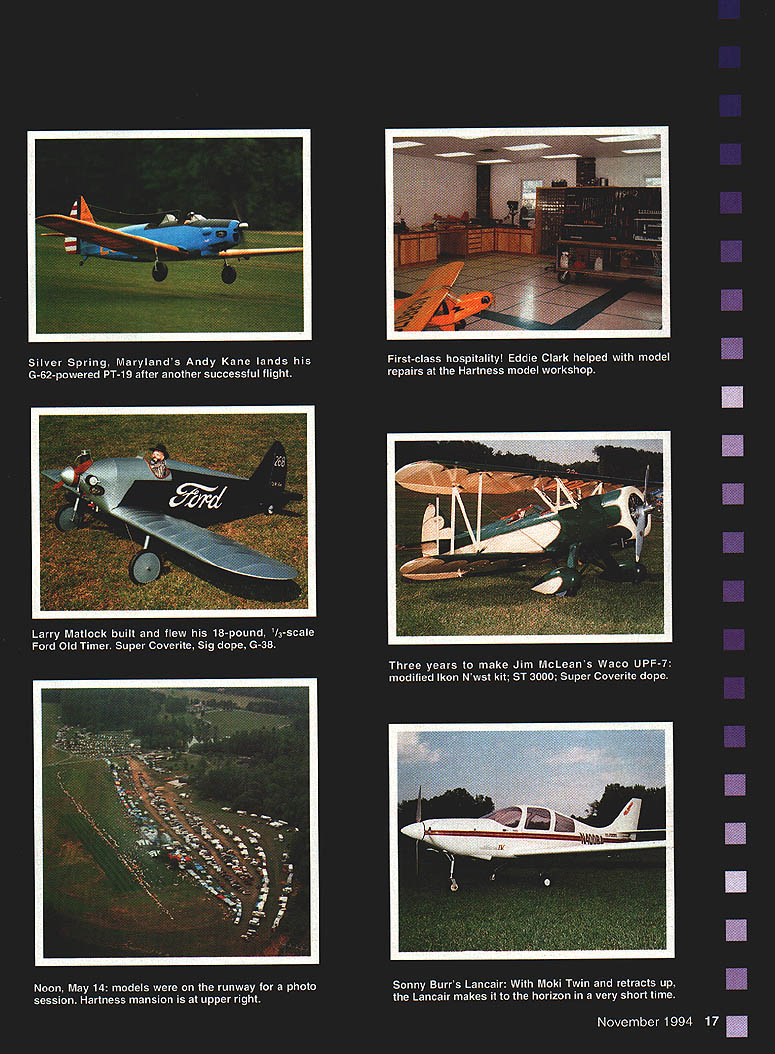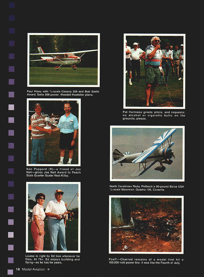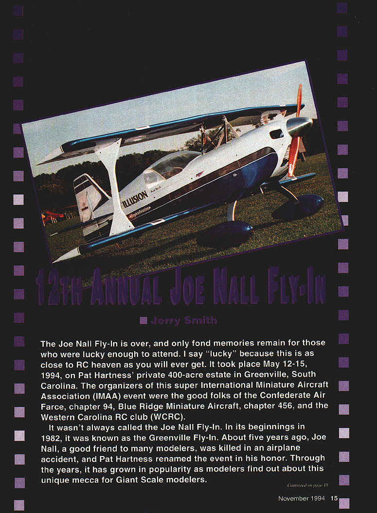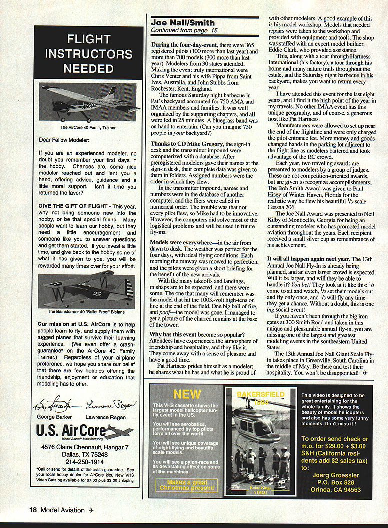 NO OCR TEXT NO OCR TEXT NO OCR TEXT Dear Fellow Modeler experienced modeler no doubt remember first days hobby Chances some nice modeler reached out lent hand offering advice guidance little moral support lsn time returned favor GIVE THE GIFT OF FLIGHT year bring someone new hobby special friend people want leam hobby need little encouragement someone like answer questions get started Invest little time give back hobby some what has given you will rewarded times over fnr effort mlsslen US AlrCere help people learn fly sljpply rugged planes survive learning experience offer crash guarantee* AirCore 40 Family Trainer Regardless airplane preference hope share belief few hobbies offering friendship enjoyment education modeling has offer 4 QJ/ George Barker Lawrence Ragan US Air Coree ModeIAcraf Mandactw 4576 Claire Chennault Hangar 7 Dallas TX 75248 214-250-1914 Call send details crash guarantee See local hobby dealer AirCore kits New VHS video Catalog available $700 plua $300 shipping Joe NallISmith Continued paqe 15 During four-day-event 365 registered pilots 100 last year 700 models 300 last year Modelers 30 states attended Making event truly international Chris Venter wife Pippa Saint Ives Australia John Stubbs Rochester Kent England famous Saturday night barbecue Pats backyard accounted 750 AMA IMAA members families well organized supporting chapters fed 25 minutes bluegrass band hand entertain Can imagine 750 people backyard Thanks CD Mike Gregory sign-in desk transmitter impound computerized database After preregistered modelers gave names sign-in desk complete data given folders Assigned numbers order flew transmitter impound names numbers database another computer fliers called numerical order trouble pilot flew Mike innovative However computers did solve logistical problems will used future fly-ins Models everywherein air dawn dusk weather perfect four days ideal flying conditions morning runway mowed perfection pilots given short briefing benefit new arrivals takeoffs landings mishaps expected some will remember model hit 100K-volt high-tension line end field big ball fire poofthe model gone managed get picture charred remains base tower has event become popular Attendees have experienced atmosphere friendship hospitality like come away sense pleasure have good time Pat Hartness prides himself modeler shares what has what proud other modelers good example model workshop Models needed repairs taken workshop provided equipment tools shop staffed expert model builder Eddie Clark provided assistance along tour through Hartness International factory tour through home nature trails throughout estate Saturday night barbecue backyard makes want return year have attended event last eight years find high point year travels No other LMAA event has unique geography course generous host like Pat Hartness Manufacturers allowed setup near end ffightline charged pilot entrance fee money goods changed hands parking lot adjacent flight line modelers bartered took advantage RC crowd year two traveling awards presented modelers group judges competition-oriented awards given recognize accomplishments. Bob Smith Award given Paul Hisey Winter Haven Florida realistic way flew beautiful t/3scale Cessna 206 Joe Nail Award presented Neil Kilby Monticello Georgia being outstanding modeler has promoted model aviation throughout years recipient received small silver cup remembrance achievement will happen again next year 13th Annual Joe Nail Fly-In already being planned larger crowd expected Will larger will able handle bet look like /3 come sit watch /3 set models out fly once /3 will fly time get chance Without doubt big social event havent through big iron gates 300 Smith Road taken unique pleasurable annual fly-in missing largest greatest modeling events southeastern United States 13th Annual Joe Nail Giant Scale FlyIn takes place Greenville South Carolina middle May test hospitality wont disappointed odel Aviation ore 40 Family Trainer