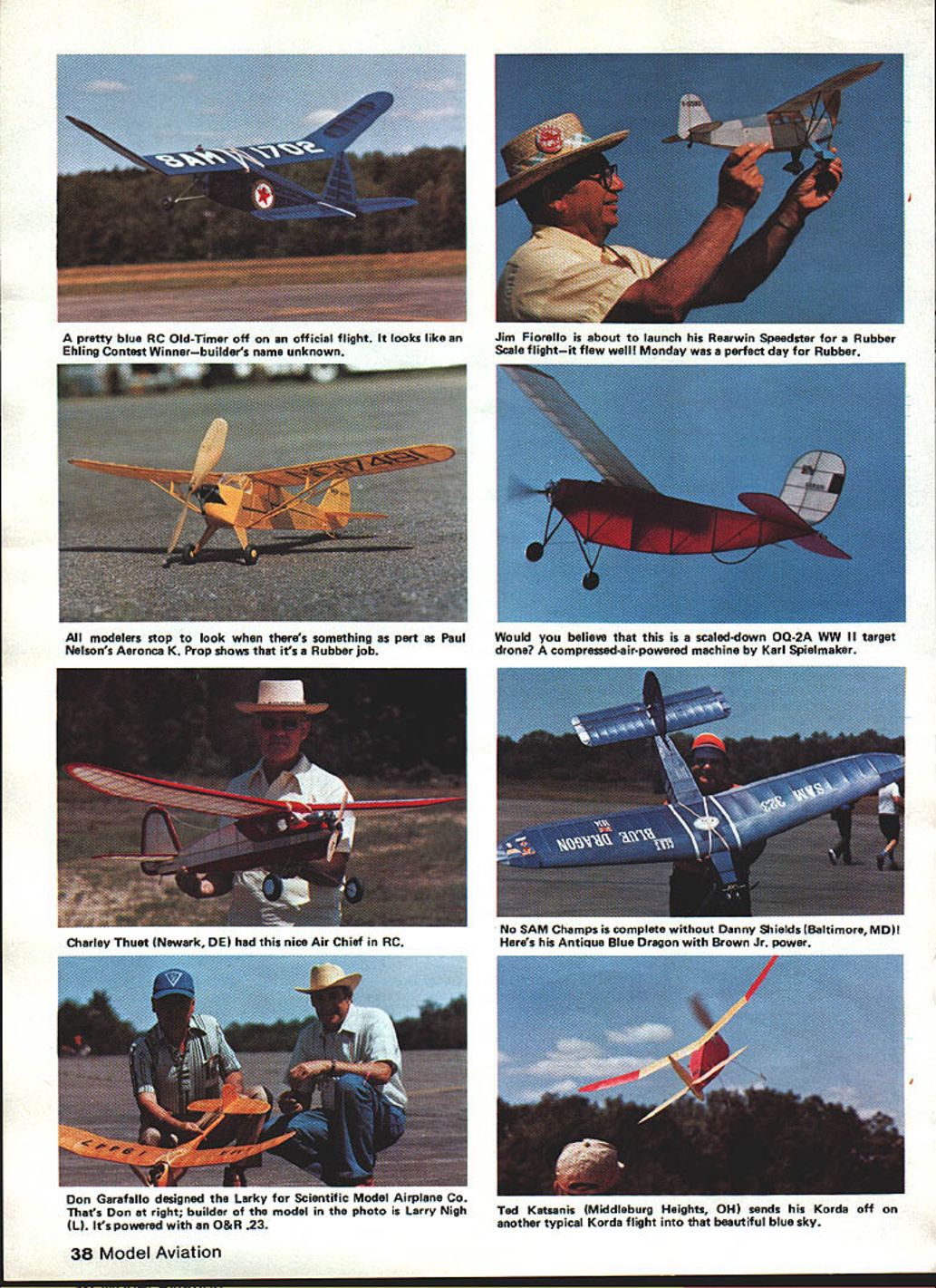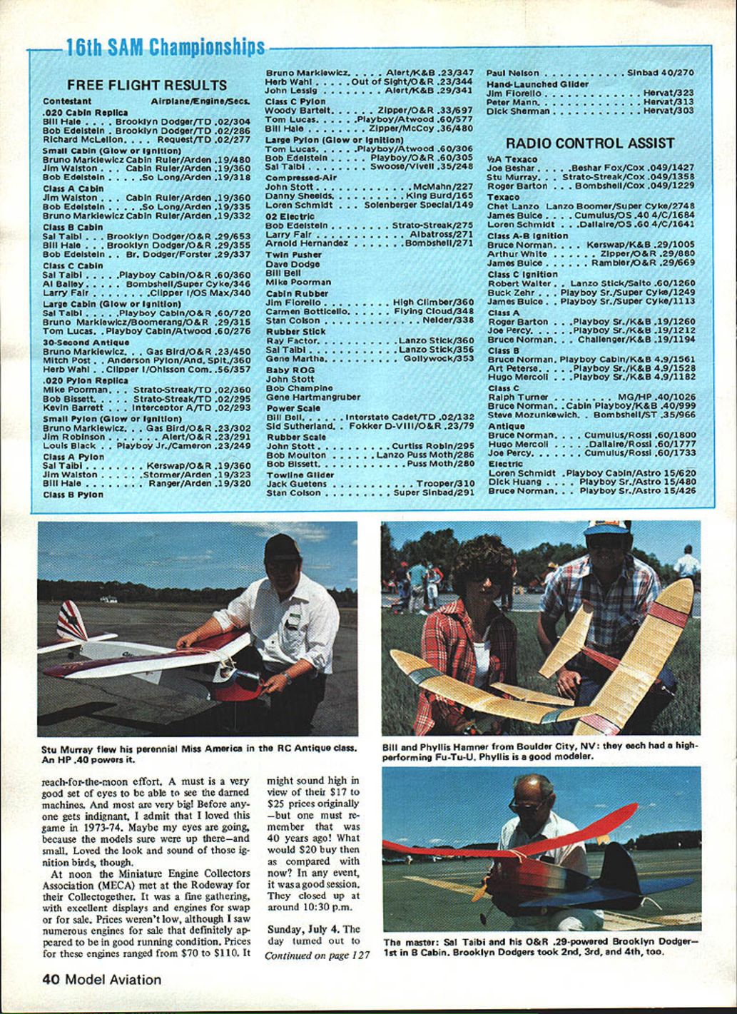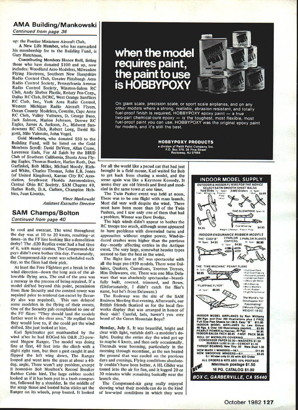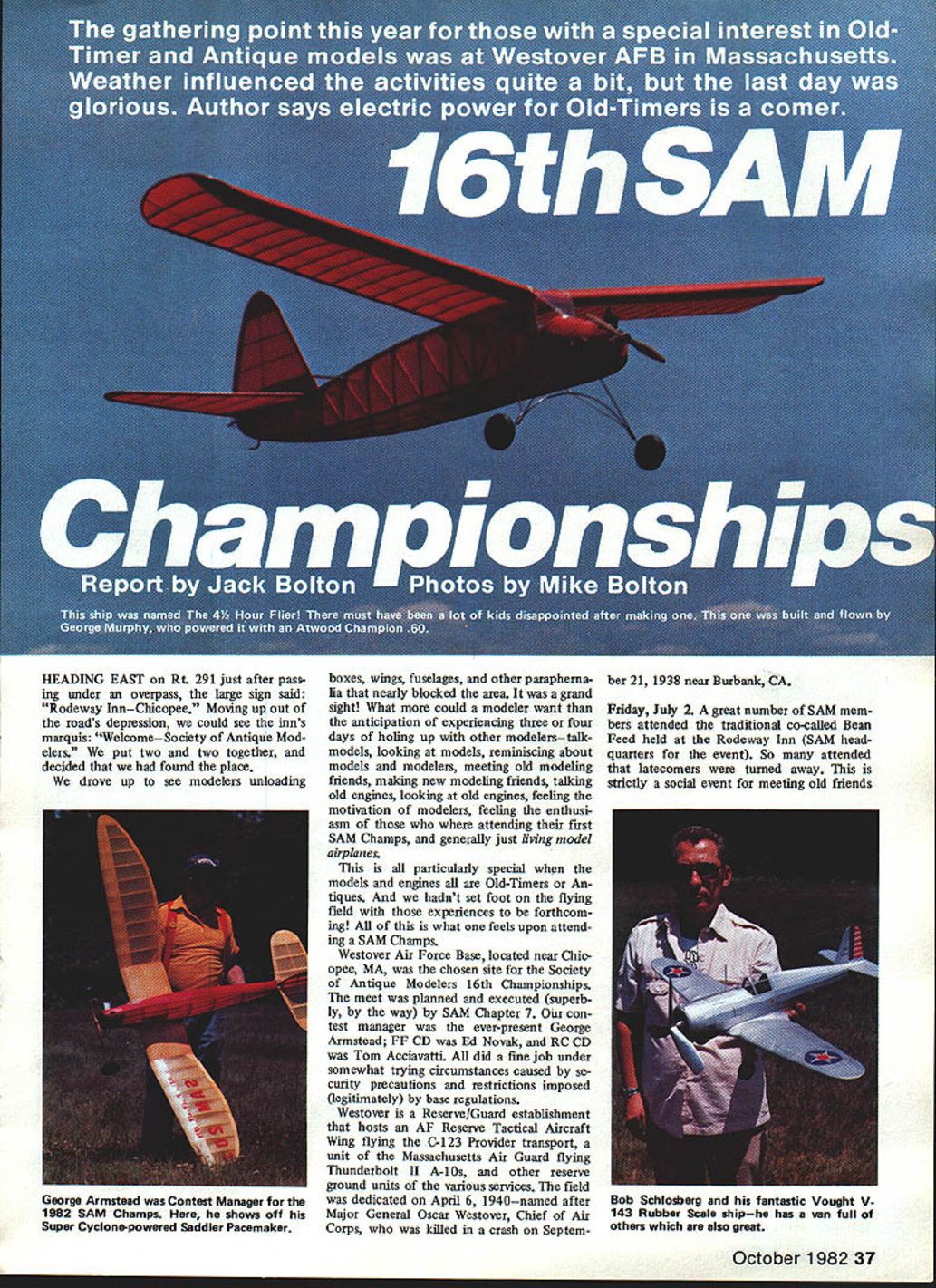 HEADING EAST Rt 291 just after pass ing under overpass large sign said Rodeway InnChicopee Moving up out roads depression could see inns marquis WelcomeSociety Antique Mod elers put two two together decided found place drove up see modelers unloading boxes wings fuselages other parapherna lia nearly blocked area grand sight What could modeler want anticipation experiencing three four days holing up other modelerstalkmodels looking models reminiscing about models modelers meeting old modeling friends making new modeling friends talking old engines looking old engines feeling motivation modelers feeling enthusi sam attending first SAM Champs generally just living model airplanes particularly special models engines Old-Timers An tiques hadnt set foot flying field experiences forthcom ing what feels upon attend ing SAM Champs Westover Air Force Base located near Chic opee MA chosen site Society Antique Modelers 16th Championships meet planned executed superb ly way SAM Chapter 7 con test manager ever-present George Armstead FF CD Ed Novak RC CD Tom Acciavatti did fine job under somewhat trying circumstances caused se curity precautions restrictions imposed legitimately base regulations Westover Reserve/Guard establishment hosts AF Reserve Tactical Aircraft Wing flying C-i 23 Provider transport unit Massachusetts Air Guard flying Thunderbolt II A-i Os other reserve ground units various services field dedicated April 6 i940named after Major General Oscar Westover Chief Air Corps killed crash Septem ber 21 1938 near Burbank CA Friday July 2 great number SAM mem bers attended traditional co-called Bean Feed held Rodeway Inn SAM head quarters event So attended latecomers turned away strictly social event meeting old friends October 1982 37 George Armstead Contest Manager 1982 SAM Champs shows off Super Cyclone-powered Saddler Pacemaker Bob Schloderg fantastic Vought V 143 Rubber Scale shiphe has van full others also great Don Garafallo designed Larky tor Scientitic Model Airplane Co Thats Don right builder model photo Larry Nigh 1 Its powered O&R 23 Tad Katsanis Middleburg Heights OH sends Korda off another typical Korda flight beautiful blue sky 38 Model Aviation pretty blue RC Old-Timer off official flight looks like Ehling Contest Winnerbuilders name unknown Jim Fiorello about launch Rearwin Speedster Rubber Scale flightit flew well Monday perfect day Rubber modelers stop look theres something part Paul Nelsons Aeronca K Prop shows its Rubber job Would believe scaled-down OQ-2A WW II target drone compressed-air-powered machine Karl Spielmaker Charley Thuet Newark DE nice Air Chief RC No SAM Champs complete Danny Shields Baltimore MD Heres Antique Blue Dragon Brown Jr power unwinding journey came afar food excellent camaraderie great held pooi side linen tablecloths napkins Whatever happend original Bean Feed beans bread BS evening tumed very cool fortu nately antifreeze animated conversation provided warmth visiting par ticipating English SAM members Brian Cook Sid Sutherland thought having heat wave Saturday July 3 morning arrived bright cool meet scheduled start 9 am Free Flight fliers arrived earlier some testing Winds picked up generally ran 8 13 knots throughout day RC fliers enjoyed themselves boomed-up flight after flight FFers tougher prevailing winds basically across narrowest portion allowable contest area Numerous models dethermalized trees some retrieved late Monday afternoon However wind-in duced crashes day very low both RC FF wind direction wrong velocity manageable noon came Baby ROG FF event one-flight mass-launch kind thing winner being last down wind 10-knots-plus quite sight dozen grown men help ers strung out across runway com mand put tiny machines runway launched Go signal ferocious critters moved out about four feet lifted immediately did 180-deg turn back looked like Keystone Kops act heroes dancing ROGs flew between legs dodging attackers zipped toward facesor simply swatting like angry bees non-con testants loved wanted encore No takers though way several ROGs hit lift flew like knew what doing Big John Stott last down winner SAM 7 hosting Champs included Free Flight schedule Small 24 cu Large 24 120 cu Cabin Py ion events Small Pylon flown Satur day SAM 7 also provided events model ers ignition engines indications results favorable RC guys side field ap peared thoroughly enjoying events particularly YzA Texaco Class C Ignition Straight RC Old-Timer/Antique seems October 1982 39 Friend Arnie Hernandez brought minsive Dallaire Florida Its powered Saito 60 running ignition RC Antique Joe Konefes Libertyville IL original 1937 Texaco model yes actual 1937 ships recovered converted RC Joe de signed famous Buzzard Bombshell Old-Timer Towline its best Thermic 50 ably built flown Don Osalza stab sure looks huge todays standards Flat tire Trexler airwheel allheres Nick Nottes Forster 99powered Super Buccaneer Built 1967 Charles McLean flew beautiful Taibi Powerhouse RC Antique Big bird uses OS FS 60 4-cycle power Whats name Shereshaw design Model built James Bobice flown RC Antique uses OS FS 40 4-cycle looks like itd make good RC sportster scaled down 16th SAM Championships FREE FLIGHT RESULTS contestantAlrplane/Engine/Seos 020 CabIn Replica Bill Hale ooklyn Dodger/TO 02/304 Bob Edeistein klyn Dodger/TO 02/286 Richard McLeiion quest/TO 02/277 Small cabIn Glow IgnItIon Bruno Marklewicz Cabin Ruler/Arden 191480 JIm Waiston . Cabin Ruler/Arden 19/360 Bob Edeistein So Long/Arden 19/318 Class Cabin Jim Waiston bin Ruler/Arden 19/360 Bob Edeisteln So Long/Arden 19/335 Bruno Marklewicz Cabin Ruler/Arden 19/332 Class B Cabin Sal Talbi oklyn Oodger/O&R 29/653 Bill Hale ooklyn Oodger/O&R 29/355 Bob Edelstein Dodger/Forster 29/337 Class C Cabin Sal Talbi Playboy Cabln/O&R 60/360 Al Bailey.. Bombshell/Super Cyke/346 Larry FaIrClIpper I/OS Max/340 Large Cabin Glow IgnItIon Sal Talbi Playboy Cabln/O&R 60/720 Bruno Markiewicz/Boornerang/O&R 29/315 Tom Lucas. Playboy CabIn/Atwood 60/276 30S