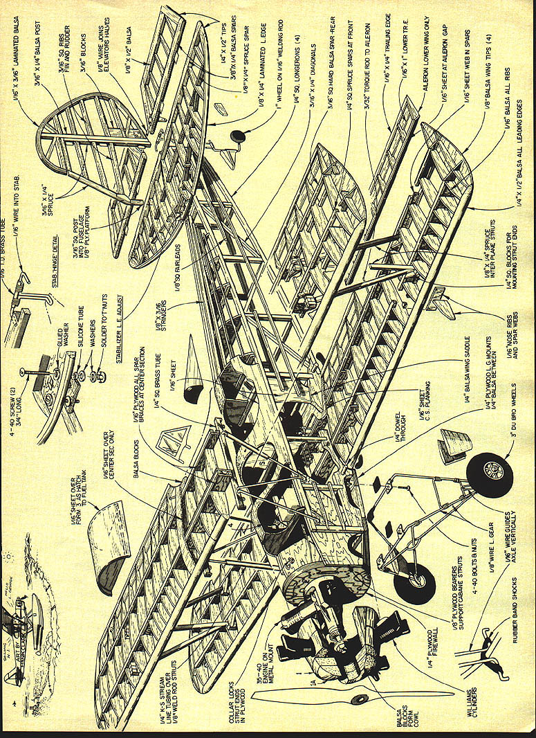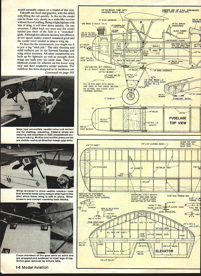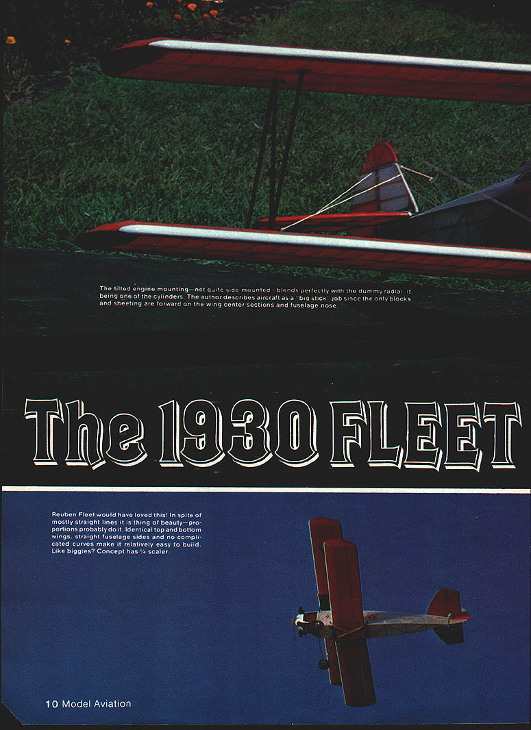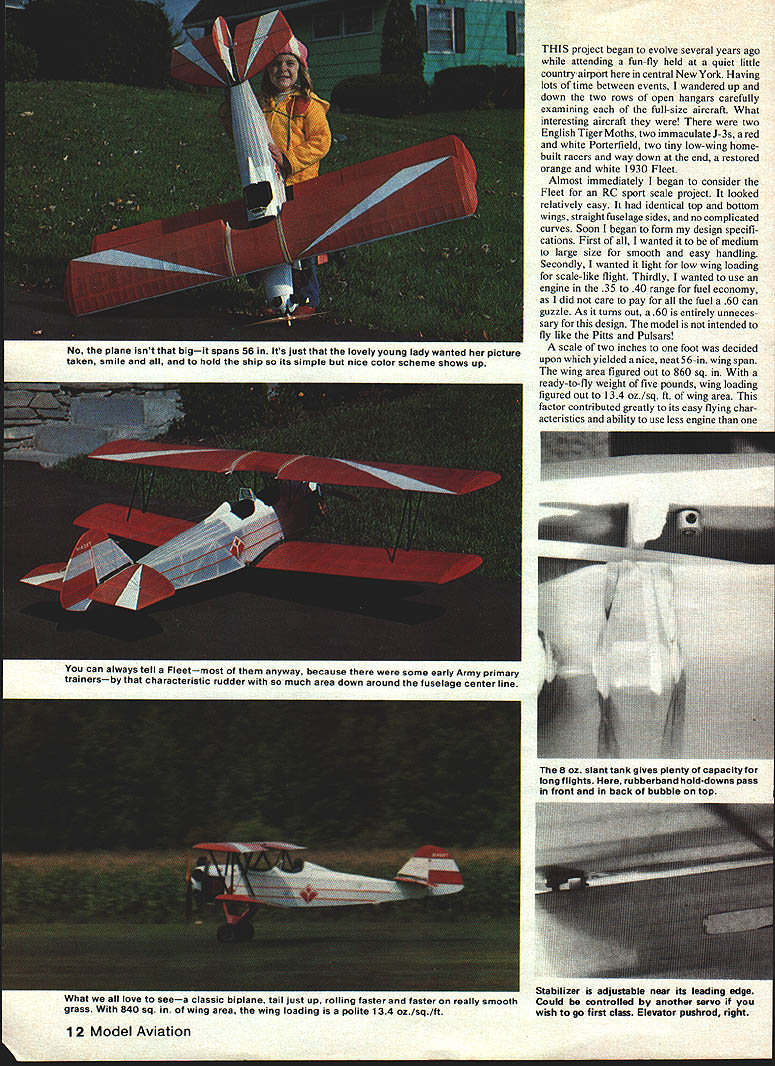 NO OCR TEXT NO OCR TEXT THIS project began evolve several years ago attending fun-fly held quiet little country airport central New York Having lots time between events wandered up down two rows open hangars carefully examining full-size aircraft What interesting aircraft were two English Tiger Moths two immaculate J-3s red white Porterfield two tiny low-wing homebuilt racers way down end restored orange white 1930 Fleet Almost immediately began consider Fleet RC sport scale project looked relatively easy identical top bottom wings straight fuselage sides no complicated curves Soon began form design specifi cations First wanted medium large size smooth easy handling Secondly wanted light low wing loading scale-like flight Thirdly wanted use engine 35 40 range fuel economy did care pay fuel 60 can guzzle As tums out 60 entirely unneces sary design model intended fly like Pitts Pulsars scale two inches foot decided upon yielded nice neat 56-in wing span wing area figured out 860 sq ready-to-fly weight five pounds wing loading figured out 134 oz/sq ft wing area factor contributed greatly its easy flying char acteristics ability use less engine 802 slant tank gives plenty capacity long flights rubberband hold-downs pass front back bubble top 3 12 Model Aviation NO tne plane isnt bigit spans 56 Its just lovely young lady wanted picture taken smile and hold ship its simple nice color scheme shows up can always tell Fleetmost anyway because some early Army primary trainersby characteristic rudder much area down around fuselage center line What love seea classic biplane tail jusi up rolling raster ano raster really smooth grass 840 sq wing area wing loading polite 134 oz/sq/ft Stabilizer adlustable near its leading edge Could controlled another servo wish go first class Elevator pushrod right 1/16 SHEET OVER FORM 3 AS HATCH TO FLELE6NK 1/16 SHEET OVER CENTER SEC ONLY 3A6 X /4 SPRUCE STAB INGE DETAIL 3/1650 POST INTO FUSELAGE I/B PLY PLATFORM OflMOO IVOt 4-4OSCREW2-3/4 LONG WIRE INTO STAB WASHER SIUCONE TUBE WASHERS SOLDER TOTNUTS STABILIZER LE ADJUST BALSA BLOCKS1/16 PLVWXA ALL SIR BRACES AT CENTER SECN 1/4 50 BRASS TUBE 1/16 SHEET N I/B X 3/16 STRINGERS I/BS RURLEADS 1/I6 X 3/16 LAMINATED BALSA 3/16 X 1/4 BALSA POST 3/16 SQ RIBS AND RUDDER 3/16 BLOCKS 7/ 1/B WIRE XINS ELEVATORS HALYES I/B X /2 BALSA COLLAR LOCKS STRUT ENDS IN PLYWcOD 1 lA U BALSA BLOCKS FORM COWL 7 [1/4 X 1/2 TIPS 3/BIX 1/4 BALSA SRARS I/8X1/4 SPRIIE SPAR VS X 1/4 LAMINATED LEDGE WHEEL ON 1/16 WELDING ROD 1/450 LONGERONS 4 3/16 K 1/4 DIAGONALS 3/16 SQ HARD BALSA SR -REAR SO SPRLEE SPARS AT FRONT 3/32 TORQUE ROD TO AILERON 1/16 X 1/4 TRAIUW3 EDGE 1/16 XI LOWERTRE /7 I\ 1/4 DOWEL_ I7~AJI THROUGH /1~47vll PLYWOODC S PLANKING I7/1/16 T IFIREWALL I/B PLYWWO BEARERSEr-vII WILLIAMS1/4 BALSAIANG SADDLE1/I /SUPPORTCABANE STRUTS,I CYLINDERS4-40PLYWOOD L G MOUNTS1/8X 1/4 SPRUCET 1/4 BALSA BETWEEN/I L GEAR/4/INTER PLANE STRUlS RUBBER BAND SHOCKS1/16 WIRE GUIDESI/16NOSE RIBS1/4 50 BLOCKS FOR 1/16 BALSA ALL RIBS AXLE VERilCALLY 3 DU BRO WHEELSAND SPAR WEBSMX*JTING STRUT ENDSI/4X I/2BALSA ALL LEADING EDGES ALERON LOWER WING OtLY 1A6 SHEETAT AILERON GAP 1/16 SHEET WEB IN SPARS I/8BALSA WiNG TIPS 4 0 1/4 LINE 1/8 WEt would normally expect model size Takeoffs short graceful airfoil stab lifting tail quickly air model can flown very slowly scale-like manner fear stalling Being light biplane lots drag will slow down quickly occasion idled back too soon model landed just short field stretched glide Although ailerons became less effective low speed rudder control remained good model never tended drop wing tip describe construction might say just big stick job sheeting solid surfaces forward fuselage wing center sections other components built up lightness well strength Both wings built over same plan identical except ailerons lower wing respective center sections stabilizer has designed its incidence can Continued page 103 14 Model Aviation V4 SO BRASS TUBE WITHCABAItES ANE IA K BS STREAM*ED SCLLIERED BRASS ENDSTIJG OVER 1/B WELD ROD WM BROS 2SCALE CYLS BROWN MOUNTED 20 FROM HORI OFFSET-j FUEL I______ SOFT BALSA NOSE BLOCKS IIIji~I SERVOlII I/4PLY GUS'U L/4SO SPRUCE INOSCREEN BLAcK RLSBER TUBING I/X9rncxOIT 61 flOp WITH 1/16 SI-WET FRG BALSA St HEADRES V T V4xL ON 7 B 1KI/4SO BATTRECEIV AREA__ .vstSA NO--SADDLES1/16 SHEETiNG BET FIREWALL B LG MOUNT IMDER BEARERSI/A BALSA0 WING INODENCE I/B PLY BEARER 1/4 HARD BALSA1/4 PLY LG STRNGERS MOUNT 1/2 WIDE BRASS L G MOUNT PLATES SILVER FILL IN TI-IS AREA WITH BALSASOLDER TO LG SAND TO TI-IS CROSS SECTIONWIRE ANDI/IBMW ON OUTSIDE AND COVER WITH COVERAD MATERIAL I/I PLY/4 PLY BUSS BEARERS 3 WHEELS-FUSELAGE DETAIL 23456 IA BALSA NOSE BLOCKS 1/4 PLY" FIREWALL / / 2 7 /2 .I/4 BALSA 1/4 PLY LG MOUNTS N, V4SOI FUSELAGE~jj TOP VIEW PLANK TOP WING 1/41/2 LEAONG EDGEFROM HERE TO I/B TIP SHEETREAR SPAR 1 -I/BSTIFFI R1/4 GUSSE -VIBBALSA RIBS-t/16PL BE V 1/6 HOLE _ V4, I/B & KEEP I/B TIP STIFFENERSE4TERPLANE STRUT MOUNTS I/B BELOW TOP OF RIBS TO3/32MW TORDUE ROD AVOID CONTACT WITH COVERINGI/4,3/4 MED HARD BALSAI D NT TO TOP OF LOWER AND BOTTOM OF TOP WINGTOROUE TU 4-40 BOLT SOLDER TO BGLT.I1rII] RE TIBBE 1/16 ID NDASSCROSS TIPBEND AT SO B EPOXYSOLDER TO BLIND.....FULL RIB liP RIBSTAB ADd DETAIL NNO B SOLDER STAB REAR HINGE1/lAPLYCUT OUT FOR FIN/4, I/BL E R 3/16 L ___________________UI/16,I/4 ELEV RIBS V II NIl/T VS MW3/B,I/4 BALSA V4,I/2 ~ELEVATOR NII JBALSAIIIIii _____ HINGE II -N VS ,I/2 BALSA" Note accessible needle valve venturi starting adjusting Cabane struts welding rod sheathed K&S streamlined alu minum tubing Mufflerand muff ler pressuretap visibleexhaust direction keeps gop away Wing removed show saddle runnersnote wires lower wing remain attached shot since lower wing still place Windscreens cockpit coaming look lifelike V4,j/2L122 aS axles .rapped soldered front legs top pire gear removes simple tabs Fleet/Brown continued page 14 changed adjusting two 4-40 bolts just behind its leading edge allowing addition