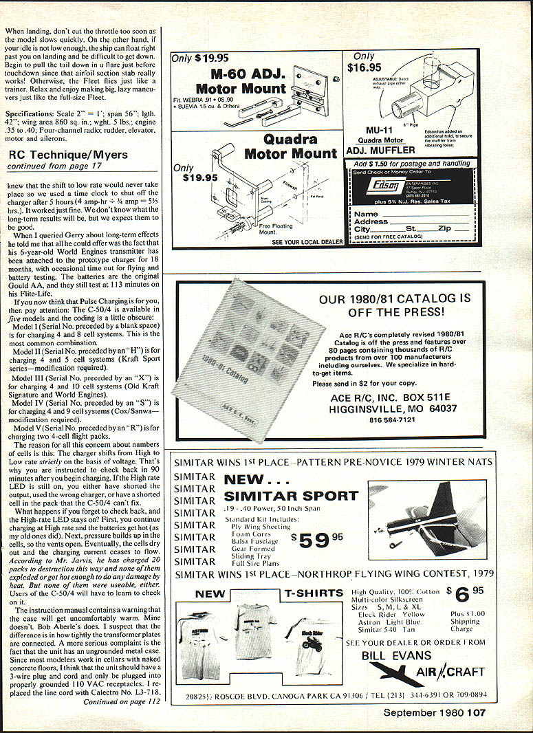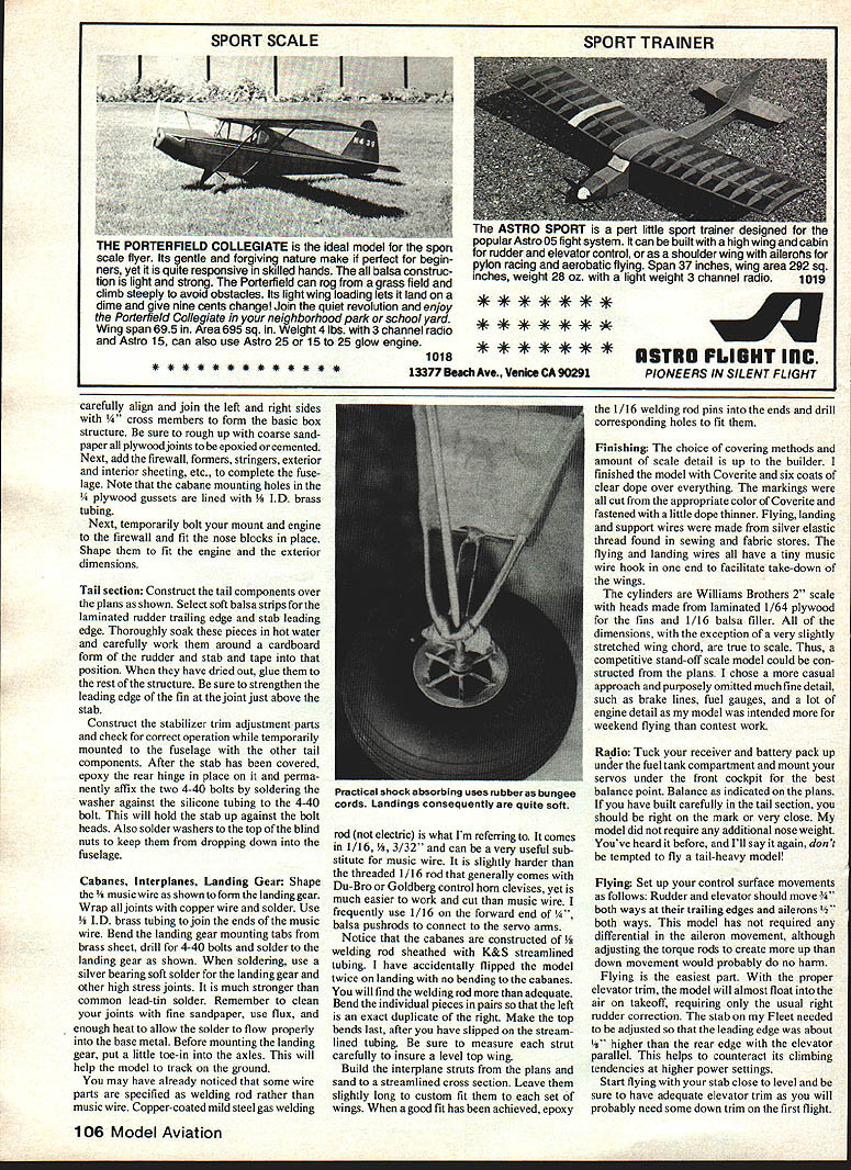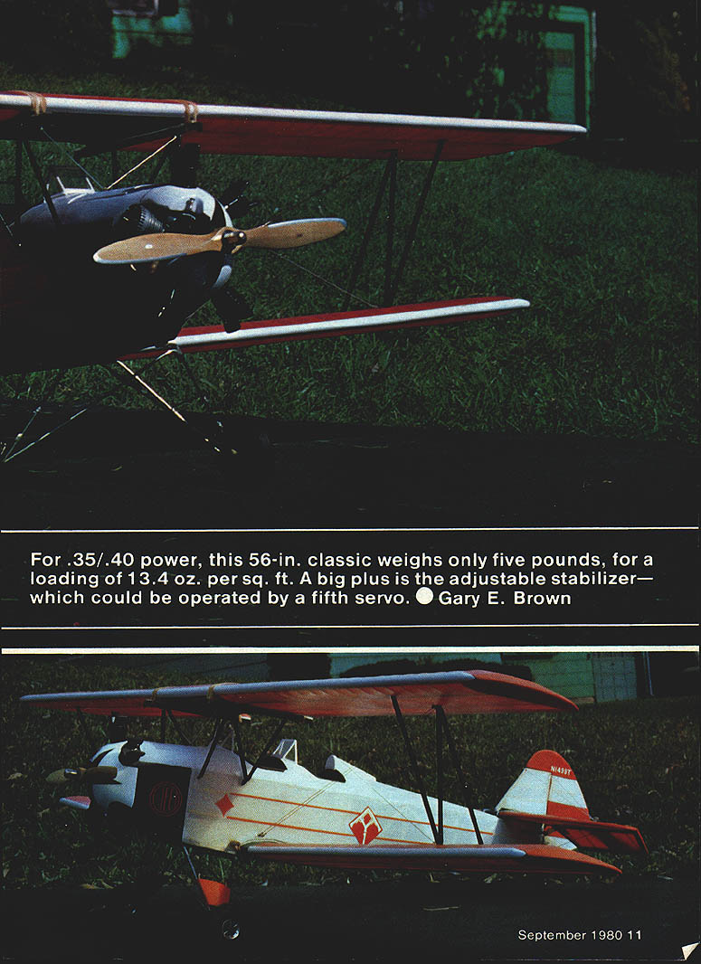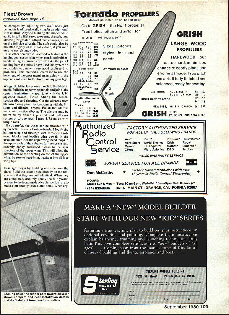 NO OCR TEXT NO OCR TEXT THIS project began evolve several years ago attending fun-fly held quiet little country airport central New York Having lots time between events wandered up down two rows open hangars carefully examining full-size aircraft What interesting aircraft were two English Tiger Moths two immaculate J-3s red white Porterfield two tiny low-wing homebuilt racers way down end restored orange white 1930 Fleet Almost immediately began consider Fleet RC sport scale project looked relatively easy identical top bottom wings straight fuselage sides no complicated curves Soon began form design specifi cations First wanted medium large size smooth easy handling Secondly wanted light low wing loading scale-like flight Thirdly wanted use engine 35 40 range fuel economy did care pay fuel 60 can guzzle As tums out 60 entirely unneces sary design model intended fly like Pitts Pulsars scale two inches foot decided upon yielded nice neat 56-in wing span wing area figured out 860 sq ready-to-fly weight five pounds wing loading figured out 134 oz/sq ft wing area factor contributed greatly its easy flying char acteristics ability use less engine 802 slant tank gives plenty capacity long flights rubberband hold-downs pass front back bubble top 3 12 Model Aviation NO tne plane isnt bigit spans 56 Its just lovely young lady wanted picture taken smile and hold ship its simple nice color scheme shows up can always tell Fleetmost anyway because some early Army primary trainersby characteristic rudder much area down around fuselage center line What love seea classic biplane tail jusi up rolling raster ano raster really smooth grass 840 sq wing area wing loading polite 134 oz/sq/ft Stabilizer adlustable near its leading edge Could controlled another servo wish go first class Elevator pushrod right 1/16 SHEET OVER FORM 3 AS HATCH TO FLELE6NK 1/16 SHEET OVER CENTER SEC ONLY 3A6 X /4 SPRUCE STAB INGE DETAIL 3/1650 POST INTO FUSELAGE I/B PLY PLATFORM OflMOO IVOt 4-4OSCREW2-3/4 LONG WIRE INTO STAB WASHER SIUCONE TUBE WASHERS SOLDER TOTNUTS STABILIZER LE ADJUST BALSA BLOCKS1/16 PLVWXA ALL SIR BRACES AT CENTER SECN 1/4 50 BRASS TUBE 1/16 SHEET N I/B X 3/16 STRINGERS I/BS RURLEADS 1/I6 X 3/16 LAMINATED BALSA 3/16 X 1/4 BALSA POST 3/16 SQ RIBS AND RUDDER 3/16 BLOCKS 7/ 1/B WIRE XINS ELEVATORS HALYES I/B X /2 BALSA COLLAR LOCKS STRUT ENDS IN PLYWcOD 1 lA U BALSA BLOCKS FORM COWL 7 [1/4 X 1/2 TIPS 3/BIX 1/4 BALSA SRARS I/8X1/4 SPRIIE SPAR VS X 1/4 LAMINATED LEDGE WHEEL ON 1/16 WELDING ROD 1/450 LONGERONS 4 3/16 K 1/4 DIAGONALS 3/16 SQ HARD BALSA SR -REAR SO SPRLEE SPARS AT FRONT 3/32 TORQUE ROD TO AILERON 1/16 X 1/4 TRAIUW3 EDGE 1/16 XI LOWERTRE /7 I\ 1/4 DOWEL_ I7~AJI THROUGH /1~47vll PLYWOODC S PLANKING I7/1/16 T IFIREWALL I/B PLYWWO BEARERSEr-vII WILLIAMS1/4 BALSAIANG SADDLE1/I /SUPPORTCABANE STRUTS,I CYLINDERS4-40PLYWOOD L G MOUNTS1/8X 1/4 SPRUCET 1/4 BALSA BETWEEN/I L GEAR/4/INTER PLANE STRUlS RUBBER BAND SHOCKS1/16 WIRE GUIDESI/16NOSE RIBS1/4 50 BLOCKS FOR 1/16 BALSA ALL RIBS AXLE VERilCALLY 3 DU BRO WHEELSAND SPAR WEBSMX*JTING STRUT ENDSI/4X I/2BALSA ALL LEADING EDGES ALERON LOWER WING OtLY 1A6 SHEETAT AILERON GAP 1/16 SHEET WEB IN SPARS I/8BALSA WiNG TIPS 4 0 1/4 LINE 1/8 WEt would normally expect model size Takeoffs short graceful airfoil stab lifting tail quickly air model can flown very slowly scale-like manner fear stalling Being light biplane lots drag will slow down quickly occasion idled back too soon model landed just short field stretched glide Although ailerons became less effective low speed rudder control remained good model never tended drop wing tip describe construction might say just big stick job sheeting solid surfaces forward fuselage wing center sections other components built up lightness well strength Both wings built over same plan identical except ailerons lower wing respective center sections stabilizer has designed its incidence can Continued page 103 14 Model Aviation V4 SO BRASS TUBE WITHCABAItES ANE IA K BS STREAM*ED SCLLIERED BRASS ENDSTIJG OVER 1/B WELD ROD WM BROS 2SCALE CYLS BROWN MOUNTED 20 FROM HORI OFFSET-j FUEL I______ SOFT BALSA NOSE BLOCKS IIIji~I SERVOlII I/4PLY GUS'U L/4SO SPRUCE INOSCREEN BLAcK RLSBER TUBING I/X9rncxOIT 61 flOp WITH 1/16 SI-WET FRG BALSA St HEADRES V T V4xL ON 7 B 1KI/4SO BATTRECEIV AREA__ .vstSA NO--SADDLES1/16 SHEETiNG BET FIREWALL B LG MOUNT IMDER BEARERSI/A BALSA0 WING INODENCE I/B PLY BEARER 1/4 HARD BALSA1/4 PLY LG STRNGERS MOUNT 1/2 WIDE BRASS L G MOUNT PLATES SILVER FILL IN TI-IS AREA WITH BALSASOLDER TO LG SAND TO TI-IS CROSS SECTIONWIRE ANDI/IBMW ON OUTSIDE AND COVER WITH COVERAD MATERIAL I/I PLY/4 PLY BUSS BEARERS 3 WHEELS-FUSELAGE DETAIL 23456 IA BALSA NOSE BLOCKS 1/4 PLY" FIREWALL / / 2 7 /2 .I/4 BALSA 1/4 PLY LG MOUNTS N, V4SOI FUSELAGE~jj TOP VIEW PLANK TOP WING 1/41/2 LEAONG EDGEFROM HERE TO I/B TIP SHEETREAR SPAR 1 -I/BSTIFFI R1/4 GUSSE -VIBBALSA RIBS-t/16PL BE V 1/6 HOLE _ V4, I/B & KEEP I/B TIP STIFFENERSE4TERPLANE STRUT MOUNTS I/B BELOW TOP OF RIBS TO3/32MW TORDUE ROD AVOID CONTACT WITH COVERINGI/4,3/4 MED HARD BALSAI D NT TO TOP OF LOWER AND BOTTOM OF TOP WINGTOROUE TU 4-40 BOLT SOLDER TO BGLT.I1rII] RE TIBBE 1/16 ID NDASSCROSS TIPBEND AT SO B EPOXYSOLDER TO BLIND.....FULL RIB liP RIBSTAB ADd DETAIL NNO B SOLDER STAB REAR HINGE1/lAPLYCUT OUT FOR FIN/4, I/BL E R 3/16 L ___________________UI/16,I/4 ELEV RIBS V II NIl/T VS MW3/B,I/4 BALSA V4,I/2 ~ELEVATOR NII JBALSAIIIIii _____ HINGE II -N VS ,I/2 BALSA" Note accessible needle valve venturi starting adjusting Cabane struts welding rod sheathed K&S streamlined alu minum tubing Mufflerand muff ler pressuretap visibleexhaust direction keeps gop away Wing removed show saddle runnersnote wires lower wing remain attached shot since lower wing still place Windscreens cockpit coaming look lifelike V4,j/2L122 aS axles .rapped soldered front legs top pire gear removes simple tabs Fleet/Brown continued page 14 changed adjusting two 4-40 bolts just behind its leading edge allowing addition