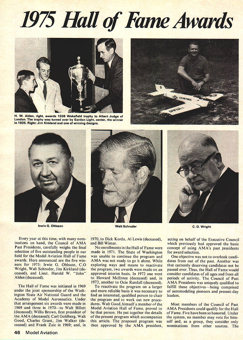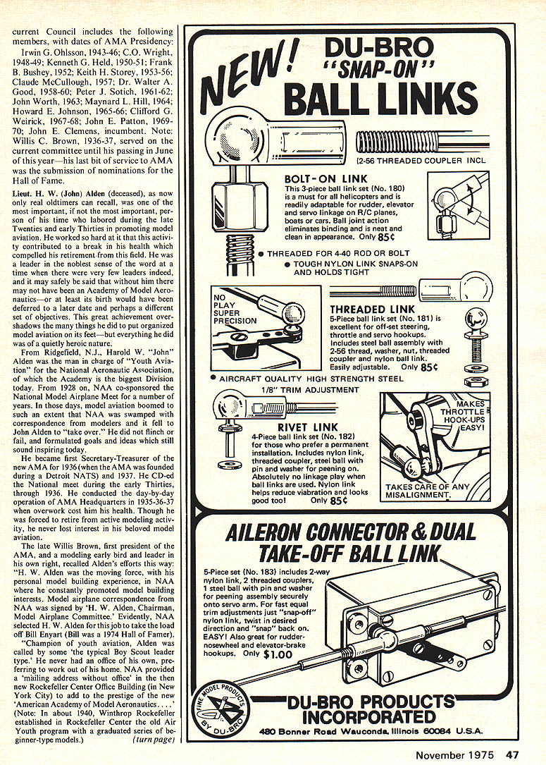 1975 Hall Fame Awards year time nom inations hand Council AMA Past Presidents carefully weighs final selection five outstanding people field Model Aviation Hall Fame awards announced five win ners 1975 Irwin G Ohlsson CO Wright Walt Schroder Jim Kirkland de ceased Lieut Harold W John Alden deceased Hall Fame initiated 1969 under joint sponsorship Wash ington State Air National Guard Academy Model Aeronautics Under arrangement six awards made 1969 three 1970to Walt Billett deceased Willis Brown first president AMA deceased Carl Goldberg Walt Good Charles Grant Jim Walker de ceased Frank Zaic 1969 1970 Dick Korda Al Lewis deceased Bill Winter No enrollments Hall Fame made 1971 State Washington unable continue program AMA ready go alone exploring ways means reactivate program two awards made approved interim basis 1972 went Howard McEntee deceased 1973 another Ocie Randall deceased reactivate program larger reliable basis necessary find interested qualified person chair program work out new proce dures Walt Good himself member Model Aviation Hall Fame proved person put together details present program accompanies article proposed program approved AMA president acting behalf Executive Council previously approved basic concept using AMAs past presidents award selection objective overlook candi dates out past Another currently deserving candidates passed over Thus Hall Fame would consider candidates ages periods activity Council Past AMA Presidents uniquely qualified fulfill objectives being comprised aeromodeling pioneers present-day leaders Most members Council Past AMA Presidents could qualify Hall Fame Five have honored Under system no member may vote him self group consider nominations other sources 46 Model Aviation H W Alden right awards 1936 Wakefield trophy Albert Judge London trophy turned over Gordon Light center winner 1936 Right Jim Kirkland winning designs Irwin G Ohlsson Walt Schroder C 0 Wright current Council includes following members dates AMA Presidency Irwin G Ohlsson 1943-46 CO Wright 1948-49 Kenneth G Held 1950-51 Frank B Bushey 1952 Keith H Storey 1953-56 Claude McCullough 1957 Dr Walter Good 1958-60 Peter J Sotich 1961-62 John Worth 1963 Maynard L Hill 1964 Howard E Johnson 1965-66 Clifford G Weirick 1967-68 John E Patton 196970 John E Clemens incumbent Note Willis C Brown 1936-37 served current committee until passing June yearhis last bit service AMA submission nominations Hall Fame Lieut H W John Alden deceased now real oldtimers can recall important important per son time labored during late Twenties early Thirties promoting model aviation worked hard activi ty contributed break health compelled retirementfrom field leader noblest sense word time very few leaders indeed may safely said him may have Academy Model Aero nauticsor least its birth would have deferred later date perhaps different set objectives great achievement over shadows things did put organized model aviation its feetbut everything did quietly heroic nature Ridgefield NJ Harold W John Alden man charge Youth Avia tion National Aeronautic Association Academy biggest Division today 1928 NAA co-sponsored National Model Airplane Meet number years days model aviation boomed such extent NAA swamped correspondence modelers fell John Alden take over did flinch fail formulated goals ideas still sound inspiring today became first Secretary-Treasurer new AMA 1936 AMA founded during Detroit NATS 1937 CD-ed National meet during early Thirties through 1936 conducted day-by-day operation AMA Headquarters 1935-36-37 overwork cost him health Though forced retire active modeling activ ity never lost interest beloved model aviation late Willis Brown first president AMA modeling early bird leader own right recalled Aldens efforts way H W Alden moving force personal model building experience NAA constantly promoted model building interests Model airplane correspondence NAA signed H W Alden Chairman Model Airplane Committee Evidently NAA selected H W Alden forthisjobto take load off Bill Enyart Bill 1974 Hall Famer Champion youth aviation Alden called some typical Boy Scout leader type never office own pre ferring work out home NAA provided mailing address office new Rockefeller Center Office Building New York City add prestige new American Academy Model Aeronautics. Note about 1940 Winthrop Rockefeller established Rockefeller Center old Air Youth program graduated series ginner-type modelsturn page DU-BRO SNAP-ON BALL LINKS ________________________ 2-56 THREADED COUPLER INCL fl 0 THREADED FOR 4-40 ROD OR BOLT N TOUGH NYLON LINK SNAPS-ON AND HOLDS TIGHT L2 THREADED LINK 5-Piece ball link set No 181 excellent off-set steering throttle servo hookups Includes steel ball assembly 2-56 thread washer nut threaded coupler nylon ball link Easily adjustable Only 85 AIRCRAFT QUALITY HIGH STRENGTH STEEL 1/8 TRIM ADJUSTMENT ___r IJIllllh)I RIVET LINK 4-Piece ball link set No 182 prefer permanent installation Includes nylon link threaded coupler steel ball pin washer peening Absolutely no linkage play ball links used Nylon link helps reduce viabration looks good tool Only 85 AILERONCONNECTOR&DUAL -OFF BALL LINK 5-Piece set No 183 includes 2-way nylon link 2 threaded couplers 1 steel ball pin washer peening assembly securely onto servo arm fast equal trim adjustments just snap-off nylon link twist desired direction snap back EASY Also great rudder DUrn CO ORATED %LJ480 Banner Road Wauconda Illinois 60084 USA BOLT-ON LINK 3-piece ball link set No 180 must helicopters readily adaptable rudder elevator servo linkage R/C planes boats cars Ball joint action eliminates binding neat clean appearance OnlV 85C November1975 47 NOPLAYZzz SUPER PRECISION MAKES THROTTLE HOOK-UPS 4TAKES CARE OF ANY MISALIGNMENT Hall Fame Awards Alden very much leader National contests saw prizes trophies available NAA help provided banquet annually Frank Zaic another oldtimer recalls working personally Alden Although may have country wide feeling early thirties Fran