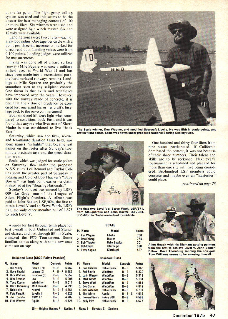 1975 Dan Pruss IIfeague &Iiournament IN 1970 first LSF Tournament scheduled registration mark 100 seemed milestone contest attendance fact LSF mem bership just pushing 100 mark made contest figure improbability year limit 150 placed pre-registration tournament could remain manage able dates August 30 31 1975 place Costa Mesa Calif site Mile Square Co-Contest Directors John Donelson Bob Hahn tasks 5-minute duration 7-minute duration 10-minute precision-duration 2-minute precision 4-lap speed-distance task over 150-meter course 10-minute duration tasks except speed-distance normalizing factors perfect score netted 1000 points would make cal culating easier old system whereby best score task resulted 1000 points others pro-rated respect top scorer speed-duration task flat 480 points 40 per quarter lap awarded just finishing course finished four laps time plotted graph bonus would earned interesting concept well thought out Donelson Hahn Held August 30-3 1 Mile Square Costa Mesa event popular pre-registration limit 1 50 contestants necessary Since published rule book graph presented 1000 800 600 Time-Points 400 200 0 I 123 Time-Minutes rules stated time points will awarded finishing task less four minutes open-ended task possibility achieving 1000 points task flown ex ceptionally fast task purposely sized long enough contestants will complete distance therefore considerable judgment will required de cide whether fly fast slow ballast wind lift etc b Completing course L/D max should result approximately 800 points c Ballasting good lift can result 1300 plus possible score task merit open-ended feature wouldnt necessarily allow anyone run away disproportionately high score evident top score task posted 1020 points task placed fifth order give contestant opportunity fly conservatively boldly depending standing So long speed distance tasks thermal sailplane competition will also controversy pro ponents speed tasks denounce distance events because luck factors involved order achieve mileage defend distance tasks claim speed merely test structural integrity model two tasks can combinedas Donelson Hahn---then perhaps new event will encouraged both camps As did finish course 13 quarter laps still encourage clubs try task attempt out cluck factor rounds possible should flown given contest Due early morning fog Sunny Cali fornia didnt happen until about 930 both days spite late start tasks run quick times around two hours exception being speeddistance closer three hours expected because time manpower required identify sail plane prior launch again time 46 Model Aviation Dr Barbara Henon 1972 Tournament winner being coached Dick Shilling Timer Bob Von Hellens First Tournament held 1970 Denny Darnell checking sky before launching Aquila Next years Tournament planned site optimists think perhaps 600 1SF members might compete far pylon flight group call-up system used seems answer best managing contests 100 fliers Six winches used assigned winch master Six 12 volts available Landing zones two circleseach 25-foot radius tape per circle point per three-in increments marked direct read-outs Landing values 0-100 points Landing judges utilized measurements Flying done off hard surface runway Mile Square once military airfield used World War II has since made recreational park hard-surfaced runways remain Land ings Mile Square probably smoothest seen sailplane contest factor skills techniques have improved over years However runway made concrete best virtue prudence exer cised lest grind crafts fuse lage back servo compartment Both wind lift light com pared conditions back East found anyone lives east Sierra Madre also considered live back East Saturday saw five- seven- ten-minute duration tasks held saw some names lights became just names roster after Sundays twominute precision task speed-dura tion event Scale judged static points Saturday flew under proposed NSS rules Lee Renaud Taylor Col lins spent greater part Saturday judging Colonel Bob Thackers Baby Bowlus high point earner claim also Soaring Nationals Sundays banquet emceed LSF/ 009Le Gray League Silent Flights founders tribute paid John Baxter LSF/024 first attain Level V Steve Work LSF/ 571 other member out 1575 reach Level V Awards first through tenth place best overall both Unlimited Stand ard classes first through fifth Scale climaxed 1975 Tournament Some familiar names along some new ones came out top SCALE P1 Name 1 Ken Wajjner 2 Don Edberg 3 Bob Thacker 4 Bob Elliott 5 Terry Koplan Unlimited Class 5020 Points Possible P1 Name 1 Bill Nibley 2 Dave Shadel 3 Rick Walters 4 Rick Pearson 5 Terry Koplan 6 Dave Thornburg 7 NeilNolte 8 Pete Parszik 9 Jim Tomblin 10 Fred Weaver Model Pierce 970 Jacana 0 Rainbow 0 Leo Windrifter Mod Cumulus Kestral Javelin II ASW 17 Aquila Controls RE REF RE RE RE RE RES RE RE RE Model Libelle Duster Baby Bowlus Glastlugel l3lasflugel Pouts 766 754 701 650 587 Standard Class Points 5767 5583 5557 5096 5011 4999 4851 4826 4787 4726 P1 Name 1 Bob Thacker 2 Red Smith 3 Lono Bleweti 4 Mark Smith 5 Steve Work 6 Bob Slater 7 Jim Wiseman 8 Jim White 9 Howard Sears 10 KeNy Pike Model Hobie Hawk Windfree Windritter Windtree Windritter Windritter Hobie Hawk Aquila Pokey 808 Hobie Hawk Controls RE RE RE RE RE RE RE RES RE RE Points 5345 5330 5312 5134 4961 4842 4791 4619 4593 4577 0Original Design RRudder FFlaps EElevator SSpoilers One-hundred thirty-four fliers nine states participated California dominated contest because sheer numbers talent skills reckoned Next years tournament scheduled planned site five being consid ered Six-hundred LSF members could compete maybe Easterner could place continued page 78 December1975 47 Scale winner Ken Wagner modified Soarcraft Libelle fifth static points first flight points Scale flown under proposed National Soaring Society rules first two Level Vs Steve Work LSF/571 Albuquerque John Baxter LSF/024 California Tasks indeed formidable Allen Hough Diamant getting pointers first achieve Level V