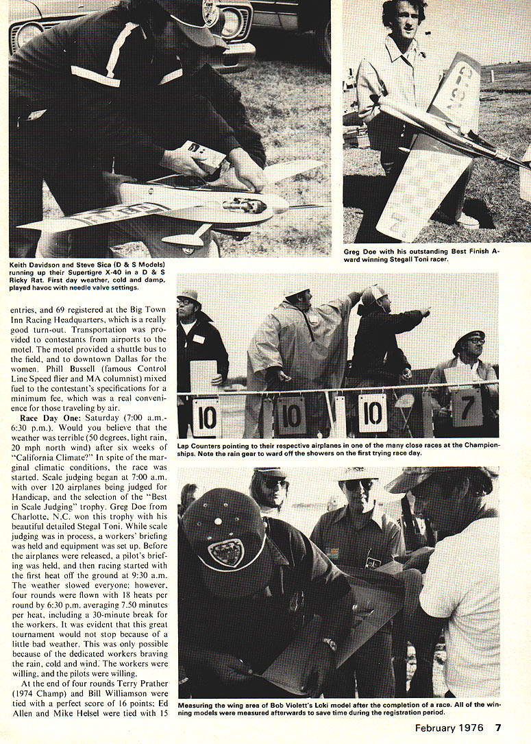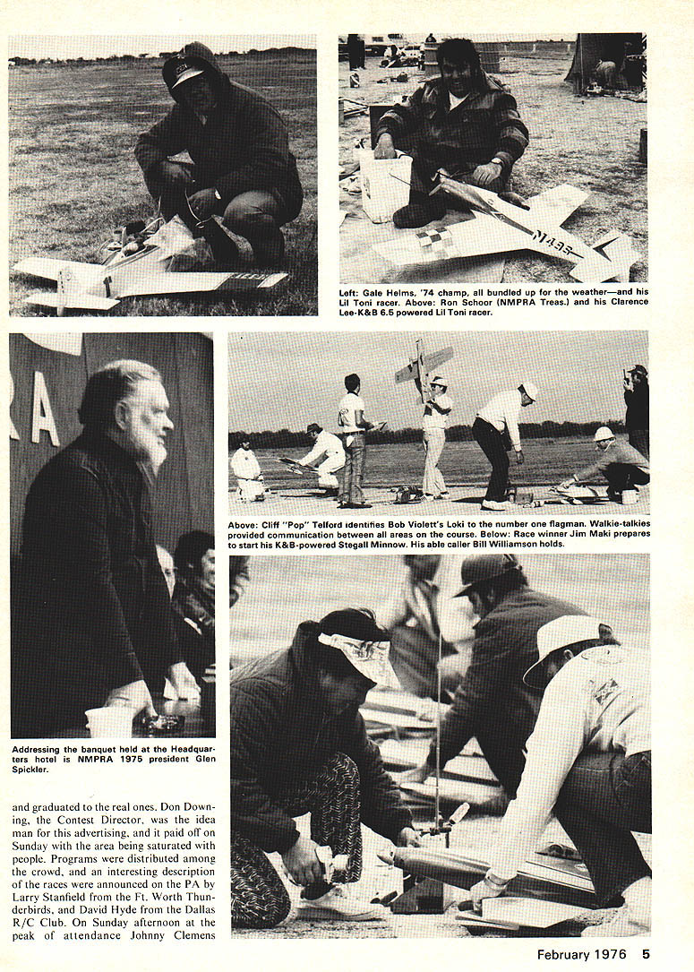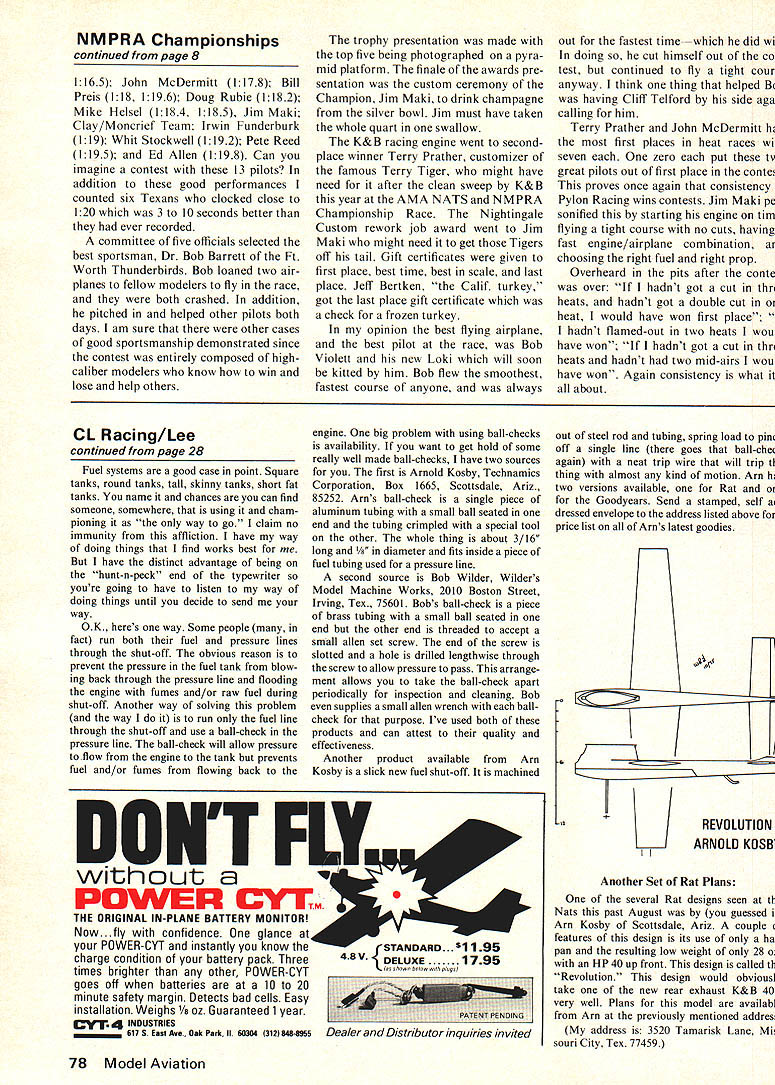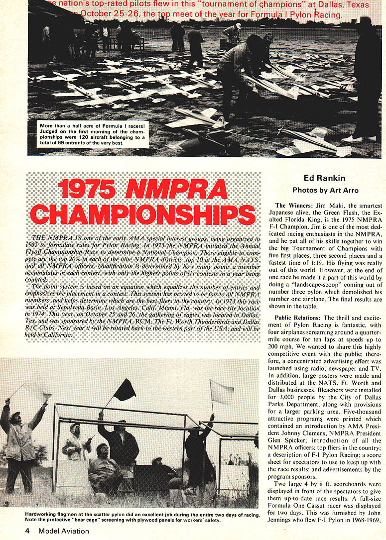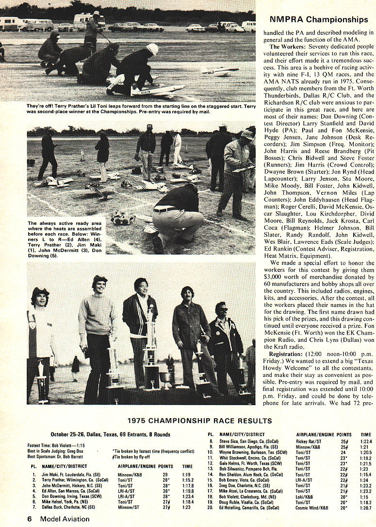1 #ZAi te heap AMA vpedd aetg4p J24i N PMeQ44ff qeot npe4b2 hin btmb 2i4epoA ry ieoi Iae eutiwa tei Thi th2h 4VjA neberheie4dhe *i I9 1 dd pIgA2 i i74 ThitIea n Oewbr 25a JtW atketipg epg4s wets y6ege4n1bd1Ia sp4n4 t NMYJ FL WqNh The4dlWi oA sjeri parti htCaPZmrq 4 Model Aviation Photos Art Arro Winners Jim Maki smartest Japanese alive Green Flash Ex alted Florida King 1975 NMPRA F-I Champion Jim ded icated racing enthusiasts NMPRA put skills together win big Tournament Champions five first places three second places fastest time 119 flying really out world However end race made part world doing landscape-scoop coming out number three pylon demolished number airplane final results shown table Public Relations thrill excite ment Pylon Racing fantastic four airplanes screaming around quartermile course ten laps speeds up 200 mph wanted share highly competitive event public fore concentrated advertising effort launched using radio newspaper TV addition large posters made distributed NATS Ft Worth Dallas businesses Bleachers installed 3000 people City Dallas Parks Department along provisions larger parking area Five-thousand attractive program printed contained introduction AMA Presi dent Johnny Clemens NMPRA President Glen Spicker introduction NMPRA officers top fliers country description F-I Pylon Racing score sheet spectators use keep up race results advertisements program sponsors Two large 4 8 ft scoreboards displayed front spectators give up-to-date race results full-size Formula Cassut racer displayed two days furnished John Jennings flew F-I Pylon 1968-1969 22222222222222222222222222222 222222222 222222-222222222222 22>222222>2>222222222222222222222222 2222>2222222222 U UIW~J@UID Ed Rankin Hardworking flagman scatter pylon did excellent job during entire two days racing Note protective bear cage screening plywood panels workers safety graduated real ones Don Down ing Contest Director idea man advertising paid off Sunday area being saturated people Programs distributed among crowd interesting description races announced PA Larry Stanfield Ft Worth Thun derbirds David Hyde Dallas R/C Club Sunday afternoon peak attendance Johnny Clemens February 1976 5 Left Gale Helms 74 champ bundled up weatherand Lil Toni racer Above Ron Schoor NMPRA Treasl Clarence Lee-K&B 65 powered Lil Toni racer Above Cliff Pop Telford identifies Bob Violetts Loki number flagman Walkie-talkies provided communication between areas course Below Race winner Jim Maki prepares start K&B-powered Stegall Minnow able caller Bill Williamson holds Addressing banquet held Headquar ters hotel NMPRA 1975 president Glen Spickler NMPRA Championships handled PA described modeling general function AMA Workers Seventy dedicated people volunteered services run race effort made tremendous suc cess area beehive racing activ ity nine F-I 13 QM races AMA NATS already run 1975 Conse quently club members Ft Worth Thunderbirds Dallas R/C Club Richardson R/C club anxious par ticipate great race names Don Downing Con test Director Larry Stanfield David Hyde PA Paul Fon McKensie Peggy Jensen Jane Johnson Desk Re corders Jim Simpson Freq Monitor John Harris Reese Brandberg Pit Bosses Chris Bidwell Steve Foster Runners Jim Harris Crowd Control Dwayne Brown Starter Jon Rynd Head Lapcounter Larry Jenson Stu Moore Mike Moody Bill Foster John Kidwell John Thompson Vernon Miles Lap Counters John Eddyhausen Head Flag man Roger Cerelli David McKensie Os car Slaughter Lou Kirchdorpher Divid Moore Bill Reynolds Jack Krosta Carl Coca Flagman Helmer Johnson Bill Slater Randy Randolf John Kidwell Wes Blair Lawrence Fads Scale Judges Ed Rankin Contest Adviser Registration Heat Matrix Equipment made special effort honor workers contest giving S3000 worth merchandise donated 60 manufacturers hobby shops over country included radios engines kits accessories After contest workers placed names hat drawing first name drawn pick prizes drawing con tinued until everyone received prize Fon McKensie Ft Worth won EK Cham pion Radio Chris Lyns Dallas won Kraft radio Registration 1200 noon- 1000 pm Friday wanted extend big Texas Howdy Welcome contestants make stay convenient pos sible Pre-entry required mail final registration extended until 1000 pm Friday could done tele phone late arrivals 72 pre Fastest Time Bob Violett1 15 Best Scale Judging Greg Doe Best Sportsman Dr Bob Barrett PL NAME/CITY/DISTRICT 1 Jim Maki Ft Lauderdale Fla SE 2 Terry Prather Wilmingten Ca SoCal 3 John McDermitt Hickory NC SE 4 Ed Allen San Marcos Ca SoCal 5 Don Downing Irving Texas SCW 6 Mike Heloel York Pa NE 7 Dallas Buck Charlotte NC SEl Tie broken tastest time frequnocy conflict #Tie broken fly-off AIRPLANE/ENGINE POINTSTIME Miooow/K&B Toni/ST Toni/ST LRI-A/ST LRI-A/ST Toni/ST Minnow/ST 29119 281152 2B1176 2B1198 2B1234 27#1164 21#123 Pt NAME/CITY/DISTRICT B Steve Sica San Diego Ca SoCal 9 Bill Williamson Apodigo Flu SE 10 Wayne Browning Burlnoon Tex SCW 11 Whit Stockwell Encino Ca SoCal 12 Gale Helms Ft Worth Texas SCW 13 Bob Silwanicz Pompano Bch Flu 14 Ron Sheldon Aloe Rock Ca SoCal 15 Bob Emery Vista Ca SoCal 16 Greg Doe Charlotte NC SEl 17 Mike Atzei La Crescenta Ca SoCal 18 Bob Violett Clarkoburg Md NE 19 Doug Ruble Visalia Ca SoCal 20 Ed Hotelling Camarillo Ca SoCal AIRPLANE/ENGINEPOINTS Rickey Rat/ST25# Minnow/K&B25# Toni/ST24 Toni/ST23 Toni/ST23 Toni/ST22# Toni/ST22# 181-A/ST22# Toni/ST21# Tooi/ST21# Loki/K&B20 Toni/ST20 Cosmic Wiod/K&B201207 TIME 1224 121 1205 1192 12 15 123 1154 124 1232 1232 115 1162 6 Model Aviation Theyre off l Terry Prathers LII Toni leaps forward starting line staggered start Terry second-place winner Championships Pre-entry required mail 1975 CHAMPIONSHIP RACE RESULTS October 25-26 Dallas Texas 69 Entrants 8 Rounds Greg Doe outstanding Best Finish AKeith Daviason ana bteve aica u S Moaeisiward winning Stegall Toni racer running up Suportiie X-40 D & S RiCky Rat First day weather cold damp played havoc needle valve settings entries 69 registered Big Town I