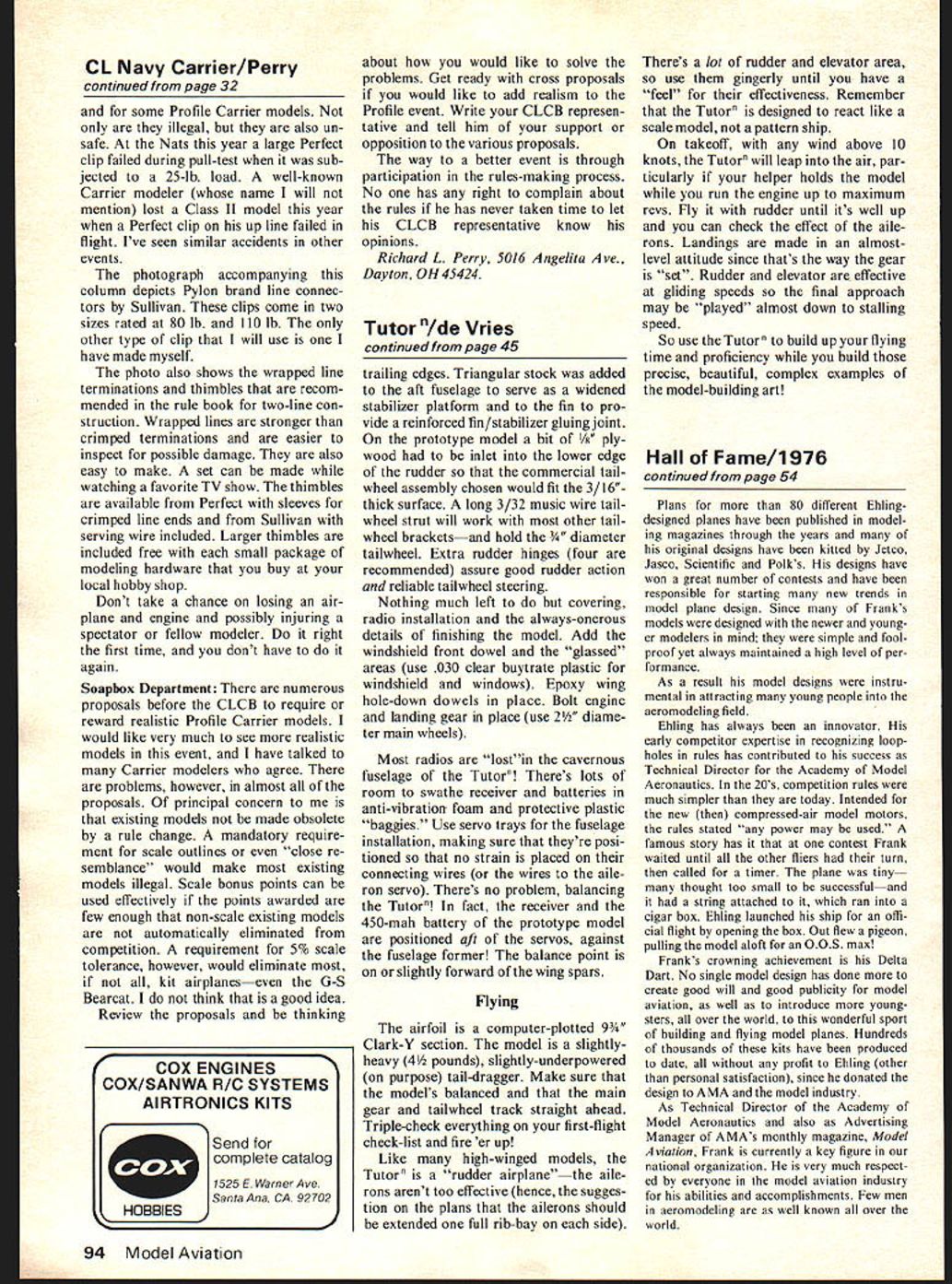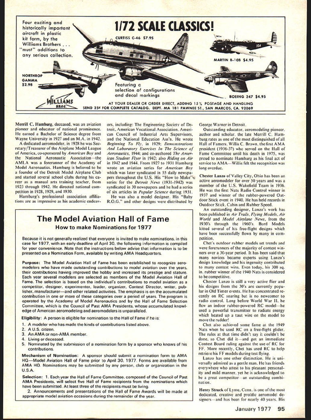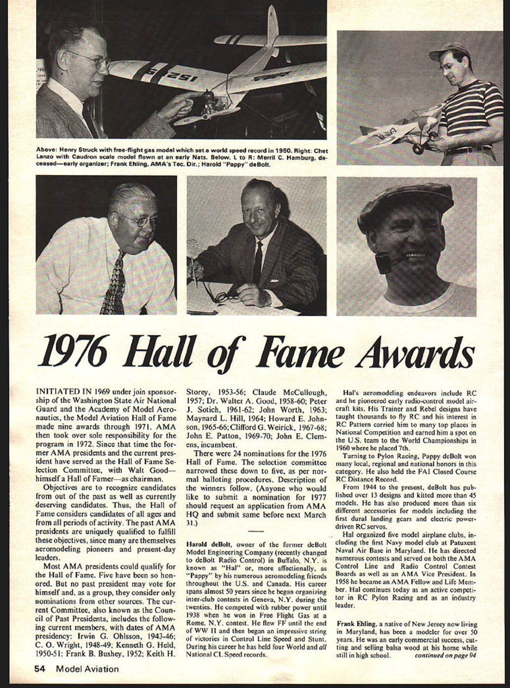 INITIATED IN 1969 under join sponsor ship Washington State Air National Guard Academy Model Aero nautics Model Aviation Hall Fame made nine awards through 1971 AMA took over sole responsibility program 1972 Since time mer AMA presidents current pres ident have served Hall Fame Se lection Committee Walt Good himself Hall Fameras chairman Objectives recognize candidates out past well currently deserving candidates Thus Hall Fame considers candidates ages periods activity past AMA presidents uniquely qualified fulfill objectives since themselves aeromodeling pioneers present-day leaders Most AMA presidents could qualify Hall Fame Five have hon ored no past president may vote himself group consider nominations other sources cur rent Committee also known Coun cil Past Presidents includes follow ing current members dates AMA presidency Irwin G Ohlsson 1943-46 C 0 Wright 1948-49 Kenneth G Held 1950-51 Frank B Bushey 1952 Keith H Storey 1953-56 Claude McCullough 1957 Dr Walter Good 1958-60 Peter J Sotich 1961-62 John Worth 1963 Maynard L Hill 1964 Howard E John son 1965-66 Clifford G Weirick 1967-68 John E Patton 1969-70 John E Clem ens incumbent 24 nominations 1976 Hall Fame selection committee narrowed down five per nor mal balloting procedures Description winners follow Anyone would like submit nomination 1977 should request application AMA HQ submit same before next March 31 Harold deBolt owner former deBolt Model Engineering Company recently changed deBolt Radio Control Buffalo NY known Hal affectionally Pappy numerous aeromodeling friends throughout US Canada career spans almost 50 years since began organizing inter-club contests Geneva NY during twenties competed rubber power until 1938 won Free Flight Gas Rome NY contest flew FF until end WW II began impressive string victories Control Line Speed Stunt During career has held four World National CL Speed records Hals aeromodeling endeavors include RC pioneered early radio-control model air craft kits Trainer Rebel designs have taught thousands fly RC interest RC Pattern carried him top places National Competition earned him spot US team World Championships 1960 placed 7th Turning Pylon Racing Pappy deBolt won local regional national honors category also held FAI Closed Course RC Distance Record 1944 present deBolt has pub lished over 13 designs kitted 45 models has also produced six different accessories models including first dural landing gears electric powerdriven RC servos Hal organized five model airplane clubs cluding first Navy model club Patuxent Naval Air Base Maryland has directed numerous contests served both AMA Control Line Radio Control Contest Boards well AMA Vice President 1958 became AMA Fellow Life Mem ber Hal continues today active competi tor RC Pylon Racing industry leader Frank Ehling native New Jersey now living Maryland has modeler over 50 years early commercial success cut ting selling balsa wood home still high school continued page 94 54 Model Aviation Above Henry Struck free-flight gas model seta world speed record 1950 Right Chet Lanzo Caudron scale model flown early Nats Below L R Mernl C Hamburg de ceasedearly organizer Frank Ehling AMAs Tee Dir Harold Pappy deBolt 1976 Hall Fame Awards CL Navy Carrier/Perry continued page 32 some Profile Carrier models illegal also un safe Nats year large Perfect clip failed during pull-test sub jected 25-lb load well-known Carrier modeler name will mention lost Class II model year Perfect clip up line failed flight Ive seen similar accidents other events photograph accompanying column depicts Pylon brand line connec tors Sullivan clips come two sizes rated 80 lb 110 lb other type clip will use have made myself photo also shows wrapped line terminations thimbles recom mended rule book two-line con struction Wrapped lines stronger crimped terminations easier inspect possible damage also easy make set can made watching favorite TV show thimbles available Perfect sleeves crimped line ends Sullivan serving wire included Larger thimbles included free small package modeling hardware buy local hobby shop Dont take chance losing air plane engine possibly injuring spectator fellow modeler right first time dont have again Soapbox Department numerous proposals before CLCB require reward realistic Profile Carrier models would like very much see realistic models event have talked Carrier modelers agree problems however almost proposals principal concern existing models made obsolete rule change mandatory require ment scale outlines close re semblance would make existing models illegal Scale bonus points can used effectively points awarded few enough non-scale existing models automatically eliminated competition requirement 5% scale tolerance however would eliminate kit airplaneseven G-S Bearcat think good idea Review proposals thinking about would like solve problems Get ready cross proposals would like add realism Profile event Write CLCB represen tative tell him support opposition various proposals way better event through participation rules-making process No has right complain about rules has never taken time let CLCB representative know opinions Richard L Perry 5016 Angelita Ave. Dayton OH 45424 Tutor ide Vries continued page 45 trailing edges Triangular stock added aft fuselage serve widened stabilizer platform fin pro vide reinforced fin/stabilizer gluing joint prototype model bit wood inlet lower edge rudder commercial tailwheel assembly chosen would fit 3/16thick surface long 3/32 music wire tailwheel strut will work other tailwheel bracketsand hold eter tailwheel Extra rudder hinges four recommended assure good rudder action reliable tailwheel steering Nothing much left covering radio installation always-onerous details finishing model Add windshield front dowel glassed areas use 030 clear buytrate plastic windshield windows Epoxy wing hole-down dowels place Bolt engine landing gear place use 2 diame ter main wheels Most radios lostin cavernous fuselage Tutor Theres lots room 