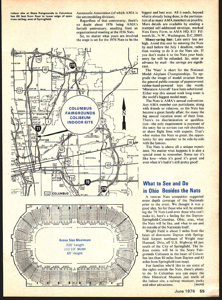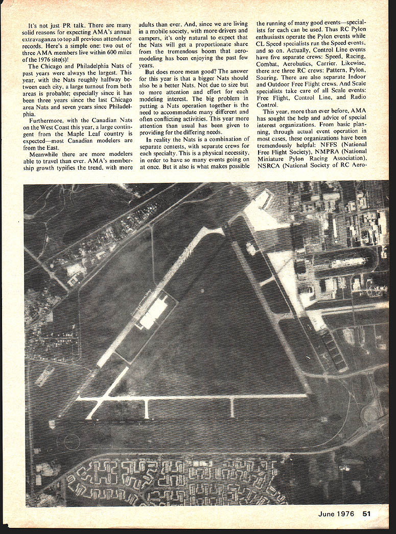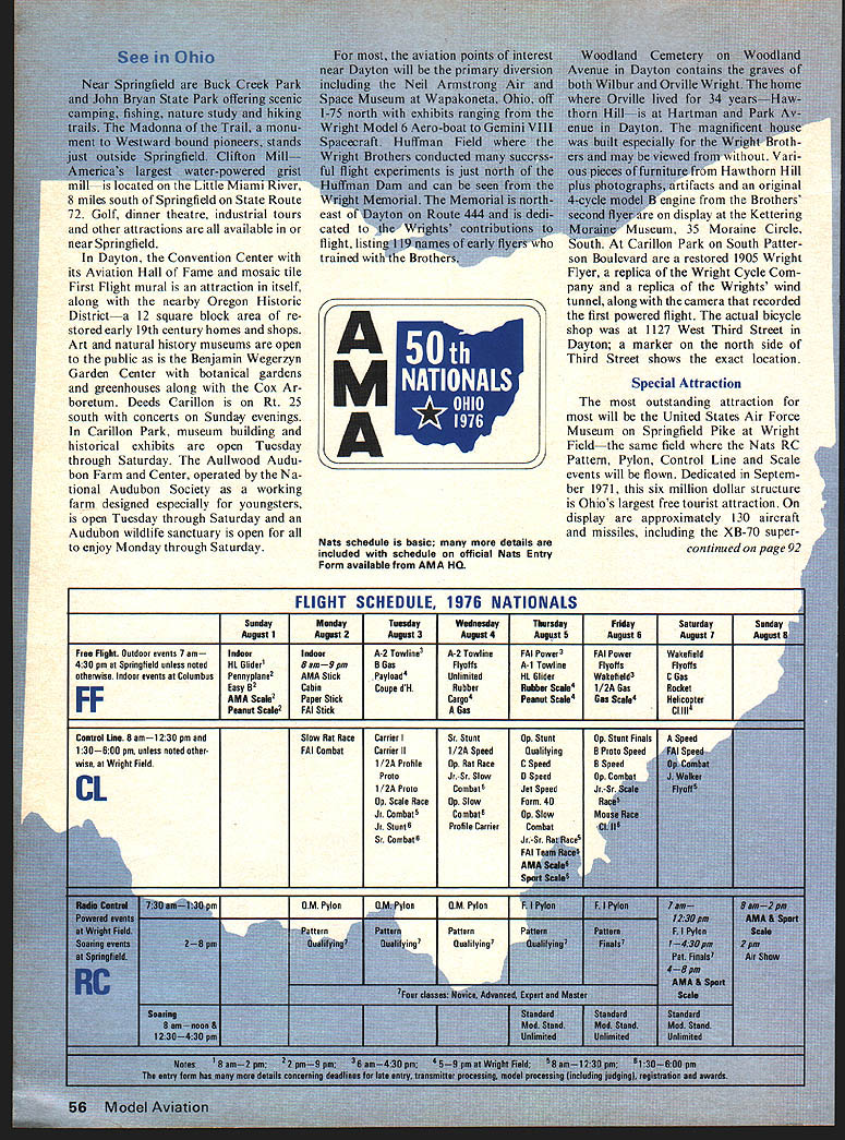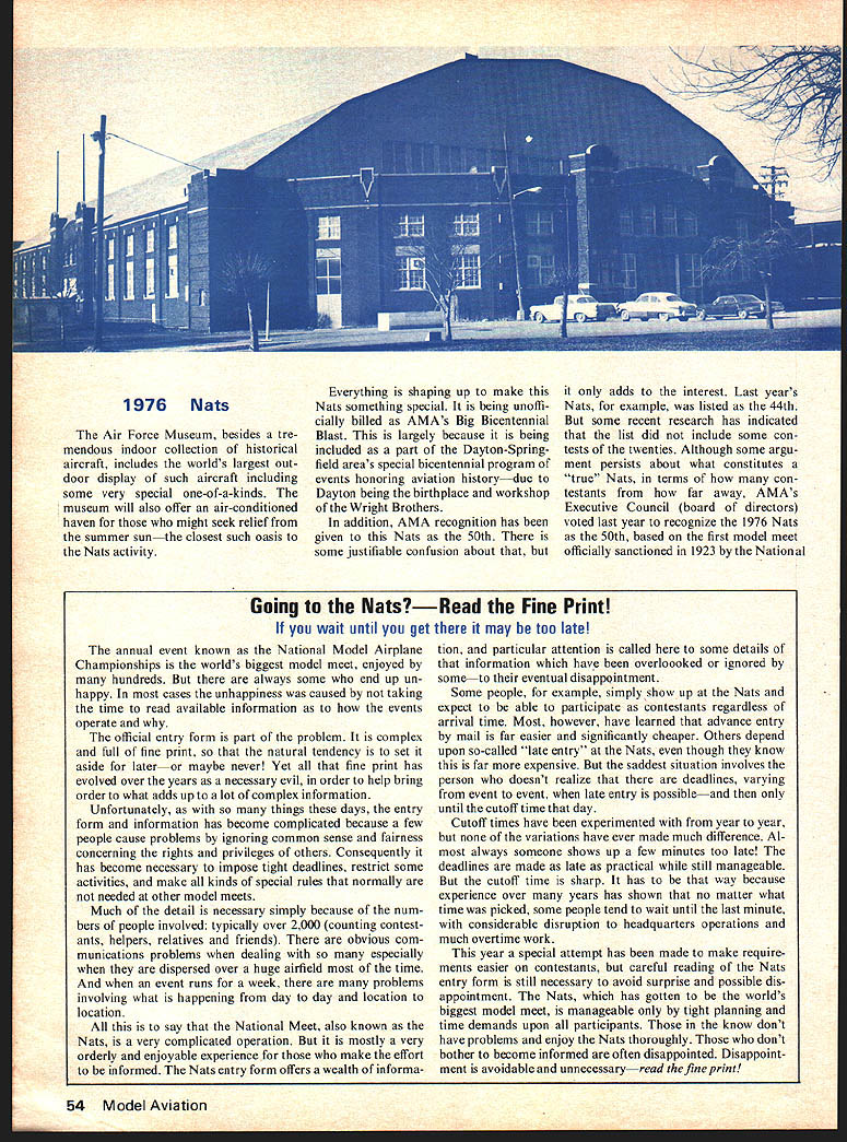 1976 NATIONAL MINIATURE AIRCRAFT CHAMPIONSHIPS BIGGEST EVERVERY LIKELY Events Ever Two Colleges Offer Dormitories Two Airfields Outdoor Events Special Attractionthe Air Force Museum Excellent facilities will accommodate 2000 contestants Three Ohio citiesColumbus Dayton Springfieldcombine host Air Force civilian communities welcome aeromodeling part special bicentennial aviation program 50 Model Aviation Its just PR talk solid reasons expecting AMAs annual extravaganza top previous attendance records Heres simple two out three AMA members live within 600 miles 1976 sites Chicago Philadelphia Nats past years always largest year Nats roughly halfway tween city large turnout both areas probable especially since has three years since last Chicago area Nats seven years since Philadel phia Furthermore Canadian Nats West Coast year large contin gent Maple Leaf country expectedmost Canadian modelers East Meanwhile modelers able travel ever AMAs member ship growth typifies trend adults ever since living mobile society drivers campers its natural expect Nats will get proportionate share tremendous boom aero modeling has enjoying past few years does mean good answer year bigger Nats should also better Nats due size attention effort modeling interest big problem putting Nats operation together need accommodate different often conflicting activities year attention usual has given providing differing needs reality Nats combination separate contests separate crews specialty physical necessity order have events going once also what makes possible running good eventsspecial ists can used Thus RC Pylon enthusiasts operate Pylon events CL Speed specialists run Speed events Actually Control Line events have five separate crews Speed Racing Combat Aerobatics Carrier Likewise three RC crews Pattern Pylon Soaring also separate Indoor Outdoor Free Flight crews Scale specialists take care Scale events Free Flight Control Line Radio Control year ever before AMA has sought help advice special interest organizations basic plan ning through actual event operation cases organizations have tremendously helpful NFFS National Free Flight Society NMPRA National Miniature Pylon Racing Association NSRCA National Society RC Aero June 1976 51 1976 Nats batics NSS National Soaring Society PAMPA Precision Aerobatics Model Pilots Association MACA Miniature Aircraft Combat Association USPJA US Pattern Judges Association takes about 300 people run Nats about 100 key people twice helpers Fortunately year talent run events available locally contrast past two years local club Nats area year dozen clubs available will number experienced Nats workers brought other parts country help guide lead local volunteers first time several years looks like wont shortage personnel staff events will major contributing factor toward better Nats operation despite having accom modate contestants ever outlook therefore year bigger better go together What also makes possible better Nats availability two airfields Free Flight events separated Control Line RC activity greater freedom model launching retrieval possible Free Flight events Springfield will sharing airfield RC Soaring activity events very compatible shar ing will three out five days its crowded situation Meanwhile RC Pattern Pylon events will sharing Wright Air Force Base Control Line Scale events Late Entry Information Advance Entry mail savings big Basic Fee refundable dont show Nats best betbut dont have choice heres what Late Entry about Most Nats contestants already will have entered advance entry post mark deadline July 1 year late entries will also permitted contest site almost entire Nats period primary requisite events late entries accom plished before model processing event concerned accordance Nats entry form schedule RC no later hour before end transmitter processing par ticular event full schedule event flying plus Scale turn-in deadlines RC trans mitter processing times printed Official Nats Entry Form Instruc tions Anyone thinks might en ter should obtain 1976 Nats entry form also includes much other useful information available upon re quest AMA HQ 815 Fifteenth St NW Washington DC 20005 Please include stamped pre-addressed envelope AMA HQ offices both Wright Springfield airports will open registration late entry August 1 through August 7 basically 8 am noon 1 pm 5 pm day Late Basic Entry Fee Junior Seniors $5 same advance fee includes entry three events $35 Open members no events included Event fees late entries events added Nats advance entrants $5 per event age categories except RC $10 per event Mechanics Fee advance late $3 provides identification field ac cess privileges equivalent contestants Available AMA members Nats-only membership included $3 fee members contestants family Nats Housing University dormitories available three groups males couples families individ uals couples rate $7 per per son per night double occupancy Chil dren occupy bed use sleeping bag example will charged No family suites available Dormitory housing arrangements made through AMA either advance mail person Nats Campsites tents trailers available flat rate $10 week per site Pay Nats camp area includes portable toilets no water electricity individual sites Nats Meetings regular AMA general membership meeting pro vided AMA bylaws scheduled held Nats Wednesday August 6 630 pm members invited Nominating Committee open AMA vice-presidents appointed delegates will meet Wed nesday August 6 8 pm begin ning meeting signals closing time AMA officer nominations President Vice-Presidents Dis tricts II IV VI VIII X 1977-78 term See May AMA News section Mode/Aviation mag azine write AMA HQ nomina tion procedures 52 Model Aviation Springfield municipal airport scene FF RC Soaring events southwest town north east Dayton 11000 ft main runway brand new Nats activity year will three days SAM Championships SAM means Society Antique Mod elers year Old-Timer National Championships will held conjunction AMAs SAMs meet 