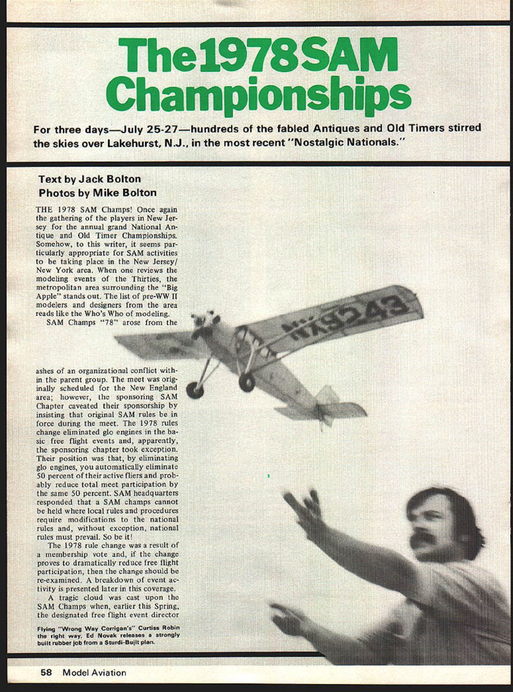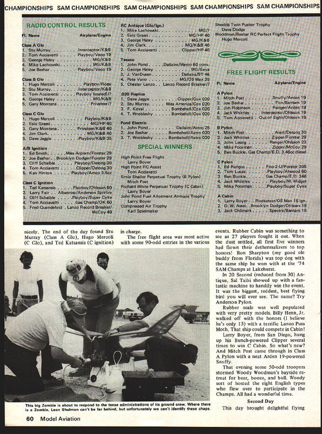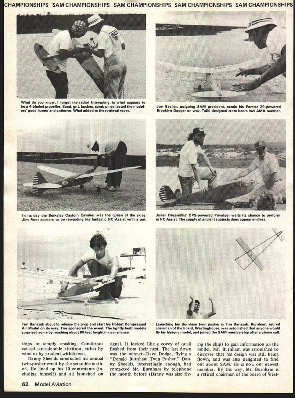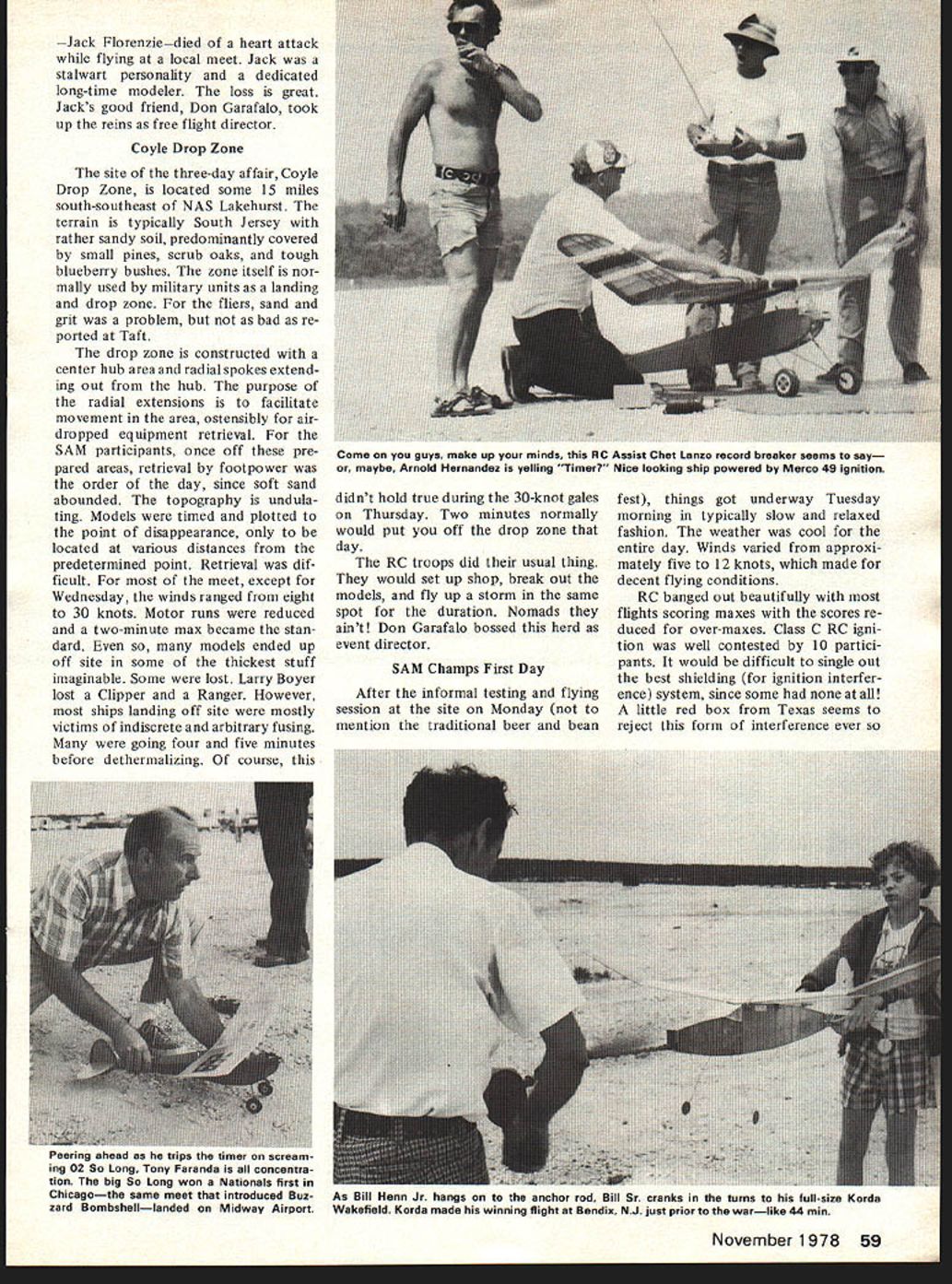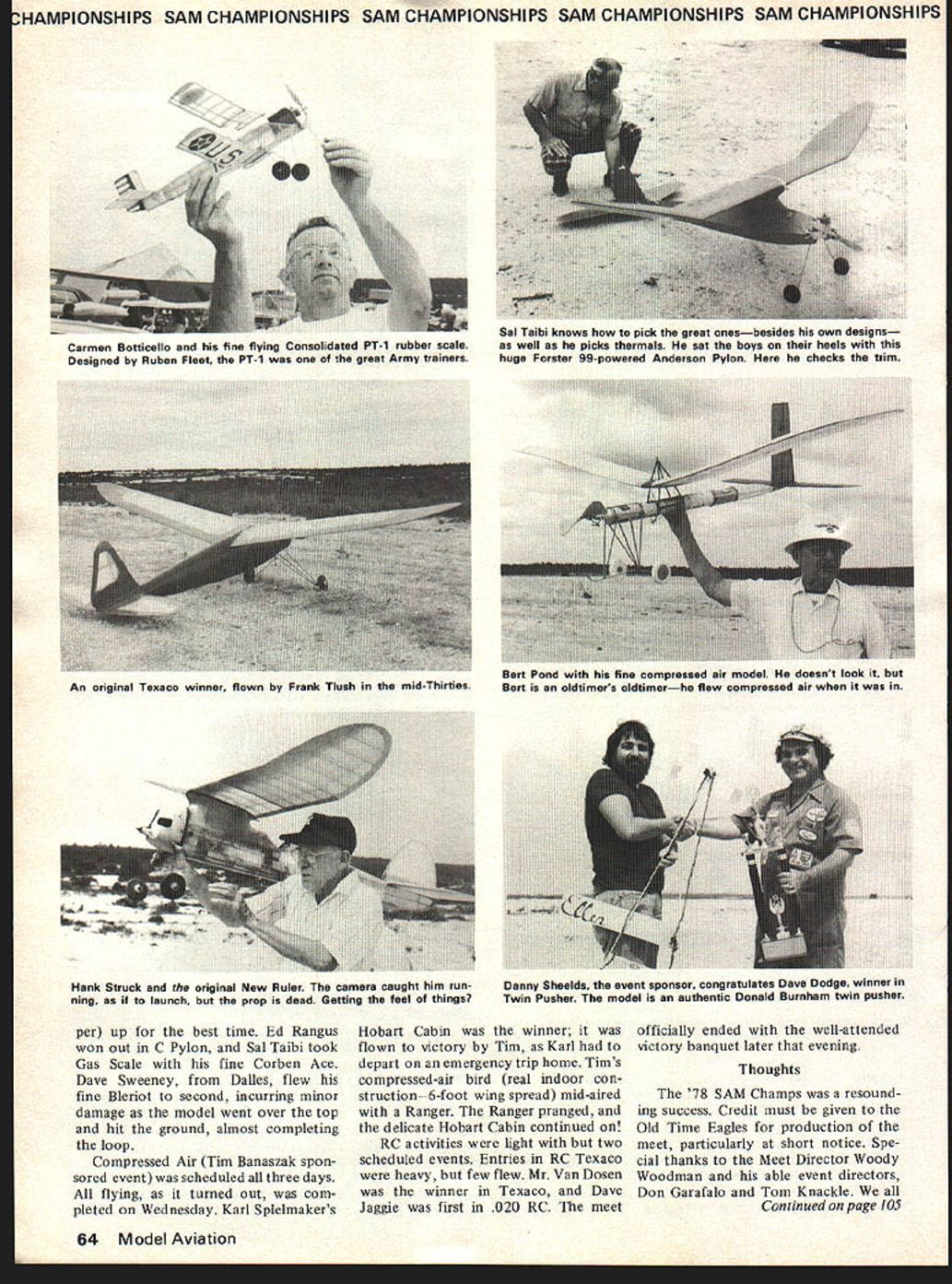 skies over J ashes orgar parent group hduIed fnr 58 Model Aviation U ds e recen Jack Florenziedjed heart attack flying local meet Jack stalwart personality dedicated long-time modeler loss great Jacks good friend Don Garafalo took up reins free flight director Coyle Drop Zone site three-day affair Coyle Drop Zone located some 15 miles south-southeast NAS Lakehurst terrain typically South Jersey rather sandy soil predominantly covered small pines scrub oaks tough blueberry bushes zone itself nor mally used military units landing drop zone fliers sand grit problem bad re ported Taft drop zone constructed center hub area radial spokes extend mg out hub purpose radial extensions facilitate movement area ostensibly air dropped equipment retrieval SAM participants once off pre pared areas retrieval footpower order day since soft sand abounded topography undula ting Models timed plotted point disappearance located various distances predetermined point Retrieval dif ficult meet except Wednesday winds ranged eight 30 knots Motor runs reduced two-minute max became stan dard models ended up off site some thickest stuff imaginable Some lost Larry Boyer lost Clipper Ranger However ships landing off site mostly victims indiscrete arbitrary fusing going four five minutes before dethermalizing course didnt hold true during 30-knot gales Thursday Two minutes normally would put off drop zone day RC troops did usual thing would set up shop break out models fly up storm same spot duration Nomads aint Don Garafalo bossed herd event director SAM Champs First Day After informal testing flying session site Monday mention traditional beer bean fest things got underway Tuesday morning typically slow relaxed fashion weather cool entire day Winds varied approxi mately five 12 knots made decent flying conditions RC banged out beautifully flights scoring maxes scores re duced over-maxes Class C RC igni tion well contested 10 partici pants would difficult single out best shielding ignition interfer ence system since some little red box Texas seems reject form interference ever November1978 59 Come guys make up minds RC Assist Chet Lanzo record breaker seems say maybe Arnold Hernandez yelling Timer Nice looking ship powered Marco 49 ignition Peering ahead trips timer scream ing 02 So Long Tony Faranda concentra tion big So Long won Nationals first Chicagothe same meet introduced Buz zard Bombshelllanded Midway Airport As Bill Henn Jr hangs anchor rod Hill Sr cranks turns full-size Korda Wakefield Korda made winning flight Bendix NJ just prior warlike 44 mm CHAMPIONSHIPS SAM CHAMPIONSHIPS SAM CHAMPIONSHIPS SAM CHAMPIONSHIPS SAM CHAMPIONSHIPSI nicely end day found Stu Murray Class Gb Hugo Mercoli C Gb Ted Katsansis C ignition charge free flight area active some 90-odd entries various events Rubber Cabin something see 27 players fought out dust settled first five winners flown dethermalizers top honors Ron Sharpton good ole buddy Florida top dog same ship won 74 SAM Champs Lakehurst 20 Second reduced 30 An tique Sal Taibi showed up fan tastic machine handily win event biggest reddest best flying bird will ever see name Try Anderson Pylon Rubber scale well populated very pretty models Billy Henn Jr walked off honors believe hes 13 terrific Lanzo Puss Moth ship could compete Cabin Larry Boyer San Diego hung up Bunch-powered Clipper several times win C Cabin So whats new Mitch Post came through Class Pylon neat Arden 19-powered Snuffy evening some 50-odd troopers stormed Woody Woodmans bayside re treat beer booze bull Woody sort hosted eight English types flew over participate Champs wonderful time big Zombie about respond tense administrations its ground crew Zombie Leon Shulman cant far behind unfortunately cant identify chaps 60 Model Aviation Second Day day brought delightful flying IA M CHAMPIONSHIPS SAM CHAMPIONSHIPS SAM CHAMPIONSHIPS SAM CHAMPIONSHIPS SAM CHAMPIONSI conditions Up until 11 am free flighters launching recovering models within couple hundred feet launch area Winds ranged calm up 10 knots entire day Sunbathing order temp erature mild RCers once again out force commenced logging maxes apparent ease Winners mostly determined fliers ability land machine close fiveminute max possible Posted scores reflected fact very few seconds separating 1st through 5th RC partici pants caught dilemma Since 5-minute max adopted 10-minute max abandoned has come routine max continuously outcome determined fliers ability touch down max 20-second engine run has retained rightfully reduction en gine run would simply drive up power requirement really critical dilemma Something must done point no knows what rate five partici pating event Hugo Mercoli time first B glo Ed Smith topped out A/B ignition Mike Lachowski took honors RC An tique Free flight perfect flying condi tions light variable winds top activity 020 48 contestants followed Rubber Stick 20 An interesting side note 020 Larry Boyer searching Ranger lost Tuesday found 020 Playboy obviously out weeds several months model no discernible name did have AMA numbers As Larry making quiries Andy Dashka ambled did double take said Hey thats model found Andy lost earlier local meet entered failed place first five Young Billy Henn Jr broke Cat III Junior record Unlimited Rubber 918 total Lanzo Stick placed second standings John Stott won Cloud Chaser other events Mitch Posts Delong 30-powered Alert won B Pylon Sal Taibi took 020 Playboy Larry Boyer first Cabin Rocketeer powered OS Max 15 conversion English friends Ben Buckle cranked out fifth B ED 346 Diesel fifth Cabin Mills 13cc Coronet evening SAM Champs annual business meeting things aired resolved John Pond announced new SAM President outgoing presidentJoe Beshardid great job through very tough turbu lent period owe him vote thanks Third Day Thursday broke open winds ex cess 30 knots Activities cur tailed certainly demanded care courage Numerous models ended up never-never land brush full searchers RC boys trouble getting bac