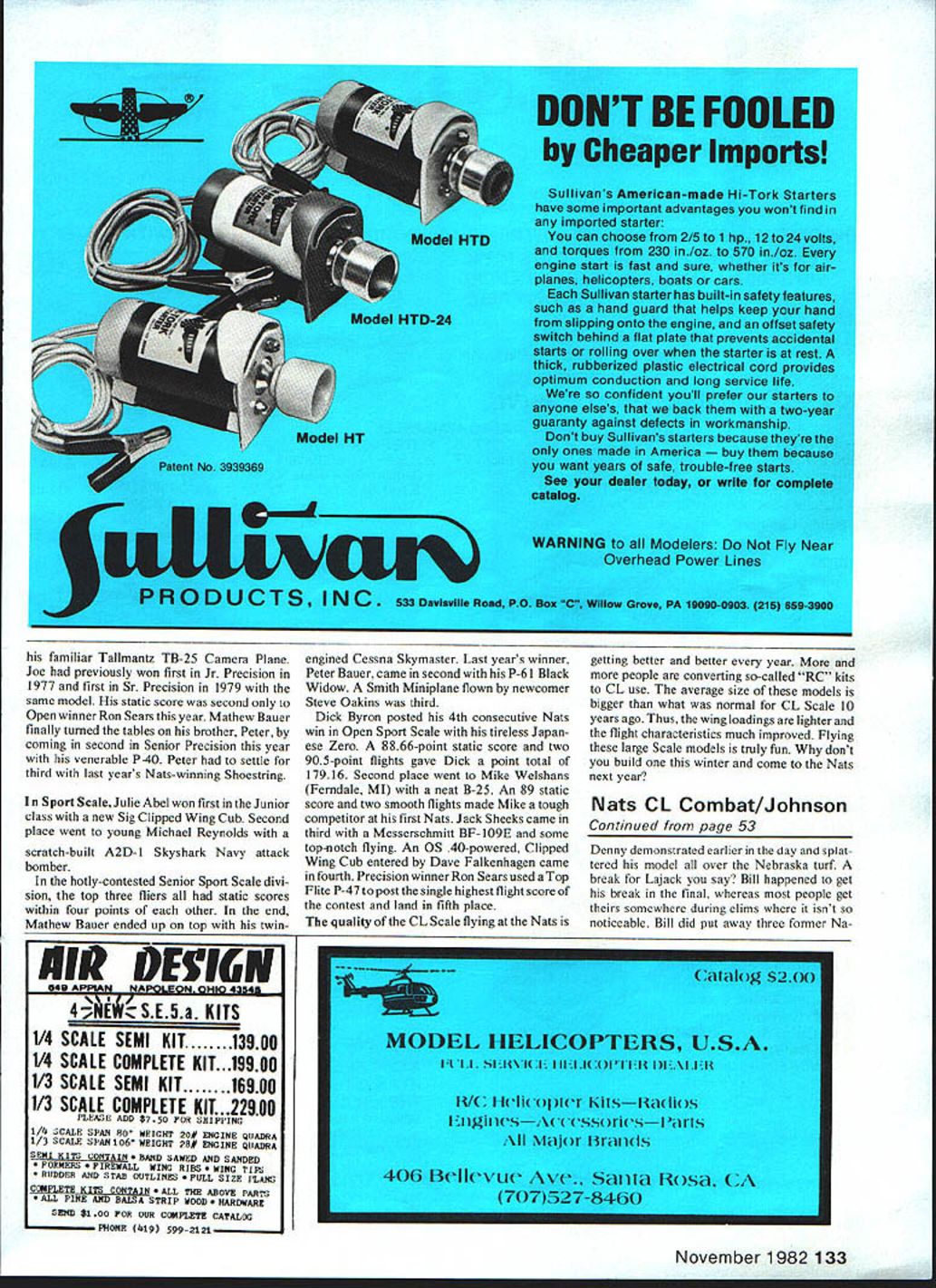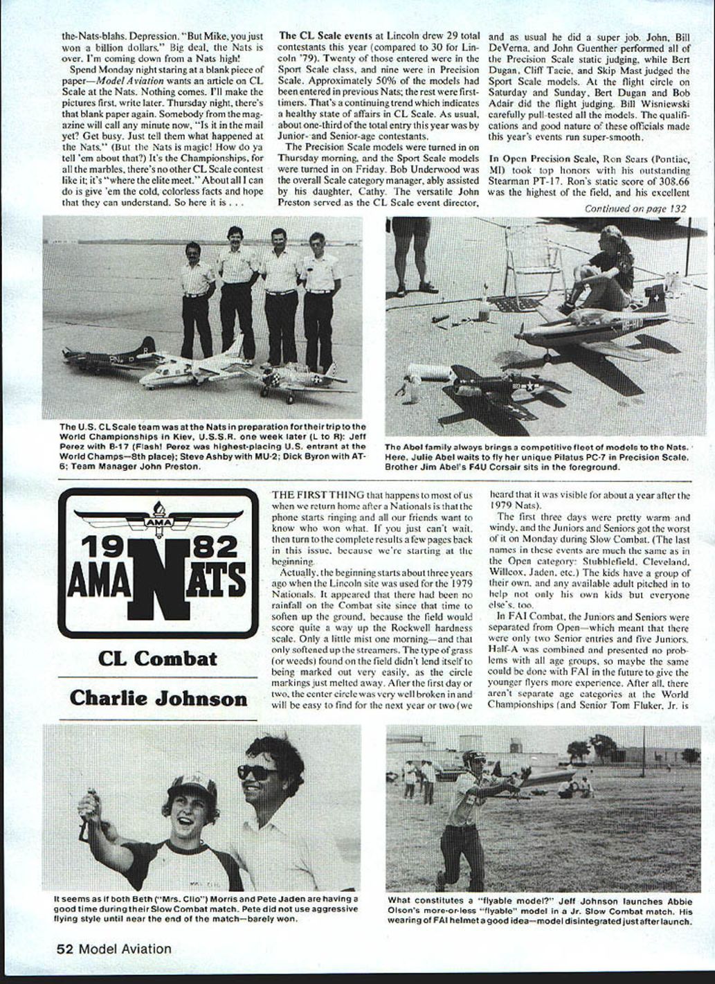 the-Nats-blabs Depression Mike just won billion dollars Big deal Nats over Im coming down Nats high Spend Monday night staring blank piece paperModelAviation wants article CL Scale Nats Nothing comes Ill make pictures first write later Thursday night theres blank paper again Somebody mag azine will call minute now mail yet Get busy Just tell what happened Nats Nats magic ya tell em about Its Championships marbles theres no other CL Scale contest like its elite meet About can give em cold colorless facts hope can understand So CL Scale events Lincoln drew 29 total contestants year compared 30 Lin coln 79 Twenty entered Sport Scale class nine Precision Scale Approximately 50% models entered previous Nats rest firsttimers Thats continuing trend indicates healthy state affairs CL Scale As usual aboutone-third total entry year Junior- Senior-age contestants Precision Scale models turned Thursday morning Sport Scale models turned Friday Bob Underwood overall Scale category manager ably assisted daughter Cathy versatile John Preston served CL Scale event director usual did super job John Bill DeVema John Guenther performed Precision Scale static judging Bert Dugan Cliff Tacie Skip Mast judged Sport Scale models flight circle Saturday Sunday Bert Dugan Bob Adair did flight judging Bill Wisniewski carefully pull-tested models qualifi cations good nature officials made years events run super-smooth Open Precision Scale Ron Sears Pontiac MI took top honors outstanding Stearman PT-17 Rons static score 30866 highest field excellent Con tinued page 132 Charlie Johnson THE FIRST THING happens ofus return home after Nationals phone starts ringing friends want know won what just cant wait turn complete results few pages back issue because starting beginning Actually beginning starts about three years ago Lincoln site used 1979 Nationals appeared no rainfall Combat site since time soften up ground because field would score quite way up Rockwell hardness scale Only little mist morningand softened up streamers type grass weeds found field didnt lend itself being marked Out very easily circle markings just melted away After first day two center circle very well broken will easy find next year two heard visible about year after 1979 Nats first three days pretty warm windy Juniors Seniors got worst Monday during Slow Combat last names events much same Open category Stubblefield Cleveland Wilicox Jaden etc kids have group own available adult pitched help own kids everyone elses too FAI Combat Juniors Seniors separated Openwhich meant two Senior entries five Juniors Half-A combined presented no prob lems age groups maybe same could done FAI future give younger flyers experience After arent separate age categories World Championships Senior Tom Fluker Jr 52 Model Aviation US CLScaleteam wasatthe Nats preparation fortheirtriptothe World Championships Kiev USSR week later L R Jeff Perez 8-17 Flash Perez highest-placing US entrant World Champs8th place Steve Ashby MU-2 Dick Byron AT6 Team Manager John Preston mAMAF7z- - Abel family always brings competitive fleet models Nats Julie Abel waits fly unique Pilatus PC-7 Precision Scale Brother Jim Abels F4U Corsair sits foreground CL Combat seems both Beth Mrs Cijo Morris Pete Jaden having good time during Slow Combat match Pete did use aggressive flying style until near end matchbarely won What constitutes flyable model Jeff Johnson launches Abbie Olsons more-or-less flyable model Jr Slow Combat match wearing FAI helmeta good ideamodel disintegrated just after launch new World Champion Combat flier real improvement performance has Slow Combat soft tank Last year Pete Jaden used temporary compartment held together masking tape Riley Wooten made up some molded plastic compartments worked really well others built out thin plywood balsa soft tank system offers advantages such decreased weight better engine runs possibly quicker fueling during match whole thing could replaced although no bothered drawback can break during crashbut crashes would break bag severe enough demolish plane model used Bobby Mears win Open Slow superior other model downwind section about equal upwind Additional wing tip weight added before final helped during upwind maneuvers Slow model weighed about ounce Fast except lower top-end speed performance equal Fast models As usual Fast Combat drew attention Norm McFadden some real impressive taper-wing models howling Fox 36s Norm spent lot time practice-flying during FAT always put real show violent sometimes unpredictable maneuvers Insiders said Howard Rush finest tracking plane theyd ever seen Howards models real works art too carbon fiber foam very nicely finished Need mentioned Howard can still fly best Fast Combat has become almost all-Fox 36 show occasional die-hard Supertigre fan maybe K&B 58 TWA thrown bit exotica Other popular accessories include either 9-62 Rev-Up 8-62 Top Flite possibly 81 2-6 full mixes Stunt 60% nitro conceivable airframe covering winner used design Chuck Rudner looks little like Super Voodoo ribs Very sim ple strongbut very exotic Speaking winners Bill Lejack won Fast against David Henderson what tumed out anti-climactic finals streamer got hung up Hendersons model tried land get fixed David didnt have quite expertise high-speed landings Marvin Continued page 133 November 198253 George Cleveland Force triesto derail Bill Lajack latters drive 1st Fast Combat failed three former Nats After long osy /2A LomOat IL TO l-q -as willcox l-ere ssnans 3rd Pete Jaden 4th Mark Brink 2ndin back Dick Stubblefield 1st oromoter Rich Von .,ector Eddie ET Thomas 3rd left about blow whistle during FAI Combat ETs assistant Bill Hess IL looks like hes checking shutter speed Charlies camera stop watch contestants friends pitched help processing judging Combat events Bobby Mears holds plane used win Open Slow Combat Others photo Lto RI Riley Wooten James Mears Pete Jaden Fox engine soft fuel tank gives superior performance Slow Junior Slow Combat 