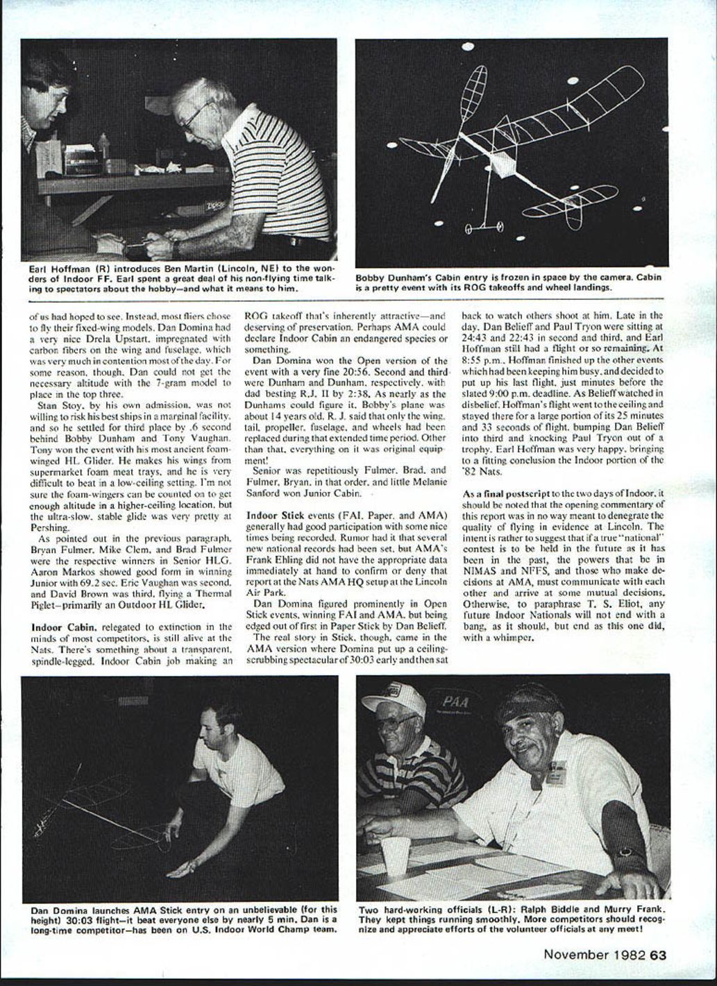 Duration Larry Kruse COMMENTING portion 1982 Nationals analogous story preacher spent better part sermon complain ing few members congregation present about large number absent bulk fliers typically make trek West Baden other Indoor meccas apparently chose attend 82 Nats disguised empty seats Pershing Audi torium As low-ceiling site Pershing pretty good Lights recessed ceiling fairly smooth although 57 ft rather flat apex does permit large amount ceiling scrub bing hanging-up planes Most know ledgeable competitors took full advantage scrubbing potential witness Dan Dominas 3003 consequently flight times whole rather good Very little drift evident although spectators came went freely through four sets double doors exiting circular foyer completely sutrounded arena floor Humidity temperature remained comfortable inside though outside tem peratures excess 1000 gist name fliers stayed away seems lie someplace between proximity Nats West Baden contest acceptability Pershing Auditor ium Nats site sheer economics travel during difficult economic times visiting Stan Stoy about situation commented people came Lincoln initially 79 knowing what site like year different however since people knew thex would flying simply chose come very reason Perhaps young Jason Tryon summed up succinctly anyone could said Nats kind losing importancebut theyre still fun fuo chose compete first day Sunday total five official couple unofficial events slated went off hitch special thanks needs extended Homer Smith Murry Sandy Frank along Ralph Biddle others manned officials table gentlemen did best make everyone comfortable keep events moving along inform spectators what happening what could look various types planes took air Pennyplane first events flown Sunday evidence Grandpa Meuser did good job designed No NonCents Meuser models other flown flown well some inexperienced Juniors Melissa Groebe real charmer won Junior Pennyplane very good 804 Senior John OReilly topped Tom Morrell Mike Clem flying modified Meuser 833 Mike Clems ship few Mike Clem Dallas TX bipe Pennyplane Gordon Wisniewski about launch entry Mike does well flies Open-winning Pennyplane Its biplane biplanes entered although biplane tri plane models time commonplace one-cent event Gordon Wisniesvski won Open Pennyplane bipe followed Earl Hoffman Charlie Sotich Easy B has become anything under new rules some very good flights considering site limitations Earl Hoffman has really come own last two three years won 1427 1 think us hoping another classic Hoffman Chilson duel Easy B Stan Chilton appar ently elected come Lincoln Gordon Wisniewski second Hoffman 1238 David Erbach 1133 third place Junior Senior participation good Easy B Carl Linstrum won Junior handily followed David Brown Melanie Sanford Bryan Brad Fulmer first second Senior Mike Clem third Throughout two days Indoor competition Mike Fulmer brothers simply interchanged positions almost Senior event Indoor Hand-Launched Glider did bring out innovative folding-wing hardware 62 Model Aviation FF Indoor Its tougfl beat Tony Vaughan Open IHLG its flown low-ceilinged site won using foamwinged job Black spot wing finger hole launch Jason Tryon S aujuses nis tiny Tryons Vulture Design influenced flexiblewinged Stoy Coot design nis actuaiiy isnx nopeless mess Hichard Ganslen CL David Erbach CR untangle models after mid-air collision Minimal damage heremodels low power us hoped see Instead tijers chose fly fixed-wing models Dan Domina very nice Drela Upstart impregnated carbon fibers wing fuselagc very much contention day some reason though Dan could get necessary altitude 7-gram model place top three Stan Stoy own admission willing risk best ships marginal facility settled third place 6 second behind Bobby Dunham Tony Vaughan Tony won event ancient foamwinged HL Glider makes wings supermarket foam meat trays very difficult beat low-ceiling setting Im sure foam-wingers can counted get enough altitude higher-ceiling location ultra-slow stable glide very pretty Pershing As pointed out previous paragraph Bryan Fulmer Mike Clem Brad Fulmer respective winners Senior HLG Aaron Markos showed good form winning Junior 692 sec Eric Vaughan second David Brown third flying Thermal Pigletprimarily Outdoor HL Glider Indoor Cabin relegated extinction minds competitors still alive Nats Theres something about transparent spindle-legged Indoor Cabin job making ROG takeoff thats inherently attractiveand deserving preservation Perhaps AMA could declare Indoor Cabin endangered species something Dan Domina won Open version event very fine 205 6 Second third Dunham Dunham respectively dad besting RJ II 238 As nearly Dunhams could figure Bobbys plane about 14 years old R J said wing tail propeller fuselage wheels replaced during extended time period Other everything original equip ment Senior repetitiously Fulmer Brad Fulmer Bryan order little Melanie Sanford won Junior Cabin Indoor Stick events FAI Paper AMA generally good participation some nice times being recorded Rumor several new national records set AMAs Frank Ehling did have appropriate data immediately hand confirm deny report Nats AMA HQ setup Lincoln Air Park Dan Domina figured prominently Open Stick events winning FAI AMA being edged out first Paper Stick Dan Belieff real story Stick though came AMA version Domina put up ceilingscrubbing spectacular 3003 early sat back watch others shoot him Late day Dan Belieff Paul Tryon sitting 2443 2243 second third Earl Hoffman still flight remaining 855 pm. Hoffman finished up other events keeping him busy decided put up last flight just minutes before slated 900 pm deadline As Belieff watched disbelief Hoffmans flight went ceiling stayed large portion its 25 minutes 33 seconds flight bumping Dan Belieff third knocking Paul Tryon out trophy Earl Hoffman very happy bringing fitting conclusion Indoor portion 82 Nats As final postscript two days Indoor should noted opening commentary report no way meant denegrate quality flying e
