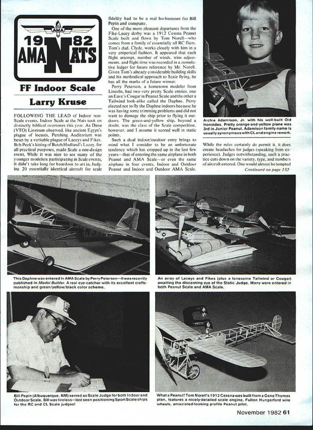 Larry Kruse FOLLOWING THE LEAD Indoor nonScale events Indoor Scale Nats took distinctly biblical overtones year As Dave VTO Linstrum observed like ancient Egypts plague locusts Pershing Auditorium beset veritable plague Laceys Fikes Bob Pecks kitting Butch Hadlands Lacey practical purposes made Scale one-design event nice see younger modelers participating Scale events didnt take long boredom set Judg ing 20 essentially identical aircraft scale fidelity real ho-hummer Bill Pepin company pleasant departures Fike-Lacey derby 1912 Cessna Peanut Scale built flown Tom Norellwho comes family essentially RC fliers Toms dad Clyde works closely him very emperical fashion appeared flight attempt number winds trim adjust ments flight time recorded cumula tive ledger future reference Mr Norell Given Toms already considerable building skills methodical approach Scale flying has marks future winner Perry Peterson hometown modeler Lincoln two very pretty Scale entries Eaves Cougar Peanut Scale other Tailwind look-alike called Daphne Perry elected fly Daphne indoors because having some trimming problems did want damage ship prior flying out doors green-and-yellow ship beyond doubt class Scale competition however assume scored well static points Such dual indoor/outdoor entry brings mind what consider unfortunate tendency has cropped up last few yearsthat entering same airplane both Peanut AMA Scaleor same airplane four events Indoor Outdoor Peanut Indoor Outdoor AMA Scale rules certainly permit it does create headaches judges speaking ex perience Judges notwithstanding such prac tice cuts down variety type numbers aircraft entered would almost tempted Con tin ved page 152 November 1982 61 FF Indoor Scale Archie Adamison Jr well-built Old lronsides Pretty orange-and-yellow plane 3rd Junior Peanut Adamison family name usually synonymouswith CLand engine rework Daphne entered AMA Scale Perry Petersonitwas recently published Model Builder real eye-catcher its excellent crafts manship green/yellow/black color scheme An array Laceys Fikes plus lonesome Tallwind Cougar awaiting discerning eye Static Judge entered both Peanut Scale AMA Scale Bill Pepin Albuquerque NM served Scale Judge both Indoor Outdoor Scale Bill tirelesslast seen positioning Sport Scale ships AC CL Scale ludges What Peanut Tom Norells 1912 Cessna builtfrom GeneThomas plan features nicely-detailed scale engine Fulton Hungerford wire wheels emaciated-looking profile Peanut pilot PLANE CHECK ASSORTMENT Wothird Chonks dedicated tho men machines hersiouily fought thoit wayne nittoey World Wor II Eonty petriotlo Amnriooo pilot will Wont thorn Thn enriousi nine Worherd Citook Aenottwone inslodos Ohs P-Ut tho woddo tanteol prop-drinso tighter oitotstt FAU Coessir its hitlorin enourd ot conety hills tho Poultit thootor Aonngen Wildont AT-S 5-25 process oedor Piano Checko quickly nod occurotoly need 1 A chuck poynront order 2 A coidud nenopie check 3 A doponit slip denny indicof 0 Ofly chacyno addoeco etc. rho depoSit clipl 4 Tire ordor loins beluet cornylotoly filled lodicoto otortion nuterher since checks will stint ed heginniny etith Fin lOt pronto crLtn roan no sin mount 100 SELICOOO IDENTITY CHECK COBox 1490PARK RIDGE IL BODIB tsp bound potucral cite chocks ore plinsed hiun backgioundn Tyc port doycoll olrjst chuck tog intor ann included ouch order w WW II WARBIRD ASSORTMENT o F4U CORSAIRm P51 MUSTANG w GOLDEN AGE OF AVIATION ASSORTMENT lBneuh Stungorwiog nse Soil Wing WACO UPF-7 5 Cngana Aitmeuten Spirit 00 Loom thild SARAS Cuk nt annuni E CESSNA ASSORTMENT E] EEECM ASSORTMENT R ASSORTMEN1 Enut nosortenot ocotaino thu 4 coot poyclur nirtioff roe thot conslanturor m SAILPLANE ASSORTMENTw HELICOPTER IRELO EJAMERICAN SC-b5LIPAIi AM 701LJTWA LOStO nCONTiNENTAL OCf 9LIPIEOMONT ISPnANITES Sc-to nSELTA [-5500LIPSA SUPER ADEWESTERN SC-fS EJEASTERN hOOf P IIIRUPSREiC gC0 D COME AIRLINE 4501 E SC-f HWEST 737 lndioatoe full uolnu chuoko Actinate rn otdot Piano ChocksSTASTING Fin 0 200 checkn 0400 chocks95700 0 Ckockhook coOnt lit neodedi 0 First Closs Mail lOpninnol er Detinoryl Ship Address Cit s ______________________________ State ________ Ziy __________ Rouse ten Nsfnoootoet NO -0-a-a 000R0 snoloec tow lift Third place won William Rogers flying what looked boa nicely finished Ultimate Dragmaster Senior belonged Bryan Brad Fulmer first second Susan Brown third showing fairer sex can also gallop across countryside looking lift Nats FF Outdoor Scale Kruse Continued page 60 some top-finishing Open fliers Lest forget Carl LinsTrum also placed third Junior Rubber Scale Senior Gas Scale Rubber Scale walk Susati Brown eontestant Peanut Scale brought out five Senior fliers Fulmer brothers act continued time Bryan edged Brad first place Ronny Call Jacksonville FL third First second place Open Peanut trophies stayed home year Bob Willey Lincoln flying slightly beefed-up version Indoor Fike won first very nice 21900-pt score Perry Peterson also Lincoln flew Eaves Cougar second place Keith Fulmer Fulmer boys dad third 12100 William Rogers also scored 12100 apparently fewer static points Fulmer finished fourth Open Rubber Scale Lacey man Curt Sanford beat Mike Welshans flew good looking blue-and-white Citabria Mike pri marily Control Line flier says really has begun enjoy Scale Free Flight because relaxed atmosphere Perry Petersons beautiful little Daphne trouble staying trim power added conse quently finished third Perry excellent craftsman can counted show up well future Nats competition Third place Open Gas Scale won Curt Sanford second again won Mike Welshans Mr Consistent Larry Kruses LWF Butterfly first entries large Outdoor Scale Bill Pepin crew did good job running things smoothly keeping everyone happy possible under less-than-ideal field conditions Nats FF Indoor Scale Kruse Continued page 61 propose AMA Scale limited aircraft spanning orer 13 inches Open AMA Scale won Dan Dominas venerable Piper Cub total 16300 points features accurate structure Pipers f
