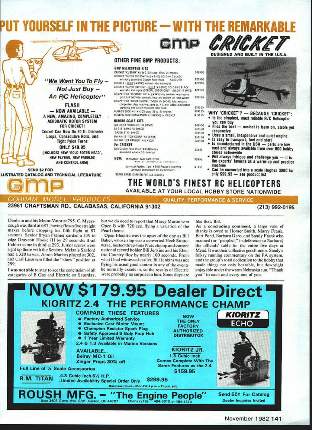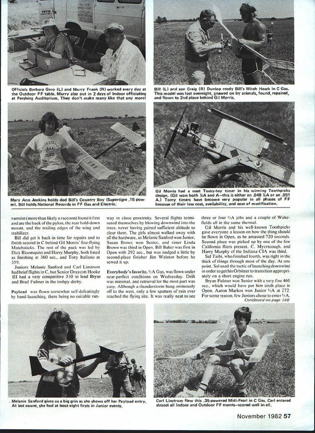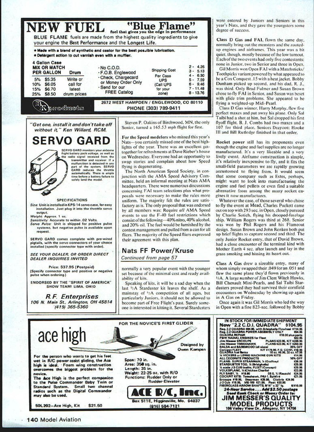 FF Power Larry Kruse THESE EVENTS got underway bit belatedly Tuesday first day Outdoor events Mead auxiliary Nats site FF because switch originally-intended flying field designated back-up Both locations terminated vast cornfields less half-mile downwind Tuesdays launch area though back-up site about mile north flexible Now folks wind things travel long ways count flight ending field 7-ft-tall com fliers could handle original FF site obviously just wasnt gonna work gang very nature Free Flight though optimismFree Flighters must believe conditions will improve else wouldnt wait good airtheyd just launch what ever whenever got ready So selecting new acceptable site body just packed up moved mile north old 1979 location set up shop made best could sometime marginal situation depending weather wind Tuesday didnt help either blew some malice directly south Class C Gas best unpleasant what retrieval problems site change true form things got betterat least next three days Bill Dunlop unique experience losing Class C Witch Hawk trim flight day prior start contest finding next day interim some Smiling Bill Chenault Super Mini-Pearl just sizes Pearl Mini Sweet Daddy has designed 56 Model Aviation Harry Murphys Sha-Zam Rocket model hisses skyward Jetex event still popular despite fact motors fuel scarce ai aim sne master lies ocen top compet- Bob Lombs K&B 4U-powered Bobcat itor since 30s has successful de- design influenced Dick Mathis late-60s signs credit other living model- models High-thrust-liner flew well enough er Sal flew Orbiteer O hA 2d kakin4 Taihi n4 M,nks Gil Morris awaits anticipation good . .sfore chsticks consecutive winner almost Power eventsand fine gentleman Jim Walston lau..ub ur riax III t 3O L Ifl urwaru power rudder plus twu uug stab tip plates located out prop wash Doc Anderson reworked Supertigre 29 33 varmintmore likely raccoon found first ate hack pyion rear hold-down mount trailing edges wing stabilizer Bill did get back time repairs finish second C behind Gil Morris fine-flying Matchsticks rest pack led Dick Bloomquist Harry Murphy both listed finishing 360 sec. Tony Italiano 359 Juniors Melanie Sanford Carl Linstrum brief flights C Senior Draycott Hooke Ill very competitive 310 lead Bryan Brad Fulmer trohpy derby Payload flown somewhat self-defeatingly hand-launching being no suitable runway close proximity Several flights termi nated themselves blowing downwind trees never having gained sufficient altitude clear girls almost walked away hardware Melanie Sanford won Junior Susan Brown won Senior sister Linda Brown third Open Bill Baker first Open 292 sec nudged little second-place finisher Jim Walston before sewed up Everybodys favorite 2A Gas flown under near-perfect conditions Wednesday Drift minimal retrieval part easy Although thunderstorm hung ominously off west few spatters rain ever reached flying site really neat see three four 2A jobs couple Wakefields same thermal Gil Morris well-known Toothpicks gave everyone lesson thing should flown Open amassed 720 seconds Second place picked up few Califomia fliers present C Myerscough Harry Murphy Indiana CIA third Sal Taibi finished fourth right thick things through day point Sal used tactic launching downwind order get Orbiteer transition appropri ately short engine run Bryan Fulmer won Senior very fine 460 sec would have put him sixth place Open Aaron Markos won Junior /A 272 some reason few Juniors chose enter /2 Continued page ~ November 198257 Officials Barbara Gero LI Murry Frank RI worked day Outdoor FF table Murry also put 2 days Indoor officiating Pershing Auditorium dont make like Bill LI son Craig RI Dunlop ready Bills Witch Hawk C Uas model lost overnight gnawed animals foundrepaired flown 2nd place behind Gil Morris Mary Ann Jenkins holds dad UsIrs country oy iupertigre 15 pow erl Bill holds National Records FF Gas Electric ii urris neu narn omy-Loy iini gn Gil won both AA Athis either 049 Y2A 051 AI Tomy timers have become very popular phases FF because low cost availability ease modification Melanie ianToro gives us Dig grin sne snows OTT ner rayloao entry last count least eight firsts Junior events 8 LIIIUMII w owered Midi-Pearl inC Gas Carl entered almost Indoor Outdoor FF eventsscored well No COD FOB Englewood Check Chargecard Money Order Only Send FREE Catalog SERVO GARD SERVO GARD mon o no fight battery pack voltage well us radio signal received transmitter receiver malfunction detected part system SERVO GARD reduces throttle easomasically ample time before battery failure safely land model SPECIFICATIONS Size Unit installed KPS- 14 servo case easy installation Just plug throttle servo output Weight Approx 1 oz Sensitivity Accurate within 02 Volts Servo Pulse Unit shipped positive pulse systems negative pulse available upon request SERVO GARD comes complete pro-wired pigtails servo connectors choice installed specify connector type order SEE YOUR DEALER OR ORDER DIRECT DEALER INOUIRIES IN VI TED Price $3795 Postpaid Specify connector type positive negative pulse ordering ENDORSED BY THE SPIRIT OF AMERICA SHOW TEAM LIMA OHIO R F Enterprises 106 N Main St Arlington OH 45814 419 365-5360 Shipping Cost Per Case UPS Call LIPS zone Steven P Oakins Birchwood MN Senior turned 16553 mph flight first Speed modelers missed years Natsyou certainly missed best high lights year excellent gettogether refreshments Dave Riebers house Wednesday Everyone opportunity swap stories complain about Speed flying degenerating North American Speed Society con junction AMA Speed Advisory Com mittee held informal meeting Nats AMA headquarters numerous discussions concerning FAI team selections plus what pro posals necessary make rules uniform majority felt rules satis- factory proposal endorsed members Require AMA Speed events use F-40 fuel restrictions consist following40% nitro 40% alcohol 20% oil fuel would fumished contest management pulled can fliers majority Speed fliers expressed agreement plan Nats FF Power/Kruse Conti