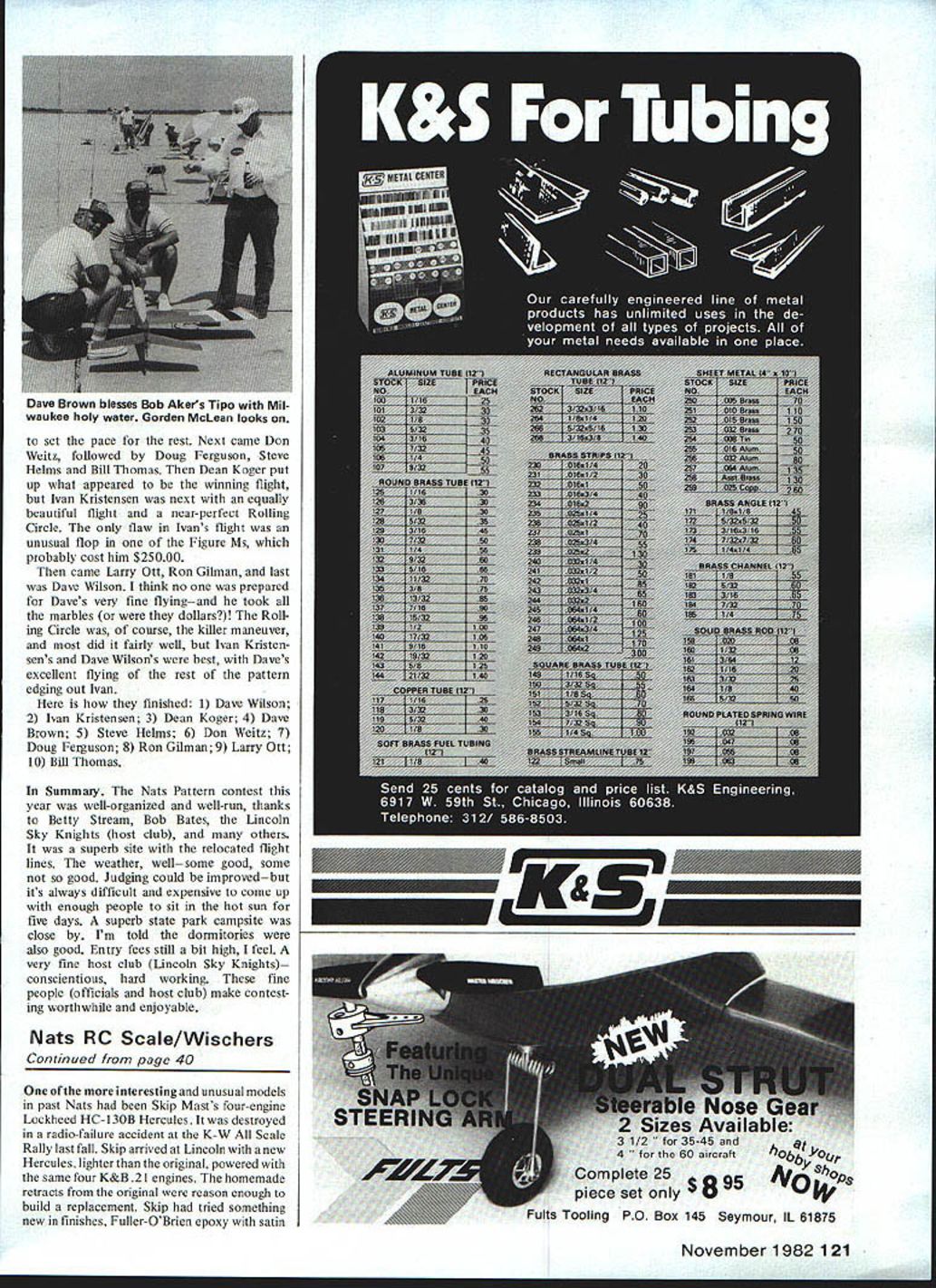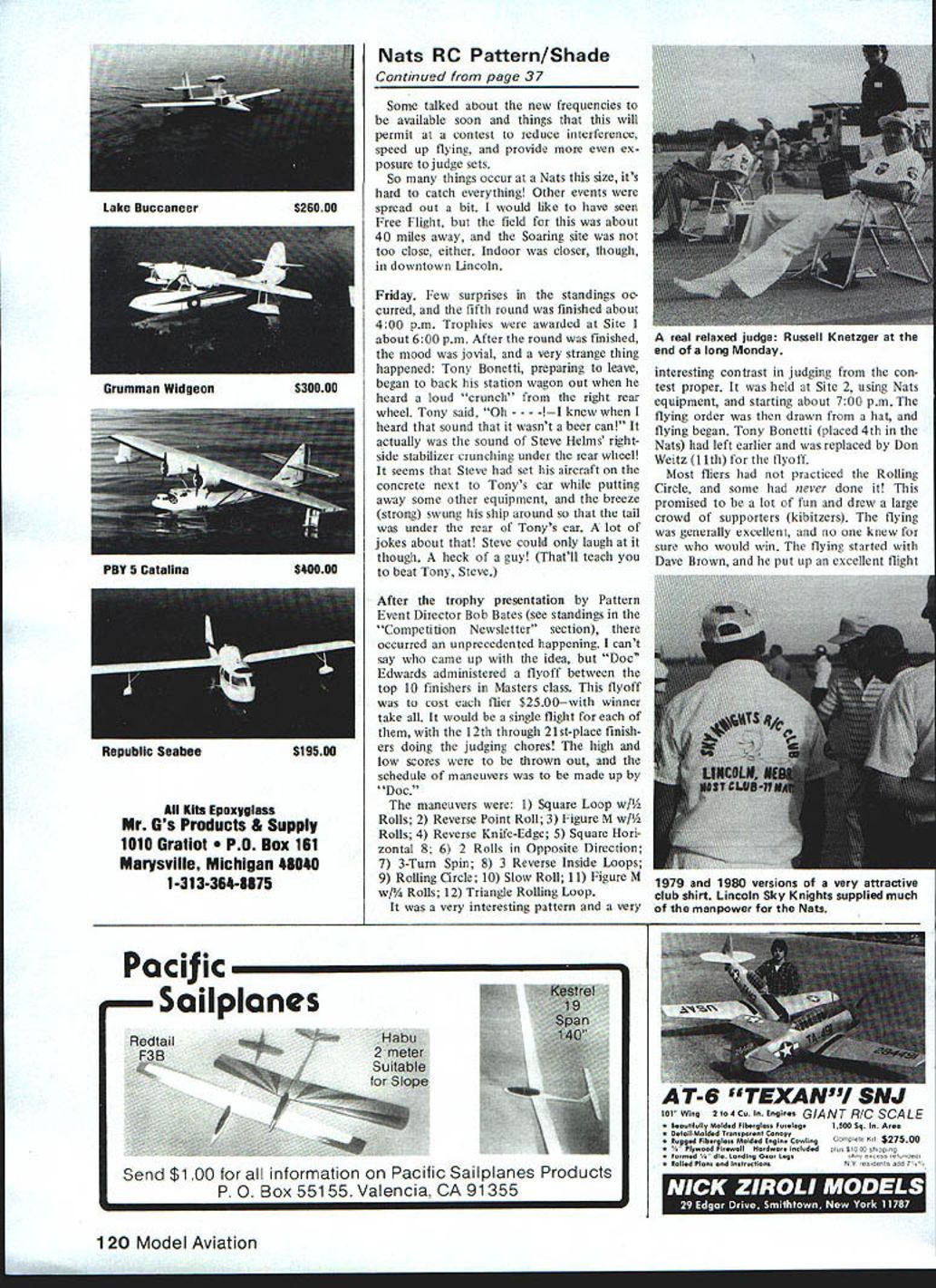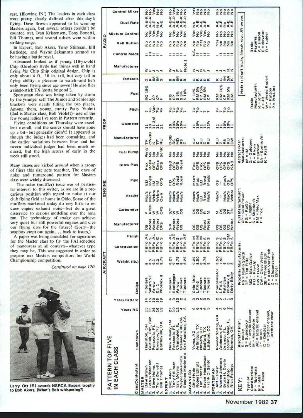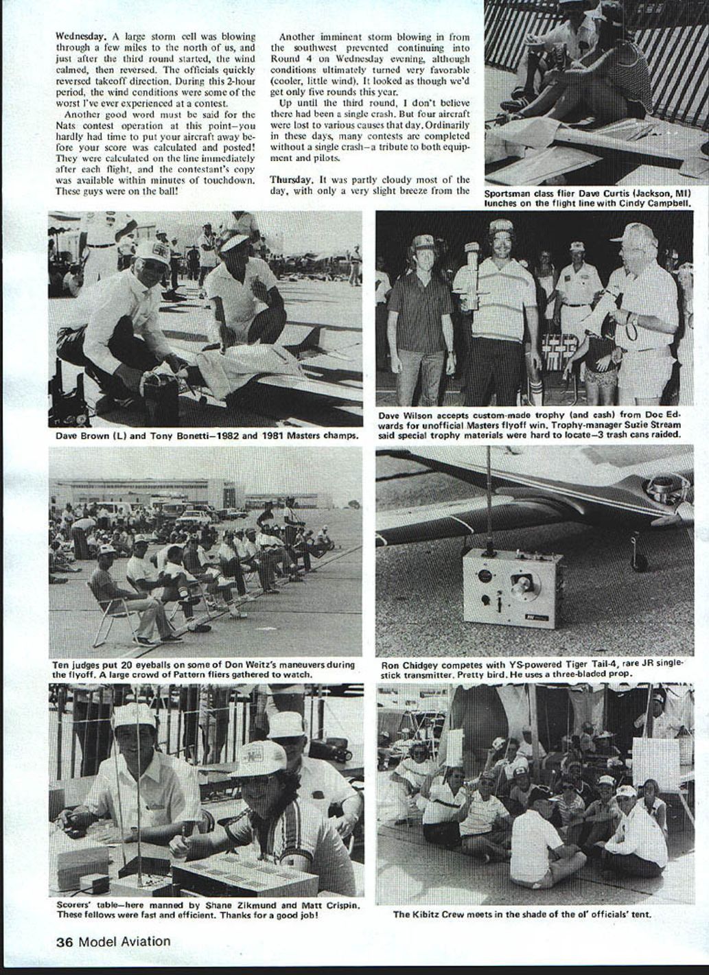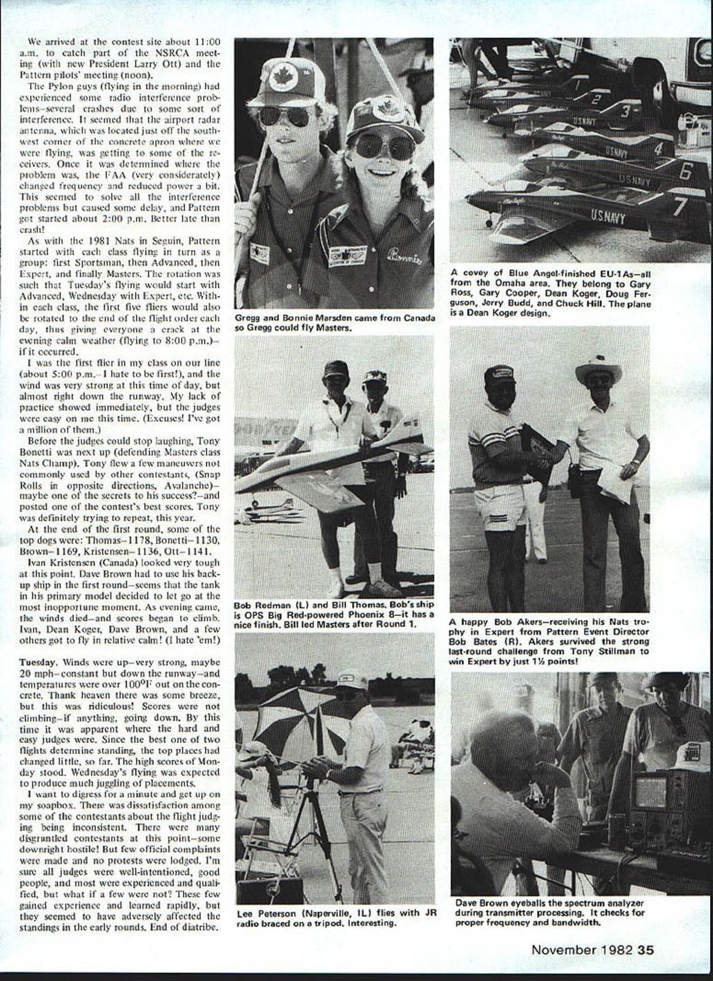 Chuck Shade FOR ME long way across Iowa Nebraskathe scenic rolling countryside re called pleasant memories earlier Nats trip Lincoln 1979 arrived Saturday evening about 800 pm witness beautiful Nebraska sunset part city Lincolns logo weather beautiful low SOs dry sunny up pointnow would hold Contest week very nice state park campsites located just four miles west airport found ourselves Sunday morning Againbeautiful scenery few modelers yet discovered place looked very much though could get some practice flying off access roadssuper Upon arriving Lincoln Air Park Sun day morning began renew old friendshipsI hadnt seen some guys 2-3 years has got better parts modeling soon ran Dave Brown Sally Dave asked assistance TX process ing afternoon What ideal way see nearly everyonesuper people TX process ing went till 500 pm think checked TX US Pylon Soaring Pattern Scale After TX processing inspected Pat tern Pylon sites discover moved far back locations used 1979 some complaints FAA 79 about flying too close over active runways cur rent much-improved arrangement gave lot flying room week wore heard no complaints FAA As 1979 flying after noon starting 100 Pylon morning facing eastern sky site huge concrete apronalmost out sight Monday Still clear beautiful weather day wore became hot very windy Wed heard Sky Knights club field located across town very crowded practice flying managed get flight two off access road back state park Gordon Chip Hyde Chip Ship Hes 11 years old finished 1st Advanced Patternl uses Kraft single-stick transmitter Another Rhett Miller about Davey Slagle CL Stunt back Forties Chip parents smiles after collecting Nats trophy 34 Model Aviation RC Pattern Dave Brown RI accepts first place Masters trophy Bob Bates seems Daves beginning make habit Bob Redman Phoenix 8 armadillomascot Rob Kelly flies Masters monowheel Tiporare Success takeoffs landings scored Mastershe saves weight reduces complexity cost scheme retracts two wire wing skids tail wheel dont Very interesting both ways very smooth arrived contest site about 1100 am catch part NSRCA meet ing new President Larry Ott Pattern pilots meeting noon Pylon guys flying morning experienced some radio interference prob leinsseveral crashes due some sort interference seemed airport radar antenna located just off south west corner concrete apron flying getting some re ceivers Once determined problem FAA very considerately changed frequency reduced power bit seemed solve interference problems caused some delay Pattern got started about 200 pm Better late crash As 1981 Nats Seguin Pattern started class flying turn group first Sportsman Advanced Expert finally Masters rotation such Tuesdays flying would start Advanced Wednesday Expert etc class first five fliers would also rotated end flight order day thus giving everyone crack evening calm weather flying 800 pm occurred first flier class line about 500 pmI bate first wind very strong time day almost right down runway lack practice showed immediately judges easy time Excuses Ive got million Before judges could stop laughing Tony Bonetti next up defending Masters class Nats Champ Tony flew few maneuvers commonly used other contestants Snap Rolls opposite directions Avalanche maybe secrets successand posted contests best scores Tony definitely trying repeat year end first round some top dogs Thomas 1178 Bonetti 1130 Brown 1169 Kristensen 1136 Ott 1141 Ivan Kristensen Canada looked very tough point Dave Brown use back up ship first roundseems tank primary model decided let go inopportune moment As evening came winds diedand scores began climb Ivan Dean Koger Dave Brown few others got fly relative calm hate em Tuesday Winds upvery strong maybe 20 mphconstant down runwayand temperatures over 1 000F out con crete Thank heaven some breeze ridiculous Scores climbingif anything going down time apparent hard easy judges Since best two flights determine standing top places changed little far high scores Mon day stood Wednesdays flying expected produce much juggling placements want digress minute get up soapbox dissatisfaction among some contestants about flight judg ing being inconsistent disgruntled contestants pointsome downright hostile few official complaints made no protests lodged Im sure judges well-intentioned good people experienced quali fied what few few gained experience learned rapidly seemed have adversely affected standings early rounds End diatribe November 1982 35 Gregg Bonnie Marsden came Canada en flrnnn -nld flu Mactore covey Blue Angel-finished EU-lAsall Omaha area belong Gary Ross Gary Cooper Dean Koger Doug Fer guson Jerry Budd Chuck Hill plane Dean Koger design OPS Big Red-powerau rluualuux 8it ua5 nice finish Bill led Masters after Round 1 happy Bob Akersreceiving Nats tro phy Expert Pattern Event Director Bob Bates R Akers survived strong last-round challenge Tony Stillman win Expert just 1A pointsl Lae ortee, cycJCIa I, epuuuui. iaiywr Lee Peterson Naperville IL flies JR during transmitter processing checks radio braced tripod Interesting proper frequency bandwidth Wednesday large storm cell blowing through few miles north us just after third round started wind calmed reversed officials quickly reversed takeoff direction During 2-hour period wind conditions some worst Ive ever experienced contest Another good word must said Nats contest operation pointyou hardly time put aircraft away fore score calculated posted calculated line immediately after flight contestants copy available within minutes touchdown guys ball Another imminent storm blowing southwest prevented continuing Round 4 Wednesday evening although conditions ultimately turned very favorable cooler little wind looked though wed get five rounds year Up until third round dont believe single crash four aircraft lost various causes day Ordinarily days contests completed single crasha tribute both equip ment pilots Thursday partly cloudy day very slight breeze 36 Model Aviation Sportsman class flier Dave Curti