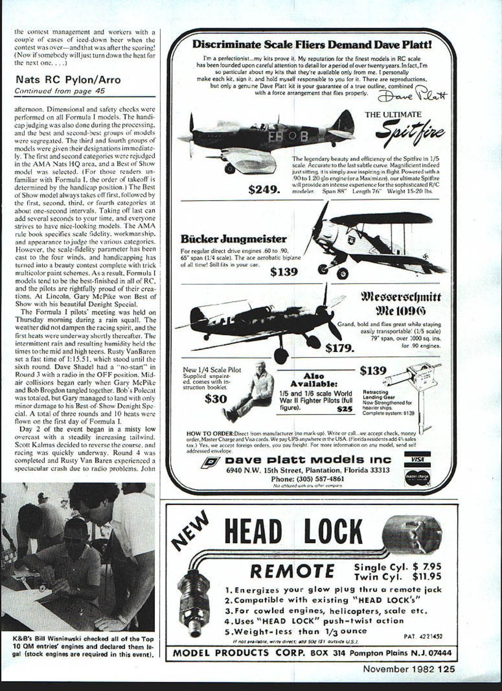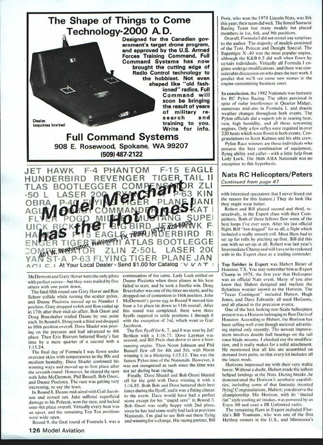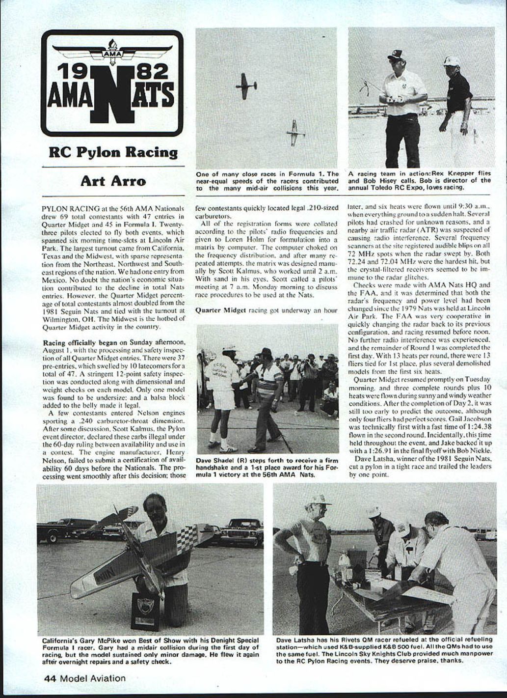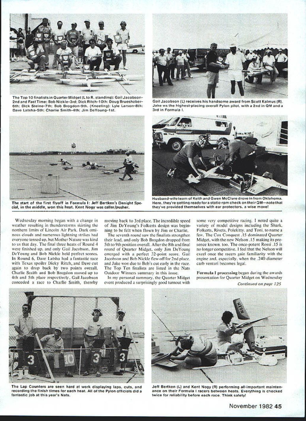 Art Arro PYLON RACING 56th AMA Nationals drew 69 total contestants 47 entries Quarter Midget 45 Formula Twentythree pilots elected fly both events spanned six morning time-slots Lincoln Air Park largest turnout came California Texas Midwest vith sparse representa tion Northeast Northwest South east regions nation entry Mexico No doubt nations economic situa tion contributed decline total Nats entries However Quarter Midget percent age total contestants almost doubled 1981 Seguin Nats tied turnout Wilmington OH Midwest hotbed Quarter Midget activity country Racing officially began Sunday afternoon August 1 processing safety inspec tion Quarter Midget entries 37 pre-entries swelled 10 latecomers total 47 stringent 12-point safety inspec tion conducted along dimensional weight checks model Only model found undersize balsa block added belly made legal few contestants entered Nelson engines sporting 240 carburetor-throat dimension After some discussion Scott Kalmus Pylon event director declared carbs illegal under 60-day ruling between availability use contest engine manufacturer Henry Nelson failed submit certification avail ability 60 days before Nationals pro cessing went smoothly after decision few contestants quickly located legal 210-sized carburetors registration forms collated according pilots radio frequencies given Loren HoIm formulation matrix computer computer choked frequency distribution after re peated attempts matrix designed manu ally Scott Kalmus worked until 2 am sand eves Scott called pilots meeting 7 am Monday morning discuss race procedures used Nats Quarter Midget racing got underway hour later six heats flown until 930 am. everything ground sudden halt Several pilots crashed unknown reasons nearby air traffic radar ATR suspected causing radio interference Several frequency scanners site registered audible blips 72 MHz spots radar swept Both 7224 and 7204 MHz hardest hit crystal-filtered receivers seemed im mune radar glitches Checks made AMA Nats HQ FAA determined both radars frequency power level changed since 1979 Nats held Lincoln Air Park FAA very cooperative quickly changing radar back its previous configuration racing resumed before noon No further radio interference experienced remainder Round completed first day 13 heats per round 13 fliers tied 1st place plus several demolished models first six heats Quarter Midget resumed promptly Tuesday morning three complete rounds p1us 10 heats flown during sunny windy weather conditions After completion Day 2 still too early predict outcome although four fliers perfect scores Gail Jacobson technically first fast time 12438 flown second round Incidentally time held throughout event Jake backed up 12691 final flyoffwith Bob Nickle Dave Latsha winner 1981 Seguinats cut pylon tight race trailed leaders point 44 Model Aviation RC Pylon Racing many close races Formula 1 racing team actionRex Knepper flies IIdr-equal speeds racers contributed Bob Hisey calls Bob director mid-air collisions year annual Toledo RC Expo loves racing Dave Shadel RI steps forth receive firm handshake 1-st place award mula 1 victory 56th AMA Nats Californias Gary McPike won Best Show Denight Special Dave Lataha has Rivets OM racer refueled official refueling Formula racer Gary midair collision during first day stationwhich used K&Bsupplied K&B500fuel AlItheOMs hadto use racing model sustained minor damage flew again same fuel Lincoln Sky Knights Club provided much manpower after overnight repairs end safety check RC Pylon Racing events deserve praise thanks Wednesday morning began change weather resulting thunderstorms skirting northern limits Lincoln Air Park Dark omi nous clouds numerous lightning strikes everyone tensed up Mother Nature kind us day final three heats Round 4 finished up Gail Jacobson Jim DeYoung Bob Nickle held perfect scores Round 6 Dave Laisha fantastic race Texas spoiler Dicky Ritch Dave cut again drop back two points overall Charlie Smith Bob Brogdon moved up 4th 5th place respectively Gail Jacobson conceded race Charlie Smith thereby moving back 3rd place incredible speed Jim DeYoungs Folkerts design begin ning felt flown Jim Charlie seventh round saw finalists strengthen lead Bob Brogdon dropped 5th 9th position overall After 8th final round Quarter Midget Jim DeYoung emerged perfect 32-point score Gail Jacobson Bob Nickle flew off 2nd place Jake won due Bobs cut early race Top Ten finalists listed Nats Outdoor Winners summary issue personal summary Quarter Midget event produced surprisingly good turnout some very competitive racing noted quite variety model designs including Shark Folkerts Rivets Polekitty Toni name few Cox Conquest 15 dominated Quarter Midget new Nelson 15 making its pre sence known too once-potent Rossi 15 no longer competitive feel Nelson will excel once racers gain familiarity engine especially 240 diameter carb venturi becomes legal Formula processing began during awards presentation Quarter Midget Wednesday Continued oaoe 125 November 1 982 45 ne up i u Ilnausts Ii uurter iviiuyet - ton SLdIIUIIIy dhI jdtUusUn 2nd Fast Time Bob Nickle3rd Dick RitchlOth Doug Brueshaber 6th Dick Steine7th Bob Brogdon9th lKneelingl Lyle Larson8th Dave Latsha5th Charlie Smith4th Jim Devoung1 Gail Jacobson IL receives handsome award Scott Kalmus IRI Jake ws highest-placing overall Pylon pilot 2nd OM 3rd Formula cial middle won heat Kent Nogy caller/pusher Husband-wife team Keithre drove UkIaIoma theyre getting ready static-rpm check theirOMnote theyve provided themselves ear protectors wise move Lap Counters seen hard work displaying laps cuts recording finish times heat Pylon officials did fantastic iob years Nats Jeff Bertken LI Kent Nogy RI performing all-important mainten ance Formula racers between heats Everything checked twice reliability before race Think safety contest management workers couplc cases iced-down beer contest overand after scoring Now somebody will just turn down heat next RC Pylon/Arro Continued page 