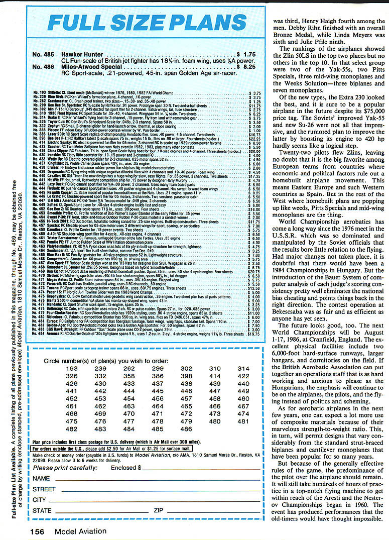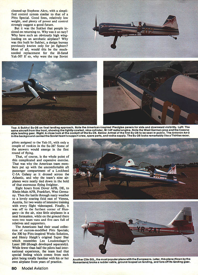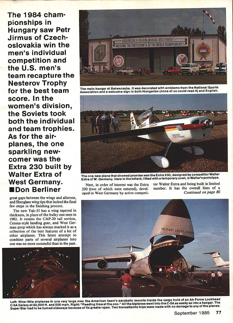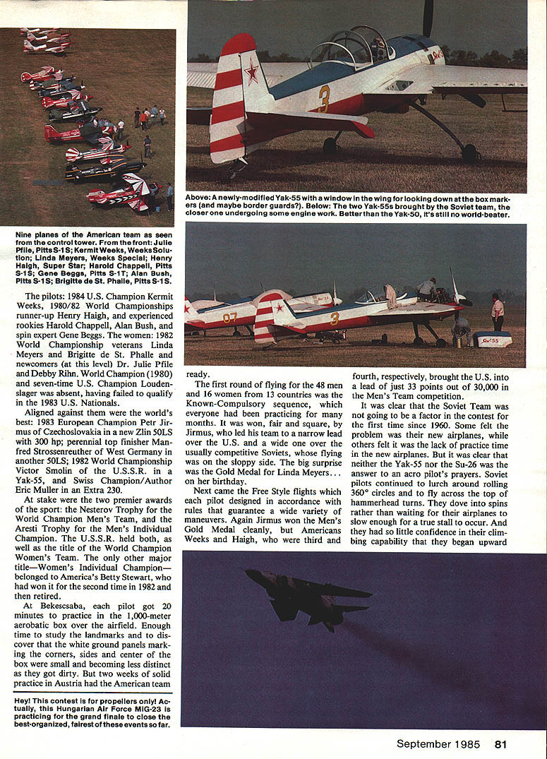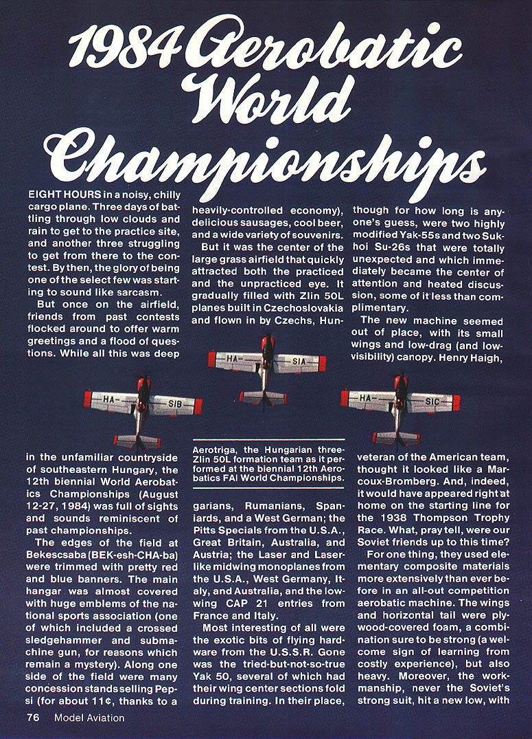 NO OCR TEXT 1984 cham pionships Hungary saw Petr Jirmus Czech oslovakia win mens individual competition US mens team recapture Nesterov Trophy best team score womens division Soviets took both individual team trophies As air planes sparkling new comer Extra 230 built Walter Extra West Germany EDon Berliner great gaps between wings ailerons fiberglass wing tips lacked final few steps finishing process new Yak-55 has wing tapered thickness place bulky seen 1982 retains CAP-20 tail section Cessna-style landing gear West Ger man prop has always marked collection best features lot other airplanes latest attempt combine parts several airplanes no successful past Left Nine little airplanes very large American teams aerobatic mounts inside cargo hold Air Force Lockheed C-5A Galaxy 30000 ft 500 mph Right Feeding time zoo biplanes went C5A easily hangar Super Star turned sideways because its greater span Two transatlantic trips made no damage planes September 1985 77 main hangar Bekescsaba decorated emblems National SpOrT5 Association welcome sign both Hungarian us could read FnaIih new plane showed promise Extra 230 desi j compeiior waiter Exira ui W Germany infield fitted temporary cowl isWaiters prototype Next order interest Extra tor Walter Extra being built limited 230 two entered devel- number has overall lines oped West Germany active competi- Continued page 80 cleaned-up Stephens Akro simpli fied control system similar Pitts Special Good tines relatively low weight plenty power control strongly suggest good future Sukhoi people sisted returning racy have such obviously high wingloading aerobatic airplane built Sukhoi design bureau previously known jet fighters Most would muchneeded replacement ill-fated Yak-50 top Soviet pilots assigned Yak-55 couple rookies Su-26 Some answers would emerge first round flying course whole point complicated expensive exercise American team mem bers put up uncomfortable aft passenger compartment Lockheed C-5A Galaxy droned across Atlantic team s nine air planes neatly tied down hold enormous flying freighter Eight hours Dover AFB DE Rhein-Main AFB Frankfurt West Germa ny battle through nasty weather lovely soaring field east Vienna Austria two weeks intensive training flight videotaped Finally off furthest corner Hun garyin air nine little airplanes neat formation ground two team vans five cars full relatives supporters Americans usual collec tion custom-modified Pitts Specials 300 hp Pitts-inspired Weeks Solution Henry Haighs original Super Star resembles Leo Loudenslagers Laser 200 though developed separately fewer half pilots inter national experience team special feeling comes pilot being totally familiar own airplane years practice 80 Model Aviation TOP bUKflOl ju-26 final landing approach Note American-Inspired Plexiglas panels side downward visibility Left same aircraft front showing tightly-cowled nine-cylinder M-1 4P radial engine Note West German prop Cessnastyle landing gear Right close look cockpit Su-26 Below Arrival first Su-28 seen public Antonov An-2 background carried Soviet teams support crew spare oarts vodka supply Su-26 looks remarkably like Thirties racer Another Zlln 50L popular plane Europeans Later plane flown byrne Romanlans broke rudder cable ground-looped landing tore off its landing gear pilots 1984 US Champion Kermit Weeks 1980/82 World Championships runner-up Henry Haigh experienced rookies Harold Chappell Alan Bush spin expert Gene Beggs women 1982 World Championship veterans Linda Meyers Brigitte de St Phalle newcomers level Dr Julie Pfile Debby Rihn World Champion 1980 seven-time US Champion Louden slager absent having failed qualify 1983 US Nationals Aligned against worlds best 1983 European Champion Petr Jir mus Czechoslovakia new Zlin 50L5 300 hp perennial top finisher Manfred Strossenreuther West Germany another 50L5 1982 World Championship Victor Smolin USSR Yak-55 Swiss Champion/Author Eric Muller Extra 230 stake two premier awards sport Nesterov Trophy World Champion Mens Team Aresti Trophy Mens Individual Champion USSR held both well title World Champion Womens Team other major titleWomens Individual Champion belonged Americas Betty Stewart won second time 1982 retired Bekescsaba pilot got 20 minutes practice 1000-meter acrobatic box over airfield Enough time study landmarks dis cover white ground panels mark ing corners sides center box small becoming less distinct got dirty two weeks solid practice Austria American team ready first round flying 48 men 16 women 13 countries Known-Compulsory sequence everyone practicing months won fair square Jirmus led team narrow lead over US wide over usually competitive Soviets flying sloppy side big surprise Gold Medal Linda Meyers. birthday Next came Free Style flights pilot designed accordance rules guarantee wide variety maneuvers Again Jirmus won Mens Gold Medal cleanly Americans Weeks Haigh third fourth respectively brought US lead just 33 points out 30000 Mens Team competition clear Soviet Team going factor contest first time since 1960 Some felt problem new airplanes others felt lack practice time new airplanes clear neither Yak-55 nor Su-26 answer acro pilots prayers Soviet pilots continued lurch around rolling 3600 circles fly across top hammerhead turns dove spins rather waiting airplanes slow enough true stall occur little confidence clim bing capability began upward September 1985 81 Nine planes American team seen control tower Prom front Julie Pf lie Pitta S-is Kerm Weeks Weeks Solu tion Linda Meyers Weeks Special Henry Haigh Super Star Harold Chappeil PiUs 5-15 Gene Begga Pitts S-i T Alan Bush PiUs S-iS Brigitte de St Phaile Pitts S-IS newly-modified Yak-55 window mu wing TO ioong aown anne bOx mark ers maybe border guards Below two Yak-55s brought Soviet team closer undergoing some engine work Betterthan Yak-50 its still no world-beater Hey contest propellers Ac tually Hungarian Air Force MiG-23 practicing grand finale close best-organized fairest events far rolls 