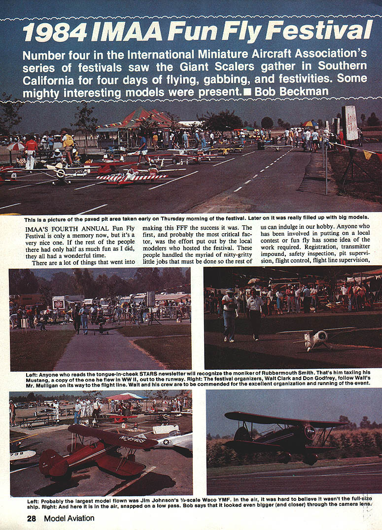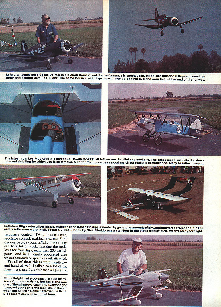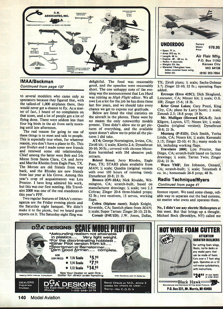 nis picture paved pit area taken early Thursday morning festival Later reaiiy fiiied up big modeis IMAAS FOURTH ANNUAL Fun Fly Festival memory now its very nice rest people half much fun did wonderful time lot things went making FFF success first probably critical fac tor effort put out local modelers hosted festival people handled myriad nitty-gritty little jobs must done rest us can indulge hobby Anyone has involved putting local contest fun fly has some idea work required Registration transmitter impound safety inspection pit supervi sion flight control flight line supervision o reads tongue-In newsierter wii recognize monmur ui flu opy fiew out runway Right festival organizers W its way flight line Walt crew commended exceileni uruanuzuhmun unu uuIiui Probably iargest moac TiOWfl WES Jim Johnsons Ia-scale Waco YMF air hard believe wasnt tne ship Right air snapped low pass Bob says looked bigger cioser through camera lens 28 Model Aviation Left JW Jones put Sacha-Doimar Ziroli Corsair performance spectacular Model has functional flaps much terior exterior detailing Right same Corsair flaps down lines up final over corn field end runway latest Lou Proctor gorgeous Travelaire 2000 left see pilot cockpits entire model exhibits struc ture detailing Lou famous Tartan Twin provides good match realistic performance beauties present frequency control PA announcements spectator control parking etc etc one- two-day local affair things can lot work Imagine prob lems four days 200 partici pants heavily populated area thousands spectators will attracted Yet things handled handled well talked lot fliers didnt hear single gripe Ralph Knight problems kept I/ scale Cobra flying plane prime eye-catchers Everyone got see what ship will look like air fuli-size Cobra flew over field Ripe racers nice model form Let Jack Kilgore describes Mr Mulligan Nosen kit supplemented generous amounts plywood yards MonoKote end results worth Right OV-1OA Bronco Nick Rivaido standout static display area Wasnt ready filght Left Jerry Rhodes Bristol Scout may have oldest model sessival four years has made 385 flIghts over 390 bythe end FFFover 105 hours air Right Immaculate Ercoupe Dick Skoglund effective counterpolnttowarbirds /vintage bipes Left The Proctor Travelaire takes air Right Harris Smoker Gary Pozzis Krier Great Lakes very effective especially against blue sky earlier days Sepulveda area great active Free Flight flying sitenow developed parks George Normington another modelerwith miniature plane once flew HisAT-B patterned afterone Harlingen TX 1945 has complete Interior detailing can see picture right Must instructor controls judging crushed cap anyone dont have room names people made possible Ill thank thank ing dictator Walt Clark organized ran things Walt knows wouldnt have happened know wouldnt have happened Walt next big factor success story location Sepulveda Flood Control Basin large area San Fernando Valley northwest Los Angeles has ringed along low dam reason California has two types sunshine liquid type can sometimes get plentiful has tendency flood basin serves Continued page 137 30 Model Aviation NormIngtons RI-OiUII nIn I1u tiuudt rotate takeoff cant get much closer tothe big shipthan model Everyone plentyof opportunityto get filghtsthisyear column took 23 daysalso Purple lan 1 hairy-dog stories han usual know stick ime Upbeat ly-August issue lirborne Australian model magazine ublished 10-pager yours truly Bill Ialuf put both us cover ront National Center Aeromod ling AMA HQ Merv Buckmaster pub isher/editor reports circulation umped Says everyone reaching Airborne out curiosity thinks due o break series ofglainor faces [he two us total 135 years okes about two kangaroos over As George Perryman quips Old tge treachery will overcome youth kill bikinis Bill Winter 4432 Altura Ct Fairfax VA 22030 IMAAIBeckman Continued page 30 zatch surplus sunshine hold antil can drain off harmlessly iave times basin six right feet under water doesnt hap pen very often however rest time big open area inside largest cities world first visit Sepulveda over 30 years ago long Free Flight site local RCers starting use also lot difference between days Since time city has developed lot area parks being model flying field As understand city provided land some help local fliers paid improvements did lot work now have beautiful flying site large paved runway paved pit area taxiways picnic benches large grassed areas made possible buried sprinkler system delightful place extra-long weekend Giant Scale activities weather treated us pretty well year some heavy rain earlier week unusual time year spared four days festival What did get unusually high humidity wife Evelyn looking forward dry 800 weather remem bered past years going nice break constant 900 90o humidity days have live through summer Washington DC area didnt quite get balmy days looking wasnt bad enough seriously affect fun lot showed up join fun dont know final official count Sunday morning 212 registrants 250 300 aircraft wasnt past years respectable turnout location Some early estimates much larger attendance apparently based emotion logic An event like held West Coast isnt likely have draw East Coast location simply because difference population density Central locations have great est potential course because modelers areas usually can will attend dont feel big number important thing however Its important Giant Scale modeler get reasonable opportunity attend Big Bird Bashes least once few years Lets keep moving FFF around country worry too much about attendance records case high early estimates served scare some people off talked Continued page 140 HUCK WOOD dank Clark CHICK IS MISSING NERES WHERE WE HIT _ HES GOT BE NEARBrI CLOUD HE WAS HERE \ STOLE LOTS OF FUELIBUT ILL CIRCLE WIDER IN CASE -f IF RUN LOWJ fM HOPING HE S DOwN 1HLRE SOMEWHERE MELL SEE ME 50014 AND _ 4ND HEARS UE ME- __ 4 iS lONE p! CANT RAISE T AND OMIGOD THAT HER ON MYSITSJ THERES LITTLE WITCH! EI