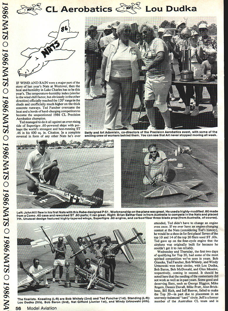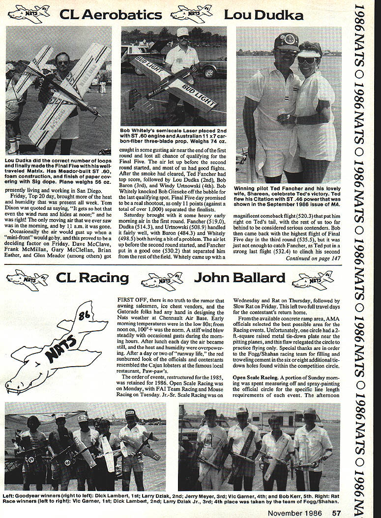 CL AerobaticsLou Dudka 00 CIF WIND AND RAIN major part story last years Nats Westover Qheat humidity Lake Charles has years temperature-humidity index similar to wind chill factor obviously other i,direction officially reached 1200 range shade unofficially much higher thick concrete runways Ted Fancher overcame heat horde hard-charging competitors become unquestioned 1986 CL Precision Aerobatics champion Ted managed against ever-rising lmmtide Supertigre 60-powered ships per haps worlds strongest best-running ST C46 600 sq Citation complete Qreversal form other Nats hes ever Ip 00 Z Cl 0I 00 Cattended Ted didnt have change engine once ever have engine-changing Qcontest Nats considering Teds history would shoo-in first place Seven top 10 14 top 20 fliers used ST 60s Ted gave up four-cycle engine 00airplane originally built because couldnt get run reliably Wednesday Thursday first two days qualifying Top 20 some spirited competition weve seen years Bob Gieseke Ted Fancher Bob Whitely Windy Urtnowski won circles Lou Dudka CJBob Baron Bob McDonald Glen Meador respectively coming second should 0I noted seeding contestants did work well past years Some good deserving fliers such George Higgins Mike Rogers Dennis Duvall Mike Pratt Alan Brick haus Bill Rich Jeff Reeves failed make Top 20-in part due placement unevenly-balanced hard circle Jeff former member Australian CL team 56 Model Aviation Betty Art Adamisin co-directors Precision Aerobatics event some smiiing crew workers behind can see Art never stopped moving ail week Left John Hiii flew hisfirst Natswith Rabe-designed P-Si Workmanship pianewasgreat used highiy-modified 60 made Como 40 case reworked ST 60 parts ran great Right Brian Eatherfiew Austraiia compete Nats piaced 7th Unusual design featured highly-tapered wings Supertigre 60 engine carbonfiber three-blade prop Austraila course finalists Kneeling L-R Bob Whitely 2nd Ted Fancher 1st Standing L-R Lou Dudka 5th Bob Baron 3rd Nat Gifford Junior 1st Windy Urtnowski 4th CL Aerobatics Lou Dudka presently living working San Diego Friday Top 20 day brought heat humidity present week Tom Dixon quoted saying gets hot wind runs hides noon right moving air ever saw morning 11 am gone Occasionally air would gust up mini-front would go proved deciding factor Friday Dave McClave Frank McMillan Gary McClellan Brian Eather Glen Meador among others got caught some gusting air near end first round lost chance qualifying Final Five air let up before second round started us good flights After smoke cleared Ted Fancher top score followed Lou Dudka 2nd Bob Baron 3rd Windy Urtnowski 4th Bob Whitely knocked Bob Gieseke off bubble last qualifying spot Final Five day promised real shootout 11 points against total over 1000 separated finalists Saturday brought some heavy early morning air first round Fancher 5190 Dudka 5143 Urtnowski 5089 handled fairly well Baron 4843 Whitely 4985 both having abitofaproblem airlet up before second round started Fancher put good 5302 separated him rest field Whitely came up magnificent comeback flight 5203 put him right Teds tail rest us too far behind considered serious contenders Bob came back highest flight Final Five day third round 5355 just enough catch Fancher Ted put strong last flight 5324 clinch second Continued page 147 John Ballard FIRST OFF no truth rumor awning salesmen ice chest vendors Gatorade folks hand designing Nats weather Chennault Air Base Early morning temperatures low 80s noon 1000 norm stiff wind blew steadily occasional gusts during morn ing hours After lunch day air became still heat humidity overpower ing After day two runway life red sunburned look officials contestants resembled Cajun lobsters famous local restaurant Paw-paws order events restructured 1985 retained 1986 Open Scale Racing Monday FAI Team Racing Mouse Racing Tuesday Jr-Sr Scale Racing Wednesday Rat Thursday followed Slow Rat Friday left two full travel days contestants return home available concrete ramp area AMA officials selected best possible area Racing events Unfortunately circle 2ft-square raised metal tie-down plate near pitting planes flaw relegated circle practice flying Special thanks order Fogg/Shahan racing team filling troweling cement six eight additional tiedown holes found within competition circle Open Scale Racing portion Sunday morn ing spent measuring off spray-painting official circle specific line length requirements event afternoon November 1986 57 DUD vvnIIuIys sumiucuiS Laser placed 2nd ST 60 engine Australian 11 x7 car bon-fiber three-blade prop Weighs 74 oz Lou Dudka did correct number loops finailymadethe Final Fivewith hisweil traveled Matrix Has Meador-built ST 60 foam construction finish paper cov ering Sig dope Plane weighs 56 oz Winning pilot Ted Fancher lovely wife Shareen celebrate Teds victory Ted flew Citation ST 46 power shown September 1986 issue MA CL Racing 00 z 0 00 0 00 0 00 z cI 0 00 0 00 0 hmm 0 00 Left Goodyear winners right left Dick Lambert 1st Larry Oziak 2nd Jerry Meyer 3rd Vic Garner 4th Bob Kerr 5th Right Rat Race winners left right Vic Garner 1st Dick Lambert 2nd Larry Dziak Jr 3rd 4th place taken team Fogg/Shahan BYRON ORIGINALS C ir Ic t Finally. Practical Twin Ducted Fan Project Thousands satisfied modelers currently flying Byron Originals jets serve proof release kit can sure project can confidently build fly st dream designed built flown its designer few others new F- 15 Eagle no exception F-i 5 designed around proven Byro-Jet Propulsion System its twin Byro-Jet Fans turning nearly 20000 rpm producing 24 24A total pounds thrust Eagle delivers speed rate climb maneuver ability expect Byron Originals jet Unique Exclusive Components new F- 15 far too numerous attempt describe magazine ad Detailed Info Pack includes brochure owners manual set reduced construction drawings kit pricing send $200 Get full story F-i Sand its long list exclusive features Custom Retractable Main Gear lutionary New Nose Gear Design matic Landing Gear