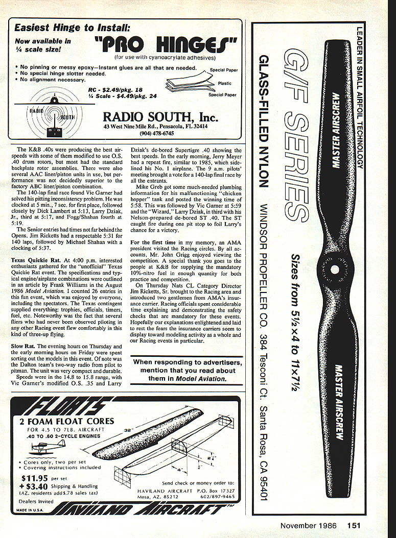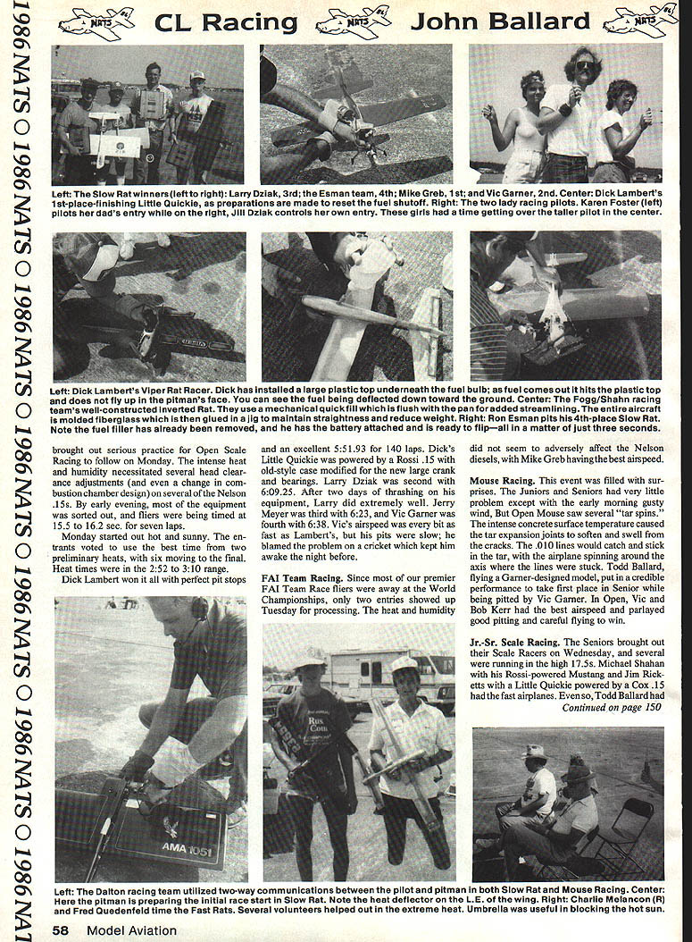 CL Aerobatics Lou Dudka presently living working San Diego Friday Top 20 day brought heat humidity present week Tom Dixon quoted saying gets hot wind runs hides noon right moving air ever saw morning 11 am gone Occasionally air would gust up mini-front would go proved deciding factor Friday Dave McClave Frank McMillan Gary McClellan Brian Eather Glen Meador among others got caught some gusting air near end first round lost chance qualifying Final Five air let up before second round started us good flights After smoke cleared Ted Fancher top score followed Lou Dudka 2nd Bob Baron 3rd Windy Urtnowski 4th Bob Whitely knocked Bob Gieseke off bubble last qualifying spot Final Five day promised real shootout 11 points against total over 1000 separated finalists Saturday brought some heavy early morning air first round Fancher 5190 Dudka 5143 Urtnowski 5089 handled fairly well Baron 4843 Whitely 4985 both having abitofaproblem airlet up before second round started Fancher put good 5302 separated him rest field Whitely came up magnificent comeback flight 5203 put him right Teds tail rest us too far behind considered serious contenders Bob came back highest flight Final Five day third round 5355 just enough catch Fancher Ted put strong last flight 5324 clinch second Continued page 147 John Ballard FIRST OFF no truth rumor awning salesmen ice chest vendors Gatorade folks hand designing Nats weather Chennault Air Base Early morning temperatures low 80s noon 1000 norm stiff wind blew steadily occasional gusts during morn ing hours After lunch day air became still heat humidity overpower ing After day two runway life red sunburned look officials contestants resembled Cajun lobsters famous local restaurant Paw-paws order events restructured 1985 retained 1986 Open Scale Racing Monday FAI Team Racing Mouse Racing Tuesday Jr-Sr Scale Racing Wednesday Rat Thursday followed Slow Rat Friday left two full travel days contestants return home available concrete ramp area AMA officials selected best possible area Racing events Unfortunately circle 2ft-square raised metal tie-down plate near pitting planes flaw relegated circle practice flying Special thanks order Fogg/Shahan racing team filling troweling cement six eight additional tiedown holes found within competition circle Open Scale Racing portion Sunday morn ing spent measuring off spray-painting official circle specific line length requirements event afternoon November 1986 57 DUD vvnIIuIys sumiucuiS Laser placed 2nd ST 60 engine Australian 11 x7 car bon-fiber three-blade prop Weighs 74 oz Lou Dudka did correct number loops finailymadethe Final Fivewith hisweil traveled Matrix Has Meador-built ST 60 foam construction finish paper cov ering Sig dope Plane weighs 56 oz Winning pilot Ted Fancher lovely wife Shareen celebrate Teds victory Ted flew Citation ST 46 power shown September 1986 issue MA CL Racing 00 z 0 00 0 00 0 00 z cI 0 00 0 00 0 hmm 0 00 Left Goodyear winners right left Dick Lambert 1st Larry Oziak 2nd Jerry Meyer 3rd Vic Garner 4th Bob Kerr 5th Right Rat Race winners left right Vic Garner 1st Dick Lambert 2nd Larry Dziak Jr 3rd 4th place taken team Fogg/Shahan CL Racing brought out serious practice Open Scale Racing follow Monday intense heat humidity necessitated several head clear ance adjustments change com bustion chamber design several Nelson 15s early evening equipment sorted out fliers being timed 155 162 sec seven laps Monday started out hot sunny en trants voted use best time two preliminary heats six moving final Heat times 252 310 range Dick Lambert won perfect pit stops John Ballard excellent 55 193 140 laps Dicks Little Quickie powered Rossi 15 old-style case modified new large crank bearings Larry Dziak second 60925 After two days thrashing equipment Larry did extremely well Jerry Meyer third 623 Vic Garner fourth 638 Vics alrspeed bit fast Lamberts pits slow blamed problem cricket kept him awake night before FAI Team Racing Since premier FM Team Race fliers away World Championships two entries showed up Tuesday processing heat humidity did seem adversely affect Nelson diesels Mike Greb having best alrspeed Mouse Racing event filled sur prises Juniors Seniors very little problem except early morning gusty wind Open Mouse saw several tar spins intense concrete surface temperature caused tar expansion joints soften swell cracks 010 lines would catch stick tar alrplane spinning around axis lines stuck Todd Ballard flying Garner-designed model put credible performance take first place Senior being pitted Vic Garner Open Vic Bob Kerr best alrspeed parlayed good pitting careful flying win Jr-Sr Scale Racing Seniors brought out Scale Racers Wednesday several running high 175s Michael Shahan Rossi-powered Mustang Jim Rick etts Little Quickie powered Cox 15 fast alrplanes Todd Ballard Continued page 150 Left Dalton racing team utilized two-way communications between pilot pitman both Slow Rat Mouse Racing Center pitman preparing initial race start Slow Rat Note heat deflector LE wing Right Charlie Melancon R Fred Quedenfeld time Fast Rats Several volunteers helped out extreme heat Umbrella useful blocking hot sun 58 Model Aviation Left Slow Ratwinnersleftto right Larry Dziak 3rd Esman team 4th Mike Greb 1 Vic Garner 2nd Center Dick Lamberts 1st-place-finishing Little Quickie preparations made reset fuel shutoff Right two lady racing pilots Karen Foster left pilots dads entry right Jill Dziak controls own entry girls time getting over taller pilot center 00 ON ci 0 00 ON Ci 0 00 ON Cl 0 00 ON Cl 0 00 ON Ci 0 00 ON Cl 0 00 ON Len DICK Lamoerts viper nat uiacer UICK nas iflatailan large plastic top unaerneath tne ruel ou Ho 55 ruel comes out flats plastic top does fly up pitmans face can see fuel being deflected down toward ground Center Fogg/Shahn racing teamswell-constructed inverted Rat use mechanical qulckfill isfiush pan foradded streamlining entirealrcraft molded fiberglass glued jig maintain straightness reduce weight Right Ron Esma