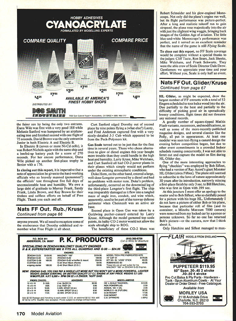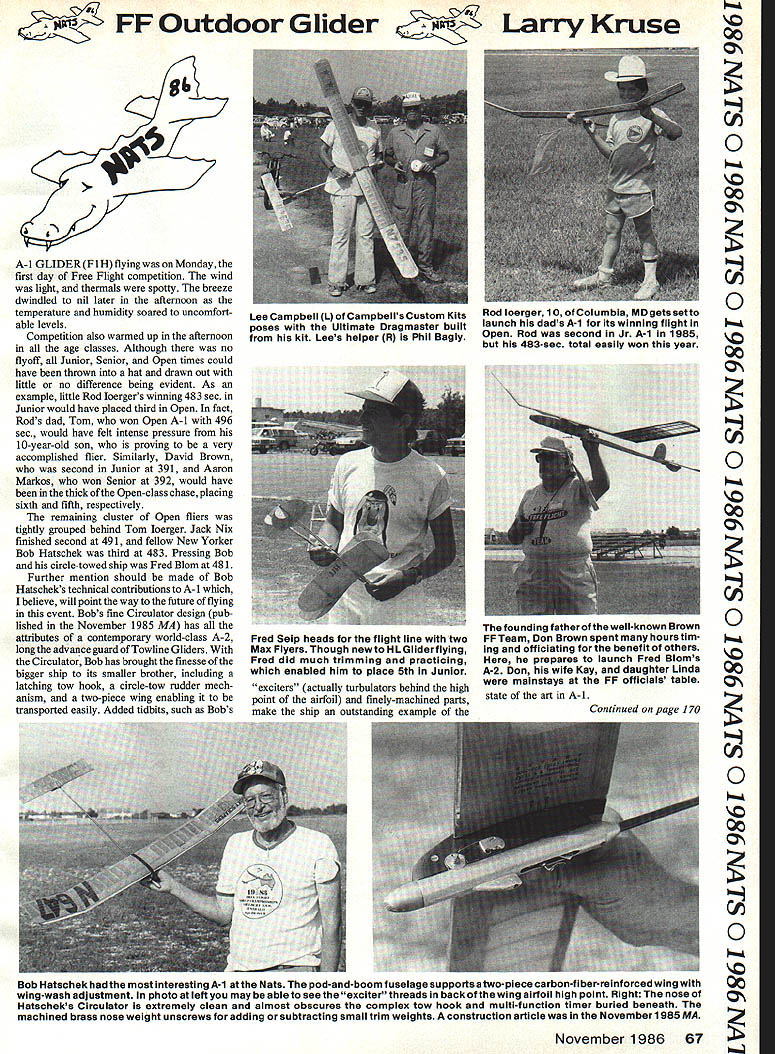 I FF Outdoor Glider y Kruse 9 cI 0 1 6~ A-i GLIDERFLHflyingwas Monday theIumm first day Free Flight competition wind light thermals spotty breeze dwindled nil later afternoon theQ temperature humidity soared uncomfort able levels Competition also warmed up afternoon age classes Although no flyoff Junior Senior Open times could have thrown hat drawn out little no difference being evident As z example little Rod loergers winning 483 sec Junior would have placed third Open fact Rods dad Tom won Open A-i 496Imms sec would have felt intense pressure hisCv 10-year-old son proving very accomplished flier Similarly David BrownQ second Junior 391 Aaron Markos won Senior 392 would have thick Open-class chase placing sixth fifth respectively remaining cluster Open fliers tightly grouped behind Tom loerger Jack Nix finished second 491 fellow New Yorker Bob Hatschek third 483 Pressing Bob circle-towed ship Fred Blom 481 Further mention should made Bobhmm Hatscheks technical contributions A-i ci believe will point way future flying event Bobs fine Circulator design pub 0 lished November 1985 MA has attributes contemporary world-class A-2 longthe advance guard Towline Gliders Circulator Bob has brought finesse bigger ship its smaller brother including latching tow hook circle-tow rudder mech anism two-piece wing enabling transported easily Added tidbits such Bobs ci 0 00 C, Ii 0 I Fred Seip heads flight line two Max Flyers Though new HLGliderflying Fred did much trimming practicing enabled him place 5th Junior Bob Hatschek interesting A-i Nats pod-and-boom fuselage supports two-piece carbon-fiber-reinforced wing wing-wash adjustment photo left may able see exciter threads backof wing airfoil high point Right nose Hatscheks Circulator extremely clean almost obscures complex tow hook multi-function timer buried beneath machined brass nose weight unscrews adding subtracting small trim weights construction article November1985 MA November 1986 67 Lee Campbell L Campbells Custom Kits Hod loerger 10 Columbia MD getssetto poses Ultimate Dragmaster built launch dads A-i its winning flight kit Lees helper R Phil Bagly Open Rod second Jr A-i 1985 483-sec total easily won year founding father well-known Brown FF Team Don Brown spent hours tim ing officiating benefit others prepares launch Fred Bloms A-2 Don wife Kay daughter Linda exciters actually turbulators behind high mainstays FF offIcials table point airfoil finely-machined parts state art A-i make ship outstanding example the Continued page 170 fairer sex being two entrants Dana Wile first very good 188 Melanie Sanford hampered airplaneeating tree finished second flight 75 seconds David Brown entrant Junior both Electric Electric B Electric B seven Ni-Cd cells RobertNichols again same ship beefed-up battery pack score 270 seconds encore performance Dana Wile picked up another first-place trophy Senior 176 closing out report imperative note appreciation given hard-working officials bravely manned personned officials tent throughout five full days unconscionable heat humidity owe large debt gratitude Murray Frank Sandy Frank Linda Brown Kay Brown tireless selfless efforts behalf Free Flight Thank Nats FF Out Rub/Kruse Continued page 66 anyone present need recapture some exuberance Dorothy exhibited re member what Free Flight about Curt Sanford edged Dorothy Out second place nine points flying what else Lacey Fred Anderson captured first very nicely-detalled 1-3 Cub appeared Peck-Polymers kit Gas Scale turned out just first time several years chose alterna tives glow diesel engines year bought trouble could handle high heat humidity Larry Kruse Mike Welshans Curt Sanford CO-2 power plants planes simply would perform under existing atmospheric conditions Duke Horn other hand entered large well-done Longster powered diesel no problems motor runs Dukes problem unfortunately occurred downwind leg third-place I.ongsters first flight ship irreparably damaged flew tangled maze angle iron conduit wire apparently used part runway defense perimeter Chennault active air base Second place Open Gas taken Goldwing pusher-canard entered Larry Kruse Although model gamered top scale points its balky CO-2 motor would allow scale ultralight ship ROG beneficiary CO-2 blues Robert Schneider glow-engined Monocoupe did planes engine run well its flight performance picture-perfect After long realistic takeoff run gain airspeed plane rose majestically air just slightest wing waggle bringing back images Golden Age aviation little blue-and-white Monocoupes performance perfect served excellent reminder name game still Flying Scale close out report no FF Scale coverage would complete special thanks judges Cliff Tacie Ron Sears Jack Sheeks Mike Weishans Frank Schwartz able crew Scale Director Dale Drew Gentlemen appreciate time effort Without Scale half event Nats FFOut Glider/Kruse Continued page 67 HL Glider might expected drew largest number FF entrants total 52 fingers scheduled toss balsa wood air Due partially heat partially difficulty picking good air sporadically breezy conditions flight times did threaten national records goodly number square-tipped Mathis Flash variants successors modifications well some more-recently-published magazine designs several classics like Polly put appearances least modeler seen test-flying canard design evening before competition began due other event commitments crowded Indoor schedule running concurrently able ferret out capture model film during HL Glider day interesting approaches flying chuckles employed Bob Sifleet version Ray Acords giant Monster HL Glider circa Fifties plane still seemed subscribe laws nature approximately 30 years after its introduction narrowly missing first-place finish 3 sec Bill Hutchins first Open 399 sec juncture must offer apology reader Bob Sifleet dutifully posed picture huge HL Unfortunately have picture either Bob plane because particular roll film its container Minolta Maxxum 7000 camera removed locked car person