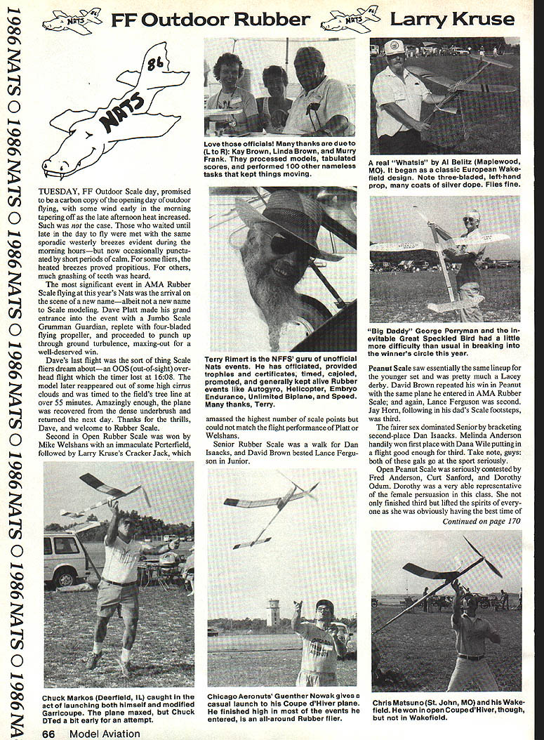 FF Outdoor Rubber ~ Larry Kruse TUESDAY FF Outdoor Scale day promised carbon copy opening day outdoor flying some wind early morning tapering off late afternoon heat increased Such case waited until late day fly met same sporadic westerly breezes evident during morning hoursbut now occasionally punctu ated short periods calm some fliersthe heated breezes proved propitious others much gnashing teeth heard significant event AMA Rubber Scale flying years Nats arrival scene new namealbeit new name Scale modeling Dave Platt made grand entrance event Jumbo Scale Grumman Guardian replete four-bladed flying propeller proceeded punch up through ground turbulence maxing-out well-deserved win Daves last flight sort thing Scale fliers dream aboutan QOS out-of-sight over head flight timer lost 1608 model later reappeared out some high cirrus clouds timed fields tree line over 55 minutes Amazingly enough plane recovered dense underbrush returned next day Thanks thrills Dave welcome Rubber Scale Second Open Rubber Scale won Mike Welshans immaculate Porterfield followed Larry Kruses Cracker Jack / 7v Peanut Scale saw essentially same lineup younger set pretty much Lacey derby David Brown repeated win Peanut same plane entered AMA Rubber Scale again Lance Ferguson second Jay Horn following dads Scale footsteps third fairer sex dominated Senior bracketing second-place Dan Lsaacks Melinda Anderson handily won first place Dana Wile putting flight good enough third Take note gnys both gals go sport seriously Open Peanut Scale seriously contested Fred Anderson Curt Sanford Dorothy Odum Dorothy very able representative female persuasion class finished third lifted spirits obviously having best time Continued page 170 66 Model Aviation Lovethoseoftlcials Manythanksaredueto Lto R Kay Brown Linda Brown Murry Frank processed models tabulated scores performed 100 other nameless tasks kept things moving real Whatsis Al Belitz Maplewood MO began classic European Wake field design Note three-bladed left-hand prop coats silver dope Flies fine 00 ON cI 0 00 ON 0 00 ON 0 00 ON cI 0 00 ON C, 0 00 ON mm C, 0 00 ON Big Daddy George Perryman evitable Great Speckled Bird little difficulty usual breaking winners circle year Terry Rimert NFFS guru unofficial Nats events has officiated provided trophies certificates timed cajoled promoted generally kept alive Rubber events like Autogyro Helicopter Embryo Endurance Unlimited Biplane Speed thanks Terry amassed highest number scale points could match flight performance Platt Welshans Senior Rubber Scale walk Dan Isaacks David Brown bested Lance Fergu son Junior Chuck Markos Deerfield IL caught act launching both himself modified Garricoupe plane maxed Chuck DTed bit early attempt Chicago Aeronuts Guenther Nowak gives casual launch Coupe dHlver plane finished high events entered all-around Rubber flier Chris Matsuno St John MO Wake field Hewon inopenCoupedHiverthough Wakefield fairer sex being two entrants Dana Wile first very good 188 Melanie Sanford hampered airplaneeating tree finished second flight 75 seconds David Brown entrant Junior both Electric Electric B Electric B seven Ni-Cd cells RobertNichols again same ship beefed-up battery pack score 270 seconds encore performance Dana Wile picked up another first-place trophy Senior 176 closing out report imperative note appreciation given hard-working officials bravely manned personned officials tent throughout five full days unconscionable heat humidity owe large debt gratitude Murray Frank Sandy Frank Linda Brown Kay Brown tireless selfless efforts behalf Free Flight Thank Nats FF Out Rub/Kruse Continued page 66 anyone present need recapture some exuberance Dorothy exhibited re member what Free Flight about Curt Sanford edged Dorothy Out second place nine points flying what else Lacey Fred Anderson captured first very nicely-detalled 1-3 Cub appeared Peck-Polymers kit Gas Scale turned out just first time several years chose alterna tives glow diesel engines year bought trouble could handle high heat humidity Larry Kruse Mike Welshans Curt Sanford CO-2 power plants planes simply would perform under existing atmospheric conditions Duke Horn other hand entered large well-done Longster powered diesel no problems motor runs Dukes problem unfortunately occurred downwind leg third-place I.ongsters first flight ship irreparably damaged flew tangled maze angle iron conduit wire apparently used part runway defense perimeter Chennault active air base Second place Open Gas taken Goldwing pusher-canard entered Larry Kruse Although model gamered top scale points its balky CO-2 motor would allow scale ultralight ship ROG beneficiary CO-2 blues Robert Schneider glow-engined Monocoupe did planes engine run well its flight performance picture-perfect After long realistic takeoff run gain airspeed plane rose majestically air just slightest wing waggle bringing back images Golden Age aviation little blue-and-white Monocoupes performance perfect served excellent reminder name game still Flying Scale close out report no FF Scale coverage would complete special thanks judges Cliff Tacie Ron Sears Jack Sheeks Mike Weishans Frank Schwartz able crew Scale Director Dale Drew Gentlemen appreciate time effort Without Scale half event Nats FFOut Glider/Kruse Continued page 67 HL Glider might expected drew largest number FF entrants total 52 fingers scheduled toss balsa wood air Due partially heat partially difficulty picking good air sporadically breezy conditions flight times did threaten national records goodly number square-tipped Mathis Flash variants successors modifications well some more-recently-published magazine designs several classics like Polly put appearances least modeler seen test-flying canard design evening before competition began due other event commitments crowded Indoor schedule running concurrently able ferret out capture model film during HL Glider day interesting approaches flying chuckles employed Bob Sifleet version Ray Acords gian