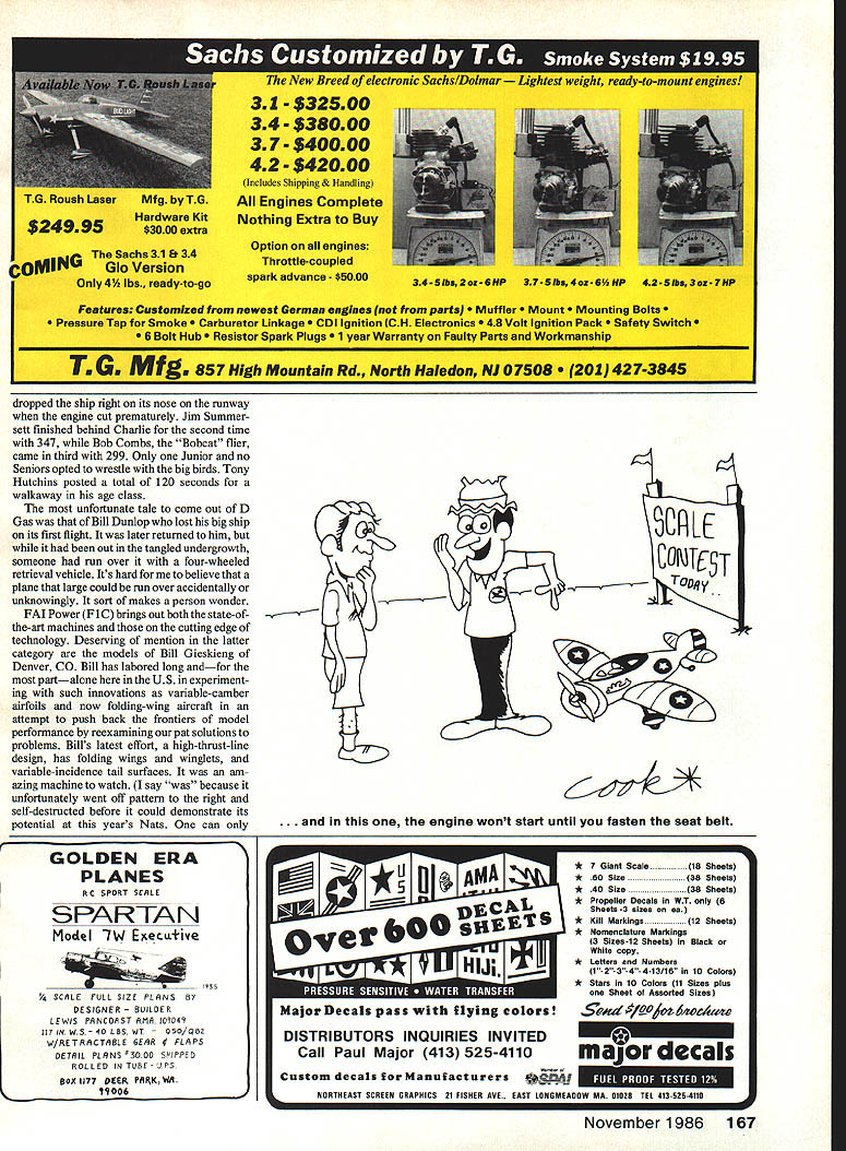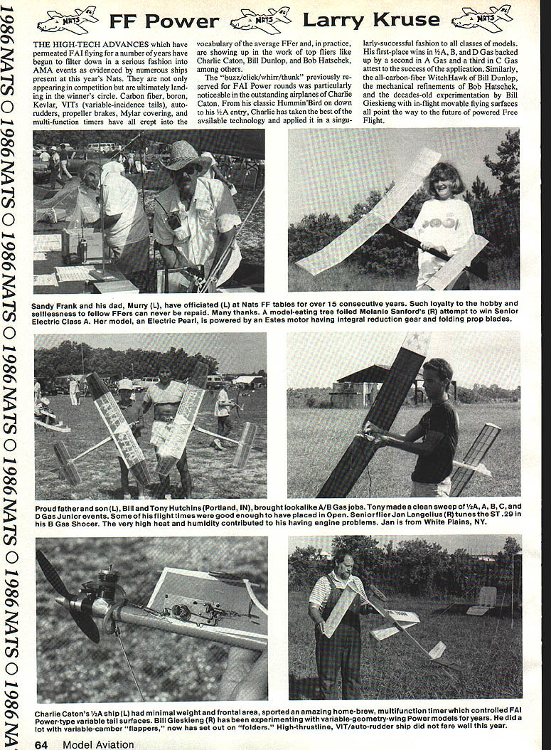 THE HIGH-TECH ADVANCES have permeated FAI flying number years have begun filter down serious fashion AMA events evidenced numerous ships present years Nats appearing competition ultimately land ing winners circle Carbon fiber boron Kevlar VITs variable-incidence tails autorudders propeller brakes Mylar covering multi-function timers have crept vocabulary average FFer practice showing up work top fliers like Charlie Caton Bill Dunlop Bob Hatschek among others buzz/click/whirr/thunk previously re served FAL Power rounds particularly noticeable outstanding airplanes Charlie Caton classic HumminBird down entry Charlie has taken best available technology applied singu larly-successful fashion classes models first-place wins B D Gas backed up second Gas third C Gas attest success application Similarly all-carbon-fiber WitchHawk Bill Dunlop mechanical refinements Bob Hatschek decades-old experimentation Bill Gieskieng in-flight movable flying surfaces point way future powered Free Flight 64 Model Aviation FF Power Larry Kruse 00 cI 0 00 cj 0 00 0 00 z C, 0 00 C, 0 00 0 00 Sandy Frank dad Murry 1 have officiated L Nats FF tables over 15 consecutive years Such loyalty hobby selflessness fellow FFers can never repaid thanks model-eating tree foiled Melanie Sanfords R attempt win Senior Electric Class model Electric Pearl powered Estes motor having integral reduction gear folding prop blades Proud fatherand son 1 Bill andTony Hutchins Portland IN brought lookalikeAlB Gas jobs Tony made clean sweep 1/2A B C D Gas Juniorevents Some flight times good enough have placed Open SeniorflierJan Langelius R tunes ST 29 B Gas Shocer very high heat humidity contributed having engine problems Jan White Plains NY Charlie Catons /2A ship L minimal weight frontal area sported amazing home-brew multifunction timerwhich controlled FAI Power-type variable tail surfaces Bill Gieskieng R has experimenting variable-geometry-wing Power models years did lot variable-camber flappers now has set out folders High-thrustline VIT/auto-rudder ship did fare well year FF Power Larry Kruse U 1 Competition began Monday Nats week Payload C Gas Payload has undergone interesting renaissance over past few years coming back brink oblivion Provisional event some contests now-full-fledged member AMA Nats repertoire Perhaps reactionary event mentioned preceding paragraphs essentially simple task lifting set amount weight long aircraft can fly using prescribed engine run what makes event attractive fun fellows fun year Payload Bill Hale lifted way first place total score 312 fellow close heels Robert Nichols score 307and Jim Waiston 306 Only two Juniors no Seniors entered Payload David Brown posted 209 first-place finish over Tony Hutchins As Payload two youngsters entered C Gas Tony Hutchins lone Junior Melinda Anderson provided Senior score Open however active 30 entries Marvin Mace Seguin TX screaming Pearl variant handily won event flight total 1320 seconds score overwhelmed second third place fin ishes Bill Dunlop 960 seconds Charles Caton 942 seconds round out Power flying Monday second day competition saw increased heat wind making high-nitro engine runs tenuous retrieval extremely dillicult ever lower scores indicate change flying-site Category-designation deference wind direction anything else Charles Caton posted first 1986 Nats victory Open using minimal-drag/minimalfuselage-cross-section aircraft having typically FAI auto-surface setup Charlie flew emaci ated bird 549-second total Jim Sununersett second distant 454 seconds Bob Sifleet coming third 429 seconds smaller Gas events usually bring out Juniors Seniors uncharacteristically two Juniors pair Seniors partici pated year scores though quite Continued page 166 November 1986 65 Lin Cochrans Tucker GA Cargo entrys design has apparently influenced fellow Georgian George Perryman itdid make 40-second official flights yet caused some excitement Its Star Wars look Can get straight balsa Bob Nichols South Meridian CT new Pay load model finished close second Bill Hale its very first contest outing Marvin Maces ~eguin TA Pilfered Pearl lovely spiral turn climb rolled out glide little loss altitude Bill Dunlops Greensburg PA C Gas Witch Hawk has high-tech carbon-fiber structure especially evident wing stab Note thin LE TE members X-braces Photo above details its front-end plumbing muitifunction-timer leads running VIT auto-rudder 00 ON 0 00 ON ci 0 00 ON ci 0 00 ON Cr 0 00 ON ci 0 00 ON ci 0 00 ON Jim Clem Sand Springs OK confused indoorfiler Jim Clem Dallas TX has fine PF designs credit including Witch Doctor Okie Bird Country Boy Witch Hawk plane 1/2A Witch Hawk Charlie Caton Alabamas contribution FF preps elegant HummlnBird plans available MA has become USs leading proponent using high-tech methods materials FF aircraft Curt Sanford Dallas TX launches Pay load entry Event rules require ROG takeoff restricted engine run has recently creased popularity 0 MODEL PRODUCTS Sew Jersey07444 CORPORATION 0 Sex 314 POmplon Plains HEAD Copyright P R 0 F E ___ S S 0 N LOCK Agho ese ed DONT GET KLIPPED GET CONNECTED 1Same easy ziwo 4nge4 NO TORCC ope4aLLon SLeet tong c0440.3i0n 4ee 14e 3 48 incA Lead W-L4e4Ti&3 itanda4d glow plug6 eluding BRIDI 9L0-DCAIL & 05 4 SLtoke Plu4 FOX TIRE BALL gLO-DVIL 9LO-B& 2oZ OPS & ROSSI 2 SL $695 et eemIeble wnte direct odd SOC GLOW PLUG CONNECTOR contestants 13 entries Frank Garzon setting pace Bluebird Special 20729 mph Frank using OS 65 engine refitted ABC cylinder piston assembly glow plug GloBee 4L prop 9 x 13 Hughes epoxy/glass item Frank has flying D Speed 26 years says favorite event Close behind him came anewcomerto 200 mph club Bob Heywood beautifullyfinished model turned 20224 mph Breathing down necks both third-place-finisher James Vans ant speed 19686 mph James steady hard-working Speed flier indicated since has retired regular occupation will now have time models Jet Speed fastest year speeds still respectable Charlie Davis Fort Worth TX Phire Phart f