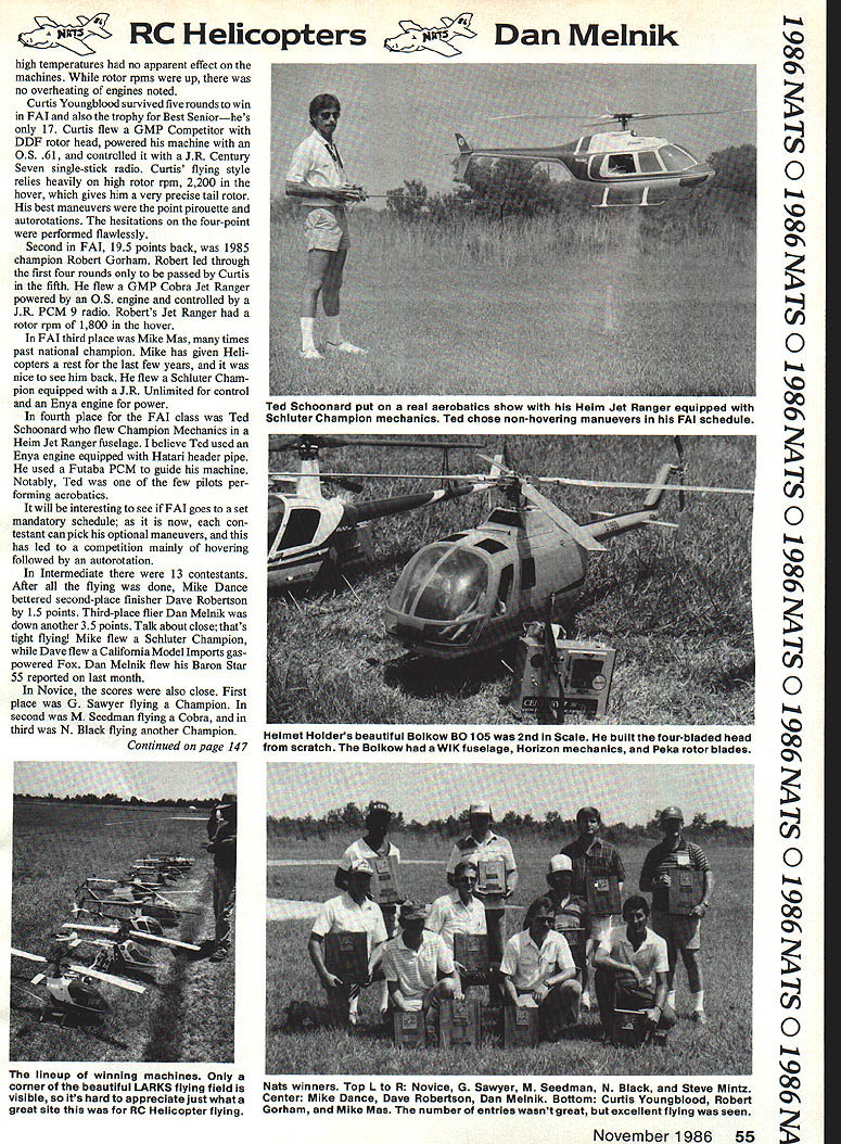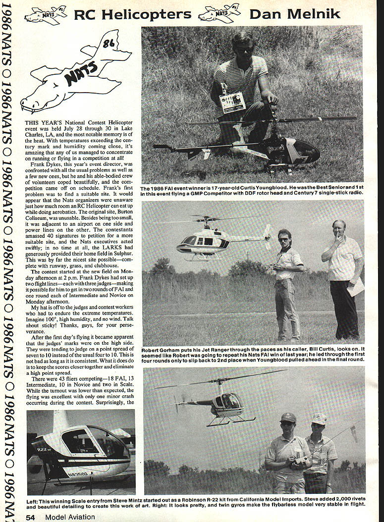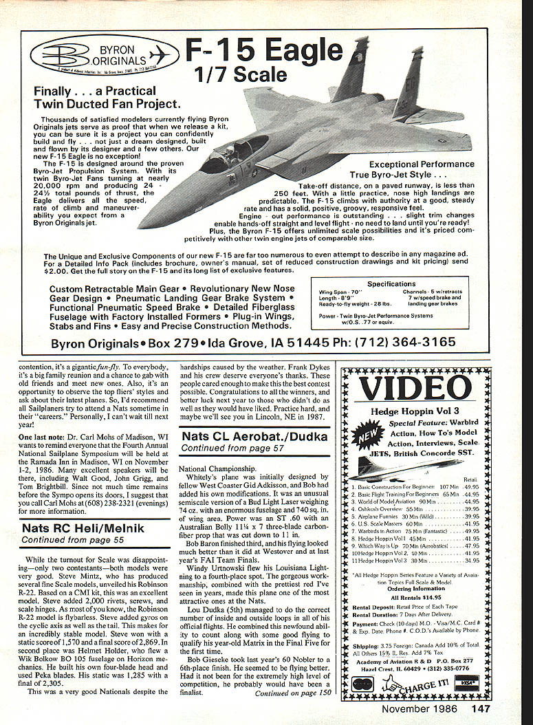 RC Helicopters Melnik Ci 0 00 J z THIS YEARS National Contest Helicopter event held July 28 through 30 Lake Charles LA notable memory Clthe heat temperatures exceeding cen Otury mark humidity coming close its amazing us managed concentrate running flying competition Frank Dykes years event director 0confronted usual problems well 00a few new ones able-bodied crew volunteers coped beautifully com petition came off schedule Franks first problem find suitable site would appear Nats organizers unaware just much room RC Helicopter can eat up himmwhile doing aerobatics original site Burton ClColiseum unusable Besides being too small adjacent airport side Qpower lines other contestants amassed 40 signatures petition suitable site Nats executives acted tly no time LARKS 00 generously provided home field Sulphur far nicest site possiblecom Z plete runway grass clubhouse contest started new field Mon day afternoon 2 pm Frank Dykes set up two flight lineseach three judgesmaking possible him get two rounds FAI one round Intermediate Novice O Monday afternoon hat off judges contest workers endure extreme temperatures IImagine 1000 high humidity no wind Talk about sticky Thanks guys perse 00verance After first days flying became apparent judges marks high side They tending judge point spread n 10 instead usual fourto 10 bad long consistent What does hmmis keep scores closer together eliminate high point spread 43 fliers competingi 8 FAI 13 Intermediate 10 Novice two Scale turnout lower expected & flying excellent minor crash occurring during contest Surprisingly 00 C, 0 00 0 z 54 Model Aviation 1986 FAt event winner 17-year-old Curtis Youngblooa wasine nest Seniorand 1St event flying GMP Competitor DDF rotor head Century 7 single-stick radio Robert Gorham puts Jet Ranger through paces caller Dill Curtis looKs seemed like Robert going repeat Nats FAI win lastycar led through first four rounds onlyto slip backto 2nd placewhen Youngblood pulled ahead inthe final round Left winning Scale entry Steve Mintz started out Robinson R-22 kit California Model Imports Steve added 2000 rivets beautiful detailing create work art Right looks pretty twin gyros make flybarless model very stable flight RCDan Melnik high temperatures no apparent effect machines rotor rpms up no overheating engines noted Curtis Youngblood survived five rounds win FAI also trophy Best Seniorhes 17 Curtis flew GMP Competitor DDF rotor head powered machine anC) 0S 61 controlled JR Century Seven single-stick radio Curtis flying style0 relies heavily high rotor rpm 2200 theI hover gives him very precise tail rotor best maneuvers point pirouette autorotations hesitations four-point performed flawlessly Second FAI 195 points back 1985 z champion Robert Gorham Robert led through first four rounds passed Curtis fifth flew GMP Cobra Jet Ranger powered OS engine controlled JR PCM 9 radio Roberts Jet Ranger aCJ rotor rpm 1800 hover FAI third place Mike Mas timesQ past national champion Mike has given Heli copters rest last few years wasImm& nice see him back flew Schluter Cham pion equipped JR Unlimited control Enya engine power fourth place FAI class Ted Schoonard flew Champion Mechanics Heim Jet Ranger fuselage believe Ted used Enya engine equipped Hatari header pipe used Futaba PCM guide machineImm Notably Ted few pilots performing aerobatics will interesting see FAI goes setQ mandatory schedule now con testant can pick optional maneuvers thisI has led competition mainly hovering followed autorotation Intermediate 13 contestants After flying done Mike Dance bettered second-place finisher Dave Robertson 15 points Third-place flier Dan Melnik down another 35 points Talk about close thats tight flying Mike flew Schluter Champion Dave flew California Model Imports gas-Cl powered Fox Dan Melnik flew Baron Star 55 reported last monthQ Novice scores also close First place G Sawyer flying Champion second M Seedman flying Cobra third N Black flying another Champion00 Continued page 147ON 0 00 ON 0 00 ON 55 November 1986 iea Schoonard put real aerobatics show Helm Jet Ranger equipped Schiuter Champion mechanics Ted chose non-hovering manuevers PAl schedule Helmet Holders beautiful Bolkow BO 105 2nd Scale built four-bladed head scratch Bolkow WIK fuselage Horizon mechanics Peka rotor blades lineup winning machines Only cornerof beautiful LARKS flying field Nats winners Top Lto R Novice G Sawyer M Seedman N Black Steve Mintz visible its hard appreciate just what Center Mike Dance Dave Robertson Dan Melnik Bottom Curtis Youngblood Robert great site RC Helicopter flying Gorham Mike Mas number entries wasnt great excellent flying seen BYRON ORIGINALS C ir Ic t Finally. Practical Twin Ducted Fan Project Thousands satisfied modelers currently flying Byron Originals jets serve proof release kit can sure project can confidently build fly st dream designed built flown its designer few others new F- 15 Eagle no exception F-i 5 designed around proven Byro-Jet Propulsion System its twin Byro-Jet Fans turning nearly 20000 rpm producing 24 24A total pounds thrust Eagle delivers speed rate climb maneuver ability expect Byron Originals jet Unique Exclusive Components new F- 15 far too numerous attempt describe magazine ad Detailed Info Pack includes brochure owners manual set reduced construction drawings kit pricing send $200 Get full story F-i Sand its long list exclusive features Custom Retractable Main Gear lutionary New Nose Gear Design matic Landing Gear Brake System Functional Pneumatic Speed Brake iled Fiberglass Fuselage Factory Installed Formers -in Wings Stabs Fins Precise Construction Methods Specifications wing Span 70channels 5 wlretracts Length aS 7 wf speed brake end Reedy-to-fly weight 25 lbs landing gear brakes Power - Twin Byro-Jet Performance Systems wfOS 77 equiv Byron Originals Box 279 Ida Grove IA 51445 Ph 712 364-3165 contention its gigantic fun-fly everybody its big family reunion chance gab old friends meet new ones Also its opportunity observe top