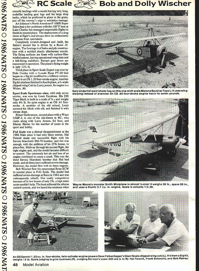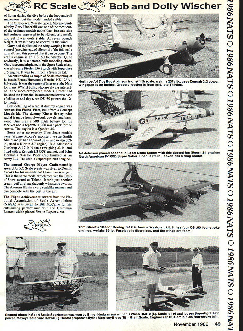 RC Scale Dolly Wischer C, 0 00 RETURNING air-conditioned Nats dor C snitory McNeese University end O days flying Chennault Air Base could see digital thermometer across street register mg 1000 1030F Accompanied high humid ity nearby Gulf Mexico heat concern competition cer Qo tainly its effect performances both models pilots Temperature runway pavement Nats site higher varying wind across runway course relieve baked feeling fortunate helped w competitors made cool early-morning flights hmm wind light Air Base now C inactive has vast areas pavement absorb store heat ic judging done gymnasium adjacent Nats headquarters neither air conditioned year least AMA HQ staff static judges hobby 00shop operators suffered along everyone else with roof protection searing Because large number Giant Scale combining RC CLmodels entries e gym quite crowded models spite high temperature large crowd came see models display flying site opposite observed Ordinarily spectators scene watch Scale o ghts Most likely total number spectators high came stay very long due discomfort During contest ectators plenty elbow room along 00ght line better Scale models kept under cover until engines started With 47 total RC Scale entries 1986 Nats somewhat disappointing although quality models flying partially compen sated lack quantity Giant Scale again C popular class 21 aircraft O were 16 Sport Scale Expert seven Sport Scale Sportsman three FAI Precision class small number entries afforded plenty O time four rounds flights gave 00 everyone equal exposure before two sets five judges scores three judges eraged lowest highest scores set judges being deleted observation low-scoring flight judge probably wasted two days heat except verbal influence other judges Cwhich considerable dont think Oevent needs type judge Ramon Torres repeated 1985 win Giant cale magnificent Beechcraft T-34C-1 IThe model completely detailed thousands rivets made Zap Lock cockpits camou 00flage finish K&B epoxy accurately-made o landing gear Its unusual feature accurately-reproduced Fowler flap system operates very prototypical manner 46 Model Aviation second year rowthat Ramon Torres has won Giant Scale Beechcraft T-34C-1 Moki 15 cu glow engine hauls 23-lb craft well folding wings Dennis Crooks Grumman TBM-3 Avenger fold via RC Supertigre 2500 glow engine powers 1 9-lb craft won second place Sport Scale Expert causing flaps extend outward well loud indeed fault could found downward gear flaps operate model noisy exhaust its precise sequence movement would weight 23 lb large engine doesnt fit expected fine machinery FAI Scale class other respect model uses Mold 15 cu engine Precision Scale quality Ramons fiberglass has sound being unmuffled fuselage made original molds first glance cylinder muffler ST 90 glow engine Francis McCrackens one-fifth-scale Ryan PT-22 go unnoticed Finish burnished chrome MonoKote IARC Scale wing built-up structure i-oz glass cloth surface second place famous folding-wing Grumman TBM-3 Avenger built Dennis Crooks Unfortunately second flight oppressive heat damaged mechanism folding wings right wing suddenly un folded jarring thump model taxiing Subsequent flights made wings permanently extended locked model finished second place because its static score slightly low Its 19-lb weight easily handled its Supertigre 2500 engine novel audio system Bob Hanfts -scale Fokker EV DVIII simulated machine gun fire air may have accurate rendition real thing certainly attract ed attention probably helped Bob third place Giant Scale class tiny trans ducer needed loud order make itself heard above models two-horsepower Super Tartan engine Fourth place Giant Scale won scale Spitfire Frank Thomas built Dave Platt kit powered Supertigre 2500 engine Dave Platt present Nats new roleflying Free Flight Scale event rather large rubber-powered Grumman Guardian made QOS flight lacking dethermalizer returned next day Francis McCracken entered Giant Sport Scale classes pair Ryan PT 22s -scale other scratchbuilt polished metal fuselages actually MonoKote-covered burnished simulate aluminum surface larger model used Supertigre 2500 engine smaller Super tigre 90 coincidence both models finished sixth place respective classes Seventh eighth places won couple familiar fellows Mike Gretz father-in-law Maxey Hester both flying Mor risey Bravos Mike repainted prototype last yearthe full-size plane belonging Hazel Maxey Mikes model older gray finish Maxeys new red white Mike used 05 240 Super Gemini twin Maxey 05 160 twin no question 240 developed greater thrust model performs well either engine weight two models about same 18 lb Maxey used DuPont Centauri paint over Koverall heat-shrink fabric great see Maxey Hazel flight line again after number years absence Nats competition Dave Falkenhagen also member Sig organization flew -scale model Hazels clipped-wing Cub ninth place Giant Scale used OS Gemini 120 twin power Five first 10 places Giant used four-stroke glow engines Tom Street used Westcraft kit build Yw-scale 10-ft-span Boeing B-17 finished tenth place Engines four 05 60 fourstrokes sound pleasant hear model finished high gloss strange appearance until realizes Tom has copied restored prototype finished Imron paint Quite heavy 39 lb Fortress flew well certainly underpowered fault could found reaim flight realism model no retracts flown turns too steep bomber Toms bomb drop quite accurate placed immediately front judges Sport Scale Expert class Bill McCallie winner -scale Grumman F8F-1 Bearcat built Royal kit engine 05 90 Bills flights distinguished Bob Dolly Wischer November 1986 47 Bob Hanfts /4-scale FokKer EV features on-board sound system simulate machine gun firing Super Tartan engine powers 7-ft-span craft Third Giant Scale 00 ON 0 00 ON 0 00 ON cI 0 00 ON C, 0 00 ON C, 0 00 ON hmmI 0 00 ON First place Sport Scale Sportsman want Louis Escalonas DH Tiger Moth 166 scale uses 05 61 four-stroke power Finish silk-and-dopea rarity days Ed Izzos Laser 200 h