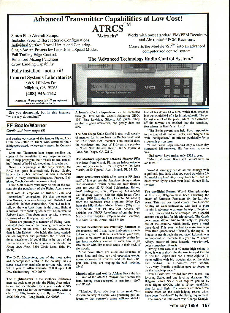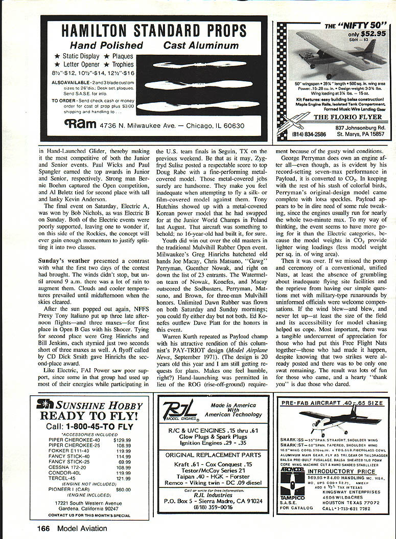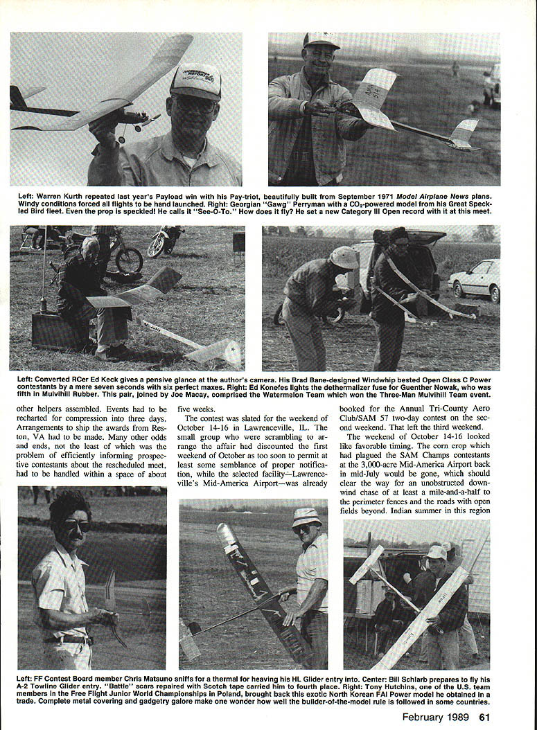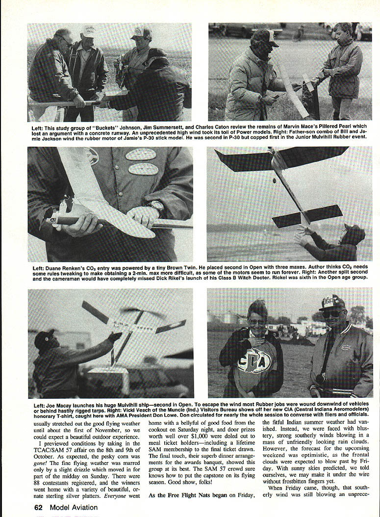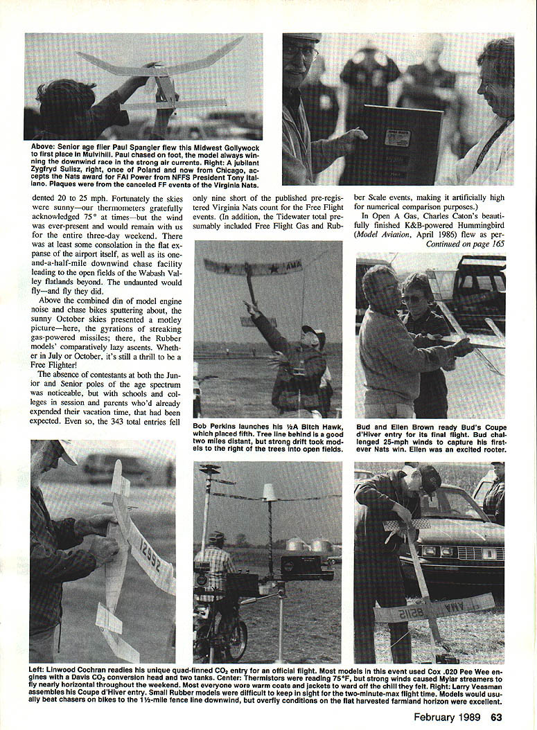 0 1988 Free Flight Nab Canceled Tidewater Virginia location events re scheduled Illinois October Turnout great considering short time pub licity modelers U Harry Murphy THE 1988 AMA NATIONAL Model Air plane Championships will enter history books no other reason long est Nats ever championships began July 23rd State Virginia didnt see final curtain drawn until midOctober plains southern Illinois Especially Free Flighters arranged vacation time around tendance Tidewater Nats July last-minute cancellation Outdoor Free Flight events except Scale came severe disappointment least initially Charles Catons K&B 325-powered Humming bird plans April 1986 MA captured everyones attention Class Gorgeous yel low model virtually ignored high winds log six max flights took first place National Free Flight Society President Tony Italiano starts engine Class B Power model Tony key figure rescheduling Free Flight Nats also topped Open B field model waning minutes weekend three quick maxes sun came out finalize Sunday began wind rain Once Nats over though attention AMA Headquarters could again revert dilemma Free Flight contingent make amends unfor tunate turn events canceled outdoor competition solution proposal made around first September NFFS Na tional Free Right Society belatedly re schedule canceled Free Flight events complete unused Nats trophies NFFS accepted challenge Within about nine days viable site confirmed Contest Director drafted volunteer force event directors tabulators necessities AMA FF Nats would clude CD Dick Smith left annuai contestant Sal Talbi pictured Starduster 900 Minus WW Ii years TaibIs 49th consecutIve National Contest 60 Model Aviation waiiace bucKets Johnson starts Su perTigre 60 huge Class D bird Wind breakers jackets vogue week end despite mostly sunny cloudless skies Left Warren Kurth repeated last years Payload win Pay-triot beautifully built September 1971 Model Airplane News plans Windy conditions forced flights hand launched Right Georgian Gawg Perryman C02-powered model Great Speck led Bird fleet prop speckled calls See-O-To does fly set new Category ill Open record meet Left Convened RCer Ed Keck gives pensive glance authors camera Brad Bane-designed Windwhip bested Open Class C Power contestants mere seven seconds six perfect maxes Right Ed Konefes lights dethermalizer fuse Guenther Nowak fifth Mulvihill Rubber pair joined Joe Macay comprised Watermelon Team won Three-Man Mulvihill Team event other helpers assembled Events recharted compression three days Arrangements ship awards Res ton VA made other odds ends least problem efficiently informing prospec tive contestants about rescheduled meet handled within space about Left FF Contest Board member Chris Matsuno sniffs thermal heaving HL Glider entry Center Bill Schiarb prepares fly A-2 Towline Glider entry Battle scars repaired Scotch tape carried him fourth place Right Tony Hutchins US team members Free Flight Junior World Championships Poland brought back exotic North Korean FAI Power model obtained trade Complete metal covering gadgetry galore make wonder well builder-of-the-model rule followed some countries February 1989 61 five weeksbooked Annual Tn-County Aero contest slated weekend ofClub/SAM 57 two-day contest seeOctober 14-16 Lawrencevile IL Theond weekend left third weekend small group scrambling ar- weekend October 14-16 looked range affair discounted firstlike favorable tuning corn crop weekend October too soon permit athad plagued SAM Champs contestants least some semblance proper notifica-at 3000-acre Mid-America Airport back tion seleeted facilityLawrence-in mid-July would gone should villes Mid-America Airportwas alreadyclear way unobstructed down wind chase least mile-and-a-half perimeter fences roads open fields beyond Indian summer region Left This study group Buckets Johnson Jim Summersett Charles Caton review remains Marvin Maces Pilfered Pearl lost argument concrete runway An unprecedented high wind took its toll Power models Right Father-son combo Bill Ja mie Jackson wind rubber motor Jamies P-30 stick model second P-30 copped first Junior Mulvihill Rubber event Left Duane Renkens CO2 entry powered tiny Brown Twin placed second Open three maxes Author thinks CO2 needs some rules tweaking make obtaining 2-mm max difficult some motors seem run forever Right Another split second cameraman would have completely missed Dick Rikels launch Class B Witch Doctor Rickel sixth Open age group Left Joe Macay launches huge Mulvihill shipsecond Open escape wind Rubber jobs wound downwind vehicles behind hastily rigged tarps Right Vicki Veach Muncie md Visitors Bureau shows off new CIA Central Indiana Aeromodelers honorary T-shirt caught AMA President Don Lowe Don circulated neariy whole session converse fliers officials usually stretched out good flying weather until about first November could expect beautiful outdoor experience previewed conditions taking TCAC/SAM 57 affair 8th 9th October As expected pesky corn gone fine flying weather marred slight drizzle moved part midday Sunday 88 contestants registered winners went home variety beautiful nate sterling silver platters Everyone went home bellyful good food cookout Saturday night door prizes worth well over $1 OOO doled out meal ticket holdersincluding lifetime SAM membership final ticket drawn final touch superb dinner arrange ments awards banquet showed group its best SAM 57 crowd sure knows put capstone its flying season Good show folks As Free Flight Nats began Friday fitful Indian summer weather van ished Instead faced blus tery strong southerly winds blowing mass unfriendly looking rain clouds However forecast upcoming weekend optimistic frontal clouds expected blow past Fri day sunny skies predicted told ourselves may make under wire frostbitten fingers yet Friday came though south erly wind still blowing unprece 62 Model Aviation dented 20 25 mph Fortunately skies sunnyour thermometers gratefully acknowledged 750 timesbut wind ever-present woul
