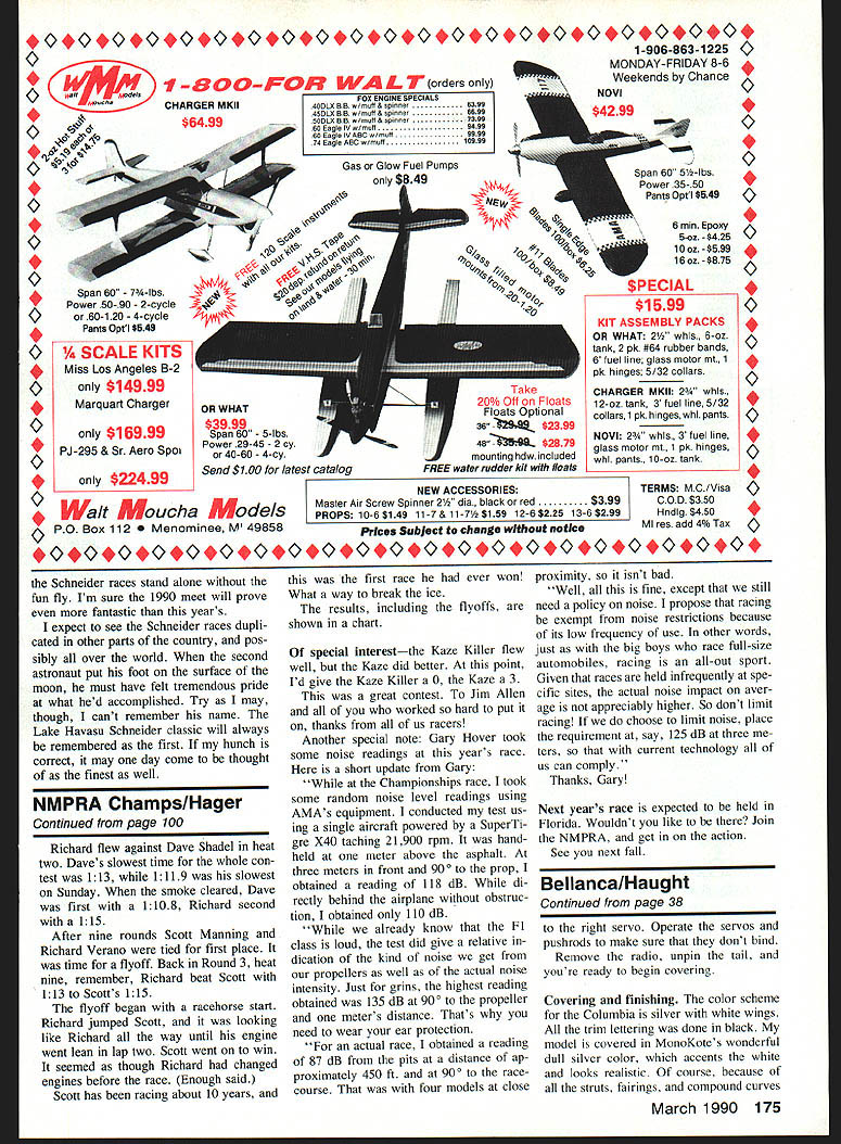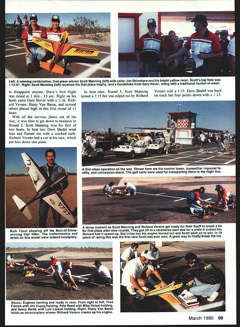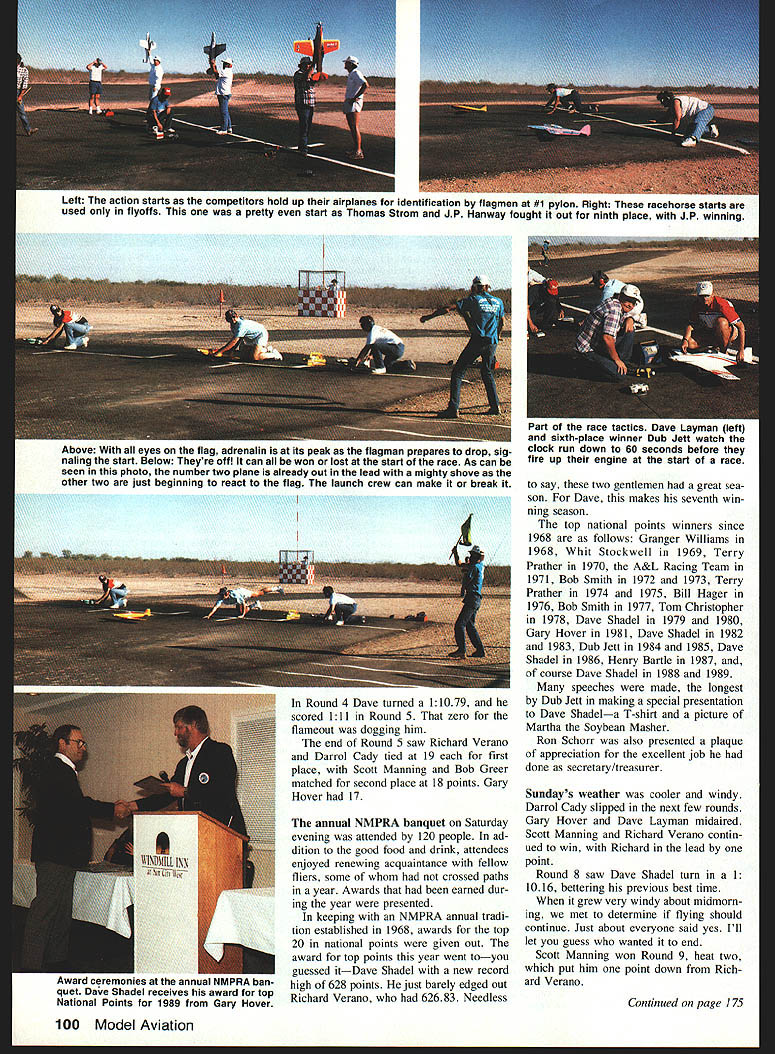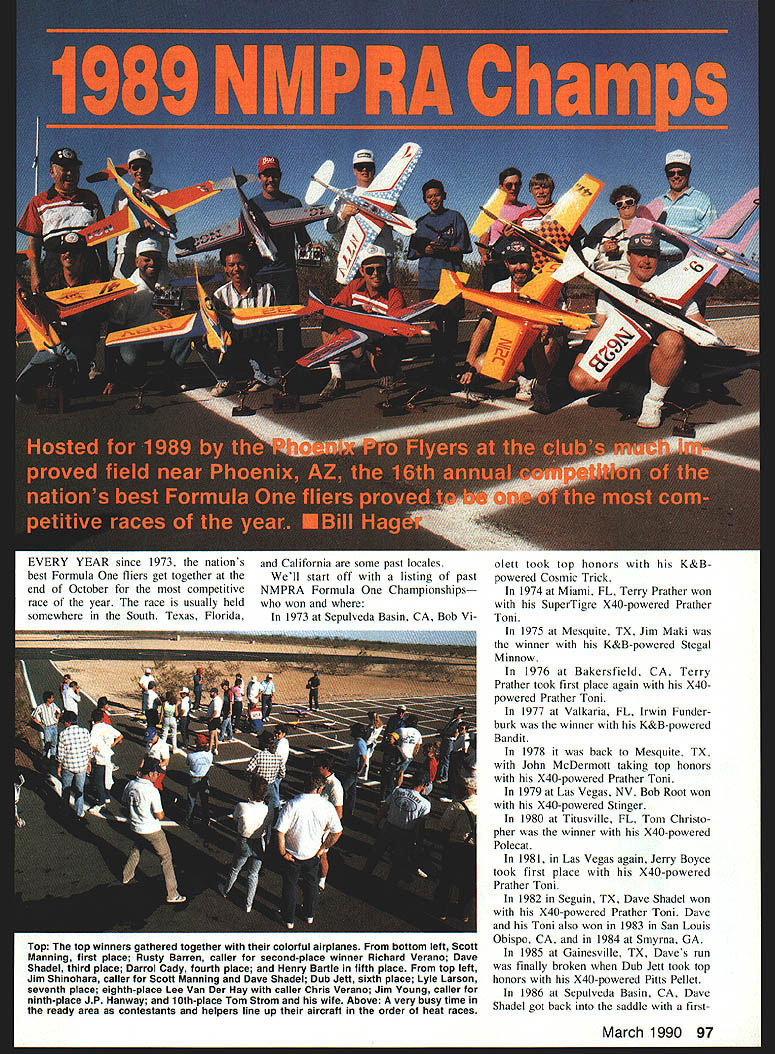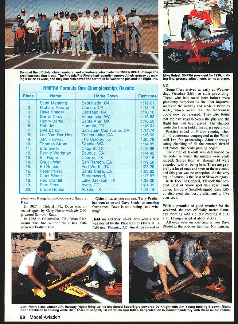 EVERY YEAR since 1973 nations best Formula fliers get together end October competitive race year race usually held somewhere South Texas Florida California some past locales Well start off listing past NMPRA Formula Championships won 1973 Sepulveda Basin CA Bob ViThe top winners gathered together colorful airplanes bottom left Scott first place Rusty Barren caller second-place winner Richard Verano Dave 1iird place Darrol Cady fourth place Henry Bartle fifth place top left juii nohara caller Scott Manning Dave Shadel Dub Jett sixth place Lyle Larson severno place eighth-place Lee Van Der Hay caller Chris Verano Jim Young caller ninth-place JP Hanway 10th-place Tom Strom wife Above very busy time ready area contestants helpers line up aircraft order heat races olett took top honors K&B powered Cosmic Trick 1974 Miami FL Terry Prather won SuperTigre X40-powered Prather Toni 1975 Mesquite TX Jim Maki winner K&B-powered Stegal Minnow 1976 Bakersfield CA Terry Prather took first place again X40powered Prather Toni 1977 Valkaria FL Irwin Funder burk winner K&B-powered Bandit 1978 back Mesquite TX John McDermott taking top honors X40-powered Prather Toni 1979 Las Vegas NV Bob Root won X40-powered Stinger 1980 Titusville FL Toni Christo pher winner X40-powered Polecat 1981 Las Vegas again Jerry Boyce took first place X40-powered Prather Toni 1982 Seguin TX Dave Shadel won X40-powered Prather Toni Dave Toni also won 1983 San Louis Obispo CA 1984 Smyrna GA 1985 Gainesville TX Daves run finally broken Dub Jett took top honors X40-powered Pitts Pellet 1986 Sepulveda Basin CA Dave Shadel got back saddle firstMarch 1990 97 NMPRA Formula Championships Results PlaceNameHome TownFast time 1 Scott ManningSepulveda CA11261 2 Richard VeranoCarson CA11314 3 Dave ShadelCarlsbad CA11016 4 Darrol CadyVancouver WA11652 5 Henry BartleSanta Ana CA11659 6 Dub JettHumble TX11501 7 Lyle LarsonSan Juan Capistrano CA11474 8 Lee Von Der HeyToluca Lake CA11699 9 JP HanwayThe Colony TX12079 10 Thomas StromSeattle WA11485 11 BobGreerCoppellTX11899 12 Bernie WorkmanSaugus CA11445 13 Bill HagerConroe TX11816 14 Chuck WahISan Ramon CA11950 15 Ed RankinFort Worth TX12328 16 Peter PriestSanta Clara CA12382 17I Clark WadeStreamwood IL11787 18 Red CranfillLake Jackson TX12200 19 Pete ReedAvon CT121 99 20 Bruce HobbsAustin TX11814 place win flying X40-powered Samurai Kaze 1987 Deland FL Dave un seated again Gary Hover X40powered Samurai Kaze 1988 Gainesville TX Brian Rich mond winner X40powered Prather Toni Quite list can see Terry Prather has won twice Dave Shadel amazing four times Dave still racingand win ning Held October 28-29 years race hosted Phoenix Pro Flyers its field near Phoenix AZ Jim Allen served CD Some fliers arrived early Wednes day October 25th start practicing raced before pleasantly surprised find improve ments runway made twice wide meant racecourse could now reversed also found cart road between pits flight line paved changes made flying field first-class operation Practice ended Friday evening 40 contestants congregated Wind mill Inn processing After thorough safety checking entered aircraft radios Scale judging began order takeoff determined order models Scale judged Scores #1 through #4 awarded #1 being best gen erally lot f ones twos events year no exception very top course Best Show category Rich Tocci Coppell TX took cov eted Best Show spot year hands down Jerry Small-designed Kaze Kill er displayed best craftsmanship Ive ever seen promise good weather weekend race officially started Satur day morning pilots meeting 800 am Flying started about 900 am eyes four-time winner Dave Shadel odds-on favorite wanting Let Ninin-place winner JP Manway right tiring up checkered SuperTigre-powered De Knight Jim Young holding down Right Keith Davidson holding Rich Tocci Coppell TX starts Kazi Killer Ear protection almost mandatory all-out racers 98 Model Aviation Some officials club members volunteers made 1989 NMPRA Champs great success Phoenix Pro Flyers recently improved runway mak ing twice wide also paved cart road between pits flight line e neIuI prewasni Tar 1U maK ing final prerace aajustments airplane disappoint anyone Daves first flight timed 1 mm 13 sec Right heels came Gary Hover 116 Rich ard Verano Rusty Van Baren several others placed high first round 11 heats nervous jitters out way time get down business Round 2 Scott Manning won first two heats heat two Dave Shadel went lean flamed out cracked carb Richard Verano cut race put him down point tense moment Scott Manning Richard Verano get ready tor tneir TIYOTT break tie Rich Tocci snowing OTT mu oest-of-Show-for first place after nine rounds got off racehorse start looked like winning Kazi Killer craftsmanship andRichard sewed up lap two engine leaned out Scott went win 10 finish model indeed exemplaryyears racing first race Scott has ever won great way finally break ice ADove engines running eiiu French Jim Young holding Henry Bartle Lyle Larson noloing nigril vail holds second-place winner Richard Verano craniw up engine March 1990 99 Left winning combination first-place winner Scott Manning left caller Jim Shinohara bright yellow racer Scotts top time 11261 Right Scott Manning left receives first-place trophy handshake Gary Hover along traditional bucket water heat nine Round 3 Scott Manning turned 115 edged out Richard first-class operation way Shown tne control tower transmitter impound fa cility concession stand golf carts used transporting fliers flight line Left The action starts competitors nob up airplanes identification flagmen #1 pylon Right racehorse starts used flyoffs pretty start Thomas Strom JP Hanway fought out ninth place JP winning Above eyes tiag adrenalin its peak flagman prepares drop sig naling start Below Theyre off can won lost start race As can seen photo number two plane already out lead mighty shove other two just beginning react flag launch crew can make break wara ceremonies annual NMPHA ban quet Dave Shadel receives awar