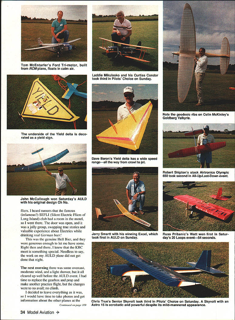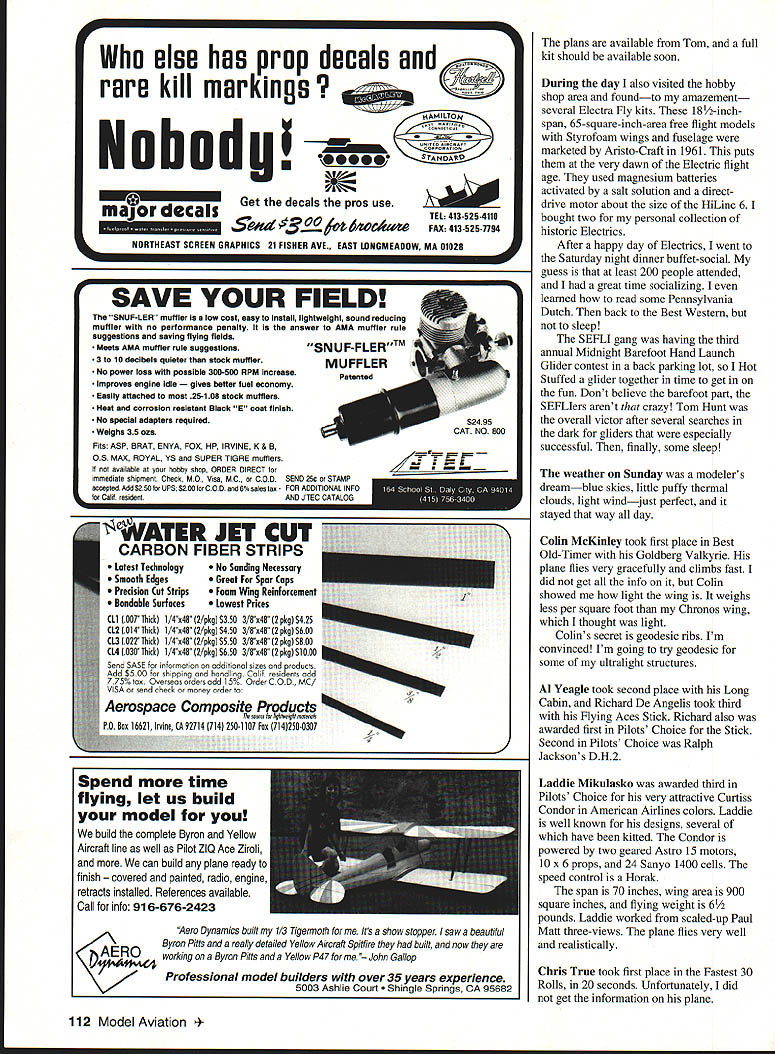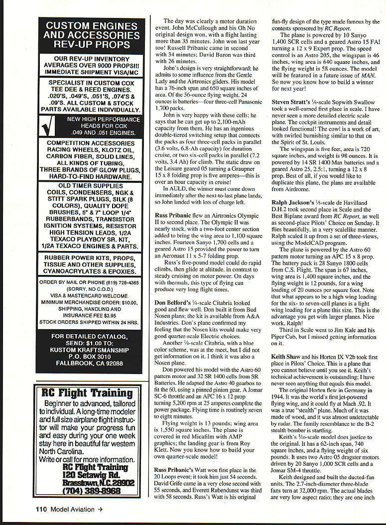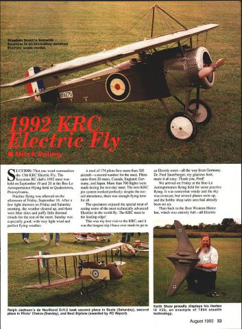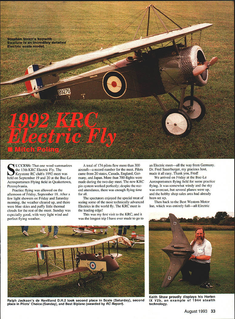 SUCCESS word summarizes 13th KRC Electric Fly Keystone RC clubs 1992 meet held September 19 20 Buc-Le Aerosportsmen Flying field Quakertown Pennsylvania Practice flying allowed afternoon Friday September 18 After few light showers Friday Saturday morning weather cleared up blue skies puffy little thermal clouds rest meet Sunday especially good very light wind perfect flying weather total 174 pilots flew 300 aircrafta record number meet Pilots came 20 states Canada England Ger Japan 700 flights made during two-day meet new KRC pin system worked perfectly despite rec ord attendance enough flying time spectators enjoyed special treat seeing some technically advanced Etectrics world fly KRC meet leading edge first visit KRC longest trip have ever made go Electric meetall way Germany Dr Fred Sauerburger gracious host made easy Thank Fred arrived Friday Buc-Le Aerosportsmen flying field some practice flying somewhat windy sky overcast several planes up hobby shop sales area already set up back Best Western Motor Inn entirely fullall Electric August1993 33 Ralph Jacksons de Havilland DH2 took second place Scale Saturday second place Pilots Choice Sunday Best Biplane awarded RC Report Keith Shaw proudly displays Horten IX V2b example 1944 stealth technology fliers heard rumors famous infamous SEFLI Silent Electric Fliers Long Island club room motel went door open jolly group swapping true stories valuable experience about Electrics drinking real German beer genuine Hell Bier generous enough let have some Right knew KRC meet something special Needless say work AULD plane did get done night next morning some overcast moderate wind light shower cleared up well before AULD event time replace gearbox prop make another practice flight changes no avail no climb decided leave everything would have time take photos get infomation about other planes Continued page 109 34 Model Aviation McEntarfers Ford Tn-motor built RCM plans floats calm air Laddie Mikulasko Curtiss Condor took third Pilots Choice Sunday underside Yield delta deco rated yield sign Note geodesic ribs Cohn McKinleys Goldberg Valkyrie Dave Barons Yield delta has wide speed rangeall way crawl jet John McCullough won Saturdays AULD original design Oh No Robert Shiptons stock Airtronics Olympic 650 took second All-Up/Last-Down event Jerry Smartt winning xceI wnicnHues Irlbarncs watt won tirst Satur took first AULD Sundaydays 20 Loops event54 seconds Chris Trues Senior Skyvolt took third Pilots Choice Saturday Skyvolt Astro 15 acrobatic powerful despite its mild-mannered appearance REGAIN CONTROL i7 Losing control can nightmare wrong response given command can take its toll model nerves wallet Radio South know feel about hobby too avid RC enthusiasts nearly halt century combined experience modeling radio repair So avoid inflated repair costs undue service time Radio South fast economical in-house radio service can depend Radio South customer satisfaction isnt just motto Its way life Let us put back control F5 Futaba ______ jAIR1WICS 5524 N Palafox Pensacola FL 32503 repair information 904 434-0909 1-800-962-7802 Toll Free Order Line lOrders Only Pleasell Uncle Harrys contact prints held about 100 times detail enlargements true Civil War Look detail Matthew Brady print stilt true today beautiful color pictures automobile sales brochures made large films HOW ABOUT COMPUTER GRAPHICS Computer graphics also limited screen pixels exactly like TV common home PC graphic screen VGA contains 640 x 480 00 pixels Theoretically VGA screen can show 320 vertical lines across screen VGA contains 22% detail 35mm negative SVGA becoming popular contains 1024 x 768 32 pixels Theoret ically can show 512 vertical lines across screen SVGA contains 36% detail 35mm negative Dont frightened mathits simple Knowing calculate limitations equipment first step toward getting what want what magazine needs picture bad mechanic blames tools good mechanic gets best possible service tools hand Bear mind average picture printed magazine measures about 25 x 45 inches contains about 180000 dots about 3% detail 35nim negative result 133-line screen process needed keep ink smearing printing presses low-contrast low-detail print turns gray mud hurry because forced use screen cant add detail picture take away So send us big images lots contrast sharp detail Look some Model Aviations adver tisements examples pictures printed well SUMMARY point article help realize negative slide print videotape computer file has limited ability show detail can define limits pixels dots put subject better viewer will understand what trying illustrate Evaluation photographs subjective dont feel hurt people ignore photographs People either like what see dont What see depends prior knowledge photo Neil Armstrongs footprint moon may impress great picture told scientists about what moon like anything before made Incidentally moon black white blue white appeared cover Life magazine need good photo captions educate viewer he/she will like picture Nobody can tell make great picture everybody can criticize Com plaints include small images distracting backgrounds low detail subject image awkward composition confusing shadows low contrast color distortion etc akeady knew Electric FlyIPoling Continued page 34 meet turned out major task didnt know pilots would show up planes wound up 300 color photos 22 pages notes representing about 70 planes obtained specific information 60 planes Unfortunately cant describe planes have detailed information isnt enough space So will choose few although outstanding apologize pilots planes missed majority would have taken team writers cover AULD event 130 pm Saturday 15 pilots launched no-thermal sky did go very far circle land because insufficient power did give chance watch other fliers VINTAGE F/C PLANS PREVIOUSLY SIO MORGAN NEW OWNER-FRED NOVACI 5105 PINE HILL CIRCLE HOWELL MICH4 8843 0 CURI7SS- WRIGHT T-3Z CONDOR 82W-AN IENGS 40-60 PLAN NO O8RC S 1595 PLUG $S95 UAsa FOR9a9 MAY45 