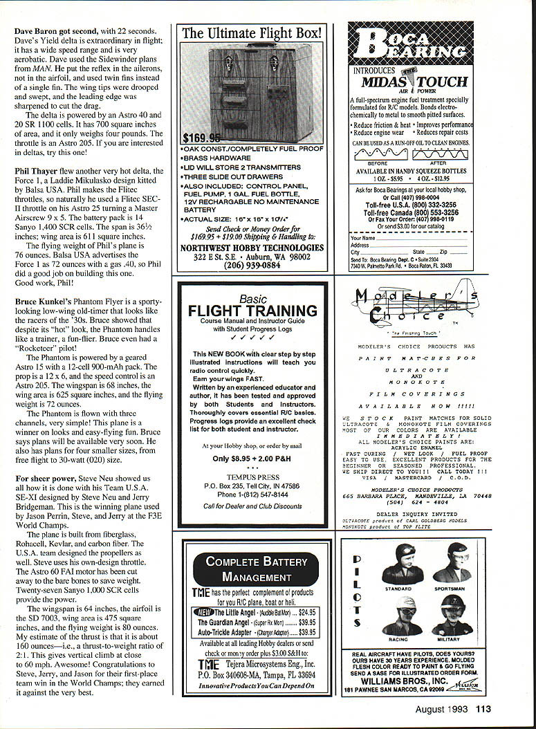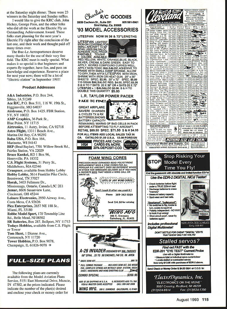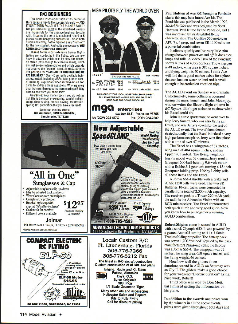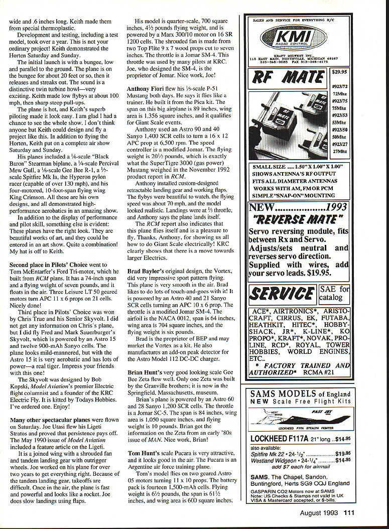SUCCESS word summarizes 13th KRC Electric Fly Keystone RC clubs 1992 meet held September 19 20 Buc-Le Aerosportsmen Flying field Quakertown Pennsylvania Practice flying allowed afternoon Friday September 18 After few light showers Friday Saturday morning weather cleared up blue skies puffy little thermal clouds rest meet Sunday especially good very light wind perfect flying weather total 174 pilots flew 300 aircrafta record number meet Pilots came 20 states Canada England Ger Japan 700 flights made during two-day meet new KRC pin system worked perfectly despite rec ord attendance enough flying time spectators enjoyed special treat seeing some technically advanced Etectrics world fly KRC meet leading edge first visit KRC longest trip have ever made go Electric meetall way Germany Dr Fred Sauerburger gracious host made easy Thank Fred arrived Friday Buc-Le Aerosportsmen flying field some practice flying somewhat windy sky overcast several planes up hobby shop sales area already set up back Best Western Motor Inn entirely fullall Electric August1993 33 Ralph Jacksons de Havilland DH2 took second place Scale Saturday second place Pilots Choice Sunday Best Biplane awarded RC Report Keith Shaw proudly displays Horten IX V2b example 1944 stealth technology fliers heard rumors famous infamous SEFLI Silent Electric Fliers Long Island club room motel went door open jolly group swapping true stories valuable experience about Electrics drinking real German beer genuine Hell Bier generous enough let have some Right knew KRC meet something special Needless say work AULD plane did get done night next morning some overcast moderate wind light shower cleared up well before AULD event time replace gearbox prop make another practice flight changes no avail no climb decided leave everything would have time take photos get infomation about other planes Continued page 109 34 Model Aviation McEntarfers Ford Tn-motor built RCM plans floats calm air Laddie Mikulasko Curtiss Condor took third Pilots Choice Sunday underside Yield delta deco rated yield sign Note geodesic ribs Cohn McKinleys Goldberg Valkyrie Dave Barons Yield delta has wide speed rangeall way crawl jet John McCullough won Saturdays AULD original design Oh No Robert Shiptons stock Airtronics Olympic 650 took second All-Up/Last-Down event Jerry Smartt winning xceI wnicnHues Irlbarncs watt won tirst Satur took first AULD Sundaydays 20 Loops event54 seconds Chris Trues Senior Skyvolt took third Pilots Choice Saturday Skyvolt Astro 15 acrobatic powerful despite its mild-mannered appearance REGAIN CONTROL i7 Losing control can nightmare wrong response given command can take its toll model nerves wallet Radio South know feel about hobby too avid RC enthusiasts nearly halt century combined experience modeling radio repair So avoid inflated repair costs undue service time Radio South fast economical in-house radio service can depend Radio South customer satisfaction isnt just motto Its way life Let us put back control F5 Futaba ______ jAIR1WICS 5524 N Palafox Pensacola FL 32503 repair information 904 434-0909 1-800-962-7802 Toll Free Order Line lOrders Only Pleasell Uncle Harrys contact prints held about 100 times detail enlargements true Civil War Look detail Matthew Brady print stilt true today beautiful color pictures automobile sales brochures made large films HOW ABOUT COMPUTER GRAPHICS Computer graphics also limited screen pixels exactly like TV common home PC graphic screen VGA contains 640 x 480 00 pixels Theoretically VGA screen can show 320 vertical lines across screen VGA contains 22% detail 35mm negative SVGA becoming popular contains 1024 x 768 32 pixels Theoret ically can show 512 vertical lines across screen SVGA contains 36% detail 35mm negative Dont frightened mathits simple Knowing calculate limitations equipment first step toward getting what want what magazine needs picture bad mechanic blames tools good mechanic gets best possible service tools hand Bear mind average picture printed magazine measures about 25 x 45 inches contains about 180000 dots about 3% detail 35nim negative result 133-line screen process needed keep ink smearing printing presses low-contrast low-detail print turns gray mud hurry because forced use screen cant add detail picture take away So send us big images lots contrast sharp detail Look some Model Aviations adver tisements examples pictures printed well SUMMARY point article help realize negative slide print videotape computer file has limited ability show detail can define limits pixels dots put subject better viewer will understand what trying illustrate Evaluation photographs subjective dont feel hurt people ignore photographs People either like what see dont What see depends prior knowledge photo Neil Armstrongs footprint moon may impress great picture told scientists about what moon like anything before made Incidentally moon black white blue white appeared cover Life magazine need good photo captions educate viewer he/she will like picture Nobody can tell make great picture everybody can criticize Com plaints include small images distracting backgrounds low detail subject image awkward composition confusing shadows low contrast color distortion etc akeady knew Electric FlyIPoling Continued page 34 meet turned out major task didnt know pilots would show up planes wound up 300 color photos 22 pages notes representing about 70 planes obtained specific information 60 planes Unfortunately cant describe planes have detailed information isnt enough space So will choose few although outstanding apologize pilots planes missed majority would have taken team writers cover AULD event 130 pm Saturday 15 pilots launched no-thermal sky did go very far circle land because insufficient power did give chance watch other fliers VINTAGE F/C PLANS PREVIOUSLY SIO MORGAN NEW OWNER-FRED NOVACI 5105 PINE HILL CIRCLE HOWELL MICH4 8843 0 CURI7SS- WRIGHT T-3Z CONDOR 82W-AN IENGS 40-60 PLAN NO O8RC S 1595 PLUG $S95 UAsa FOR9a9 MAY45 