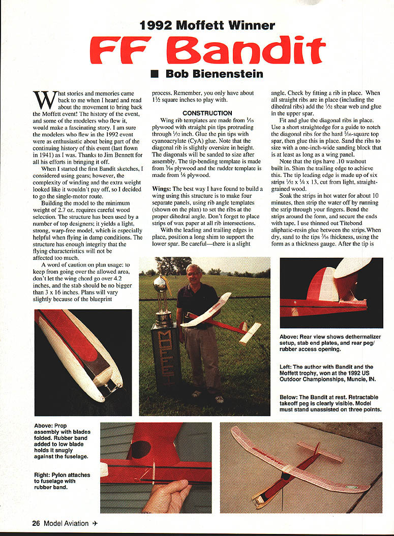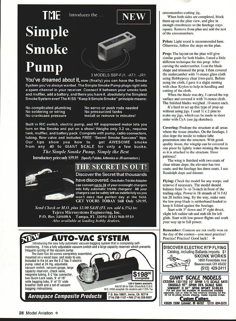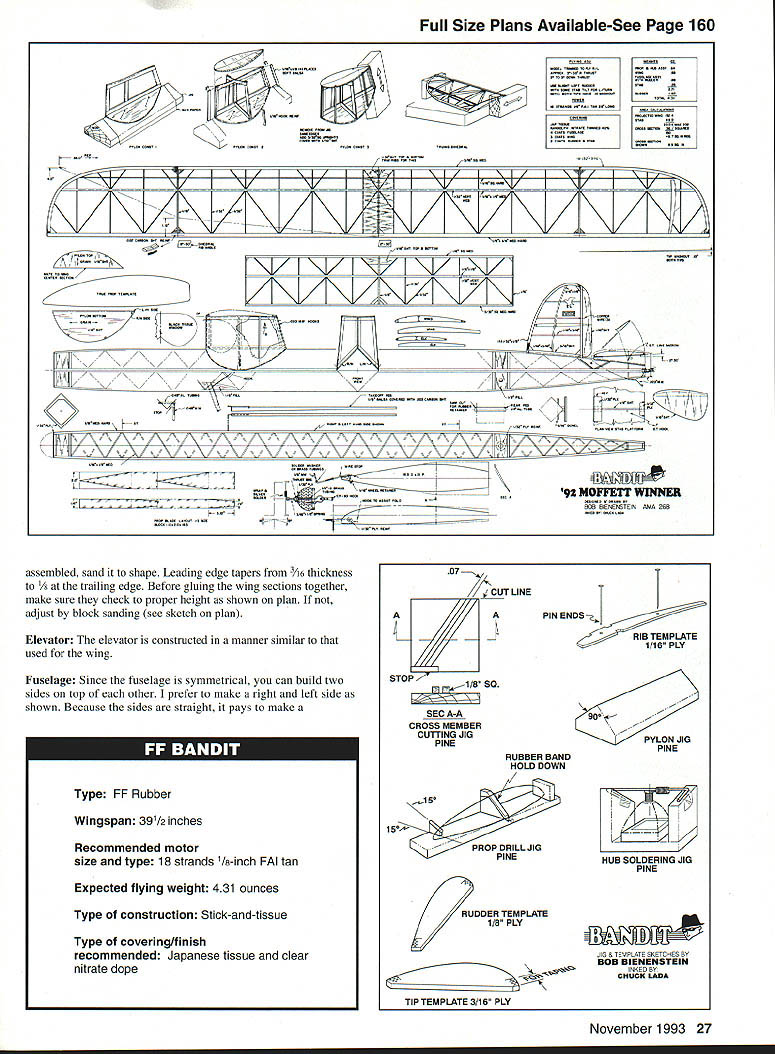 1992 Moffett Winner FF Bandit U Bob Bienenstein What stories memories came back heard read about movement bring back Moffett event history event some modelers flew would make fascinating story am sure modelers flew 1992 event enthusiastic about being part continuing history event last flown 1941 Thanks Jim Bennett efforts bringing off started first Bandit sketches considered using gears however complexity winding extra weight looked like wouldnt pay off decided go single-motor route Building model minimum weight 27 oz requires careful wood selection structure has used number top designers yields light strong warp-free model especially helpful flying damp conditions structure has enough integrity flying characteristics will affected too much word caution plan usage keep going over allowed area dont let wing chord go over 42 inches stab should no bigger 3 x 16 inches Plans will vary slightly because blueprint Right Pylon attaches fuselage rubber band process Remember have about 1 /2 square inches play CONSTRUCTION Wing rib templates made A6 plywood straight pin tips protruding through /32 inch Glue pin tips cyanoacrylate CyA glue Note diagonal rib slightly oversize height diagonals will sanded size after assembly tip-bending template made 46 plywood rudder template made /s plywood Wings The best way have found build wing using structure make four separate panels using rib angle templates shown plan set ribs proper dihedral angle Dont forget place strips wax paper rib intersections leading trailing edges place position long shim support lower spar carefulthere slight angle Check fitting rib place straight ribs place including dihedral ribs add /32 shear web glue upper spar Fit glue diagonal ribs place Use short straightedge guide notch diagonal ribs hard A6-square top spar glue place Sand ribs size one-inch-wide sanding block least long wing panel Note tips have 10 washout built Shim trailing edge achieve tip leading edge made up six strips 142 x Vt x 13 cut light straight grained wood Soak strips hot water about 10 minutes strip water off running strip through fingers Bend strips around form secure ends tape use thinned out Titebond aliphatic-resin glue between stripsWhen dry sand tips /6 thickness using form thickness gauge After tip Left author Bandit Moffett trophy won 1992 US Outdoor Championships Muncie IN 26 Model Aviation e Rear view shows dethermalizer setup stab end plates rear peg/ rubber access opening Above Prop assembly blades folded Rubber band added low blade holds snugly against fuselage Below Bandit rest Retractable takeoff peg clearly visible Model must stand unassisted three points Full Size Plans Available-See Page 160 ~-]/I\ V /I INII I\I/I I\I/I\I/ /INV\ N/NA [1777 F;iz7] Y-r NVINI/ \7J7 I- / / ~N\NNN\NN N 92 MOFFET WINNER SOB BENENSTEN AMA 268 assembled sand shape Leading edge tapers 3A6 thickness 1/ trailing edge Before gluing wing sections together make sure check proper height shown plan adjust block sanding see sketch plan Elevator The elevator constructed manner similar used wing Fuselage Since fuselage symmetrical can build two sides top other prefer make right left side shown Because sides straight pays make 07 LINE AA SEC A-A CROSS MEMBER CUTTING JIG PINE RUBBER BAND HOLD DOWN RUDDER TEMPLATE 1/8 PLY TIP TEMPLATE 3/16 PLY PIN ENDS1 RIB TEMPLATE 1/16 PLY 90 PYLON JIG PINE HUB SOLDERING JIG PINE JIG & TEMPLATE S1ETChES BOB BIENENSTEIN INKED BY CHUCK LADA November1993 27 Type FE Rubber Wingspan 391/2 inches Recommended motor size type 18 strands 118-inch FAI tan Expected flying weight 431 ounces Type construction Stick-and-tissue Type covering/finish recommended Japanese tissue clear nitrate dope crossmember-cutting jig both sides completed block up plan view glue enough crossbraces fuselage stays square Remove plan add rest crossmembers Pylon Light wood recommended Otherwise follow steps plan Prop The layout plan will give similar grain both blades used little different technique prop After carving undercamber cut blade shape trimmed prop covered undercamber /2-ounce glass cloth using Hobbypoxy clear two-part Before using cloth gave slight misting clear Krylon help handling cutting cloth blade dry carved top surface covered /2-ounce cloth finished blades weighed 10 ounce Its hard set up type prop up using jigs used 1/2 X 2 pine make jigs can made short order CyA see jig sketches Covering Predope structure areas tissue attaches fuselage also dope inside reduce lube penetration structure goodquality tissue wingtip can covered piece lightly water-misting tissue attached structure Have patience wing finished two coats clear nitrate dope elevator has two coats fuselage has three coats use Randolph dope thinner Flying Check model warps remove necessary model should balance 3/4 7/s-inch front trailing edge Power 18 strands /s FAT tan 28 inches long way make sure low prop blade rubberband-loaded keep folded against fuselage Start 30 down 30 right thrust slight left rudder tab stab tilt left glide Start low-power flights work way up full power Remember Contests really won day contestyou must practice Practice Practice Good luck 4,•POBox16521IrvineCA_92714________________ 714 250-1107 714 250-0307 28 Model Aviation 4vacuum SYSTEM ucing new fully automaticbagging system completely self monitoring has fully adjustable vacuum switch large capacity reservoir prevents frequent cycling vacuum pump Auto-Vac kit comes completely assembled mounted wood base ready use Included kit E-Z Vac II electric pump rated 24 Hg adjustable vacuum switch vacuum gauge large capacity reservoir check valve neoprene tubing E-Z Vac connector 1 two Quick-Lock seals 9 18 wide bagging tube 9 15 wide230 V System available breather cloth set vacuumAdd $750 5&H checiMo/coD bagging instructionsMc /vi5A accepted CA residents add 775% Tax DISCOVER ELECTRIC RTP FLYING Catalog including Ballards imports $1 SKONK WORKS Beavercreek OH 45432 1890 Foresldale Ave 513 429-2411 GIANT SCALE MODELS CESSNA 150/152 10