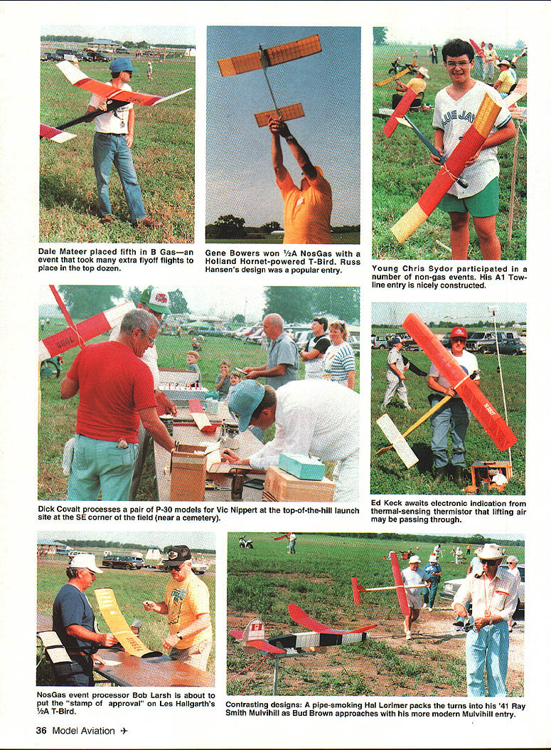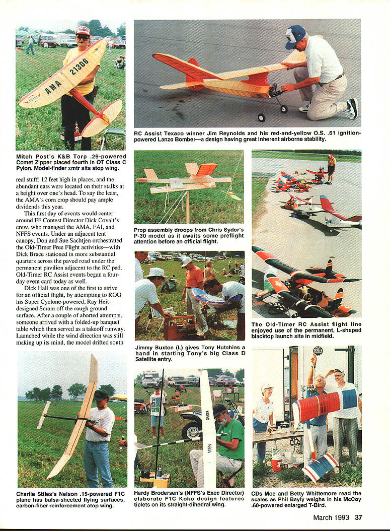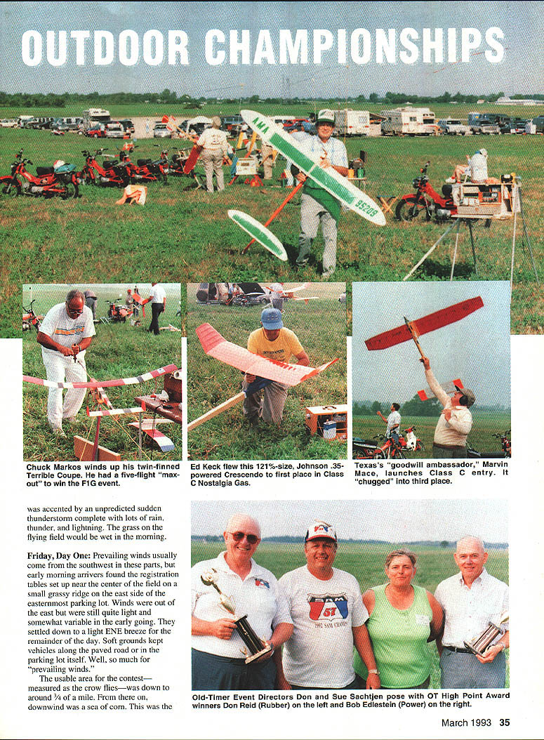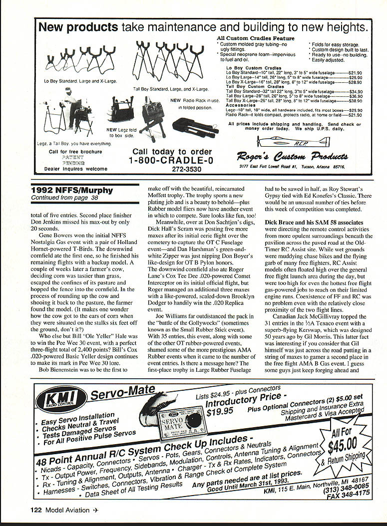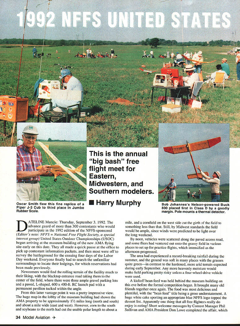 This annual big bash free flight meet Eastern Midwestern Southern modelers Oscar Smith flew fine replica Piper J-3 Cub third place Jumbo Rubber Scale U Harry Murphy Ob Joflanness Nelson-powered Buck 800 placed first Class D goodly margin Pole mounts thermal detector DATELINE Muncie Thursday September 3 1992 advance guard 300 contestants would participate 1992 edition NFFS-sponsored Editors note NFFS onal Free Flight Society special interest group United States Outdoor Championships USOC began arriving museum building new AMA flying site early date made quick pause office pick up contestant information packets off survey battleground ensuing four days Labor Day weekend Everyone finally search unfamiliar surroundings locate lodgings reservations made previously Newcomers would find rolling terrain facility much liking blacktop entrance road taking center field three ample gravel parking lots paved L-shaped 600 x 400-ft RC launch pad permanent pavilion tucked within angle latter vantage point pretty impressive view huge map lobby museum building shown AMA property approximately 11/2 miles long north south about mile wide east west However corn south soybeans north cut usable polar length about mile cornfield west side cut girth field something less Still Midwest standards field would ample since winds predicted light over long weekend noon vehicles scattered along paved access road some fliers ventured out onto grassy field various places set up practice flights intensified afternoon progressed area experienced record-breaking rainfall during summer ground soft places grasses quite greenin contrast hardened arid terrain expected during early September Any heavenly moisture would make field parking pretty risky unless four-wheel-drive vehicle used kickoff bean feed held behind museum building eve before formal competition began brought old friends together once again food delicious plentiful bean feed title being gross understatement huge white cake sporting appropriate blue NEFS logo topped dessert list Apparently thing free fighters really enjoy eating Short welcome messages Contest Manager Phil Sullivan AMA President Don Lowe completed affair 34 Model Aviation CK M8K0S winas up nis Iwin II1U Terrible Coupe five-flight max out win FiG event Keck flew 121%-size Johnson 35powered Crescendo first place Class C Nostalgia Gas Texass goodwill ambassador Marvin Mace launches Class C entry chugged third place accented unpredicted sudden thunderstorm complete lots rain thunder lightning grass flying field would wet morning Friday Day Prevailing winds usually come southwest parts early morning arrivers found registration tables set up near center field small grassy ridge east side eastemmost parking lot Winds out east still quite light somewhat variable early going settled down light ENE breeze remainder day Soft grounds kept vehicles along paved road parking lot itself Well much prevailing winds usable area contest measured crow flieswas down around downwind sea corn March 1993 35 Old-Timer Event Directors Don Sue sachtjen pose witn OT High Point Award winners Don Reid Rubber left Bob Edlestein Power right 36 Model Aviation Mateer placed fifth B GasanGene Bowers won 1/2A NosGas event took extra flyoff flights toHolland Hornet-powered T-Bird Russ place top dozenHansens design popular entry Young Chris Sydor participated number non-gas events Al Towline entry nicely constructed Dick Covalt processes pair P-30 models Vic Nippert top-of-the-hill launch site SE corner field near cemetery Ed Keck awaits electronic indication thermal-sensing thermistor lifting air may passing through NosGas event processor Bob Larsh about put stamp approval Les HallgarthsContrasting designs pipe-smoking Hal Lorimer packs turns 41 Ray 1/2A T-BirdSmith Mulvihill Bud Brown approaches modern Mulvihill entry real stuff 12 feet high places abundant ears located stalks height over ones head say least AMAs corn crop should pay ample dividends year first day events would center around FF Contest Director Dick Covalt s crew managed AMA FAI NFFS events Under adjacent tent canopy Don Sue Sachtjen orchestrated Old-Timer Free flight activitieswith Dick Brace stationed substantial quarters across paved road under permanent pavilion adjacent RC pad Old-Timer RC Assist events began fourday event card today well Dick Hall first strive official flight attempting ROG Super Cyclone-powered Ray Heit designed Scram off rough ground surface After couple aborted attempts someone arrived folded-up banquet table served takeoff runway Launched wind direction still making up its mind model drifted south March 1993 37 Mitch Posts K&B Tarp 29-powered Comet Zipper placed fourth OT Class C Pylon Model-finder xmtr sits atop wing RC Assist Texaco winner Jim Reynolds red-and-yellow OS 61 ignitionpowered Lanzo Bombera design having great inherent airborne stability Prop assembly droops Chris Sydors P-30 model awaits some preflight attention before official flight Jimmy Buxton L gives Tony Hutchins hand starting Tonys big Class D Satellite entry Old-Timer RC Assist flight line enjoyed use permanent L-shaped blacktop launch site midfield Charlie Stiless Nelson 15-powered FiC plane has balsa-sheeted flying surfaces carbon-fiber reinforcement atop wing Hardy urodersens INI-I-s Exec uireciorj CDs Moe Betty Whittemore read elaborate Fl C Koko design features scales Phil Bayly weighs McCoy tiplets its straight-dihedral wing 60-powered enlarged T-Bird eventually DTed over cemetery southeast corner field Dick later stated heretofore DTed models safely between trees houses occasions never between two tombstones knowledge model invade sanctity cemetery remainder week run string flyoff maxes make award list B Gas top 14 contestants logged basic three maxes good-natured Texan Marvin Mace tallied 14 maxes before dropping 15th attempt Marvins Pilfered Pearl derivative bested Gil Morriss ageless Toothpicks about six maxes rest pack grouped much closer behind Gil Fred Blom e