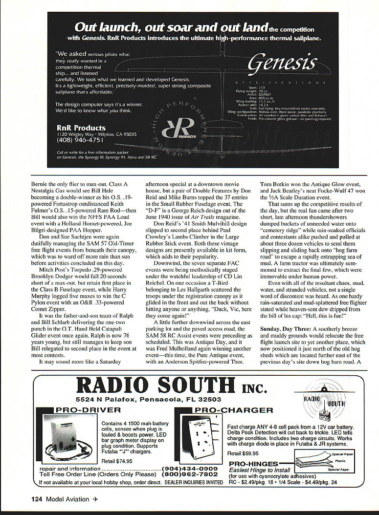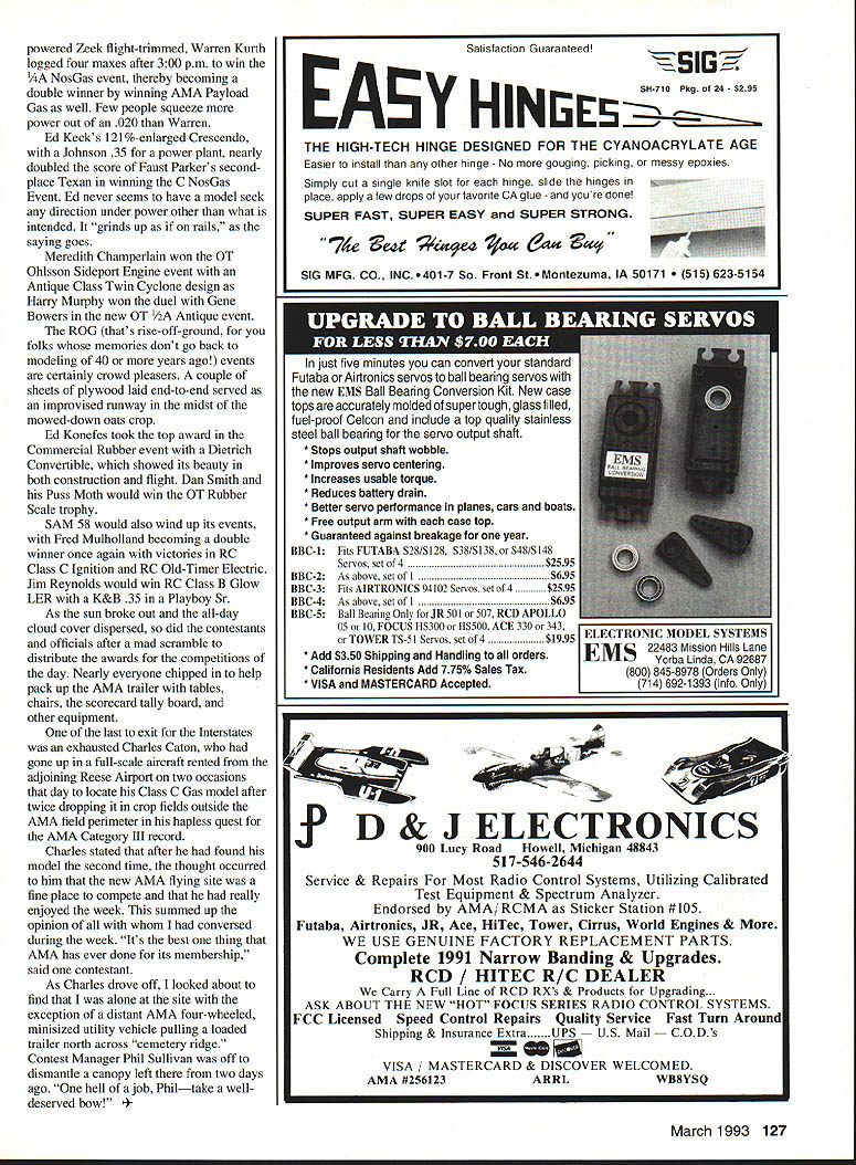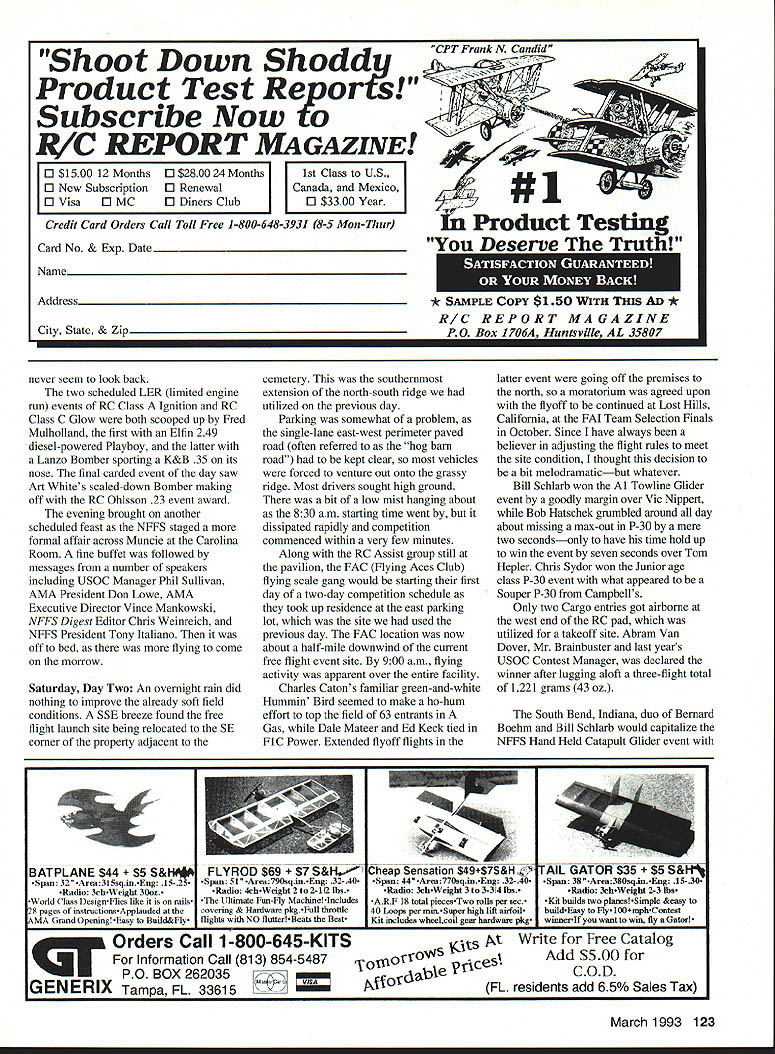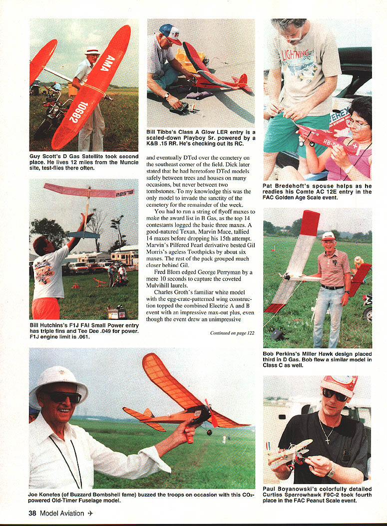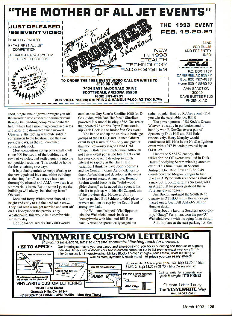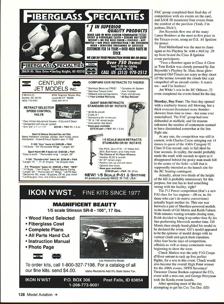 This annual big bash free flight meet Eastern Midwestern Southern modelers Oscar Smith flew fine replica Piper J-3 Cub third place Jumbo Rubber Scale U Harry Murphy Ob Joflanness Nelson-powered Buck 800 placed first Class D goodly margin Pole mounts thermal detector DATELINE Muncie Thursday September 3 1992 advance guard 300 contestants would participate 1992 edition NFFS-sponsored Editors note NFFS onal Free Flight Society special interest group United States Outdoor Championships USOC began arriving museum building new AMA flying site early date made quick pause office pick up contestant information packets off survey battleground ensuing four days Labor Day weekend Everyone finally search unfamiliar surroundings locate lodgings reservations made previously Newcomers would find rolling terrain facility much liking blacktop entrance road taking center field three ample gravel parking lots paved L-shaped 600 x 400-ft RC launch pad permanent pavilion tucked within angle latter vantage point pretty impressive view huge map lobby museum building shown AMA property approximately 11/2 miles long north south about mile wide east west However corn south soybeans north cut usable polar length about mile cornfield west side cut girth field something less Still Midwest standards field would ample since winds predicted light over long weekend noon vehicles scattered along paved access road some fliers ventured out onto grassy field various places set up practice flights intensified afternoon progressed area experienced record-breaking rainfall during summer ground soft places grasses quite greenin contrast hardened arid terrain expected during early September Any heavenly moisture would make field parking pretty risky unless four-wheel-drive vehicle used kickoff bean feed held behind museum building eve before formal competition began brought old friends together once again food delicious plentiful bean feed title being gross understatement huge white cake sporting appropriate blue NEFS logo topped dessert list Apparently thing free fighters really enjoy eating Short welcome messages Contest Manager Phil Sullivan AMA President Don Lowe completed affair 34 Model Aviation CK M8K0S winas up nis Iwin II1U Terrible Coupe five-flight max out win FiG event Keck flew 121%-size Johnson 35powered Crescendo first place Class C Nostalgia Gas Texass goodwill ambassador Marvin Mace launches Class C entry chugged third place accented unpredicted sudden thunderstorm complete lots rain thunder lightning grass flying field would wet morning Friday Day Prevailing winds usually come southwest parts early morning arrivers found registration tables set up near center field small grassy ridge east side eastemmost parking lot Winds out east still quite light somewhat variable early going settled down light ENE breeze remainder day Soft grounds kept vehicles along paved road parking lot itself Well much prevailing winds usable area contest measured crow flieswas down around downwind sea corn March 1993 35 Old-Timer Event Directors Don Sue sachtjen pose witn OT High Point Award winners Don Reid Rubber left Bob Edlestein Power right 36 Model Aviation Mateer placed fifth B GasanGene Bowers won 1/2A NosGas event took extra flyoff flights toHolland Hornet-powered T-Bird Russ place top dozenHansens design popular entry Young Chris Sydor participated number non-gas events Al Towline entry nicely constructed Dick Covalt processes pair P-30 models Vic Nippert top-of-the-hill launch site SE corner field near cemetery Ed Keck awaits electronic indication thermal-sensing thermistor lifting air may passing through NosGas event processor Bob Larsh about put stamp approval Les HallgarthsContrasting designs pipe-smoking Hal Lorimer packs turns 41 Ray 1/2A T-BirdSmith Mulvihill Bud Brown approaches modern Mulvihill entry real stuff 12 feet high places abundant ears located stalks height over ones head say least AMAs corn crop should pay ample dividends year first day events would center around FF Contest Director Dick Covalt s crew managed AMA FAI NFFS events Under adjacent tent canopy Don Sue Sachtjen orchestrated Old-Timer Free flight activitieswith Dick Brace stationed substantial quarters across paved road under permanent pavilion adjacent RC pad Old-Timer RC Assist events began fourday event card today well Dick Hall first strive official flight attempting ROG Super Cyclone-powered Ray Heit designed Scram off rough ground surface After couple aborted attempts someone arrived folded-up banquet table served takeoff runway Launched wind direction still making up its mind model drifted south March 1993 37 Mitch Posts K&B Tarp 29-powered Comet Zipper placed fourth OT Class C Pylon Model-finder xmtr sits atop wing RC Assist Texaco winner Jim Reynolds red-and-yellow OS 61 ignitionpowered Lanzo Bombera design having great inherent airborne stability Prop assembly droops Chris Sydors P-30 model awaits some preflight attention before official flight Jimmy Buxton L gives Tony Hutchins hand starting Tonys big Class D Satellite entry Old-Timer RC Assist flight line enjoyed use permanent L-shaped blacktop launch site midfield Charlie Stiless Nelson 15-powered FiC plane has balsa-sheeted flying surfaces carbon-fiber reinforcement atop wing Hardy urodersens INI-I-s Exec uireciorj CDs Moe Betty Whittemore read elaborate Fl C Koko design features scales Phil Bayly weighs McCoy tiplets its straight-dihedral wing 60-powered enlarged T-Bird eventually DTed over cemetery southeast corner field Dick later stated heretofore DTed models safely between trees houses occasions never between two tombstones knowledge model invade sanctity cemetery remainder week run string flyoff maxes make award list B Gas top 14 contestants logged basic three maxes good-natured Texan Marvin Mace tallied 14 maxes before dropping 15th attempt Marvins Pilfered Pearl derivative bested Gil Morriss ageless Toothpicks about six maxes rest pack grouped much closer behind Gil Fred Blom e