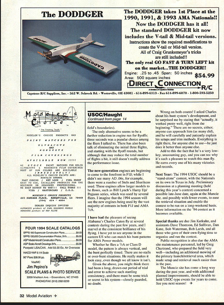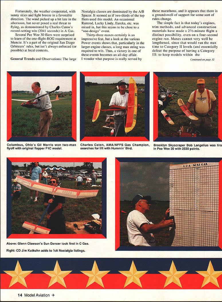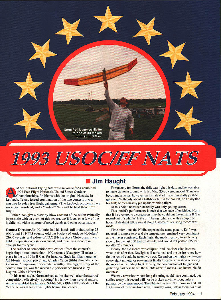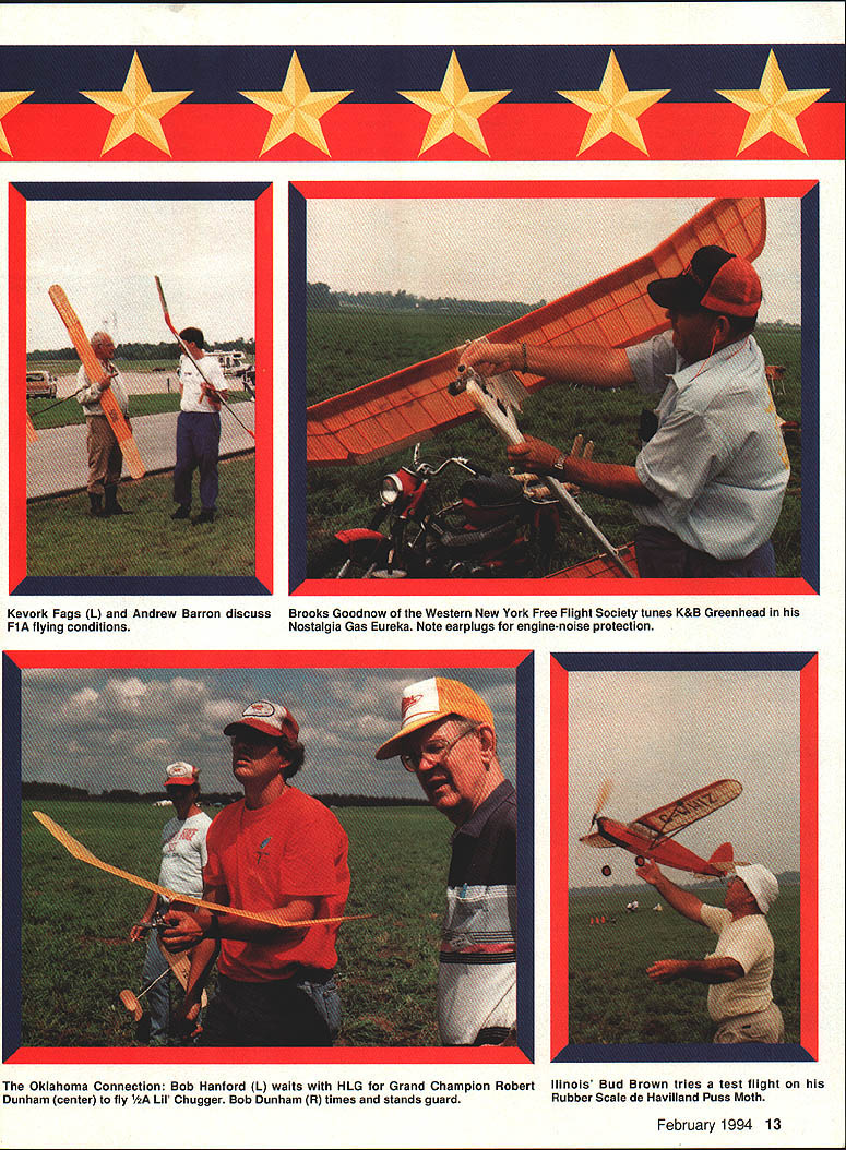 U Jim Haught MAs National Flying Site venue combined 1993 Free Flight Nationals/United States Outdoor hampionships Problems original Nats site LuDOOCK Texas forced combination two contests massive five-day free flight gathering Lubbock problems have since resolved unified Nats will held next July Rather give blow-by-blow account action virtually impossible event scope well focus few highlights mixture noted trends other observations Contest Director Jim Kutkuhn hands full orchestrating 25 AMA 11 NFFS events Add Society Antique Modelers SAM events dose FAC Flying Aces Club Scale events held separate contests downwind enough everyone caliber competition evident contests beginning took 1000 seconds Category III rules place top 10 B Gas instance Such familiar names Gil Morris second place Charles Caton fifth abounded see Focus Competition detailed results biggest story contest though incredible performance turned Dayton Ohios Norm Poti usual style Norm arrived site well after start competition effectively spotting fellow fliers several maxes As assembled familiar Niblite 585 1992 NFFS Model Year least five flights behind leaders Fortunately Norm drift light day able make up some ground Max 25-powered model Time becoming factor however late start made him really push get about half-hour left contest finally tied first hastily put up winning flight point however really getting started models performance such have often kidded Norm ever got contest time could put existing B Gas record out sight drift being light couple hours daylight left run Doug Galbrcaths existing record made Time after time Niblite repeated same pattern Drift reduced ahnost zero temperature remained very consistent maxes continued flight model seemed settle very slowly last 150 feet altitude would DT perhaps 75 feet up after 2 minutes Finally old record eclipsed discussion became what after Daylight still remained desire see far record could taken won out flights wentone eight minutes sountil finally became question seeing model fading light Finally combination fatigue gathering darkness halted Niblite after 33 maxesan incredible 80 minutes may never know long string could have continued suffice say record will broken anytime soon unless perhaps same model Niblite has dominant Cat III B Gas model some time now usually wins unless pilot February 1994 11 error late start Look future MA construction article somewhat surprising no flyoff FlA won former team member Chuck Markos bit minute over Andrew Barron overcast skies moderate temperatures made thermals bit spotty towline height After some years absence old Tulsa Glue Dobbers Towline trophy relocated brought Muncie club member Bob Dunham Chucks name will inscribed trophy will reside Muncie along its sister trophy first place HLG Yet another record performance Day William Reitdorfs 1440 Electric B easily surpassed Don Hughes 596 Bob Bienensteins Bandit MA November 1993 made two wins row Moffett Bob Hatscheks BABU again coming second Unsettled weather conditions played havoc flying over next two days competition resulted some unusual and/or controversial flying situations on-again off-again rain wind led postponement FlC flyoff between Norm Poti Gil Morris mutual agreement waited out weather better chance fair flyoff would provide unnecessary risk models Wind rain Friday afternoon led CD Jim Kutkuhn unusual decision suspend cancel suspend flying mid-afternoon number fliers upset decision resume Fridays events Saturday morning flying strategy based Fridays conditions ironic twist couple hours later conditions improved point FlC flyoff held near-calm conditions Gil Morris flapper easily defeated Norm Poti s conventional model bonus full-length flight settle issue very light drift kept models well within perimeter field Sure enough Saturday morning dawned bright sunny results several Fridays events changed fliers hastily ran max strings better conditions Glenn Clawson among benefitted early-morning weather take C Gas edging Texas Marvin Mace also problem couple incredibly thoughtless fliers threatening ruin contest stupidly riding chase bikes through downwind neighbors garden An elderly woman property owner tears result idiots behavior took some serious work AMA Public Relations led Jay Mealy defuse situation collection taken up other fliers pay damage horse already out bam time type disgraceful behavior has no place free flight first such incident has jeopardized lost good flying field mentality thinks model important someones livelihood crops gardens etc also has no place hobby Saturday evening filled NFFS Symposium banquet NFFS Hall Fame awards presented Hany Murphy Hardy Brodersen rubber flier Jim OReilly gave informative talk Symposium paper Bruce Kimball announced Ten Models Year various NFFS officers addressed current state organization free flight general Sunday brought out mini-FAI events F1J FlH well Gas 1/2A Nostalgia two 30 events P-30 Pee Wee 30 Thus go-home-day just full other contest days Emmett Holt Virginia Beach VA truly enjoys free flight Hes well protected Dale Mateer Centerville Ohio launches original B C starts Johnson-powered Spacerdominant design classmodel Tenth place 1012 seconds 12 Model Aviation rk Fags 1 Andrew Barron discuss FlA flying conditions Brooks Goodnow Western New York Free Flight Society tunes K&B Greenhead Nostalgia Gas Eureka Note earplugs engine-noise protection Oklahoma Connection Bob Hanford L waits HLG Grand Champion Robert Ilinois Bud Brown tries test flight Dunham center fly 1/2A Lii Chugger Bob Dunham R times stands guard Rubber Scale de Havilland Puss Moth February 1994 13 Fortunately weather cooperated sunny skies light breeze favorable direction wind picked up bit late afternoon never posed real threat flying demonstrated Charles Catons record-setting win 2041 seconds Gas Several Pee Wee 30 fliers surprised learn one-flight-ROG requirement Muncie Its part original San Diego Orbiteers rules isnt always enforced possible local con