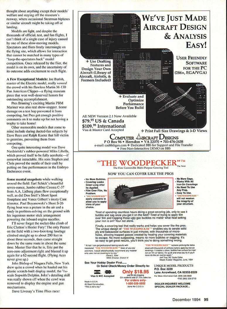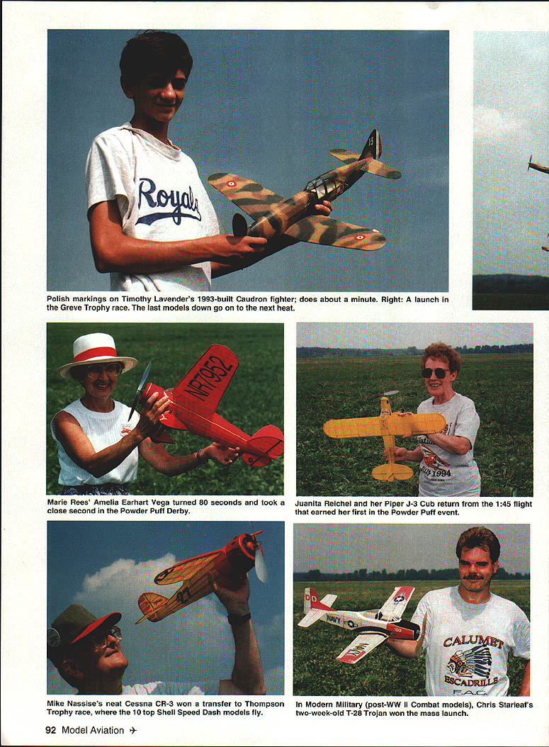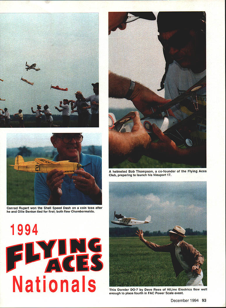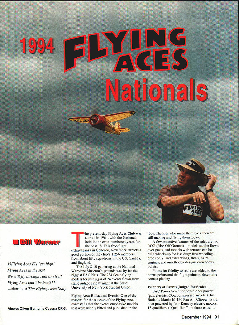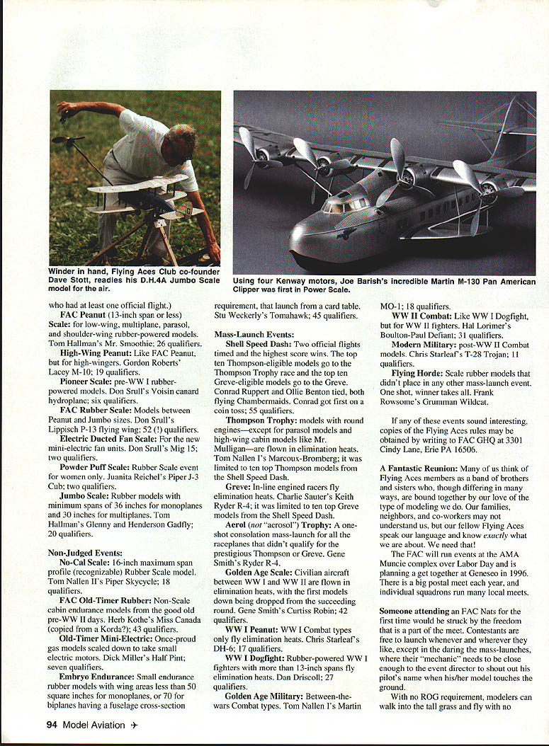 ~Flying Aces Fly em high Flying Aces sky will fly through rain sleet Flying Aces cant beat~ chorus Flying Aces Song Above Oliver Bentons Cessna CR-3 present-day Flying Aces Club started 1964 Nationals held even-numbered years past 18 free-flight extravaganza Geneseo New York attracts good portion clubs 1256 members about fifty squadrons US Canada England July 8-10 gathering National Warplane Museums grounds far biggest FAC Nats 234 Scale flying models just eight 24 events flown static judged Friday night State University New York Student Union Flying Aces Rules Events reasons success Flying Aces contests events emphasize models widely kitted published 30s kids made back still making flying today few attractive features rules no ROG Rise Off Groundmodels can flown over grass models retracts can built wheels-up less drag free-wheeling props extra wings floats extra engines unorthodox designs earn bonus points Points fidelity scale added bonus points flight points determine contest placing Winners Events Judged Scale FAC Power Scale non-rubber power gas electric C02 compressed air etc Joe Barishs Martin M-130 Pan Am Clipper flying boat powered four Kenway electric motors 15 qualifiers Qualifiers entrants December 1994 91 Mike Nassises neat Cessna CR-3 won transfer Thompson Trophy race 10 top Shell Speed Dash models fly Modern Military post-WW II Combat models Chris Starleafs two-week-old T-28 Trojan won mass launch 92 Model Aviation sh markings Timothy Lavenders 1993-built Caudron fighter does about minute Right launch Greve Trophy race last models down go next heat Marie Rees Amelia Earhart Vega turned 80 seconds took aJuanita Helcflel fler Piper J-3 Cub return trom tfle 145 tligflt close second Powder Puff Derbythat earned first Powder Puff event 1994 Nationals Dornier DO-7 Dave Rees HiLine Electrics flew well enough place fourth FAC Power Scale event December 1994 93 helmeted Bob Thompson co-founder Flying Aces Club preparing launch Nieuport 17 Conrad Rupert won Shell Speed Dash coin toss after Ollie Benton tied first both flew Chambermaids least official flight FAC Peanut 13-inch span less Scale for low-wing multiplane parasol shoulder-wing rubber-powered models Tom Hallmans Mr Smoothie 26 qualifiers High-Wing Peanut Like FAC Peanut high-wingers Gordon Roberts Lacey M-l0 19 qualifiers Pioneer Scale pre-WW rubberpowered models Don Srulls Voisin canard hydroplane six qualifiers FAC Rubber Scale Models between Peanut Jumbo sizes Don Srulls Lippisch P-13 flying wing 52 ifiers Electric Ducted Fan Scale new mini-electric fan units Don Srulls Mig 15 two qualifiers Powder Puff Scale Rubber Scale event women Juanita Reichels Piper J-3 Cub two qualifiers Jumbo Scale Rubber models minimum spans 36 inches monoplanes 30 inches multiplanes Tom Hallmans Glenny Henderson Gadfly 20 qualifiers Non-Judged Events No-Cal Scale 16-inch maximum span profile recognizable Rubber Scale model Tom Nallen IIs Piper Skycycle 18 qualifiers FAC Old-Timer Rubber Non-Scale cabin endurance models good old pre-WW II days Herb Kothes Miss Canada copied Korda 43 qualifiers Old-Timer Mini-Electric Once-proud gas models scaled down take small electric motors Dick Millers Half Pint seven qualifiers Embryo Endurance Small endurance rubber models wing areas less 50 square inches monoplanes 70 biplanes having fuselage cross-section requirement launch card table Stu Weckerlys Tomahawk 45 qualifiers Mass-Launch Events Shell Speed Dash Two official flights timed highest score wins top ten Thompson-eligible models go Thompson Trophy race top ten Greve-eligible models go Greve Conrad Ruppert Ollie Benton tied both flying Chambermaids Conrad got first coin toss 55 qualifiers Thompson Trophy models round enginesexcept parasol models high-wing cabin models like Mr Mulliganare flown elimination heats Tom Nallen Marcoux-Bromberg limited ten top Thompson models Shell Speed Dash Greve In-line engined racers fly elimination heats Charlie Sauters Keith Ryder R-4 limited ten top Greve models Shell Speed Dash Aerol aerosol Trophy oneshot consolation mass-launch raceplanes didnt qualify prestigious Thompson Greve Gene Smiths Ryder R-4 Golden Age Scale Civilian aircraft between WW WW II flown elimination heats first models down being dropped succeeding round Gene Smiths Curtiss Robin 42 qualifiers WW Peanut WW Combat types fly elimination heats Chris Starleafs DH-6 17 qualifiers WW Dogfight Rubber-powered WW fighters 13-inch spans fly elimination heats Dan Driscoll 27 qualifiers Golden Age Military Between-thewars Combat types Tom Nallen Martin MO-i 18 qualifiers WW II Combat Like WW Dogfight WW II fighters Hal Lorimers Boulton-Paul Defiant 31 qualifiers Modern Military post-WW II Combat models Chris Starleafs T-28 Trojan 11 qualifiers Flying Horde Scale rubber models didnt place other mass-launch event shot winner takes Frank Rowsome s Grumman Wildcat events sound interesting copies Flying Aces rules may obtained writing FAC GHQ 3301 Cindy Lane Erie PA 16506 Fantastic Reunion us think flying Aces members band brothers sisters though differing ways bound together love type modeling families neighbors co-workers may understand us fellow flying Aces speak language know exactly what about need FAC will run events AMA Muncie complex over Labor Day planning get together Geneseo 1996 big postal meet year individual squadrons run local meets Someone attending FAC Nats first time would struck freedom part meet Contestants free launch whenever wherever like except daring mass-launches mechanic needs close enough event director shout out pilots name his/her model touches ground no ROG requirement modelers can walk tall grass fly no 94 Model Aviation l air ng Aces co-founder DH4A Jumbo Scale Using four Kenway lulutura Jue ariwi incruoiwu marlin m-iiu ran american Clipper first Power Scale thought about anything except models welfare staying off museums runway occasional Stearman biplanes similar aircraft might taking off landing Models light despite thousand