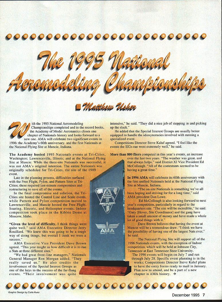 GGGGGGGGGGGGQ 7 fri wv Academy hosted 1995 N Washington Lawrenceville hut Site Muncie thr AMAs original inte originally scheduled event Late planrn Free Flight Cities requit restructuring sa final Cities site Pattern Lawrenceville Soaring Eleci competition Moscow Idaho Given level quite well s Rouillard way doing success AMA Executive agreed year Nats three differe great fruliL General Manager Ron really saved us involvement Special Interest keys success tar events involvement d years events increase ars weather great District XI Vice President Ed e contestants seemed its 60th anniversary National Flying something weve long time said looking forward next regard incredible said gang have have made whole having event draw think have largest Nats ever Site will support the exception Indoor held Johnson City ee State University oegin July 7 run ecific event planning itions Director Steve Kaluf plans IiLry forms ready mail January w attend part new AMA history GQQQQQ~QQ GaphcDesgnbyCa aKunz December 1995 7 ith 1995 National Aeromodeling Championships completed record books Academy Model Aeronautics closes chapter Nationals history looks forward new AMA will celebrate two significant events 1996 Academys 60th anniversary first Natio National Flying Site Muncie Indiana intensive said did nice job stepping picking up slack added Special Interest Groups usually better equi d handle idiosyncracies involved running sptd event os Director Steve Kaluf agreed feel like ran went extremely well said