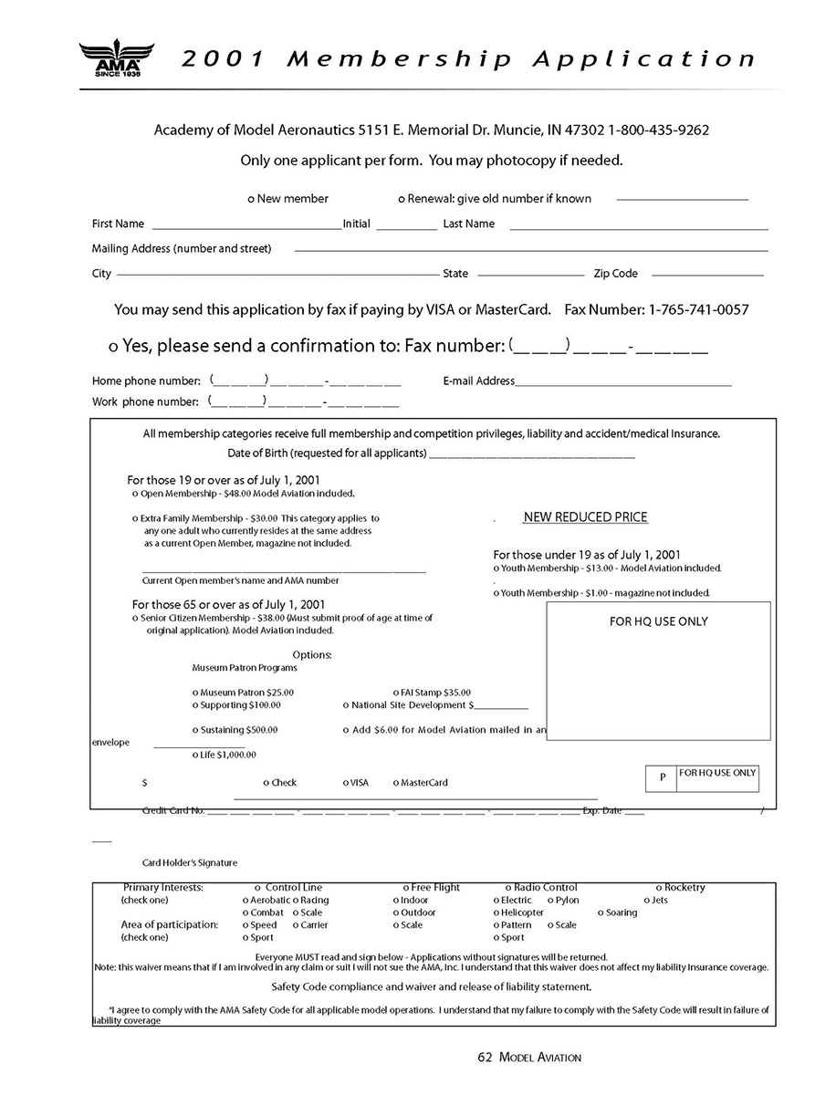 o Sustaining $500.00 o Add $6.00 for Model Aviation mailed in an
