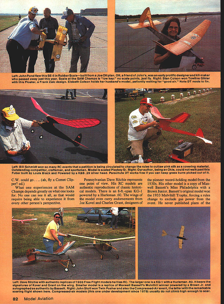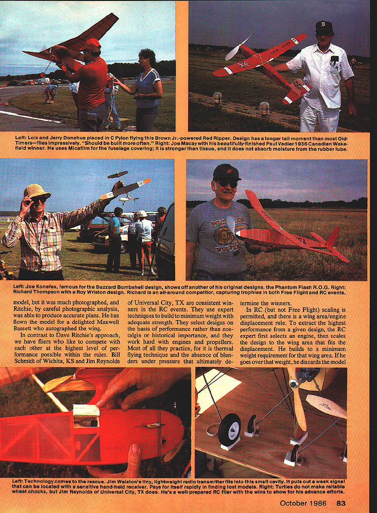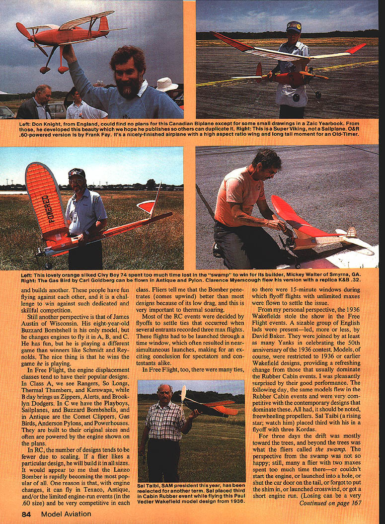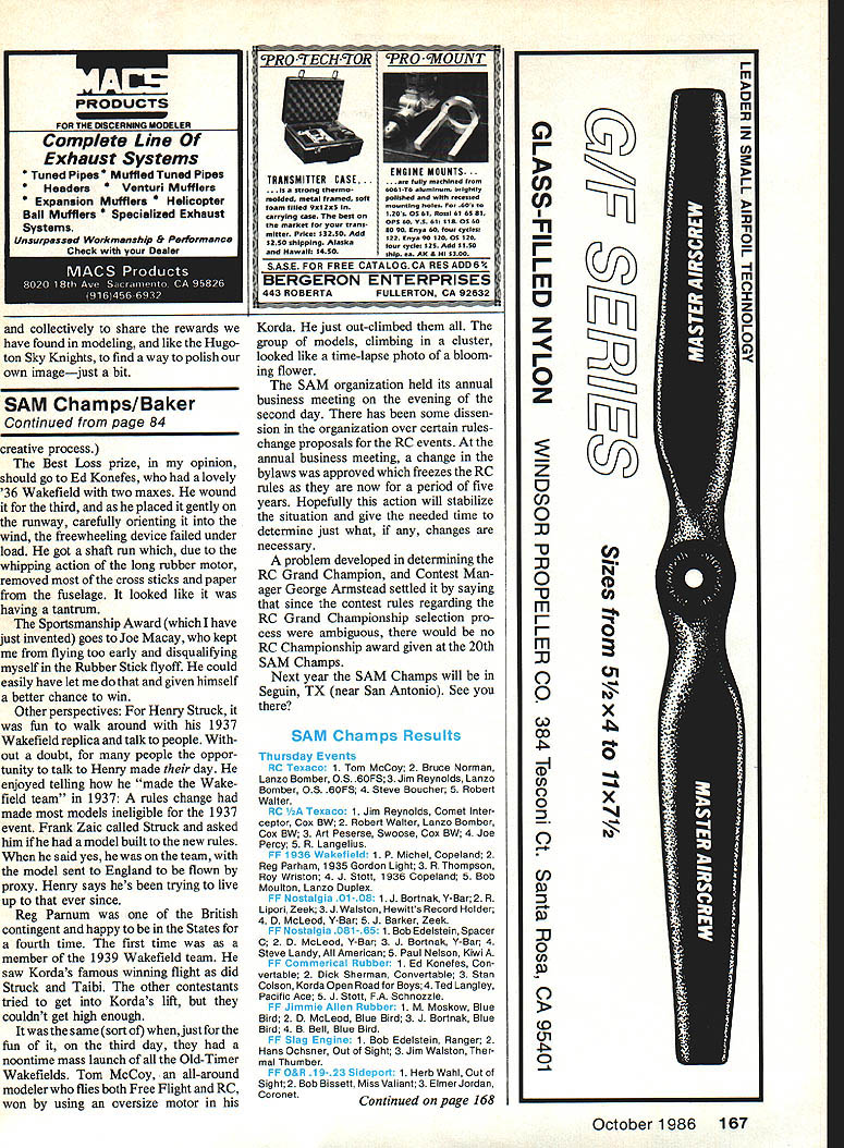 NO OCR TEXT sad Pargrass b ijan flurd-holdir VWWmodol rnnnductkiss see ia tiuriem g able touven carrymtflc personsmndCiblisheof autographad uwuuihentu u Iuuuu ni iunr guwun Twin ru soaring flight shown her. umpmased-uur mod. under asi NO OCR TEXT rigmes u tine man winners ldS nice thing aying e BC CSfl and/or limitec engine-run evenis m inc ni 60 size very competitive V 84 Model Aviation irec tdtc hi1I U ml p unour Ref leld mourn mc MB th4 ialpei 1 "ad tnira mm nisi ordas ddft PRODUCTS FOR tUE flitfCflSiStifl WInCE Cm Complete Line Exhaust Systems * Tuned Pipes led Tuned Pipes * Headers Venturi Mufflers Expansion Mufflers copter Ball Mufflers ialized Exhaust Systems Unsurpasf WakaesasChiI5 Padomance collectively share rewards have found modeling like Hugoton Sky Knights find way polish own imagejust bit SAM Champs/Baker Continued page 84 reative process Best Loss prize opinion hould go Ed Konefes lovely 36 Wakefield two maxes wound t third placed gently runway carefully orienting ivind freewheeling device failed under oad got shaft run due vhipping action long rubber motor emoved cross sticks paper rrom fuselage looked like riaving tantrum Sportsmanship Award have just invented goes Joe Macay kept flying too early disqualifying myself Rubber Stick flyoff could easily have let given himself better chance win Other perspectives Henry Struck fun walk around 1937 Wakefield replica talk people out doubt people oppor Lunity talk Henry made day enjoyed telling made Wake field team 1937 rules change made models ineligible 1937 event Frank Zaic called Struck asked him model built new rules said yes team model sent England flown proxy Henry says hes trying live up ever since Reg Parnum British contingent happy States fourth time first time member 1939 Wakefield team saw Kordas famous winning flight did Struck Taibi other contestants tried get Kordas lift couldnt get high enough same sort whenjust fun third day noontime mass launch Old-Timer Wakefields Tom McCoy all-around modeler flies both Free Flight RC won using oversize motor Korda just out-climbed group models climbing cluster looked like time-lapse photo bloom ing flower SAM organization held its annual business meeting evening second day has some dissen sion organization over certain ruleschange proposals RC events annual business meeting change bylaws approved freezes RC rules now period five years Hopefully action will stabilize situation give needed time determine just what changes necessary problem developed determining RC Grand Champion Contest Man ager George Armstead settled saying since contest rules regarding RC Grand Championship selection pro cess ambiguous would no RC Championship award given 20th SAM Champs Next year SAM Champs will Seguin TX near San Antonio See SAM Cnamps Resul s Thursday Events tIC acm 1 Tom McCoy 2 Bruce Norman Lanzo Bomber OS 6OFS 3 Jim Reynolds Lanzo Bomber OS 6OFS 4 Steve Boucher 5 Robert Walter RC /A Texaco 1 Jim Reynolds Comet Inter ceptor Cox 8W 2 Robert Walter Lanzo Bomber Cox BW 3 Art Peserse Swoose Cox 8W 4 Joe Percy 5 R Langelius F 1936 Wa etild 1 P Michel Copeland 2 Reg Parham 1935 Gordon Light 3 R Thompson Roy Wriston 4 J Stott 1936 Copeland 5 Bob Moulton Lanzo Duplex OF Nostalgia 01 -08 1 J Bortnak V-Bar 2 R Lipori Zeek 3 J Walaton Hewitts Record Holder 4 0 McLeod V-Bar 5 J Barker Zeek FF Nostalgia 081 51 Bob Edelatein Spacer C 2 D McLeod V-Bar 3 J Bortnak V-Bar 4 Steve Landy American 5 Paul Nelson Kiwi FF C miner ai 1 Ed Konefes Con vertable 2 Dick Sherman Convertable 3 Stan Colson Korda Open Road Boys 4 Ted Langley Pacitic Ace 5 J Stott FA Schnozzle FF Jimmie Atlen obe 1 M Moskow Blue Bird 2 0 McLeod Blue Bird 3 J Bortnsk Blue Bird 4 B Bell Blue Bird FF Slag Engine 1 Bob Edelstein Ranger 2 Hans Ochsner Out Sight 3 Jim Walston Ther mal Thumber - 0&R1 Herb WahIOutof Sight 2 Bob Bissett Miss Valiant 3 Elmer Jordan CoronetContinued page 168 October 1986 167 PRO TECH-TOR PRO MOUNT SASE FOR FREE CATALOGCA RESADD6 BERGERON ENTERPRISES 443 ROBERTAFULLERTON CA 92632 tNliIN MUUNI TRANSMITTER CASE. y machined . strong thermo6061T6 aluminum brightly molded metal framed softpolIshed rucattad foam filled 9e12a5 inmounting holes 60s tO carrying case best on120s 0S61 11051 61 6581 market transOPS 60 V5 65 siC 0560 mitter Pritet 53250 Add80 90 Cty 60 four cycles S2tO shipplrtg Alaska$22 Coy 90 12001 120 four cyciet 125 Add 5150 Hawailt 5450shin Ca AK 300 ziJ Lzu1 N CD 0 x sr 0 x N C C, C, 1 F m z 0 z z 0 C 0 -u JJ 0 -u m m 0 Q H CD ci 0 0 C/ 5-4 0 Cl 0 Co U 0 2541 N E 11th Court ano Beach Florida 33062 e 305 941-9119 AVAILABLE FROM LEADING DEALERS AND DISTRUBUTORS flTR1CT Friday Events RC Class C Ignition 1 Joe White Lanzo Bomb er Hornet 2 Bruce Norman Lanzo Bomber 3 Robert Walter Lanzo Bomber Forster 35 4 Jim Reynolds 5 Buck Zehr RC Class 8 Glow 1 Peterse Swoose K&B 29 2 Eut Tileston Lancer Enya 46 3 Bruce Norman Lanzo Bomber Ohlsson 29 4 Ralph Turner 5 Joe Percy RC ClassA Ignition 1 Bill Schmidt PlayboySr Arden 19 2 Eut Tileston Baby Corsair Elfin 249 3 Jim Reynolds Lanzo Bomber Elfin 249 4 Bruce Norman 5 Joe Percy FF ClassACabin Bruno Markiewicz Cab Ruler Arden 19 2 Bob Edeistein So Long Arden 19 3 Elmer Jordan Coronet O&R 23 4 Jim Waiston Cab Ruler Arden 19 5 Mitch Post So Long Hornet 19 FF Class C Pylon 1 Hans Ochsner Gas Champ 2 Mal MacLean Meteor 3 John Bortnak Zipper 4 Mitch Post Zipper Torp 32 5 Jerry Donahue Red Ripper Brown Jr FF 020 Replica Pylon 1 Gene Martha Play boy 2 Martin Schindler Playboy 3 Gerry Donshue Zipper 4 Frank Fay Kerswsp 5 Jim Bocckinfoco Playboy FF 020 Replica Cabin 1 Mike Cook Bomb shell 2 Barney Onotri So Long 3 Blake Oliver So Long 4 Bob Bisset So Long 5 Bob Edeistein So Long FF Cabin Rubber ROG 1 Ray Factor 1939 Korda 2 Jack Phelps 1939 Korda 3 Sal Taibi 1936 Verdiac 4 Stan Colson Korda Joe Macay Lidgard Hi-Ho Large Pylon Glow-Ignition 1 Tom Lucas Playboy Atwood 60 2 Bruno Markiewicz Sail plane O&R 60 3 Woody Bartelt Alert O&R 33 4 Bob Edeistein Playboy O&R 60 5 Ed Rangus Zip