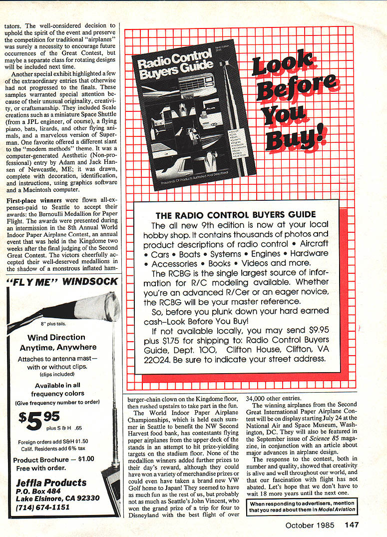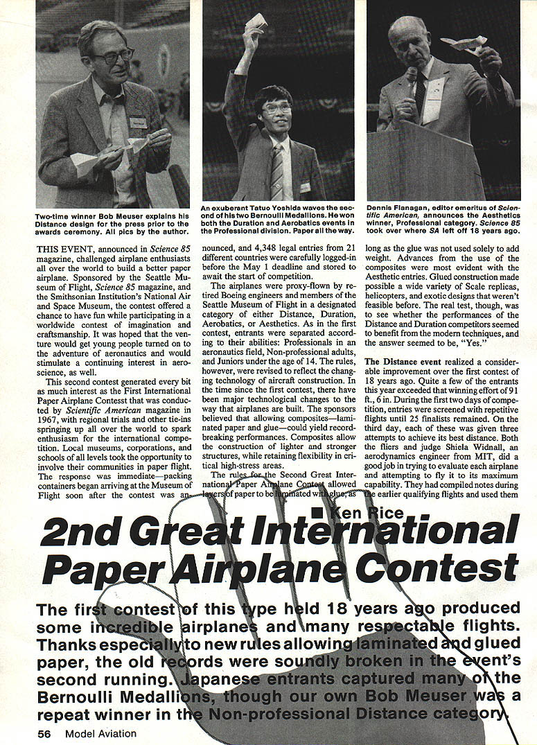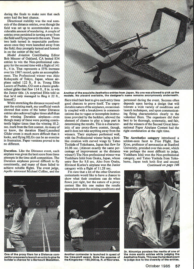 THIS EVENT announced Science 85 nounced 4348 legal entries 21 long glue used solely add magazine challenged airplane enthusiasts different countries carefully logged-in weight Advances use over world build better paper before May 1 deadline stored composites evident airplane Sponsored Seattle Mu- await start competition Aesthetic entries Glued construction made seum Flight Science 85 magazine airplanes proxy-flown re- possible wide variety Scale replicas Smithsonian Institutions National Air tired Boeing engineers members helicopters exotic designs werent Space Museum contest offered Seattle Museum Flight designated feasible before real test though chance have fun participating category either Distance Duration see whether performances worldwide contest imagination Aerobatics Aesthetics As first Distance Duration competitors seemed craftsmanship hoped yen- contest entrants separated accord- benefit modem techniques ture would get young people turned ing abilities Professionals answer seemed Yes adventure aeronautics would aeronautics field Non-professional adults stimulate continuing interest aero- Juniors under age 14 rules DIstance event realized considerscience well however revised reflect chang- able improvement over first contest second contest generated bit ing technology aircraft construction 18 years ago Quite few entrants much interest First International time since first contest have year exceeded winning effort 91 Paper Airplane Contesst conduc- major technological changes ft 6 During first two days compe ted Scientflc American magazine way airplanes built sponsors tition entries screened repetitive 1967 regional trials other tie-ins believed allowing compositeslami- flights until 25 finalists remained springing up over world spark nated paper gluecould yield record- third day given three enthusiasm international compe- breaking performances Composites allow attempts achieve its best distance Both tition Local museums corporations construction lighter stronger fliers judge Shiela Widnall schcols levels tcok opportunity structures retaining flexibility cri- aerodynamics engineer MIT did involve communities paper flight tical high-stress areas gcod job trying evaluate airplane response immediatepacking rul Second Great Inter- attempting fly its maximum containers began arriving Museum nation aper ane C allowed capability compiled notes during Flight scon after contest fpaperto atedw ier qualifying flights used pe h Id 18 years ao produced airpIane r newr esallowiued paper old r sobents second runni e Bernoulli Ma repeat winner ti 56 Model Aviation Two-time winner Bob Meuser explains Distance design press prior awards ceremony pics author An exuberant Tatuo Yoshida waves sec- Dennis Flanagan editor emeritus Scien ond two Bernoulli Medallions lie won tific American announces Aesthetics both Duration Aerobatics events winner Professional category Science 85 Professional division Paper way took over SA left off 18 years ago fi Thanks espe during finals make sure entry best chance Directional stability real nem esis distance entries though field set up accommodate con siderable amount ofwandering couple entries persisted turning away field flying towards seats two both turned respectable perform ances once launched away field promptly turned homedin center turf Model Aviation Contributing Editor Bob Meuser Oakland CA bested 834 entries win Non-professional cate gory second time flight 141 ft 4 represents 55% increase over 1967 record quite accomplish ment Professional winner Akio Kobayashi Tokyo Japan air plane sailed 122 ft 8 Young Eltin Lucero Pueblo CO sent classic gradeschool glider flew 114 ft 8 win Junior title surprised Eltin told us hed managed fling 22 ft himself stretching distance record well past existing mark unofficial watch showed some better Distance entries also achieved highertimes aloftthan winning Duration airplaneseven though posting consis tently higher times winning 102sec mark first contest As us know duration Hand-Launched Glider event much difficult looks flying HLGs can exercise frustration Paper versions proved no different Duration Like Distance event airplane given best score three attempts time-aloft competition Duration airplanes proved difficult fly consistently failed achieve notable flights. event judge Apollo astronaut Michael Collins fliers tried best give entry three good chances prove itself unpre dictable nature airplanes occasional ly coupled breakdown communi cations due vague incomplete instruc tions provided builders allowed element chance play large part determining results character istic proxy-flown contest though does take anything away winners airplanes performed well Professional winner being bird like creation curved wings Tatuo Toshida Yokohama Japan flew 1606 sec Almost exactly same per centage improvement distance winner Non-professional winner Yoshiharu Ishii Osaka Japan entry flew 98 sec Also Osaka Hironori Kurisus airplane won Junior category flight 1128 sec Im sure lot other Duration contestants would like have chance show what creations can flown just right nature proxy contest like makes results dependent upon existing conditions personnel during event Success often depends upon having design will tolerate wide variety conditions launch techniques upon communicat ing flying characteristics clearly volunteer fliers organizers did best thorough systematic fair winners Second Great Inter national Paper Airplane Contest right combination right time Aerobatics category introduced seldom-seen facet Free Flight Ilan Kroo professor aeronautics Stanford University presided over event perhaps difficult judge Yoshiharu Ishii won Non-professional category Tatuo Yoshida Yoko hama Japan took both first second Continued page 146 October 1985 57 Another exquisite Aesthetics entries Japan No allowed pick up models No placard available designers name remains anonymously underneath proxy fliers Distance com petitor preparesto launch entryto gi