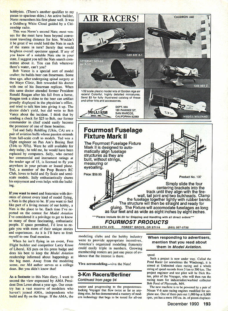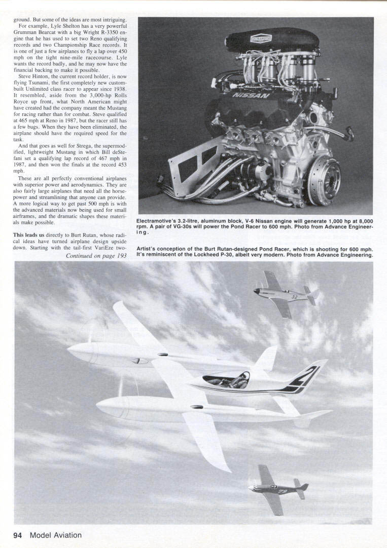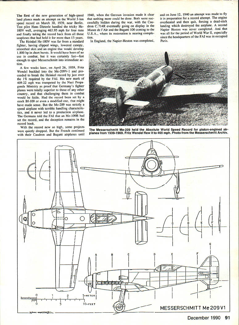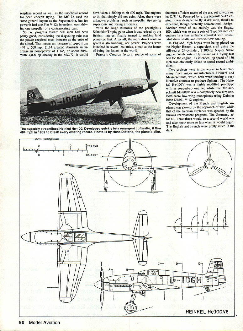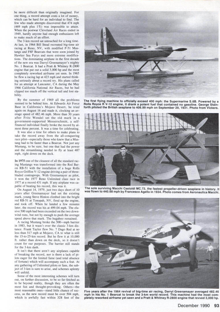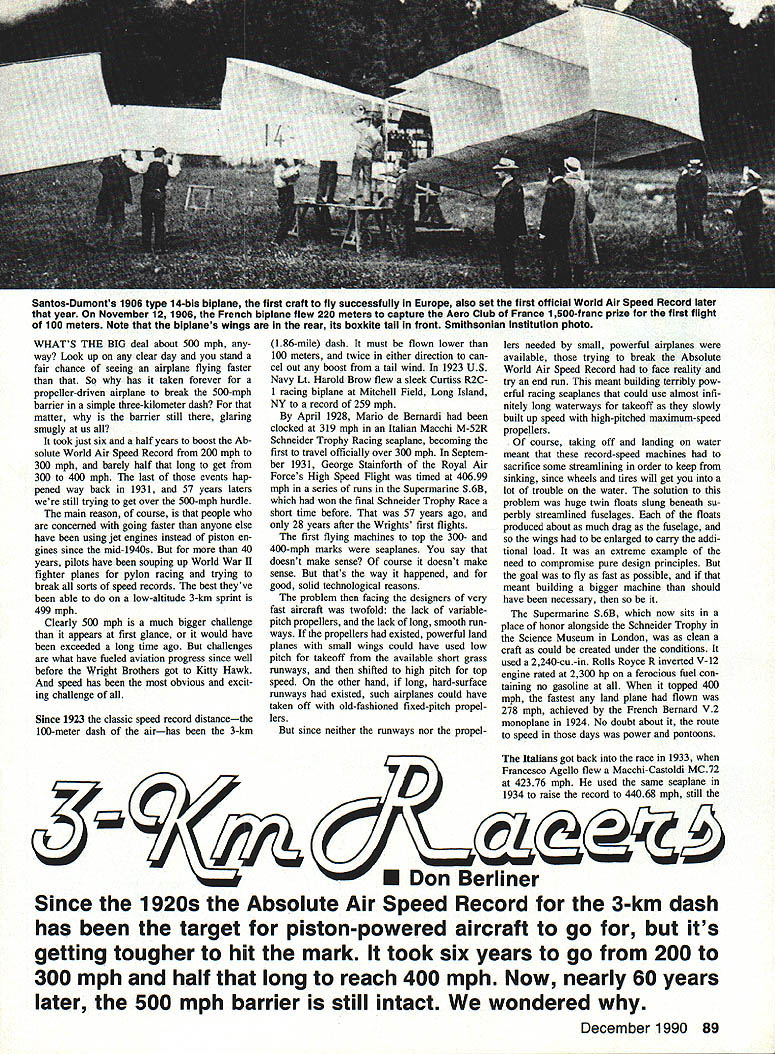 Santos-Dumonts 1906 type 14-bis biplane first craft fly successfully Europe also set first official World Air Speed Record later year November 12 1906 French biplane flew 220 meters capture Aero Club France 1500-franc prize first flight 100 meters Note biplanes wings rear its boxkite tail front Smithsonian InstitutIon photo WHATS THE BIG deal about 500 mph way Look up clear day stand fair chance seeing airplane flying faster So has taken forever propeller-driven airplane break 500-mph barrier simple three-kilometer dash matter barrier still glaring smugly us took just six half years boost Ab solute World Air Speed Record 200 mph 300 mph barely half long get 300 400 mph last events hap pened way back 1931 57 years laters still trying get over 500-mph hurdle main reason course people concerned going faster anyone else have using jet engines instead piston en gines since mid-1940s 40 years pilots have souping up World War II fighter planes pylon racing trying break sorts speed records best theyve able low-altitude 3-km sprint 499 mph Clearly 500 mph much bigger challenge appears first glance would have exceeded long time ago challenges what have fueled aviation progress since well before Wright Brothers got Kitty Hawk speed has obvious excit ing challenge Since 1923 classic speed record distancethe 100-meter dash airhas 3-km 186-mile dash must flown lower 100 meters twice either direction can cel out boost tail wind 1923 US Navy Lt Harold Brow flew sleek Curtiss R2C1 racing biplane Mitchell Field Long Island NY record 259 mph April 1928 Mario de Bernardi clocked 319 mph Italian Macchi M-52R Schneider Trophy Racing seaplane becoming first travel officially over 300 mph Septem ber 1931 George Stainforth Royal Air Forces High Speed Flight timed 40699 mph series runs Supermarine S6B won final Schneider Trophy Race short time before 57 years ago 28 years after Wrights first flights first flying machines top 300- 400-mph marks seaplanes say doesnt make sense course doesnt make sense thats way happened good solid technological reasons problem facing designers very fast aircraft twofold lack variablepitch propellers lack long smooth run ways propellers existed powerful land planes small wings could have used low pitch takeoff available short grass runways shifted high pitch top speed other hand long hard-surface runways existed such airplanes could have taken off old-fashioned fixed-pitch propel lers since neither runways nor propellers needed small powerful airplanes available trying break Absolute World Air Speed Record face reality try end run meant building terribly pow erful racing seaplanes could use almost infi nitely long waterways takeoff slowly built up speed high-pitched maximum-speed propellers course taking off landing water meant record-speed machines sacrifice some streamlining order keep sinking since wheels tires will get lot trouble water solution problem huge twin floats slung beneath su perbly streamlined fuselages floats produced about much drag fuselage wings enlarged carry addi tional load extreme example need compromise pure design principles goal fly fast possible meant building bigger machine should have necessary Supermarine S6B now sits place honor alongside Schneider Trophy Science Museum London clean craft could created under conditions used 2240-cu-in Rolls Royce R inverted V-12 engine rated 2300 hp ferocious fuel con taining no gasoline topped 400 mph fastest land plane flown 278 mph achieved French Bernard V2 monoplane 1924 No doubt about route speed days power pontoons Italians got back race 1933 Francesco Agello flew Macchi Castoldi MC 72 423 76 mph used same seaplane 1934 raise record 440 68 mph still U Don Berliner Since 1920s Absolute Air Speed Record 3-km dash has target piston-powered aircraft go its getting tougher hit mark took six years go 200 300 mph half long reach 400 mph Now nearly 60 years later 500 mph barrier still intact wondered December 1990 89 seaplane record well unofficial record open cockpit flying lvfC72 used same general layout Supermarine power two Fiat V-12s tandem driv ing propeller contrarotating pair So far progress toward 500 mph pretty good considering disgusting rule power required must increase cube speed means increase speed 440 500 mph 114 greater demands crease horsepower l4 about 50% 3000 hp already MC72 would have taken 4500 hp hit 500 mph engines simply did exist Also unknown problems such propeller tips going supersonic losing efficiency huge stimulus prestigious Schneider Trophy gone retired British interest finally turned making land planes go fast After direct route speed streamlining power Projects launched several countries aimed honor being fastest world Frances Caudron factory source some efficient racers era set work its C714R Powered big Renault V-12 en gine designed fly 480 mph thanks excellent though perfectly conventional design Another breed cat entirely Bugatti 100 use pair Type 50 race car engines tiny airframe crowded articu lated drive shafts reverse-flow cooling England high hopes being placed Napier-Heston supersleek craft using still-secret 24-cylinder 2300-hp Napier Sabre engine ostensibly meant flying test bed engine its intended top speed 480 mph obviously linked speed record ambi tions Two projects works Nazi Ger major manufacturers Heinkel Messerschmitt both seeking very lucrative contract produce fighters Hem kel He-100V highly modified prototype souped-up engine Messer schmitt Me-209V completely new airplane Both low-wing monoplanes using Daimler Benz DB601 V-12 engines Development French English air planes slowed approach war German airplanes speeded furious rearmament program Germans af ter knew would second world war also knew less would begin English French pretty much dark 90 Model Aviation superbly streamlined Heinkel He-i 00 Developed quickly resurgent Luftwaffe flew 464 mph 1939 break existing record Photo Hans Dieterle planes pilot 0 IulllI t 0 14 1 kj Ic1 A18/ 0 HEINKEL He100V8 first new 