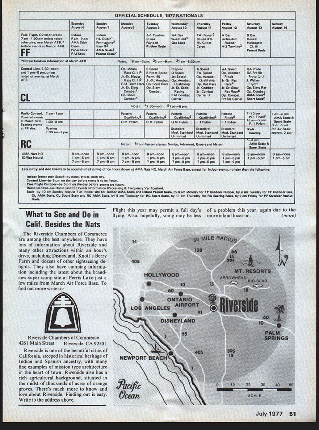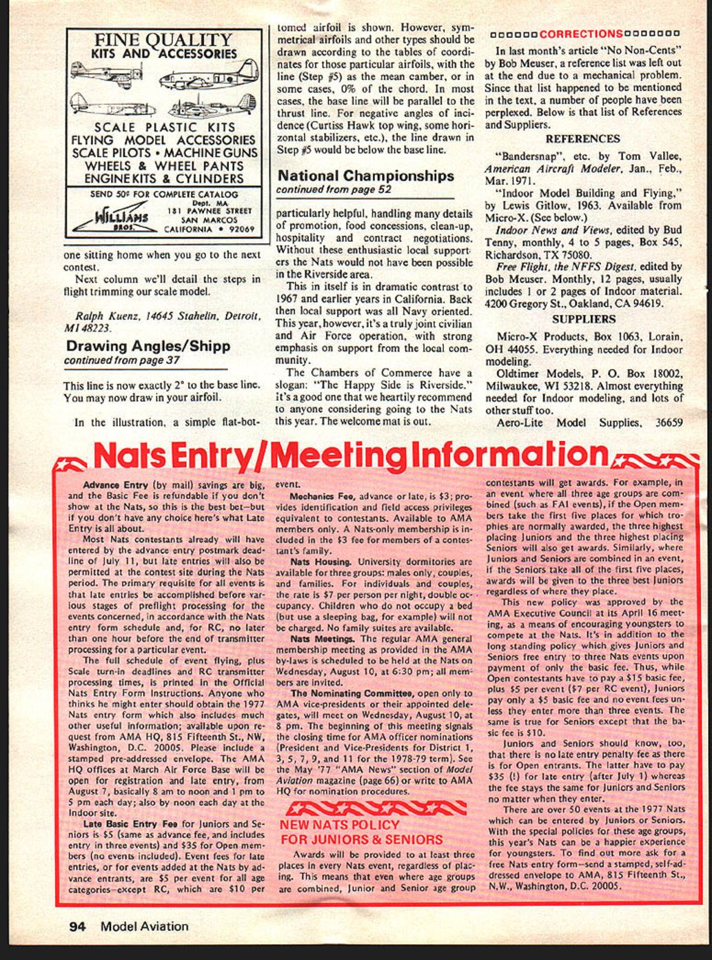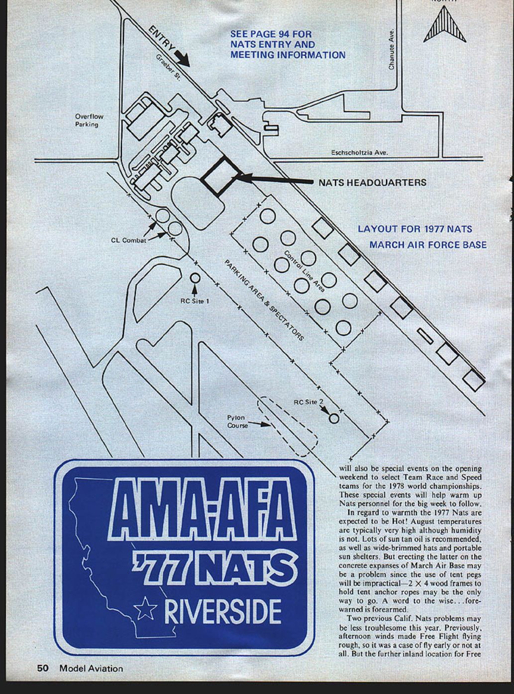 by Alan ivicow LOT HAS ha Model Airplane ampit last held California year span saw last t Nats 1972 Glenvit subsequent found necessary ganization Acadei nautics evolved new makeup lack rr sigi seen year will mc plete operation Californi AMA N dominated officials 1977 event will 1967 Nats brought Navy airlift exist anymore Aside few out-of-state officials tional Executive C rest will Noticeable too co will lack m meet Alt eing held JI will also competition events C 36 1967 will phies awardedover 600 1u no competition title n tanding feature small number o Individuai Championships 3 necause has too out t sors AMA modelers ed Mart Force UVIRS iy wore L-R Col s President tlu ident Day ion Manager merce Earl Wil e effort fc articipants also sing such champions encies So cham pions made up win ners eventsevery first placer will champion event Another big change 1967 will use separate site Free Flight events Since loss Navy airfields Nats scene has become increasingly difficult find locations can accom modate Free Flight activities used possible because Navy would shut down full-scale aircraft operations week no longer possible March Air Force Base host year active Strategic Air Command airfield must continue its military mission Nats goes Its because March big enough accommodate ictivities interference ere activity al used Nats airfield nougn room n md t 125 edIod t 0 N x General location diagram 1977 National planes can enjoy complete freedom u Contest 1 Nats site March AFB 2 Proposed own rnr tinn PFIAC Soaring sita 3 Indoor site Norton AFB 4 DormitorIes University Califoinia 5 Motel row Scale diagram 1 6 miles forability Rivei factor everal N m AGE 94 V 0 TING 0 0 Parking ____KzJI7JARTERS -lAIR F special e OFFICIAL SCHEDULE 1977 NATIONALS Monday August 5 Tuesday August B Vfednesday August10 esIndoorIndoorA-i TowlineiA GasPAl Power3A GasB Gas 9 am9 pmHL Glider1C GasWakefield3Coupe dliUnlimitedRocket AMA StickPennyplane2PayloadGas ScsIHL Glider RubberHelicopter BCabinEasy 2Rubber ScaleCargoA-2 Towllne3 Cl Ill Paper StickAMA Sc2Peanut Scat PAl StickPeanut Scale2 stion MarcUs AFONotes ig em2 pm 22 pinB pm 37 am530 pm OpMouseOSpeedCSpeedASpeediASpeedAProto Race Cl lB Proto Speed0 SpeedPAl SpeedOp AsrobatitA Profile ir-Sr MouseForm 40Jet SpeedOp Aerobat FinalsProto Jr Race Cl llJr-Sr AerobatOp Aerobat QualifyingJr-Sr RatJ Walker PAl Teem Race Op Scale Race QualifyingOp Rat Race Race4 Flyoff Jr-Sr SlowOp Slowir-Sr ScaleJr CombatJr-Sr SlowOp Slow Rat Combat4 Combat RacingSr Combat Rat Race6Op Combat Op SlowPAl CombatCarrIer IIOp CombatAMA Scale4 Combat5Carrier IProfile CarrierSport Scale5 Notes 4730noon i pm5 pm PatternPatternPatternPatternPattern Qualifying6Qualifying6Qualifying6Qualifying6Finale8 QM Pylon GM Pylon P1 Pylon P1 Pylon 770 am Pet Finals6 70 ain5 pm F 1 Pylon StandardStanderdStanderdScala Mod Standard Mod Standard Mod Standard Soaring UnlimitedUnlimitedUnlimited Notes 6Pour Pattern classes Novice Advanced Expert end Master 8 amnoon f 8 emnoon pmS pm 1 pmS pm 7 pm9 pm pmi pm 8 amnoon 1 pm-S pm 7 pm9 pm 58 pm AMA Scale & 8 emnoon8 amnoon 1 pmS pm1 pmSpin 7 pm9 pm d during office hours shown AMA Nets HO March Air Force Bese except Indoor events no later following site day before event flown ra events flown mation Processing & Frequency Verification site Indoor AMA Scala Indoor Peanut Scala B id RC AMA Scale Sam Thursday RC Sport Scala 11 ir PP Outdoor Rubber 9 am Tuesday PP Outdoor Gas RC Soaring Scala B em Friday PP Outdoor Peanut Commerce Thou have orano just arcn Air 1orce Base wriLe Flight year may permit flying Also hopefully smog may problem year again due inland locationmore Saturday August 5 Sunday August 7 Thuraday August11 FrIday August 12 Saturday Augius 13 Sunday August 14 pm Soaring 730 em7 pm GM Pylon 8 Samnoon 8 amnoon 1 pmS pm 7 pmB pm Scale S om 0 7mn6pm AMA Scale & Sport Scale 1hr break Air Show approx 2pm 8 amnoon 1 pm-S pm Nats Indoor site Norton Air Force Base March Air Force miles southeast about 50 miles east o Disneyland about 11 tween Riverside has large motels also official Nats ries being provided b versity California About 15 miles northe Norton Air Force Base events will held August 6-7 air until overhead lights site will also have highe up about 90 feetassu couple rows lights can currently planned people have made 1977 Nats possible California Besides AMA Executive Council Nats Executive Committee large contingent Califor nia AMA members involved Use March Air Force Base made possible agreement Riverside chapter Air Force Association host event conjunction Riverside Chambers Commerce including Visitor Convention Bureau Riv erside Chambers Commerce have Continued page 94 RIVERSIDE Lt General William F Pitts USAF Ret President Riverside County Chapter Air Force Association Post Office Box 2143 Riverside California 92506 Dear General Pitts would pleased host 1977 National Model Airplane Championships March Air Force Base Sincerely STANFORD E BROWN Colonel USAF Air Force Association Support Model Aviation WHEREAS aircraft models have played important role devel opment operational aircraft WHEREAS model aviation pro motes goals Air Force Asso ciation helping inform public about aerospace power WHEREAS model aviation also interests young people various phases aerospace development operation including Air Force itself NOW THEREFORE BE IT RE SOLVED Air Force Associa tion supports model aviation will continue assist model aviators promoting activities BE IT FURTHER RESOLVED Air Force Association en courages its State organizations Chapters involve themselves support model aviation S Recommended California AFA Passed AFA National Convention 1975 52 Model Aviation ir Force Base hoped-for dependent upon current netaken during planning meeting HEADQUARTERS 22D BOMBARDMENT WING H OFFICE o INK COMMANDER MARCH AIR FORCE SASE CALIFORNIA NO OCR TEXT Ledgestone Dr Mt Clemens MI 48043 Wood bracing wire microfilm torque meters Ray Harlan 15 Happy Hollow Rd Wayland MA 01778 Thrust 