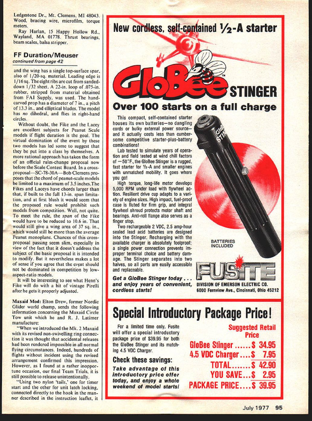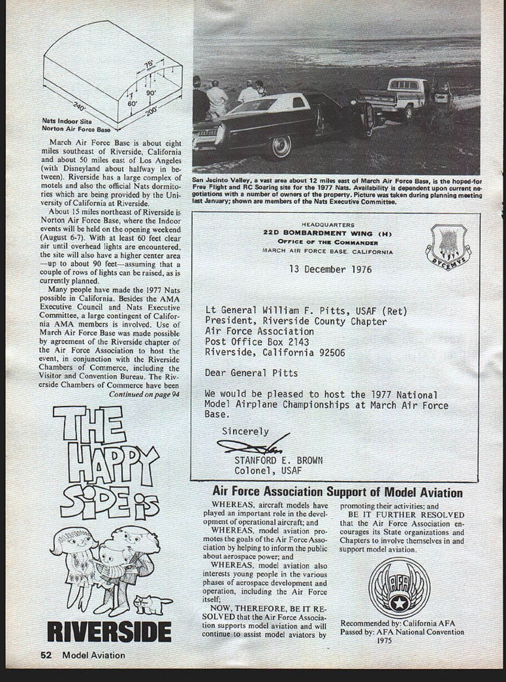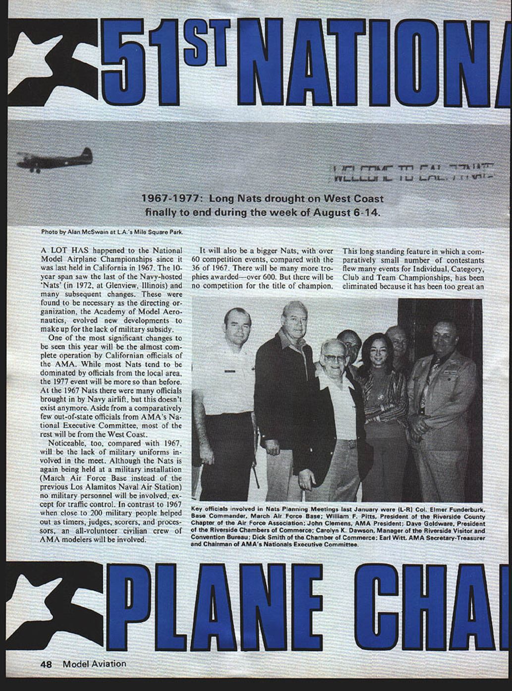 by Alan ivicow LOT HAS ha Model Airplane ampit last held California year span saw last t Nats 1972 Glenvit subsequent found necessary ganization Acadei nautics evolved new makeup lack rr sigi seen year will mc plete operation Californi AMA N dominated officials 1977 event will 1967 Nats brought Navy airlift exist anymore Aside few out-of-state officials tional Executive C rest will Noticeable too co will lack m meet Alt eing held JI will also competition events C 36 1967 will phies awardedover 600 1u no competition title n tanding feature small number o Individuai Championships 3 necause has too out t sors AMA modelers ed Mart Force UVIRS iy wore L-R Col s President tlu ident Day ion Manager merce Earl Wil e effort fc articipants also sing such champions encies So cham pions made up win ners eventsevery first placer will champion event Another big change 1967 will use separate site Free Flight events Since loss Navy airfields Nats scene has become increasingly difficult find locations can accom modate Free Flight activities used possible because Navy would shut down full-scale aircraft operations week no longer possible March Air Force Base host year active Strategic Air Command airfield must continue its military mission Nats goes Its because March big enough accommodate ictivities interference ere activity al used Nats airfield nougn room n md t 125 edIod t 0 N x General location diagram 1977 National planes can enjoy complete freedom u Contest 1 Nats site March AFB 2 Proposed own rnr tinn PFIAC Soaring sita 3 Indoor site Norton AFB 4 DormitorIes University Califoinia 5 Motel row Scale diagram 1 6 miles forability Rivei factor everal N m AGE 94 V 0 TING 0 0 Parking ____KzJI7JARTERS -lAIR F special e OFFICIAL SCHEDULE 1977 NATIONALS Monday August 5 Tuesday August B Vfednesday August10 esIndoorIndoorA-i TowlineiA GasPAl Power3A GasB Gas 9 am9 pmHL Glider1C GasWakefield3Coupe dliUnlimitedRocket AMA StickPennyplane2PayloadGas ScsIHL Glider RubberHelicopter BCabinEasy 2Rubber ScaleCargoA-2 Towllne3 Cl Ill Paper StickAMA Sc2Peanut Scat PAl StickPeanut Scale2 stion MarcUs AFONotes ig em2 pm 22 pinB pm 37 am530 pm OpMouseOSpeedCSpeedASpeediASpeedAProto Race Cl lB Proto Speed0 SpeedPAl SpeedOp AsrobatitA Profile ir-Sr MouseForm 40Jet SpeedOp Aerobat FinalsProto Jr Race Cl llJr-Sr AerobatOp Aerobat QualifyingJr-Sr RatJ Walker PAl Teem Race Op Scale Race QualifyingOp Rat Race Race4 Flyoff Jr-Sr SlowOp Slowir-Sr ScaleJr CombatJr-Sr SlowOp Slow Rat Combat4 Combat RacingSr Combat Rat Race6Op Combat Op SlowPAl CombatCarrIer IIOp CombatAMA Scale4 Combat5Carrier IProfile CarrierSport Scale5 Notes 4730noon i pm5 pm PatternPatternPatternPatternPattern Qualifying6Qualifying6Qualifying6Qualifying6Finale8 QM Pylon GM Pylon P1 Pylon P1 Pylon 770 am Pet Finals6 70 ain5 pm F 1 Pylon StandardStanderdStanderdScala Mod Standard Mod Standard Mod Standard Soaring UnlimitedUnlimitedUnlimited Notes 6Pour Pattern classes Novice Advanced Expert end Master 8 amnoon f 8 emnoon pmS pm 1 pmS pm 7 pm9 pm pmi pm 8 amnoon 1 pm-S pm 7 pm9 pm 58 pm AMA Scale & 8 emnoon8 amnoon 1 pmS pm1 pmSpin 7 pm9 pm d during office hours shown AMA Nets HO March Air Force Bese except Indoor events no later following site day before event flown ra events flown mation Processing & Frequency Verification site Indoor AMA Scala Indoor Peanut Scala B id RC AMA Scale Sam Thursday RC Sport Scala 11 ir PP Outdoor Rubber 9 am Tuesday PP Outdoor Gas RC Soaring Scala B em Friday PP Outdoor Peanut Commerce Thou have orano just arcn Air 1orce Base wriLe Flight year may permit flying Also hopefully smog may problem year again due inland locationmore Saturday August 5 Sunday August 7 Thuraday August11 FrIday August 12 Saturday Augius 13 Sunday August 14 pm Soaring 730 em7 pm GM Pylon 8 Samnoon 8 amnoon 1 pmS pm 7 pmB pm Scale S om 0 7mn6pm AMA Scale & Sport Scale 1hr break Air Show approx 2pm 8 amnoon 1 pm-S pm Nats Indoor site Norton Air Force Base March Air Force miles southeast about 50 miles east o Disneyland about 11 tween Riverside has large motels also official Nats ries being provided b versity California About 15 miles northe Norton Air Force Base events will held August 6-7 air until overhead lights site will also have highe up about 90 feetassu couple rows lights can currently planned people have made 1977 Nats possible California Besides AMA Executive Council Nats Executive Committee large contingent Califor nia AMA members involved Use March Air Force Base made possible agreement Riverside chapter Air Force Association host event conjunction Riverside Chambers Commerce including Visitor Convention Bureau Riv erside Chambers Commerce have Continued page 94 RIVERSIDE Lt General William F Pitts USAF Ret President Riverside County Chapter Air Force Association Post Office Box 2143 Riverside California 92506 Dear General Pitts would pleased host 1977 National Model Airplane Championships March Air Force Base Sincerely STANFORD E BROWN Colonel USAF Air Force Association Support Model Aviation WHEREAS aircraft models have played important role devel opment operational aircraft WHEREAS model aviation pro motes goals Air Force Asso ciation helping inform public about aerospace power WHEREAS model aviation also interests young people various phases aerospace development operation including Air Force itself NOW THEREFORE BE IT RE SOLVED Air Force Associa tion supports model aviation will continue assist model aviators promoting activities BE IT FURTHER RESOLVED Air Force Association en courages its State organizations Chapters involve themselves support model aviation S Recommended California AFA Passed AFA National Convention 1975 52 Model Aviation ir Force Base hoped-for dependent upon current netaken during planning meeting HEADQUARTERS 22D BOMBARDMENT WING H OFFICE o INK COMMANDER MARCH AIR FORCE SASE CALIFORNIA NO OCR TEXT Ledgestone Dr Mt Clemens MI 48043 Wood bracing wire microfilm torque meters Ray Harlan 15 Happy Hollow Rd Wayland MA 01778 Thrust 