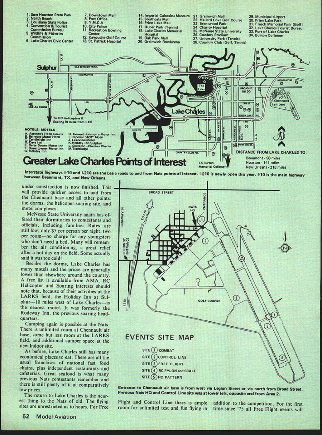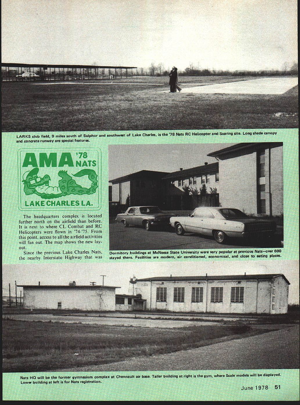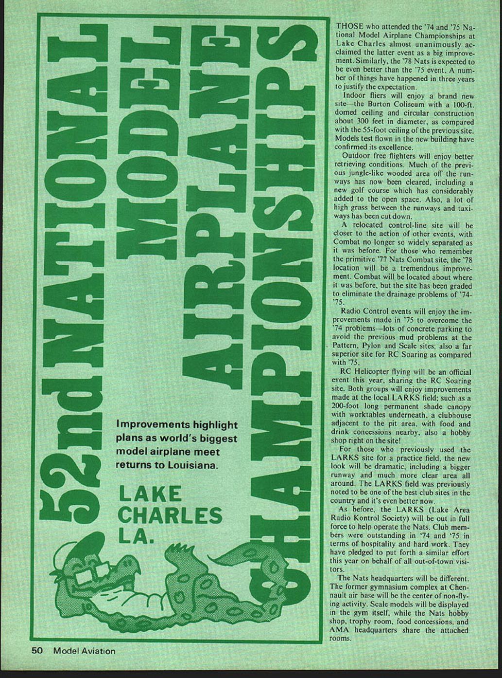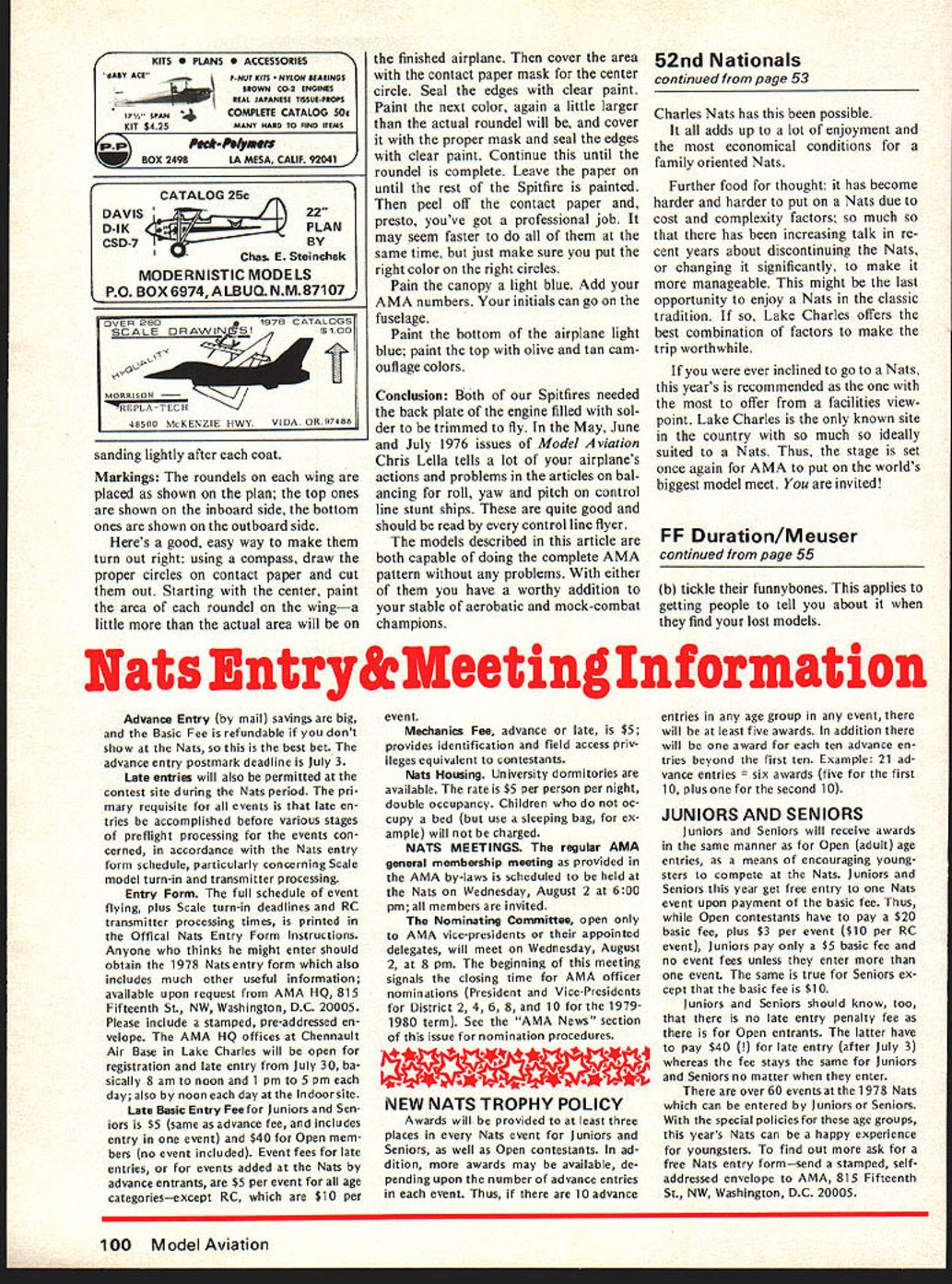 NO OCR TEXT NO OCR TEXT 1 Sun Houston State Park 2 North Bead 3 LouisIana State Police 4 Convention & Tourist GommIon Burem 5 WildlIfe & Fldwiea Commimion 6 Lake Charles Civic Center SL*IiLf jjJ 0 3ILTA mm RO Helloopt HOTILS MOTELS Ateuntos Hotel Courts B Belmont Motor Hotel C Ventjelit Inn DOeyslnn S Delta Downs Motor Inn F Dotentowner Motor Inn 0 HoIky Inn GreatL Interstat highways 1-10 between Beaumont TX Na under Construction now flu will provide quicker access t Chennault base dorms helicoper motel complexes McNesse State University fered dormitories tc officials including still low $5 per person per roomno charge dont need bed air conditioning after hot day field S said too cold Besides dorms Lake Charles has motels prices generally lower elsewhere around country free list available AMA RC Helicopter Soaring interests should note because activities LARKS field Holiday Inn Sul phurTO miles west Lake Charlesis nearest motel formerly Rodeway Inn previous soaring head quarters Camping again possible unlimited room some less room field additional camper Indoor site before Lake Charles nP-rd places eat Tt ichises natior independent r ireat seafood ts contestants plenty same field Control Line RC yet minimum interference tween categories Chennault air base huge runway almost two miles long 300 feet wide taxiways bigger runways airports vast con crete areasformerly aircraft rampsthat bigger ports Another unusual feature Charles still land nickel phone call does however city backwa contrary Lake Charles progressive growing rapidly Centerthe previous Nats Indoos v finest country lake Lake Charles named adds appeal area Its big beautiful fine swimming fishing talk having un official seaplane competition lake Its ideally suited purpose idea may come being year Inter ested RCers invited let AMA Head quarters know would participate such eventthe first Seaplane Nationals Heat humidity previous wor ries about Lake Charles Nats came enjoyed now down play concern note often hot back home August generous use air conditioning area has greatly reduced problem off field have also learned gets very hot short shower usually oc curs cool things off day rains have plagued other Nats Flying may get interrupted has rarely stopped completely Nats Lake Charles off ary prohibitions inte relaxed less restricted torbike retrieval models tunity fun Flying possible night flying unofficial may dawn dusk Chennault air base wnn tried 75only no noise complaint problems no Continued SundayMondayTuesdayWednesdayThursdayFridaySaturdaySunday July 30July31August 1August 2August 3August 4August 5August 6 Free Flight Outdoor eventsIndoorIndoorA1 TowlinehA GasCoupe dHA GasMulvihill 8 am4 pm unless noted9 am9 pmHL GlideriC GasWakefield3FAI Power3A-2 Towline3Rubber otherwiseAMA StickPennyplane2PayloadGas ScaleHL GliderRocket CabinEasy 82Rubber Scale0 GasB Gas Paper StickAMA Scale2Pesnut Scale FF FAI StickPesnut Scale2 Control Line 8 amnoon 1 pm5 pm unless otherwise noted CL Radio Control 8 em2 pm Notes 1 9 am2 pm 2 Jr.Sr Slow Combat Op Scale Race Form 40 Speed Op Slow Combat PAl Team Race B Speed B Proto Speed JrSr Aerobat Notes 4 completed Tues QM Pylon OM Pylon 2 pmB pmPati 2 pm9 pm 3 b Op Slow Combat Finals4 FAI Combat Jr-Sr Scale Racing C Speed 0 Speed Jet Speed Op Aerobat Oualifying lay 5 Ban GM P New Indoor sits Burton Coliseum k yearshigher larger OFFICIAL SCHEDULE 1978 NATIONALS ice Op Combat Finals Op Slow Rat VA Profile Proto J Walker Fivoff Op Combat Jr.Sr Rat RaceS Jr.Sr Slow Rat Race6 VA Speed Op Aerobat Finals Profile Th KITS 0 PtANS 0 ACCESSORIES BABY ACEP-NUT KITS NYLON BEARINGS BROWN CO-2 ENGINES _____________________REAL JAPANESE TISSUE-PROPS 57 SPAN COMPLETE CATALOG 50t KIT $4 25 MANY HAED TO FIND ITEMS Pt*-hfywes W BOX 2498LA MESA CALIF 92041 CATALOG 25c DAVIS22 D-IK PLAN CSD-7BY Chas E Steinchak MODERNISTIC MODELS PO B0X6974ALBUQNM87107 sanding lightly after coat Markings The roundels wing placed shown plan top ones shown inboard side bottom ones shown outboard side Heres good easy way make turn out right using compass draw proper circles contact paper cut out Starting center paint area roundel winga little actual area will finished airplane cover area contact paper mask center circle Seal edges clear paint Paint next color again little larger actual roundel will cover proper mask seal edges clear paint Continue until roundel complete Leave paper until rest Spitfire painted peel off contact paper presto youve got professional job may seem faster same time just make sure put right color right circles Pain canopy light blue Add AMA numbers initials can go fuselage Paint bottom airplane light blue paint top olive tan cam ouflage colors Conclusion Both Spitfires needed back plate engine filled sol der trimmed fly May June July 1976 issues Model Aviation Chris Lella tells lot airplanes actions problems articles bal ancing roll yaw pitch control line stunt ships quite good should read control line flyer models described article both capable doing complete AMA pattern problems either have worthy addition stable aerobatic mock-combat champions 52nd Nationals continued page 53 Charles Nats has possible adds up lot enjoyment economical conditions family oriented Nats Further food thought has become harder harder put Nats due cost complexity factors much has increasing talk re cent years about discontinuing Nats changing significantly make manageable might last opportunity enjoy Nats classic tradition Lake Charles offers best combination factors make trip worthwhile ever inclined go Nats years recommended offer facilities view point Lake Charles known site country much ideally suited Nats Thus stage set once again AMA put worlds biggest model meet invited FF Duration/Meuser continued page 55 b tickle funnybones applies getting people tell about find lost models Nats Entry&Meeting Information Advance Entry mail savings big Basic Fee refundable dont show Nats best bet advance entry postmark deadline July 3 Late entries wi