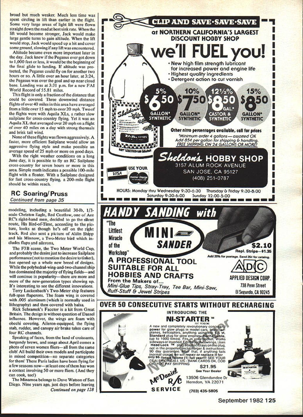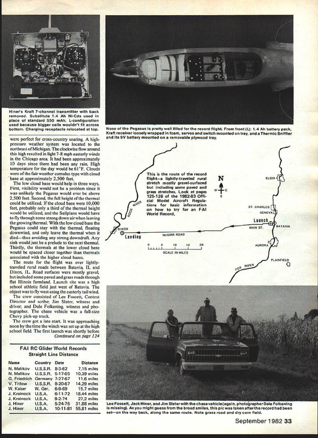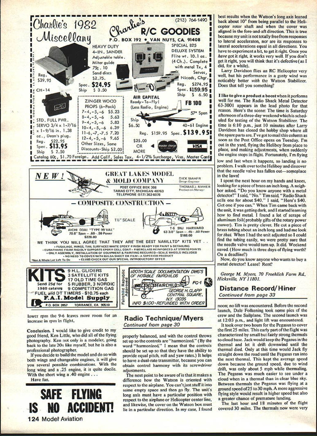 A Sailplane thermal marvelous sight expect Jack Hiner crew officials tired necks after nearly 36-hr flight resulted new FAI World Record 5581 miles StraightLine Distance RC Sailplanes Low cloud base 2500 feet helped ON OCTOBER11 1981 Jack Hinerofown ers Grove IL set new FAI F3B #25 Straight Line Distance World Record RC Sailpianes distance 5581 miles breaking Jacks old World Record 3188 miles set 1975 Jack flew Pegasus designed fellow SOAR member Stan Watson con struction article Pegasus appeared August 1980 Model Aviation Radio Kraft seven-channel 14 Ah Ni-Cds transmitter airborne battery packs Con trols used rudder elevator spoilers An LF-model Thermic Sniffler used monitor Pegasus rate climb Weather conditions Sunday October 11 Two officials record holder R prior departure Batavia IL L-R Lee Fossett Jim Slater Jack Hiner Another official Dale Folkening took pictures model isa Pegasuswhich designed Stan Watson MA plan No 307 $675 has stretched tip panels strengthened main spar enlarged stabilator no wing flaps 32 Model Aviation perfect cross-country soaring highpressure weather system located northeast Michigan clockwise flow around high resulted light 7-8 mph easterly winds Chicago area approximately 10 days since rain High temperature day would 610F Clouds fair weather cumulus type cloud base approximately 2500 feet low cloud base would help three ways First visibility would problem since unlikely Pegasus would ever above 2500 feet Second full height thermal could utilized cloud base 10000 feet probably third thermal height would utilized Sailplane would have fly through some strong down air leaving growing thermal low cloud base Pegasus could stay thermal floating downwind leave thermal diedthus avoiding strong downdraft Any sink would just prelude next thermaL Thirdly thermals lower cloud base would spaced closer together thermals associated higher cloud bases route flight over lightlytraveled rural roads between Batavia IL Dixon IL Road surfaces mostly gravel included some paved grass roads through flat Illinois farmland Launch site high school athletic field just west Batavia object fly west using easterly tail wind crew consisted Lee Fossett Contest Director scribe Jim SIster witness driver Dale Folkening witness pho tographer chase vehicle full-size Chevy pick-up truck crew got late start approaching noon time winch set up high school field first launch shortly before Continued page 124 FAI RC Glider World Records Straight Line Distance Name N Malikov N Malikov G Friedrich V Titlow W Kaiser J Krainock J Krainock J Hiner J Hiner Country USSR USSR Germany USSR W Ger USA USA USA USA Date 8-3-62 517-65 72767 8-20-67 6-9-69 6-1 1-72 9-2-74 5-24-75 10-1 1-81 Distance 715 miles 1039 miles 116 miles 1429 miles 157 miles 1844 miles 272 miles 3188 miles 5581 miles u 0 DIXON Landing route record flighta iightiytraveied rural stretch mostly gravelsurfaced including some paved grass stretches Look pages 125-126 198283 Off i cial Model Aircraft Regula tions basic information try FAI World Record N McOIRR ROAD 051015 II I SCALE IN MILES 20 ELGIN MAIN STBATAVIA PLAINFIELD September 198233 riiners f\ran -cnannel oranamisser WITri DacK removed Substitute 1 4 Ah Ni-Cds used place standard 550 mAh L-configuration used because bigger cells wouldnt fit across bottom Charging receptacle relocated top Nose Pegasus IS pretty well Tilled tor record flight front L 14 Ah battery pack Kraft receiver loosely wrapped foam servos switch mounted tray Thermic Sniffler Its 9V battery mounted removable plywood tray Lee Fossett Jack Hinerufiliur win cnaae venicletagalnning missing As might guess broad smiles plc taKen arrermne record nac seton way back along same route Note grass road dry corn field 213 kfi1A1LdtS I/OQJ0MR/C GOODIES CcQQantjPO BOX 192 -CA 91408U UHEAVY DUTYSPECIAL 825I 4-IN SANDERDELUXESYSTEM UAdjustable tableFlite wt 101 oz Miter guide4 Ch Complete 75g 10 metal Ix 4 RegSand discsServos SI 5$275NicadsChgr CH14Spec $2495Reg $27495 Ship $ 350Spec $15995 AIR CAPITALShip $ 650 ZINGER WOODReady-To-FlyFB 100 PROPS 6PockLess Radio EngineII 74-56 $5 2357 Span 8-4-5-65 63Ship SID rULLPWR9456 5 83 SERVO 3/4x 1 7/16 l0-4-5-6 6 39$65040-61 Engine1 x 19/16 1 381l-6775 720Reg $15995 Spec$139951 oz Dean s plugl24s69 65$2500 IReg $22 95 ISpec $13 95Other SizesSame Ship $250Discounts-Ship $200MOREI LtO~m$1 70 ~i~Add Calif Sales Tax 4-1/2% Surcharge Visa Master Cardj NE WJRIAT LAKES MODELMAHER & MOLD AMIA~ Deg Eogine POST OFFICE BOX 308THOMAS J MAHER TAWAS CITY MICHIGAN 48763Podct TELEPHONE 517 362-6078 COMPOSITE ANSTRUTION 1% SCALE 12rD3AI TYPE 99 VALT-6 SNJ HARVARD AICHIU 633/8 Span 45- 60 Power 708Span60- 90Power$18800 $22800 WE THINK YOU WILL AGREE THAT THEY ARE THE BEST NAWLLTD KITS YET FUSALAGE WINGS TAIL SURFACES WHITE EPOXY FINISH READY FOR PAINT & DETAILING EURATHANE FOAM RIGIDLY SUPPORTS EPOXY GELL COAT FIBERGLASS REINFORCED AT STRESS POINTS ONLY ASSEMBLY INSTALLATION OF EOUIPMENT & PAINTING REOLIIRED SCALE WHEELS INCLUDED NO NEED TO COVER WITH BALSA SHEET OR FILM SUPERIOR PRODUCT Whole Lot Left CLUBS CHECK OUT OUR SPECIAL INTRODUCTORY OFFER KITs 9 HL GLIDERSI0THSC4LE XCUMENTAWN DWGS 3SATELLITEKITSOFNOTABLEFAIRCHILDS 17 OLD TIME GAS-- rAIRCHIL FCI Send25for 5RUBBER3NORDICI 1980 catata 9 COMPETITION GASGEORGEHCLAPP FUEL affd DT TIMERS -$1075 eachCENTRAL SCU4RE FAl Model Supply --- N /3036 OX7TORRAECA10INfCV $100 -REFUNDED WITH ORDER lower rpm 9-6 leaves room Radio Technique/Myers increase rpm flight Continued page 30 Conclusion would like give credit good friend Ken Little did flying photography Ken modeler going back late 20s like myself also professional photographer decide build model both wings changeable engines will give several possible combinations long wing 25 engine quite docile short wing 40 engine. Have fun SAFE FLYING IS NO ACCIDENT properly balanced control throws set up controls harmonized word harmonized mean controls should set up have ability provide equal pitch roll yaw rates helps have 