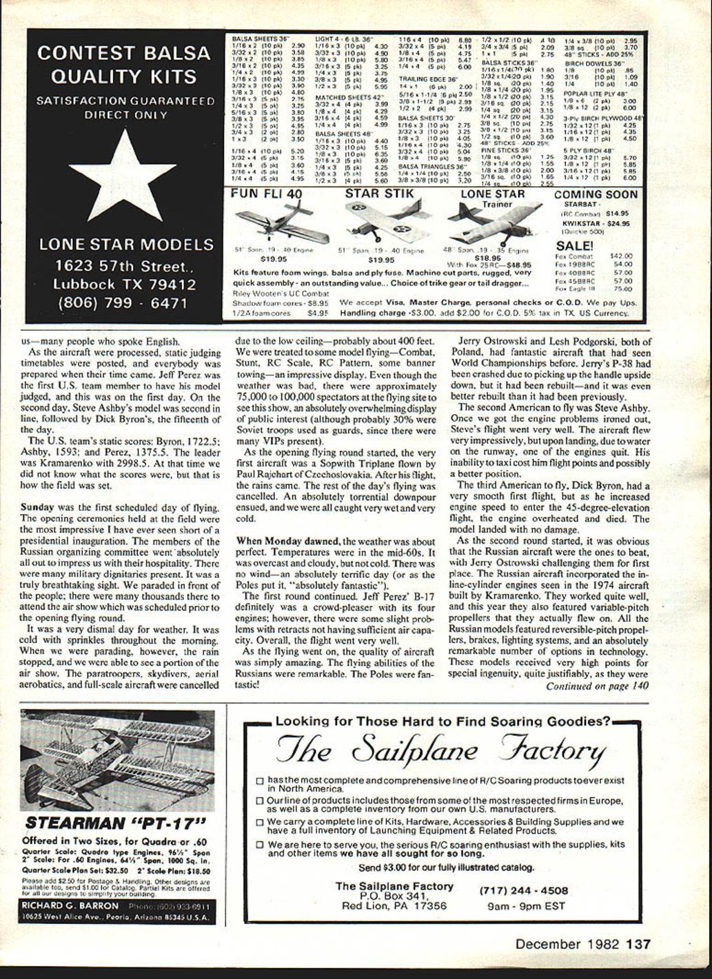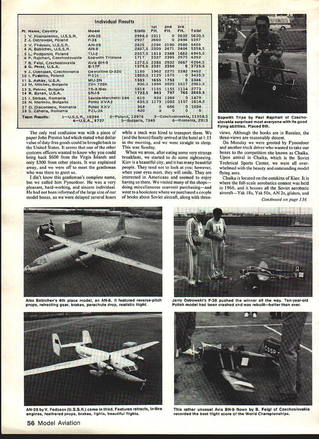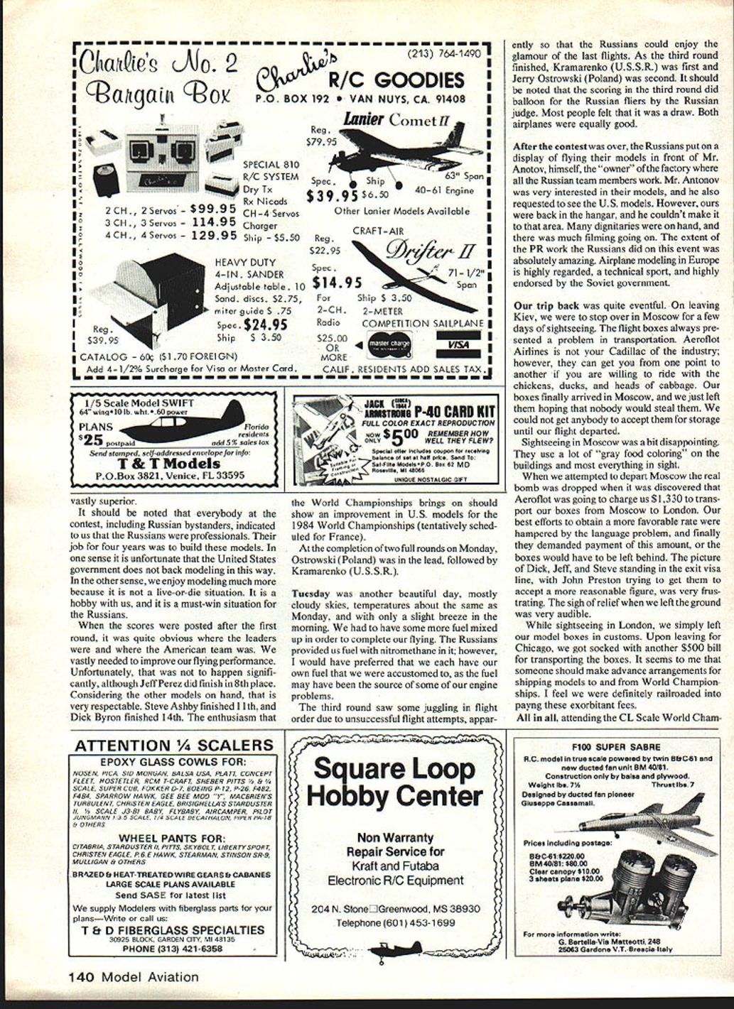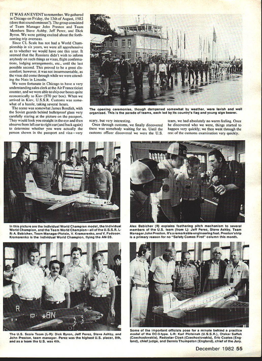 d fabulous Site location flights 1982 CL Scale World Championships Note permanent fencing spectator stands Impressive Atripto Russia isan adventure itself coupled World Championships event exciting 7th CL Scale World Championships Kiev during period August 19-26 saw participation US five Eastern European nations 54 Model Aviation Dick Byron Championships IT WAS EVENT remember gathered Chicago Friday 13th August 1982 does sound ominous group consisted Team Manager John Preston Team Members Steve Ashby Jeff Perez Dick Byron getting excited about forth coming trip overseas Since CL Scale has World Cham pionship six years apprehensive whether would have year seemed Russians didnt wish inform anybody such things visas flight confirma tions lodging arrangements etc until last possible second proved great dis comfort however insurmountable visas did come through attend ing Nats Lincoln fortunate Chicago have very understanding sales clerk Air France ticket counter able ship boxes quite economically Kiev $70 per box arrived Kiev USSR Customs some what hassle taking several hours scene somewhat James Bondish Soviet guards behind bulletproof glass very carefully staring picture passport would look straight eye observe left ear right ear back again determine whether actually person shown passport visavery scary very interesting Once through customs finally discovered somebody waiting us Until customs officer discovered US team absolutely no warm feeling Once discovered things started happen very quickly went through rest customs examination very quickly December 1982 55 opening ceremonies though dampened somewhat weather lavish well organized parade teams led its countrys flag young sign bearer picture Individual World Champion model Individual World Champion Team World Championall USSR L R Babichev Team Manager Plotain V Kramarenko V Fedosov Kramarenko Individual World Champion flying AN-26 Alex Babichev R explains feathering pitch mechanism several members US team L Jeff Perez Steve Ashby Team ManagerJohn Preston Its remarkable engineering feat Prestonstrlp primary reason no Safety Comes First column month US Scale Team L-R Dick Byron Jeff Perez Steve Ashby John Preston team manager Perez highest US placer 8th team US 4th Some important officials pose minute behind practice model DC-3-type L-R Karl Plotsinsh USSR Otakar Saffek Czechoslovakia Radoslav Cizek Czechoslovakia Eric Coates Eng land chief judge Dennis Thumpston England chief Jury tndividuat Results Pt Name Country 1 V Kramarenko USSR 2 J Ostrowaki Poland 3 V Fedosov USSR 4 Babichey USSR S L Podgorskl Poland 6 P Raichart Czechoslovakia 7 B Peigi Czechoslovakia B G Perez USA 9 J Ocenasek Czechlovakia 10 Pudelko Poland 11 5 Ash USA 12 M Milchev Bulgaria 13 5 -Petrov Bulgaria 14 R Byron USA 15 Serban Romania 16 N Marlnov Bulgaria 17 D Diaconescu Romanla 18 S Zaharla Romanla Model AN-26 P-3 8 AN-28 AN-8 TU-2 Sopwlth Triplane Avia BH9 B-i 7F Dewoltine 0-520 P-hG MU2N Zlin 726k TS-8 Bies SNJ-5 Savola-Marchetti $84 Potez XVA2 Poter XXV PZL24 Static 29985 2937 2825 28875 25575 1717 12725 13755 1180 18605 1593 9365 1618 17225 610 4355 368 420 1st FIt 2311 2660 2294 2309 1818 2327 2388 2321 1962 1125 1655 1894 1155 943 938 1179 0 0 Teem Results1USSR 163942Poland 139783Czechc 4USA 5Bul9arla 7349 real confusion piece paper John Preston stated what dollar value duty-free goods could brought back United States seems other customs officers wanted know could bring back $600 Virgin Islands $300 other places explained away off meet gentleman greet us dint know gentlemans complete name called him Fyourdoor very pleasant hard-working sincere individual informed large size model boxes delayed several hours truck hired transport boxes finally arrived hotel 115 morning went straight sleep Sunday arose after eating some very strange breakfasts started some sightseeing Kiev beautiful city has beautiful people tend look however eyes meet will smile interested Americans seemed enjoy having us visited shops doing miscellaneous souvenir purchasingand went bookstore purchased couple books about Soviet aircraft along threeSopwith Tripe Paul Rajchart Czecho slovakia surprised everyone its good flying abilities Placed 6th views Although books Russian three-views reasonably decent Monday greeted Fyourdoor another truck driver wanted take boxes competition site known Chaika Upon arrival Chaika Soviet Technical Sports Center over whelmed beauty outstanding model flying area Chaika located outskirts Kiev full-scale aerobatics contest held 1966 houses Soviet aerobatic aircraftYak 1 8s Yak SOs 2s gliders Continued page 136 56 Model Aviation AICX aDIcnevs 41fl piace moaci RId-O Ii yeaiureu reverac-pliun props retracting gear brakes parachute drop realistic flight aerry usirowaKis r-ao pusneo winner aii inc way len-year-urn Polish model crashed rebuiltbetter ever AN-28 V Pedosov USSR came tflird eatures retracts in-line engines feathered props brakes lights beautiful flights rather unusual Avia BH-9 flown B FelgI CzechoslovaKia recorded best flight score World Championships Indoor models played years before Others quest successful humanpowered flight observed too blinders team succeeded because its ability break through conceive novel ways build lighten basic structural de signs Therein lay value craft symbols area life say aviation modeling can learn creative solutions old problems same thinking skills can applied solving international conflicts political rather military solutions eco logical problems need conserve energy using less exemplified Solar Challenger exploring alternative energy sources After MacCreadys probing address Sailplane kits given away door prizes GET ORGANIZED Hev S set 01 4 sturdy Irles rIeSs sac 4 years Ot yOUr tavorrIe B vasazIfles 4 MAG FILES $495 5evd Sa$S rOss 51 06 soslage ard SaedIOrg ta DaM INDUSTRIES P0 805 388-K DOVER NH 03820 Michelle Hann Orange CA first receive Goldberg Models Gentle Lady Cannon RC System pleasing see another young lady showin