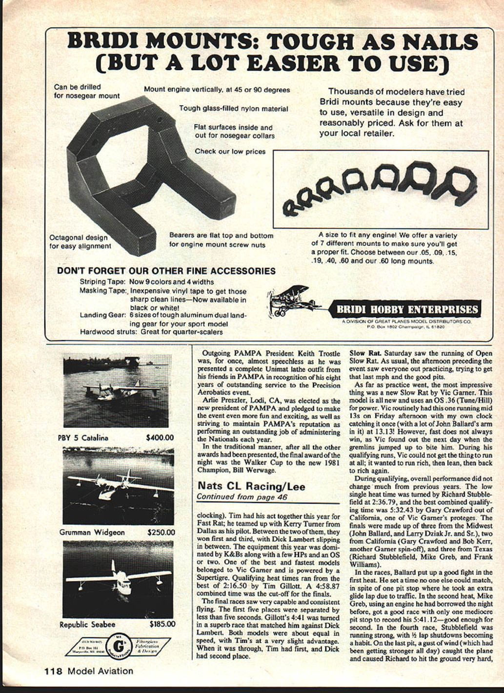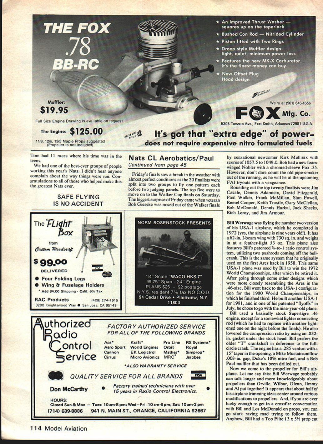 CL Aerobatics Wynn Paul TEN YEARS long time impatient talented flier wait win Nationals have already won Nationals four pre vious times world title twice becomes difficult settle seconds thirdswhich what Bill Werwage has since last winning Precision Aerobatics 1971 However put considerable know edge skills together right time beat outstanding field Texas Nationals Walker Cup finals day five finalists led scoring time another however final standings Werwage Lakewood OH Ted Fancher Foster City CA Les McDonald Miami FL Wynn Paul Lexington KY Kirk Mullinix Bellfiower CA graduation David Fitzgerald Open ranks last year remaining Seniors squared off battle tiat concluded second-year participant Jeff Anderson Stockton CA nosing out Andy Harissiadis Dan McClellan Unfortunately Junior Jim McClellan entered Nationals fly against himself Fifty-two Open contestants actually flew Nationals weather conditions turned out both hot windy predicted Event Director Bill Howe Assistant Lee Lorio sembled experienced crew take care contestantsa total 43 workers contribut ed running Stunt event Aerobatics again alloted four circles although lot loose gravel surface bad flying areas Tuesday night appearance judging Bill Werwage years Walker Cup winner nine-year-old USA1 Talk about well-tested plane has 62-in I-beam wing Supertigre 46 engine Sig paint finish Open fliers held some surprises First surprise awarding perfect score 20 points Mariner Gene Martine Jacksonville FL tan metallic brown green red beauty improved replica destroyed 1980 Mariner Some old-timers present stated never before history Stunt has perfect score awarded other big surprise night came infamous pilots meeting lasted 10 minutes no asked about score landing Open qualifications day four circles 13 fliers Since five qualify off circle represented 38% participants making finals certalnly allows lot chances fly finals wind did come up strongly second round two qualifications days chose fly breeze attempt make cut show strength overall field after qualifi cations over first-time qualifier field 20 David Fitzgerald hardly qualifies rookie Nationals compe tition four National titles credit field included no less three past present World Champions six former Na tionals Champions Ted Fancher Intimidation finished second Aerobatics first PAMPA Concours dElegance judging Supertigre 46 power 56in built-up wing Sig paint acrylic enamel finish Jim McClellan Burlingame CA Junior Stunt winner ship stock kit Nobler weighing 40 oz features MonoKote wings Hobbypoxy body tail OS Max 35 power plant 44 Model Aviation Jeff Anderson Stockton CA Senior Stunt winner Citation II ST 46 power plant 58-in foam wing acrylic finish Tom 11 races time teens best-ever groups people working years Nats didnt hear anyone complain about way things run Con gratulations helped make greatest Nats ever SAFE FLYING IS NO ACCIDENT AT7Jhr $9900 C itEl VISA DELIVERED Four Folding Legs Wing & Fuselage Holders Add $400 Shipping calif 6% Tax RAC Products408 274-1915 3200 Knightswood Way 0 San Jose CA 95148 Ace Aero Sport Cannon Cirrus Don McCarthy Continued page 45 Fridays finals saw break weather almost perfect conditions 20 finalists split two groups fly pattern before two judging panels top five move Walker Cup finals Saturday biggest surprise Friday came veteran Bob Gieseke nosed Out Walker finals Kraft World Engines EK Logictrol Micro Avionics Pro Line Orbit Mathes MRC AS Systems Royal Simprop * Jerobee ALSO WARRANTY SERVICE S sensational newcomer Kirk Mullinix scores 10575 10490 Bob new foamwinged Nobler chromed-sleeve Fox 35 However dont dare count old pipe-smoker out running will upcoming FAI tryouts vengeance Rounding out top twenty finalists Jim Casale Dennis Adamisin David Fitzgerald Paul Walker Frank McMillan Stan Powell Remel Cooper Keith Trostle Gary McClellan Bob McDonald Dennis Harkai Jack Sheeks Rich Leroy Jim Armour Bill Werwage flying number two version USA-i airplane completed 1972 yes airplane nine years old has 62-in I-beam wing 730 sq weighs feather-light 53 oz plane also features Bills patented 7/a-to-1 ratio control sys tem utilizing two pushrods coming off bellcrank same system originally used first Ares back 1958 same USA-i plane used Bill win 1972 World Championships after retired After going through some other designs closely resembling Ares 46-size Bill went back USA-i configura tion 1980 World Championships finished third built another USA-i 1981 patented flyoffs July chose go nine-year-old plane Bill used basically stock Supertigre 46 engine except somewhat lighter connecting rod replace another light ened night before finals also lowered compression ratio using 032in gasket under stock head Bill prefers older T crankshaft deference fullcircle crank engine has 285 venturi 15 taper opening Mike Mustain uniflow 003-in gap Dukes 10% nitro fuel Bob Paul muffler has drilled out Now come propeller Bills air plane Let say Bill Werwage probably can talk longer knowledgeably about propellers Orville Wilbur Glenn Jimmy Al put together appears about half airplane trimming ideas center around various modifications propellers ever lucky enough get crossfire conversation Bill Les McDonald props can go stark raving mad trying follow Anyhow Bill Top Flite 13 x 5 prop cut 114 Model Aviation Nats CL Aerobatics/Paul Towson Ave Fort Smith Arkansa edge power e nitro formulated fuels Aut hoilzed DQdIO ~ontr ervice FACTORY UTHORIZED SER VICE FOR ALL OF THE FOLLOWING BRANDS QUA LITYSER VICE FOR ALL BRANDS Factory trained technicians over 15 years Radio Control Electronics HOURS Closed Sun & Mon lOam-B pm WedFri 10 am-6 pm Sat 10 am-2 pm 714 639-8886 941 N MAIN ST ORANGE CALIFORNIA 92667 down 11 l x 5 plane-engine-fuel-tip weight-nose weight-wind conditions etc combi nation although Frank McMillans 60 engine Martin-Baker-S semi-scale plane got Les McDonald horsepower-sound award Bills Supertigre raw power sound everybody likes hear Oh yes Bill flying solid lines measured 68 feet hand